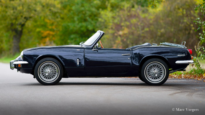 Triumph Spitfire MK 3, year 1971. Body colour dark blue (Royal Blue) combined with a black leatherette interior trimmed with black carpet. Black vinyl soft-top, hood cover, and tonneau cover. This beautiful Triumph Spitfire was sold new in the United Kingdom and registered on 30 June 1971. In 1984, the car was imported to the Netherlands. The current owner has enjoyed this beauty since 2023 on many trips in the Netherlands, Luxembourg, and in the Square Mountain Rally. This beautiful example is in good to very good condition and the car has recently been extensively serviced. The car is equipped with overdrive, chrome wire wheels, chrome 'knock-on' wheel nuts, a chrome luggage rack, etc. This Spitfire MK 3 will provide the new owner with much driving pleasure, and if desired, many new friends in the very active Triumph Spitfire club!