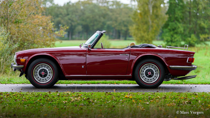 Triumph TR6, year (November) 1974 (first registration 1975). Matching numbers, a Heritage document is available to confirm this. Bodywork in the beautiful colour 'Carmine Red' combined with a beige (brown) faux leather interior and light beige (magnolia) carpet. This TR6 was sold new in Halifax, Canada. Between 2008 and 2012, the car was restored in Canada; invoices of up to € 25,000 are present in the history file. In 2020, the car was shipped to the Netherlands, where the TR6 was registered in 2023. The Dutch owner has perfected the car down to the smallest detail and the rear axles, carburetors and clutch have been overhauled/renewed in our workshop. This beautiful Triumph TR6 is in excellent condition (looks almost like new!) and the car is completely up-to-date.