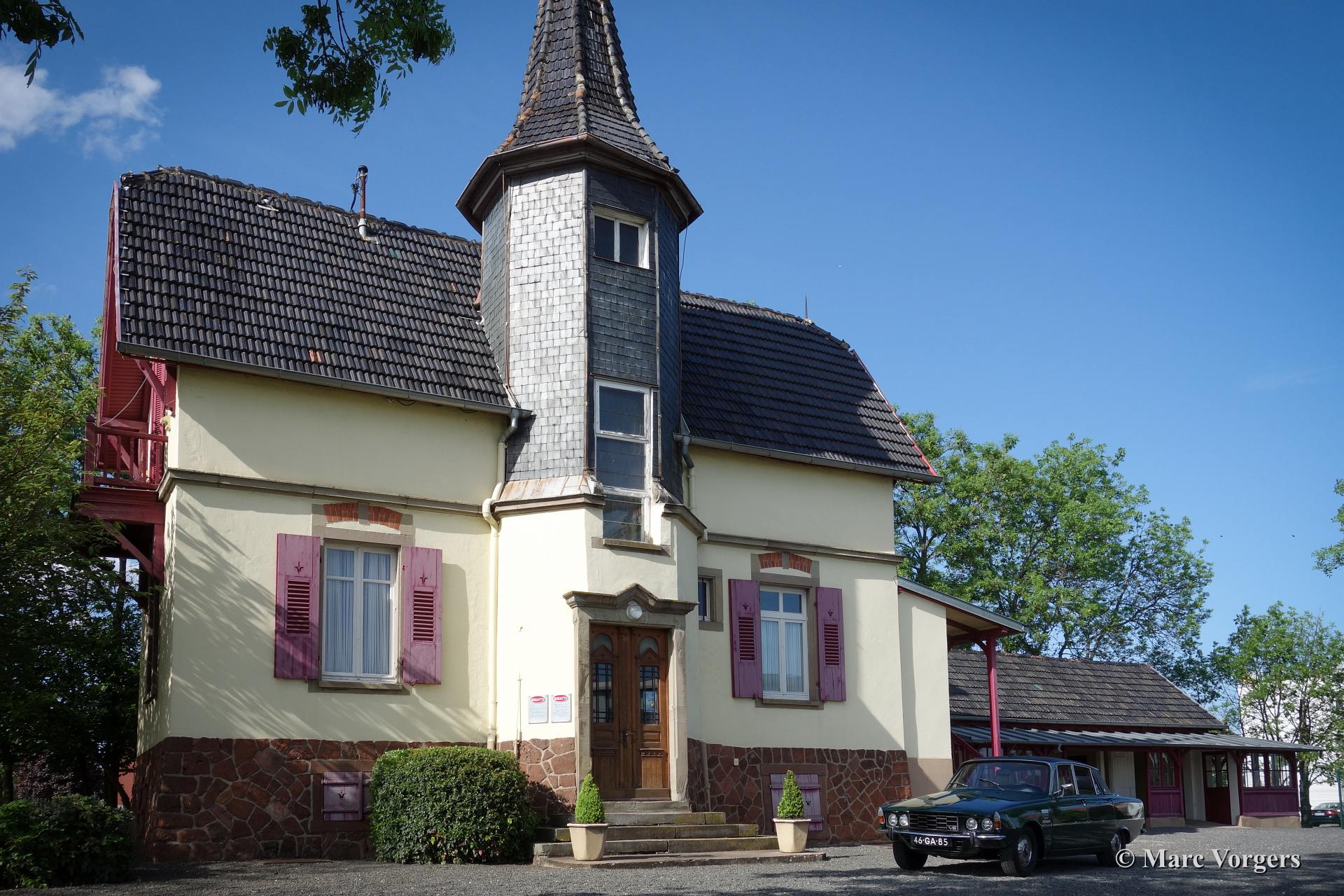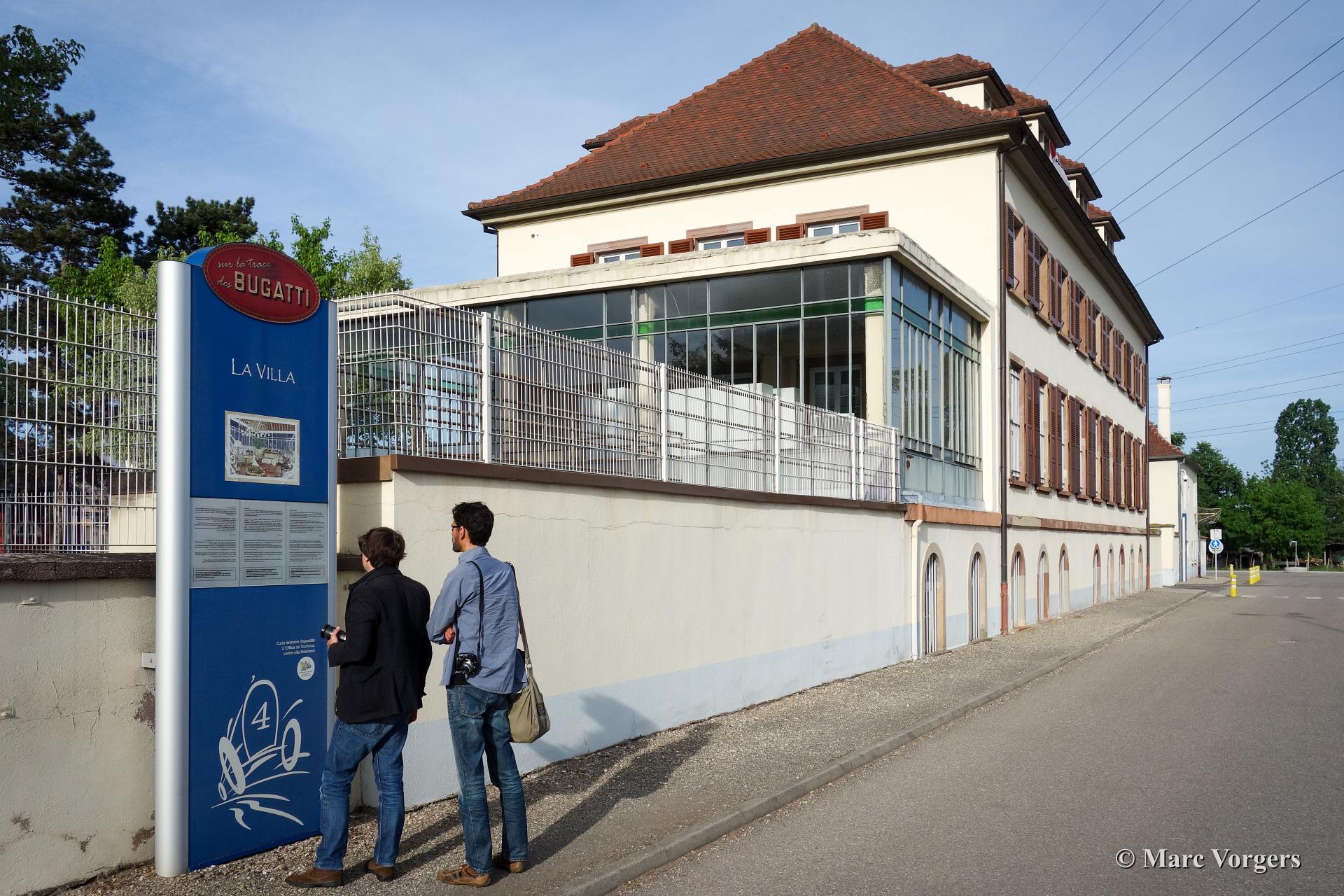 On the first day, Thursday 7 May, our destination was the Alsatian town of Molsheim, about 600 kilometres from our starting point in the Netherlands. Here we embarked on the discovery tour along the ‘Bugatti Trail’. After parking the Rover in a sun showered Molsheim at noon we shortly after stood face to face with Ettore Bugatti’s life size bronze statue and a Type 35 Bugatti statue ‘parked’ in an oval pond. A short walk thru the beautiful historic centre of Molsheim brought us to the Bugatti Foundation, in the Musee Chartreuse, where a small but highly interesting Bugatti museum is located and which has been set up by the ‘Enthusiastes Bugatti’. In the afternoon we continued the trail to the ‘Hostellerie du Pur Sang’ which was used by Bugatti as a small private guesthouse for his clients. Today the Hostellerie is in use as the ‘club house’ of the ‘Enthousiastes Bugatti Alsace’. Next door we found our hotel for the night, appropriately named: ‘Hotel Le Bugatti’. From there the trail continued in the early evening along a Bugatti ‘Autorail’ bogie to the factory site (l’usine). The factory is now in use by the firm of Safran ‘Messier-Bugatti-Dowty’ who produce landing gear for aircrafts. The more modern front part of the factory was used for the production of the Bugatti ‘Autorail’ railcars which were powered by respectively two or four Bugatti Royale engines giving a combined power output of 400 and 800 bhp and a top speed of 196 km/h. (122 mph). Just around the corner on Rue des Peupliers we found the ‘Villa’, Ettore’s house for many years. Next to the ‘Villa’ the oldest part of the Bugatti factory can be seen: the ‘Hardtmuhle’. Here one gets a good impression of the old early 20th century workshops, foundry and stables. Returning to the main road, rue Saint-Jean, we walk along Chateau Saint-Jean. This magnificent chateau was purchased by Bugatti in the late 1920ies to add more grandeur to his marque but he never lived in it. Today the chateau is in use by Bugatti SAS to receive buyers of the modern Bugatti Veyron cars in great style.