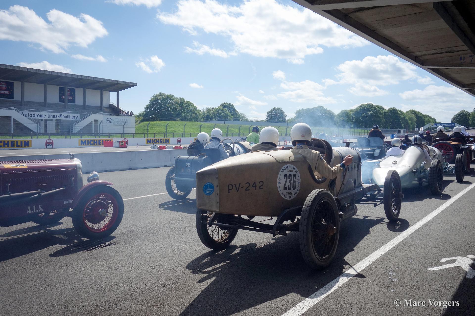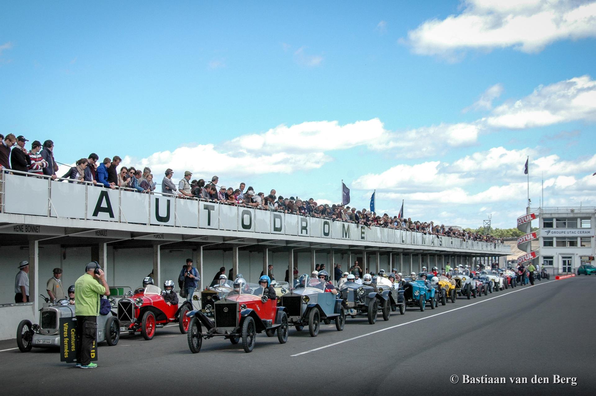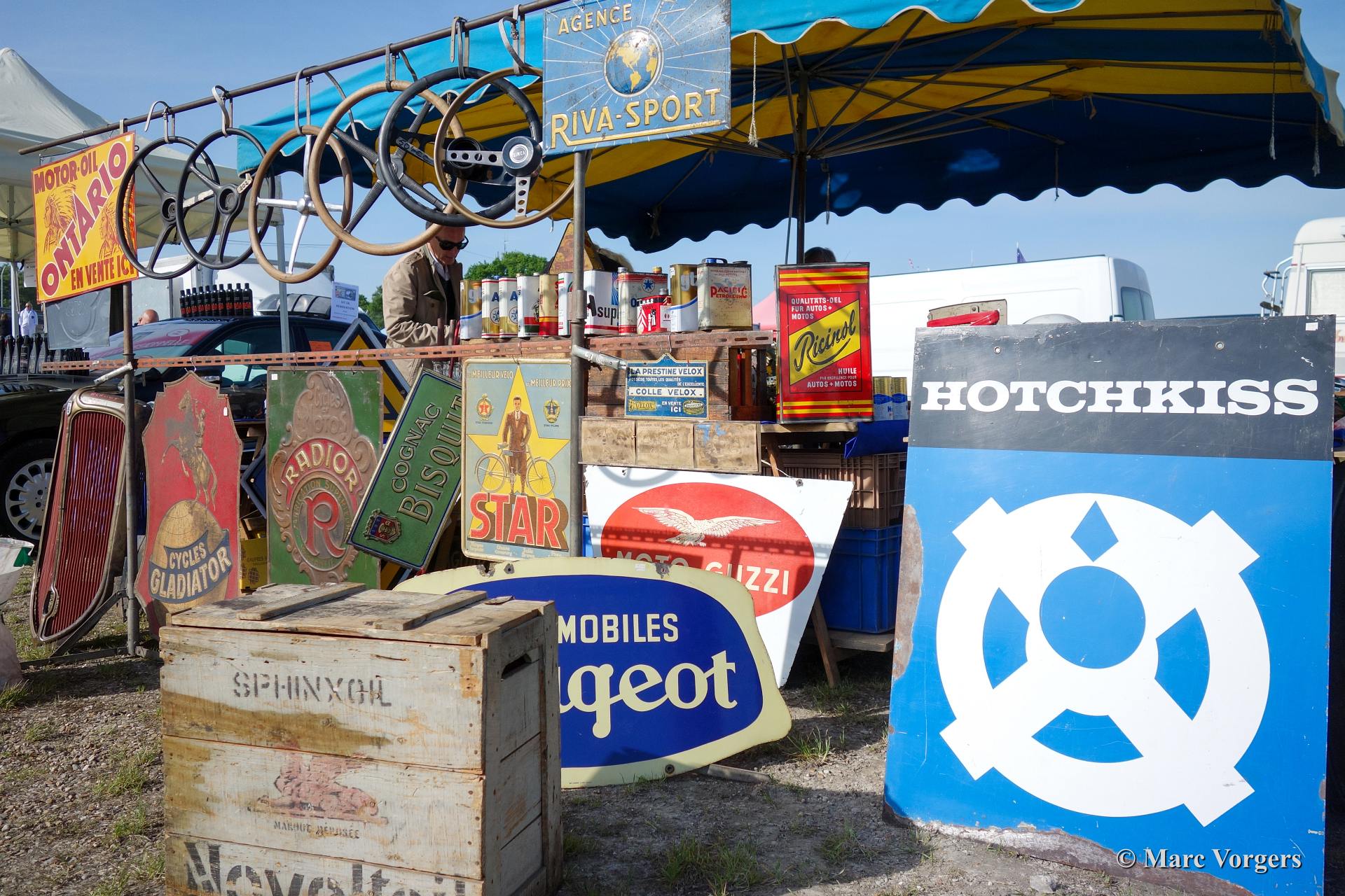 On day three we took the magnificent scenery tour from Mulhouse to Montlhery along Belfort and the N19/E54 from Vesoul to Langres where we found a little piece of England in the village of Cintrey. Here we took photos of our party and the Rover in front of an old garage with great Castrol and Champion advertisements on the wall! The distance of just under 600 kilometres was covered quickly so we arrived at the Montlhery banked circuit in the early afternoon. On the Vintage Revival the clock was turned back several decades… For two days we found ourselves visiting the 1920ies and 1930ies with some added imagination. You only have to suppress out of style details like the modern racing helmets and people clad in too modern overalls and clothes… During this delightful event we witnessed many old Bugatti’s still being driven, raced and cherished by their owners. The other cars and marques where as impressive. Yours truly drooled over the original 1908 Grand Prix Mercedes for a long time… And finally sat down in the seat of the car in which Christian Lautenschlager won the 1908 French Grand Prix in Dieppe.