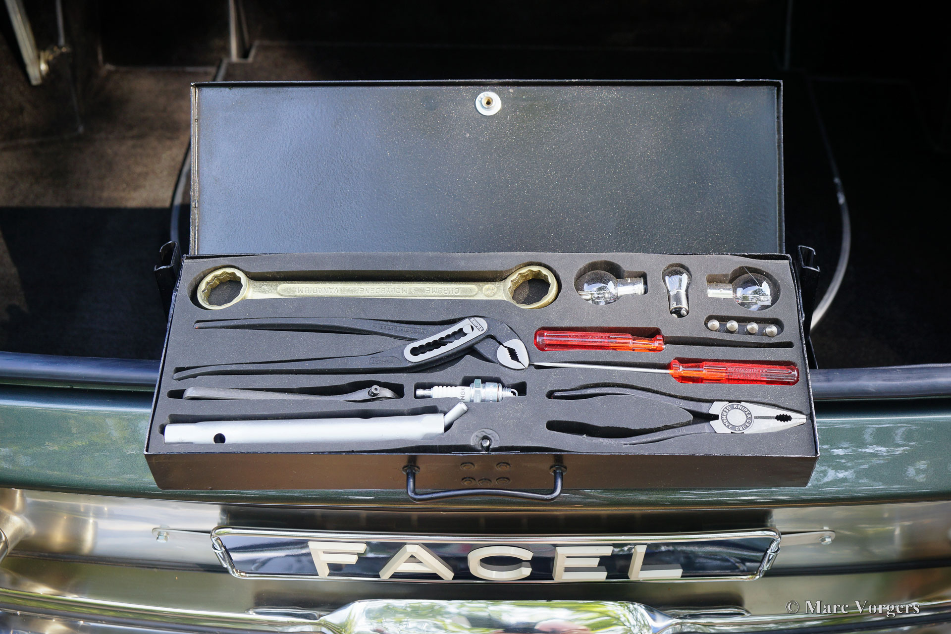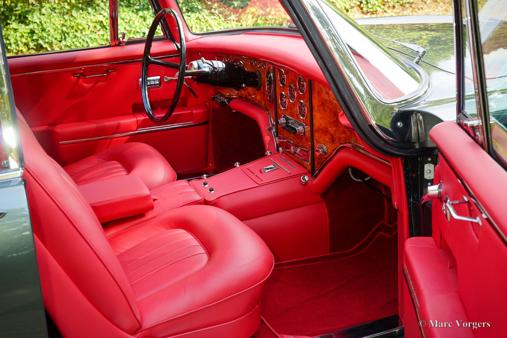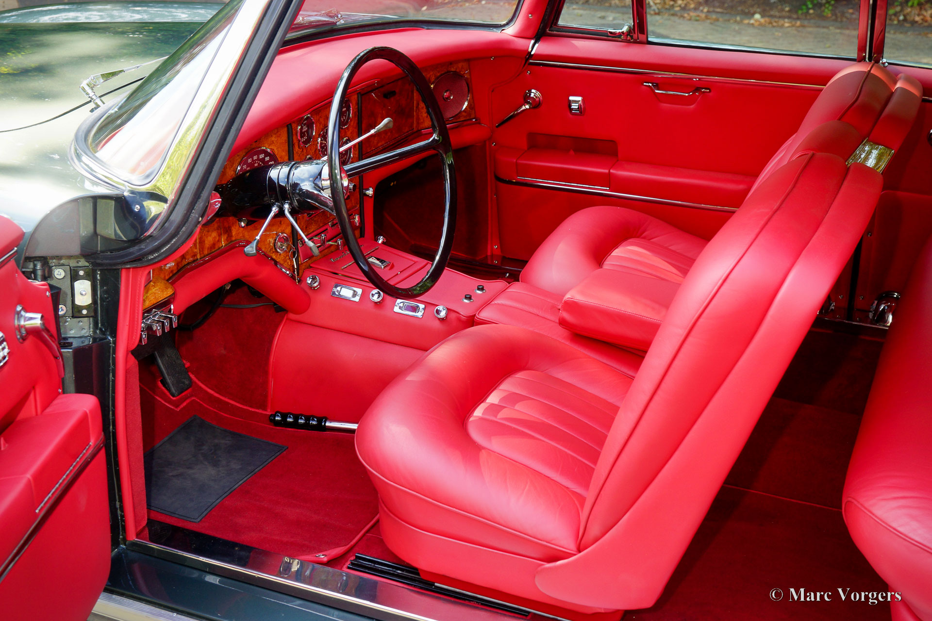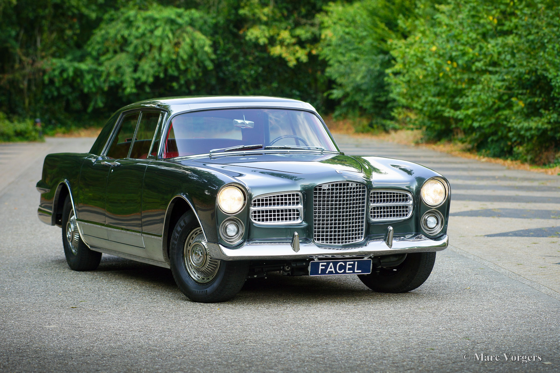 The 5.23 meter long Excellence features four doors of which the doors at the rear are so called suicide doors. The Excellence was built without a B-post. When the doors were opened the large opening was very inviting to enter the fantastic interior. As the other Facels the Excellence was an extremely luxurious automobile with a gorgeous finish and beautiful details. The interior is majestic with it’s mock walnut (in the French tradition) dashboard and beautifully chromed handles and switches. The leather upholstery is of an exceptionally high quality the comfort it offers reflects this. The car comes with all of the novelties which were common on the American market at the time. The robustly built automatic windows and the gear shift with it’s stylish buttons are extremely reliable and never fail. Chrome was used sparingly on Facel cars; the bumpers and side strips are all constructed of stainless steel. The Facel Vega Excellence is built upon a welded steel chassis within which the strong 6.2 litre Chrysler V8 is mounted. The undercarriage has independent wheel suspension with coil springs at the front and a live axle leaf spring suspension system at the rear. From 1960 onwards, the Excellence was equipped with disc brakes all round. Only 150 cars of this model have been built.