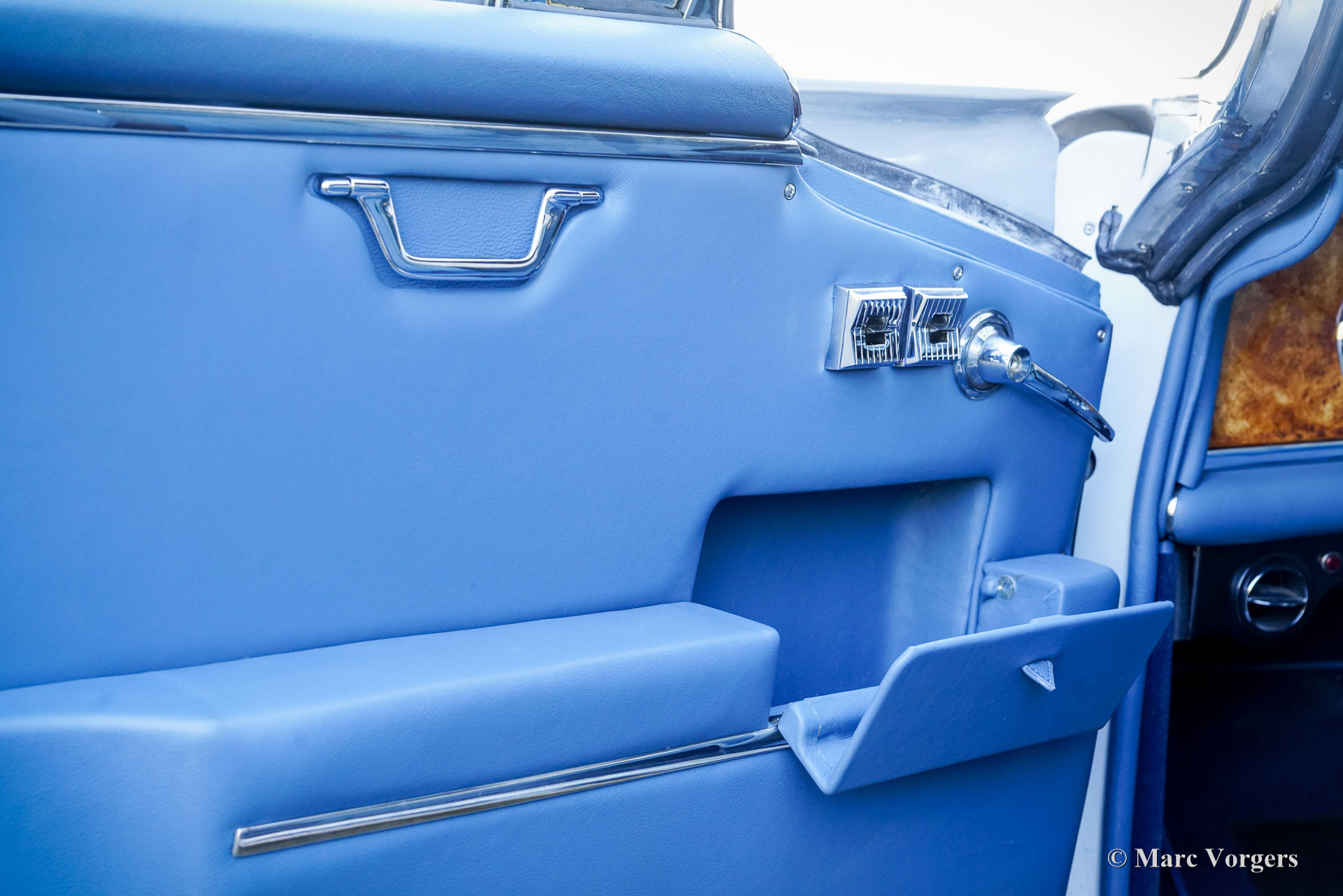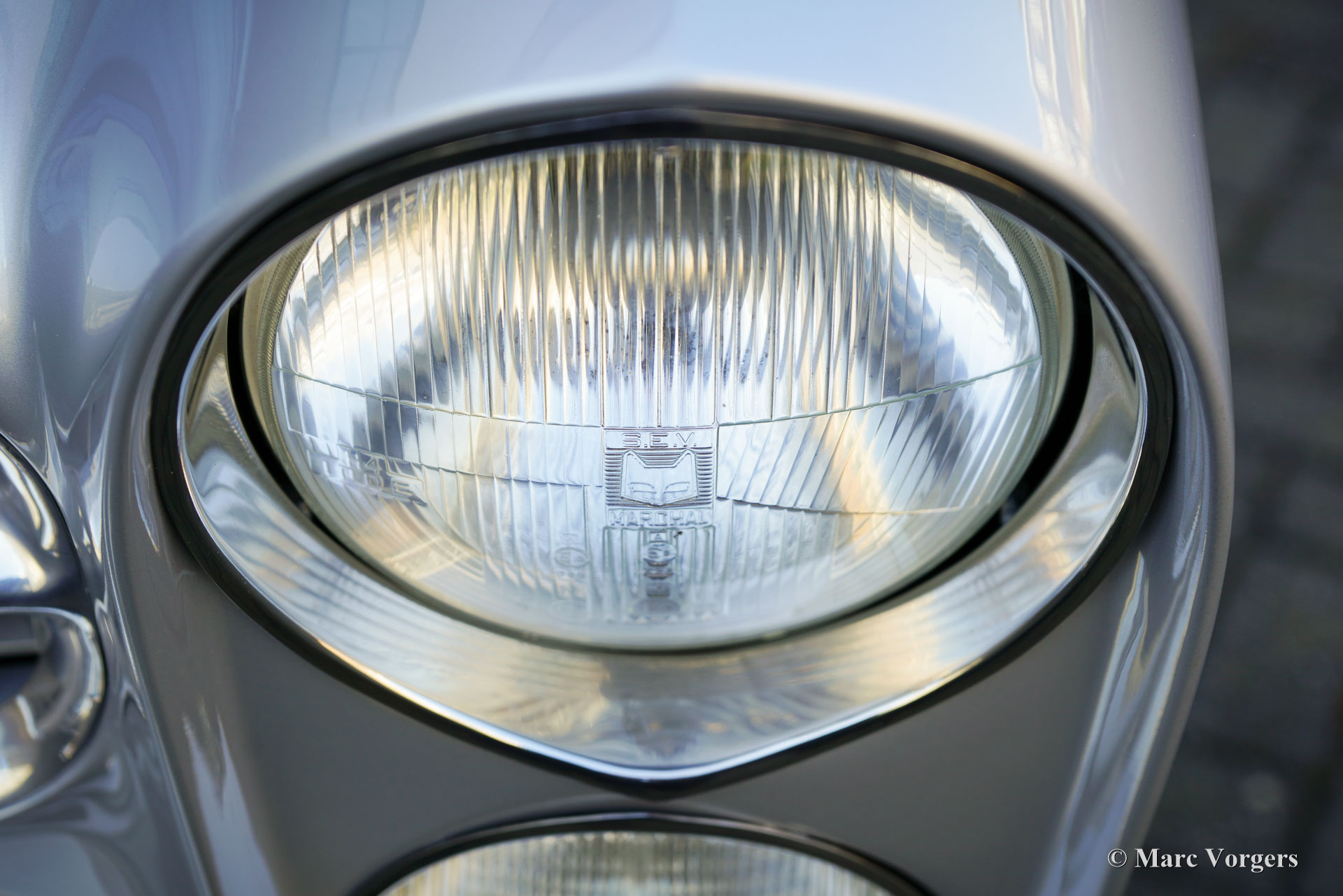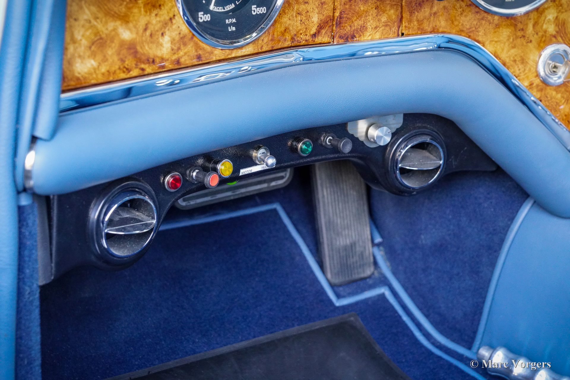 The leather and carpet of the interior have been completely renewed in the original blue colour. The roof lining is executed in grey wool (as original). The steel dashboard has been “re-wooded” and finished with 11 layers of clear lacquer.