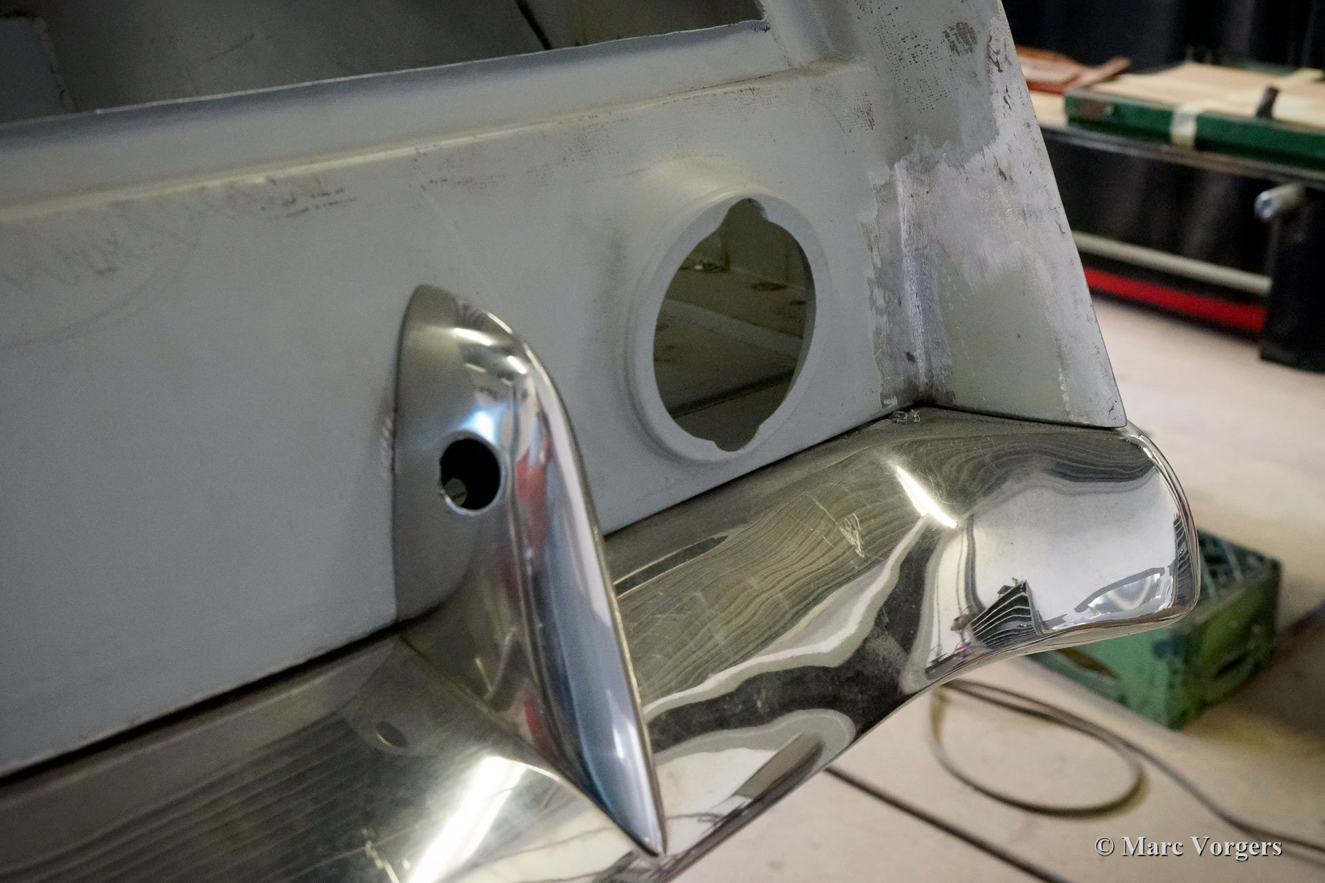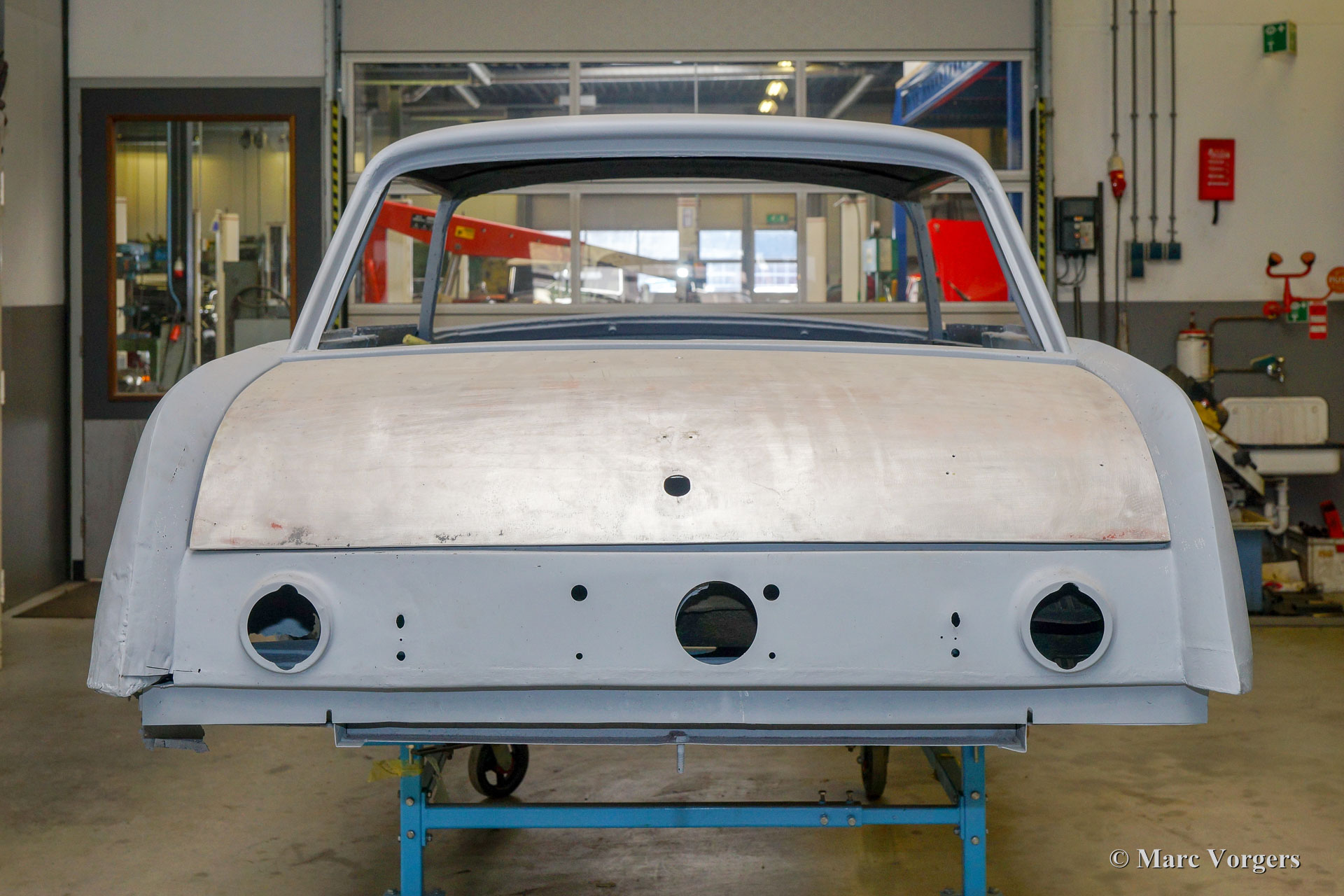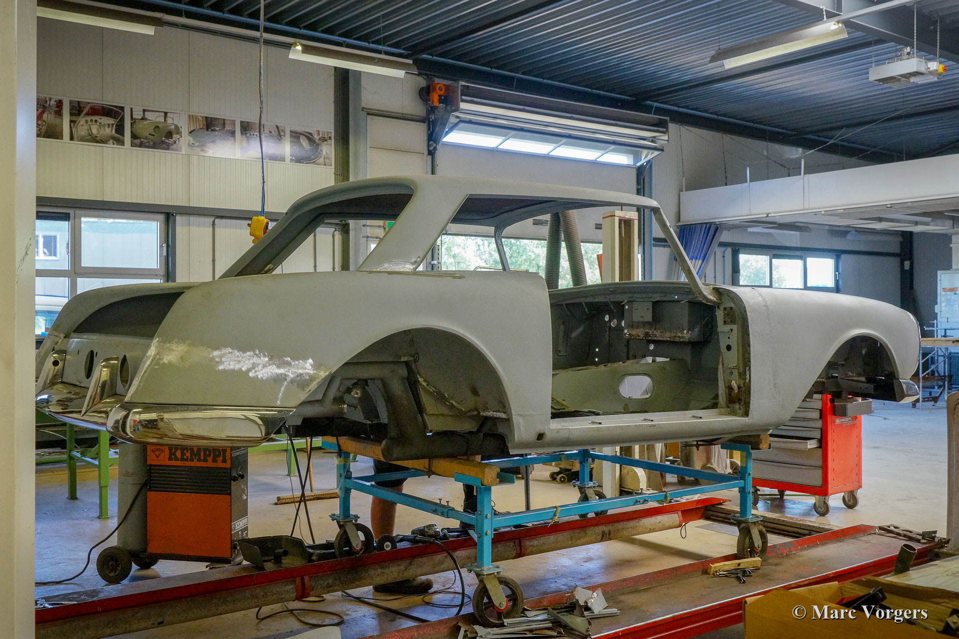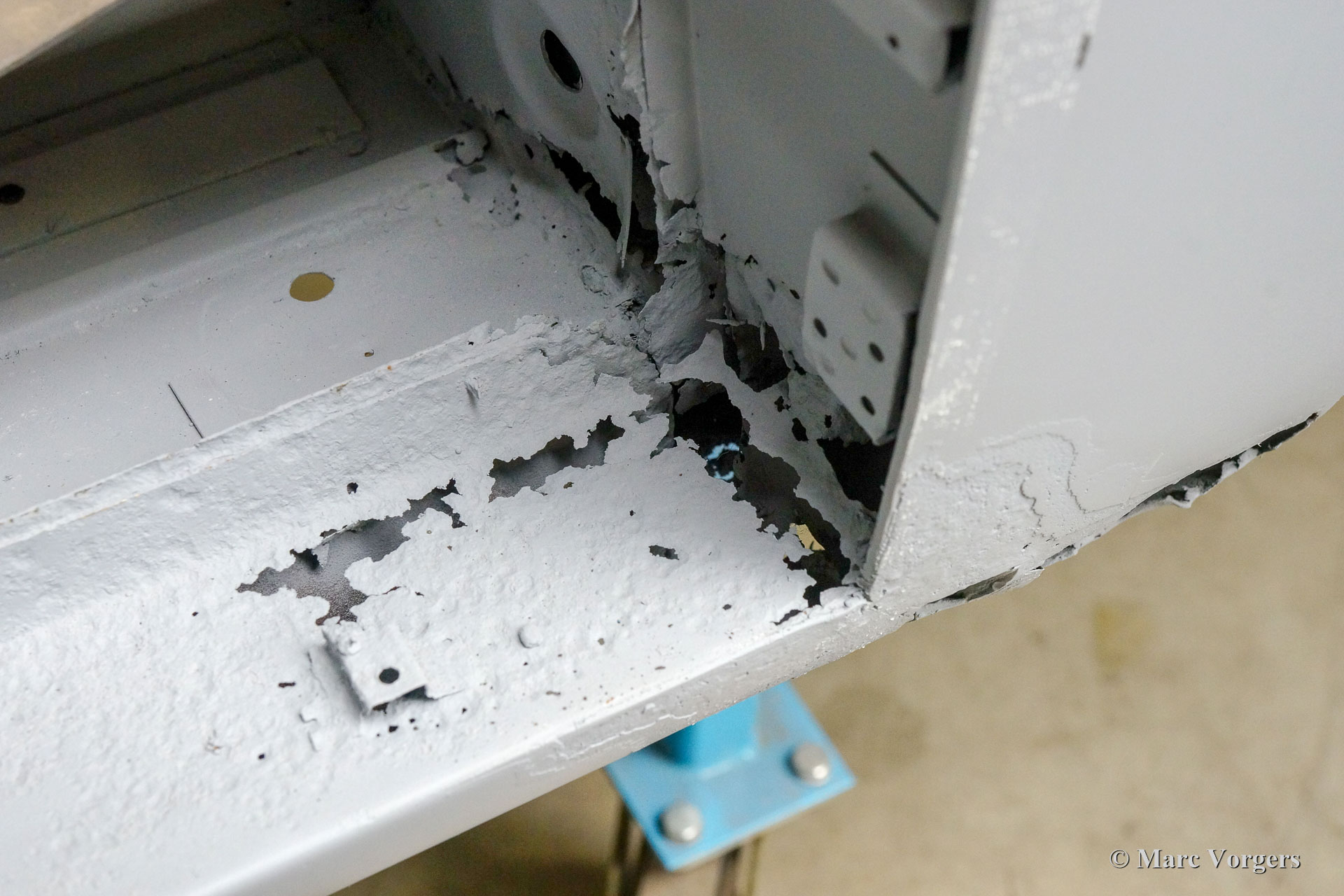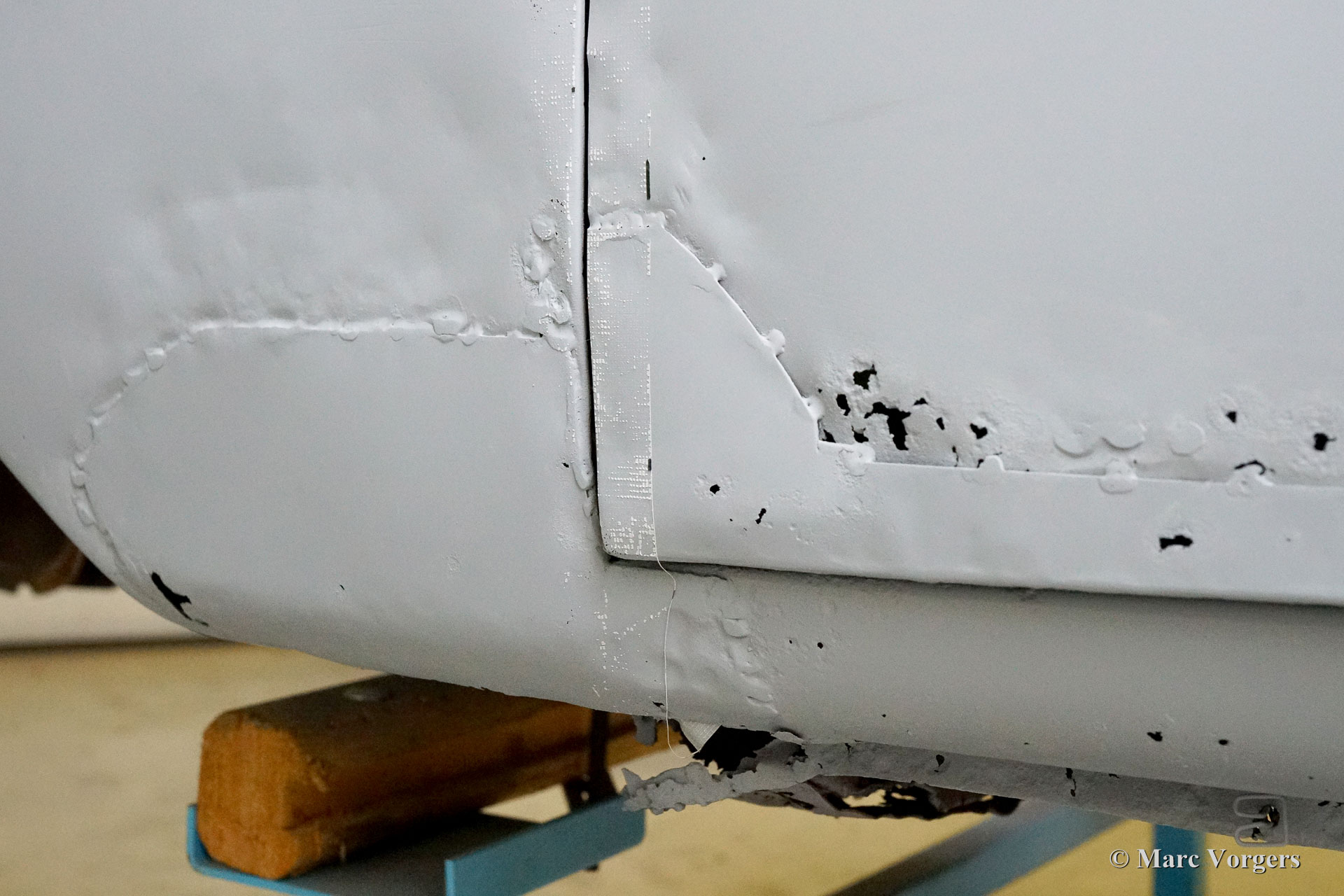 This 1963 Facel Vega Facel 3 is receiving a full bodywork restoration in our workshops. Elsewhere the car was dismantled, and some sheet-metal work was executed. As you can see in the pictures (car in grey primer) the earlier executed work is of a very poor quality… We have started the sheet metal restoration of the bodywork. As you can see in the photos the body is in a quite bad condition. Corrosion has eaten away most lower corners and edges. Many parts of the floor also must be renewed, this is not the easiest job because the Facel 3 body is welded to the steel tubular chassis.