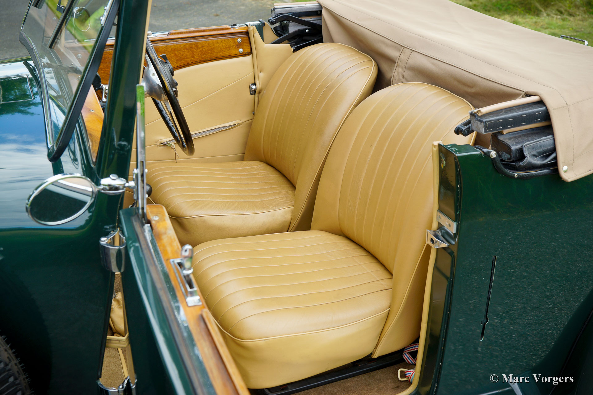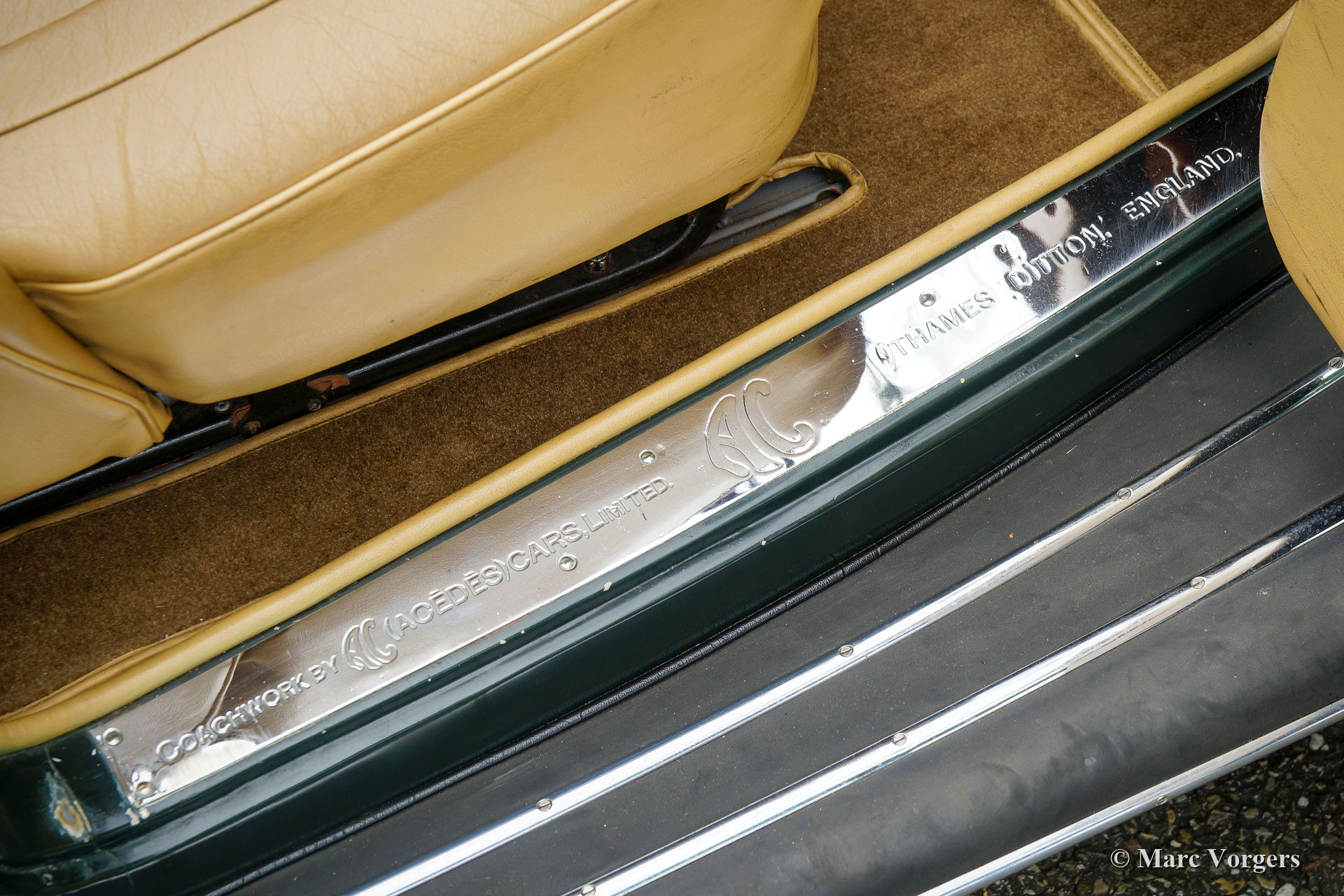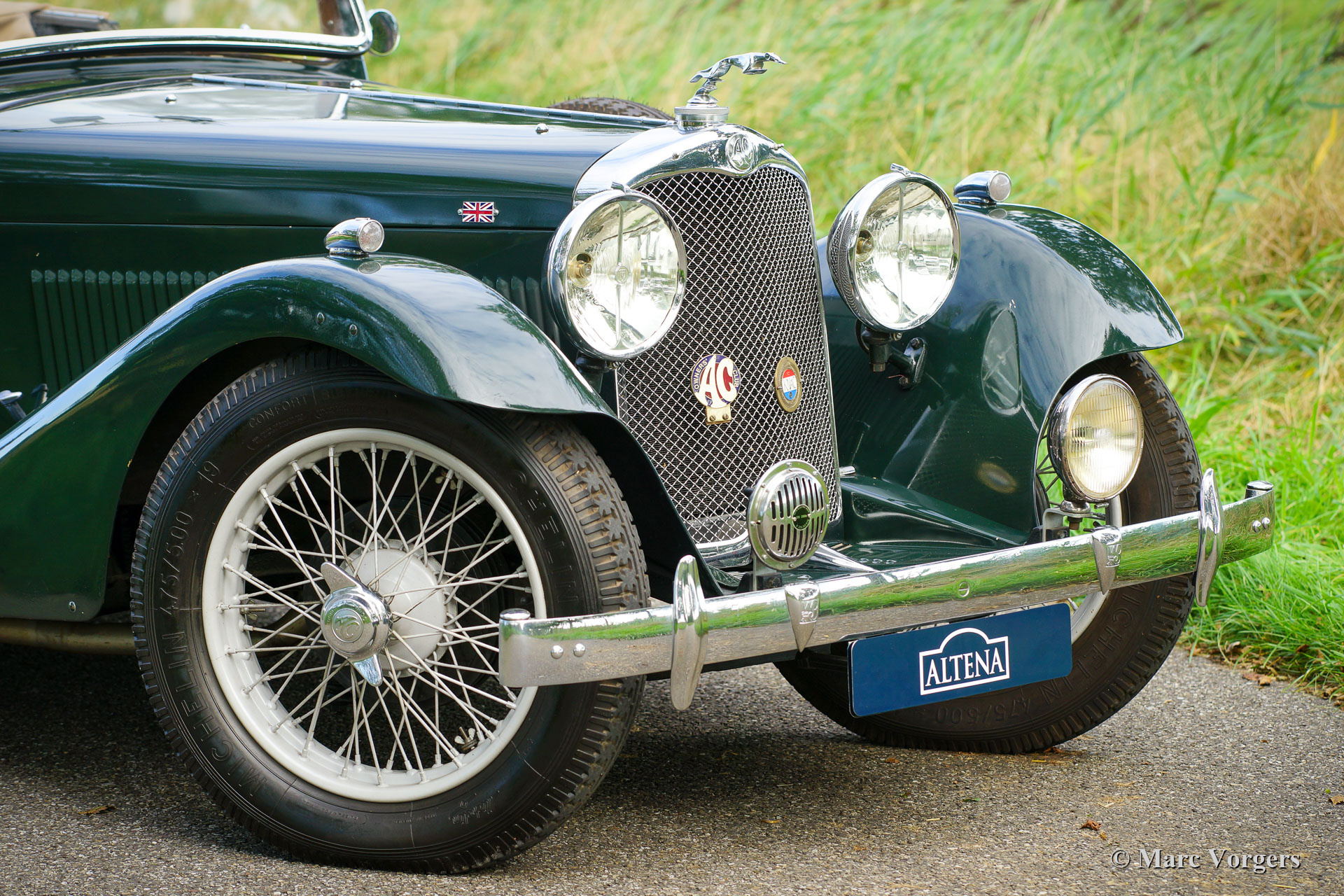 AC (Acédès) 16/66 Drophead Coupe, year 1935. Chassis number L34X, engine number UBS.29X Original UK Registration: DPC918. Colour dark British Racing Green combined with a beige leather interior and light brown carpet trimmed with beige edges. The car features a black vinyl hood and a light brown mohair tonneau cover. This rare AC 16/66 DHC was sold new in the United Kingdom. The automobile was exported to the Netherlands in the year 2000 where it had known one owner until 2019. The car is known to us, and in service at our workshop, since 2019. This AC 16/66 DHC comes with a large history file from new. Photos from the car when new, also picturing the first owner and the original registration. Present is a logbook with the names of all the previous owners and the service and repairs which were carried out over the years. Also present are factory original books, a brochure, and the original V5c document. This gorgeous AC 16/66 DHC drives and handles delightfully, and the 4-speed manually operated gearbox shifts perfectly. The six cylinder in-line engine is the same 1991 cc unit with overhead camshaft and three S.U. carburettors as fitted in the 1953 AC Ace sports car. The AC 16/60 DHC is a two-person car featuring a ‘dickey seat’ in the trunk offering two additional ‘emergency’ seats. This rare AC is a super original car which shows all the original details. The old paintwork shows signs of age but is still very nice, a fantastic pre-war patina! This is a rare AC 16/66 Drophead coupé in super original and wonderful condition! The automobile can be imported and admitted in any country worldwide.