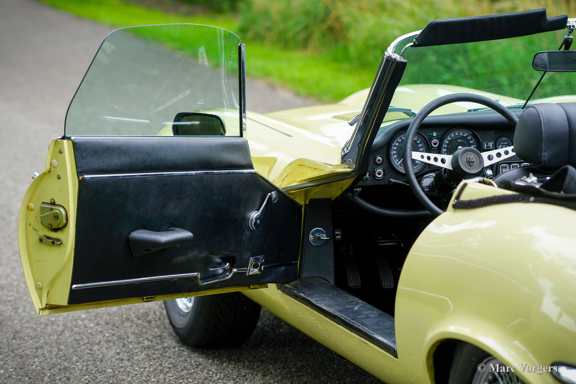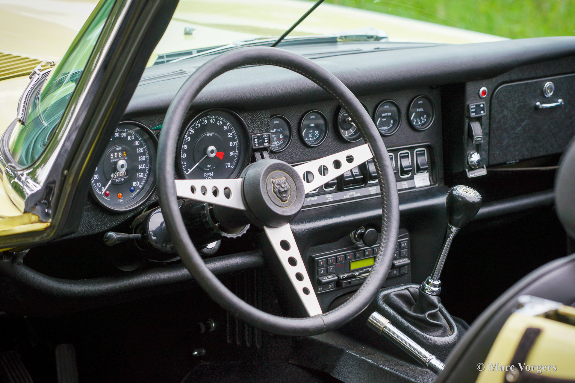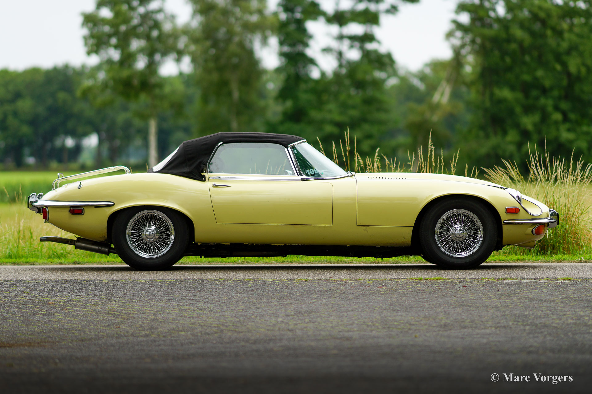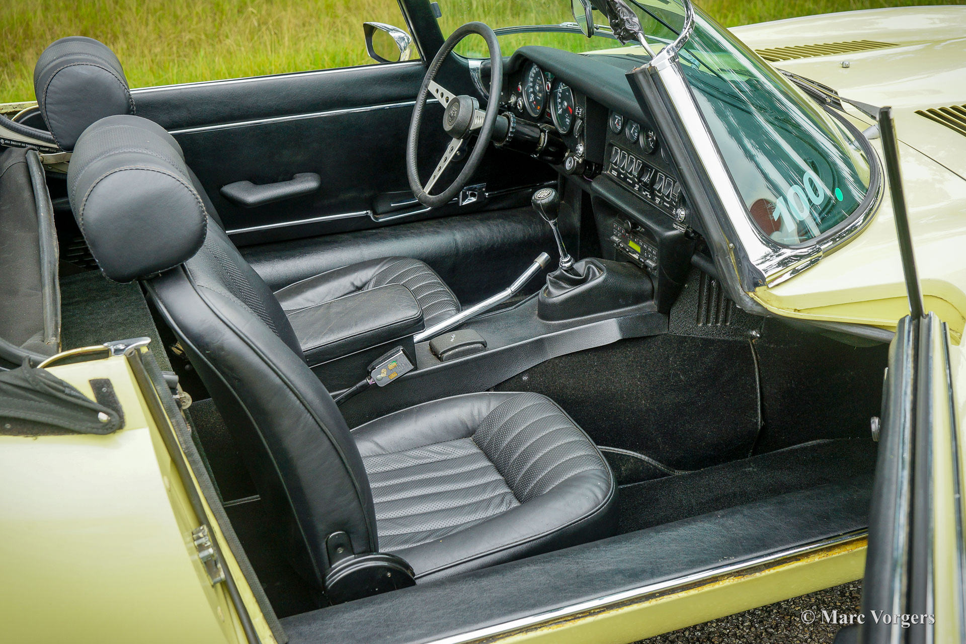 Jaguar E-type V12 Convertible, year 1972. Colour pale Primrose yellow combined with a black leather interior and black carpet. Black mohair soft-top. This super original Jaguar E-type V12 convertible was recently imported from the USA. This is a hard-to-find E-type V12 which is factory fitted with a manually operated 4-speed gearbox! Most E-type V12 cars feature a 3-speed automatic gearbox which suppresses all sporty aspirations. This E-type drives perfectly! The big and powerful V12 engine runs and sounds beautifully, the gearbox shifts swiftly and precisely. This Jaguar E-type is in a very good original condition. The bodywork shows a beautiful panel fit, the paintwork shows slights signs of age (patina), and the original interior is still in excellent original condition. Under the bonnet everything is original and untouched, the original factory decals are still present. This impressive Jaguar E-type is fitted with chrome wire wheels and a vintage Becker radio with cassette player. This Jaguar E-type is a fantastic time capsule and a very desirable driver car. The V12 engine and the manual gearbox are a splendid combination!