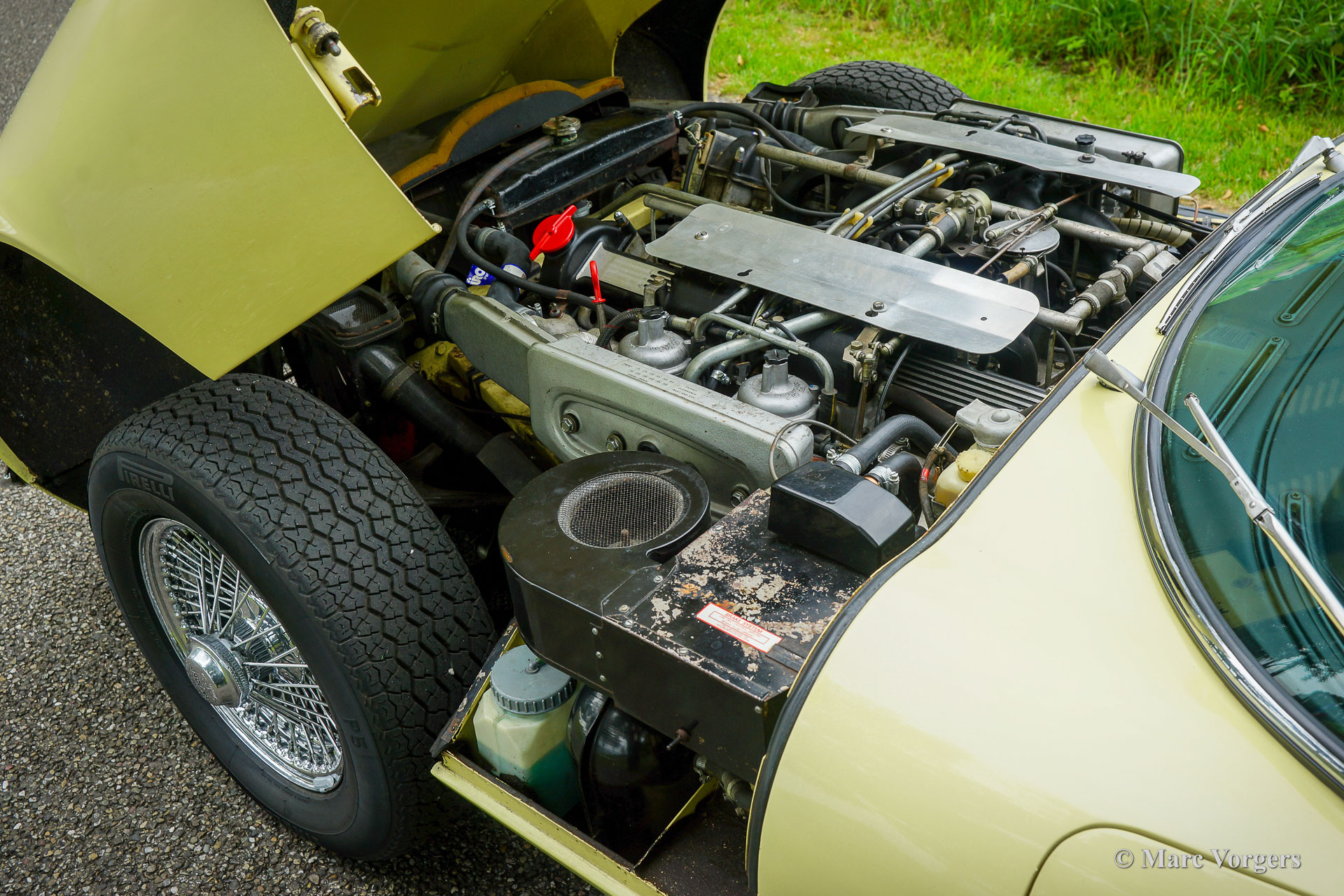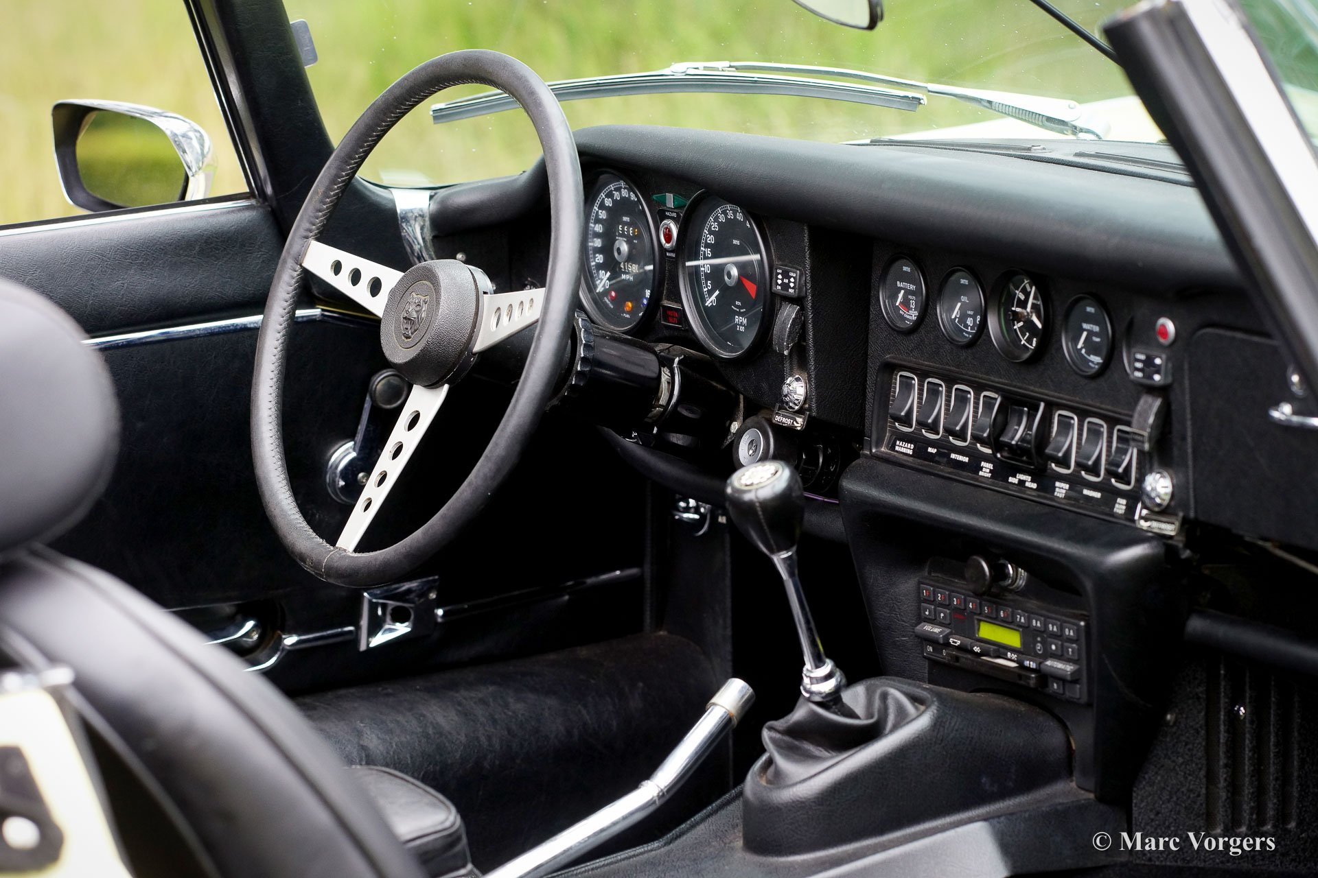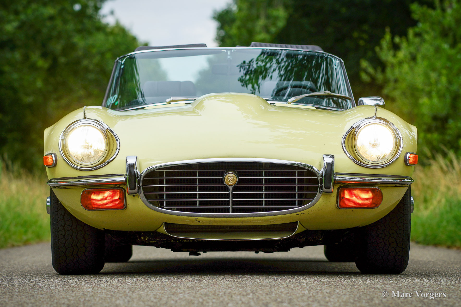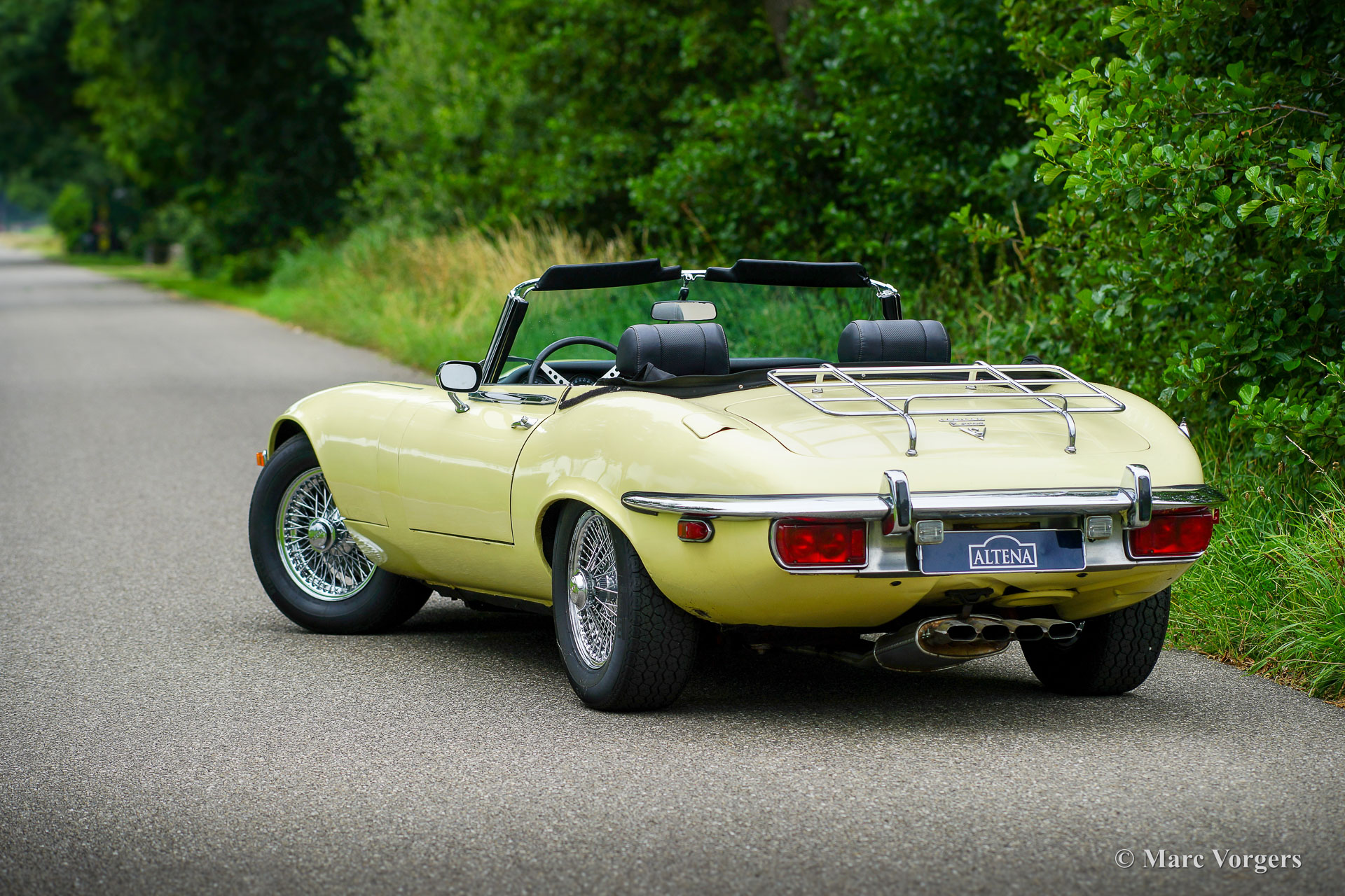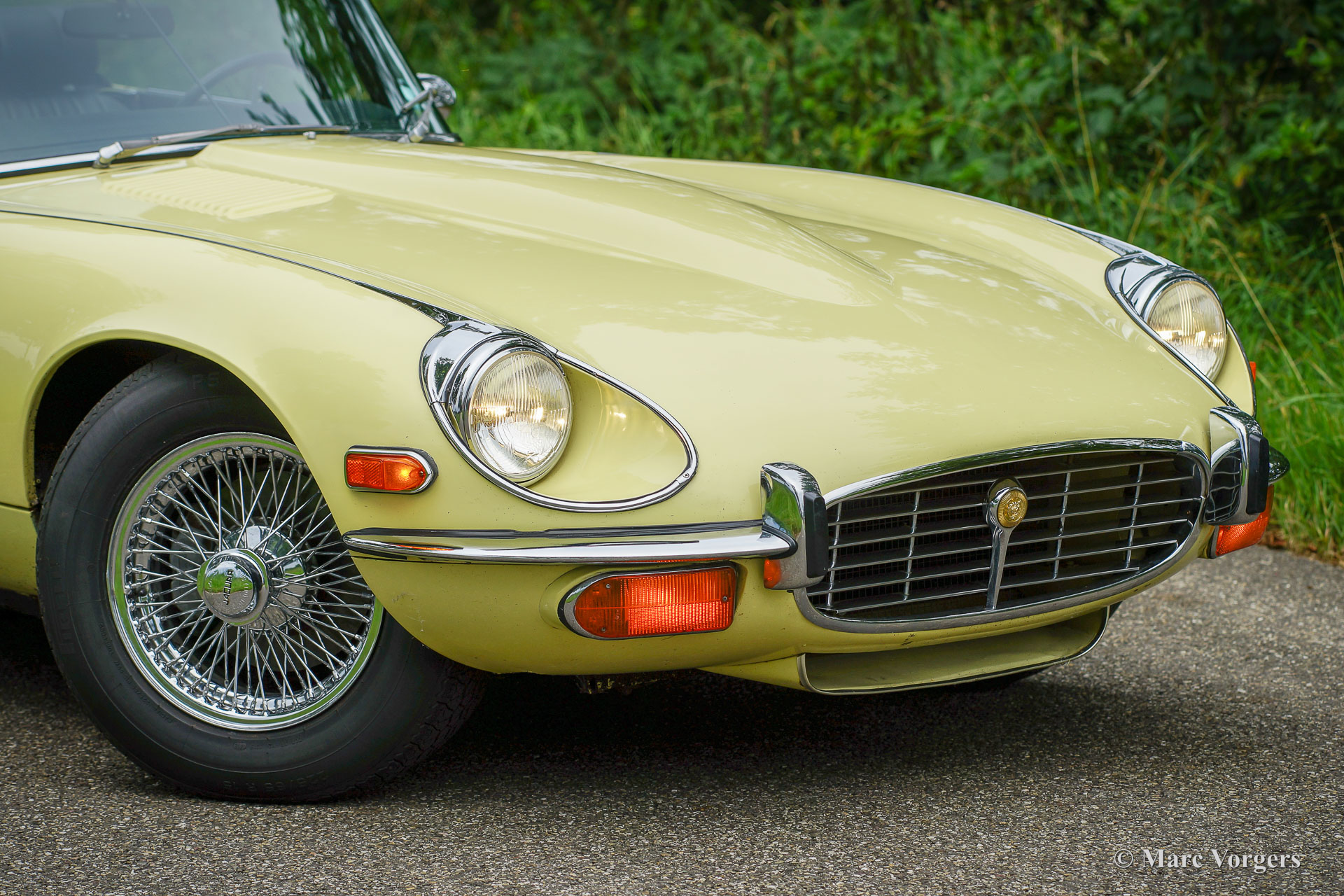 Jaguar E-type V12 Convertible, year 1972. Colour pale Primrose yellow combined with a black leather interior and black carpet. Black mohair soft-top. This super original Jaguar E-type V12 convertible was recently imported from the USA. This is a hard-to-find E-type V12 which is factory fitted with a manually operated 4-speed gearbox! Most E-type V12 cars feature a 3-speed automatic gearbox which suppresses all sporty aspirations. This E-type drives perfectly! The big and powerful V12 engine runs and sounds beautifully, the gearbox shifts swiftly and precisely. This Jaguar E-type is in a very good original condition. The bodywork shows a beautiful panel fit, the paintwork shows slights signs of age (patina), and the original interior is still in excellent original condition. Under the bonnet everything is original and untouched, the original factory decals are still present. This impressive Jaguar E-type is fitted with chrome wire wheels and a vintage Becker radio with cassette player. This Jaguar E-type is a fantastic time capsule and a very desirable driver car. The V12 engine and the manual gearbox are a splendid combination!