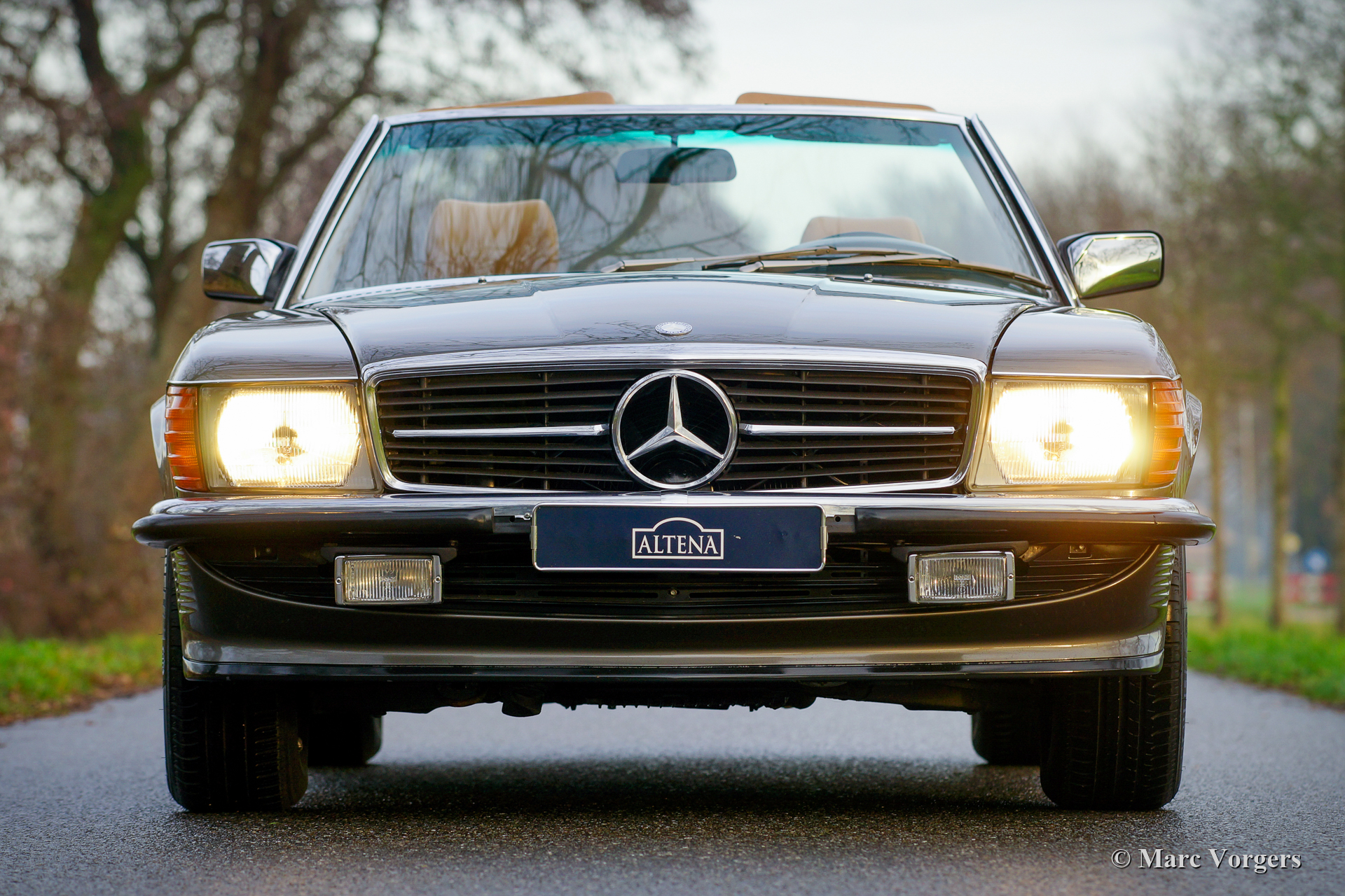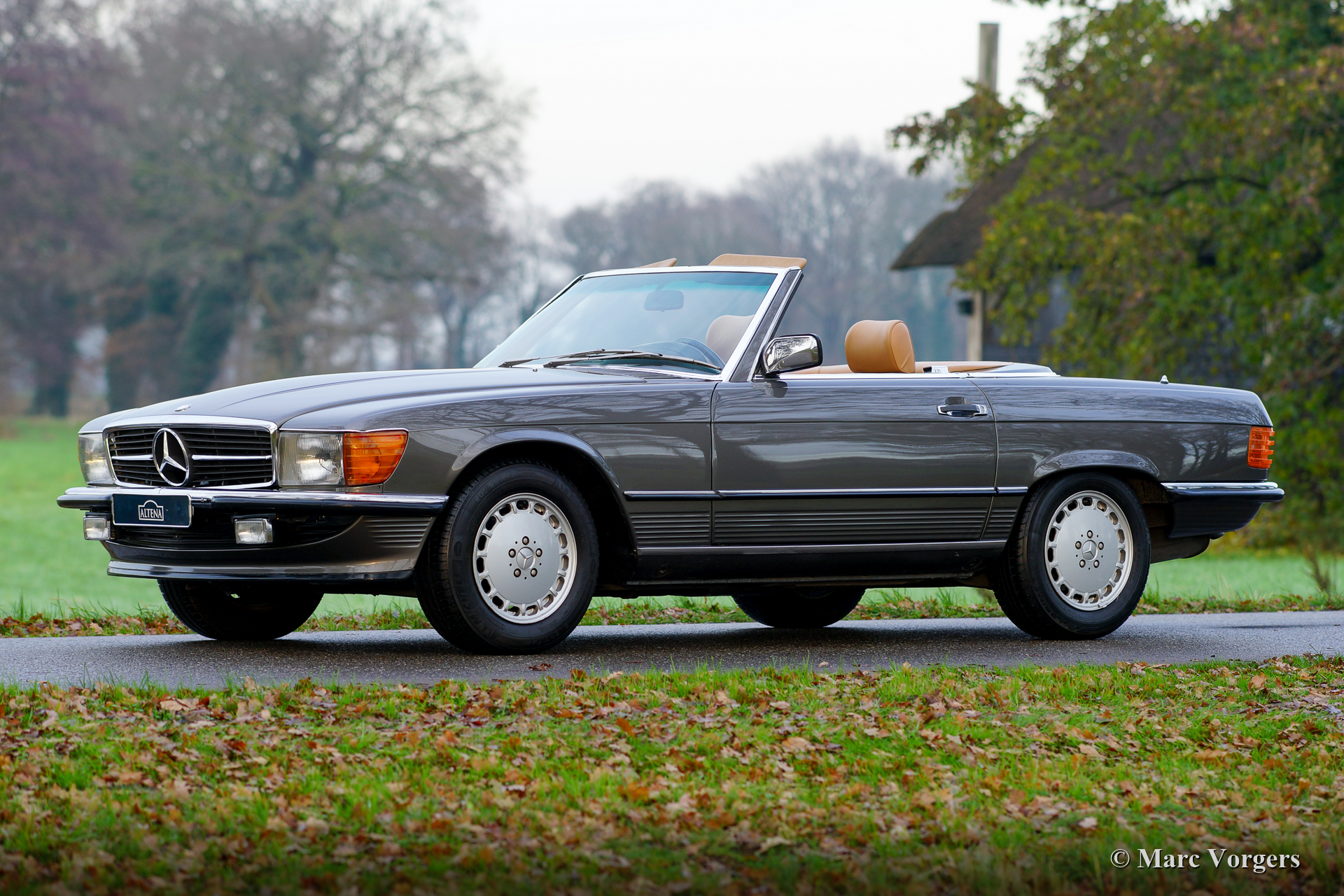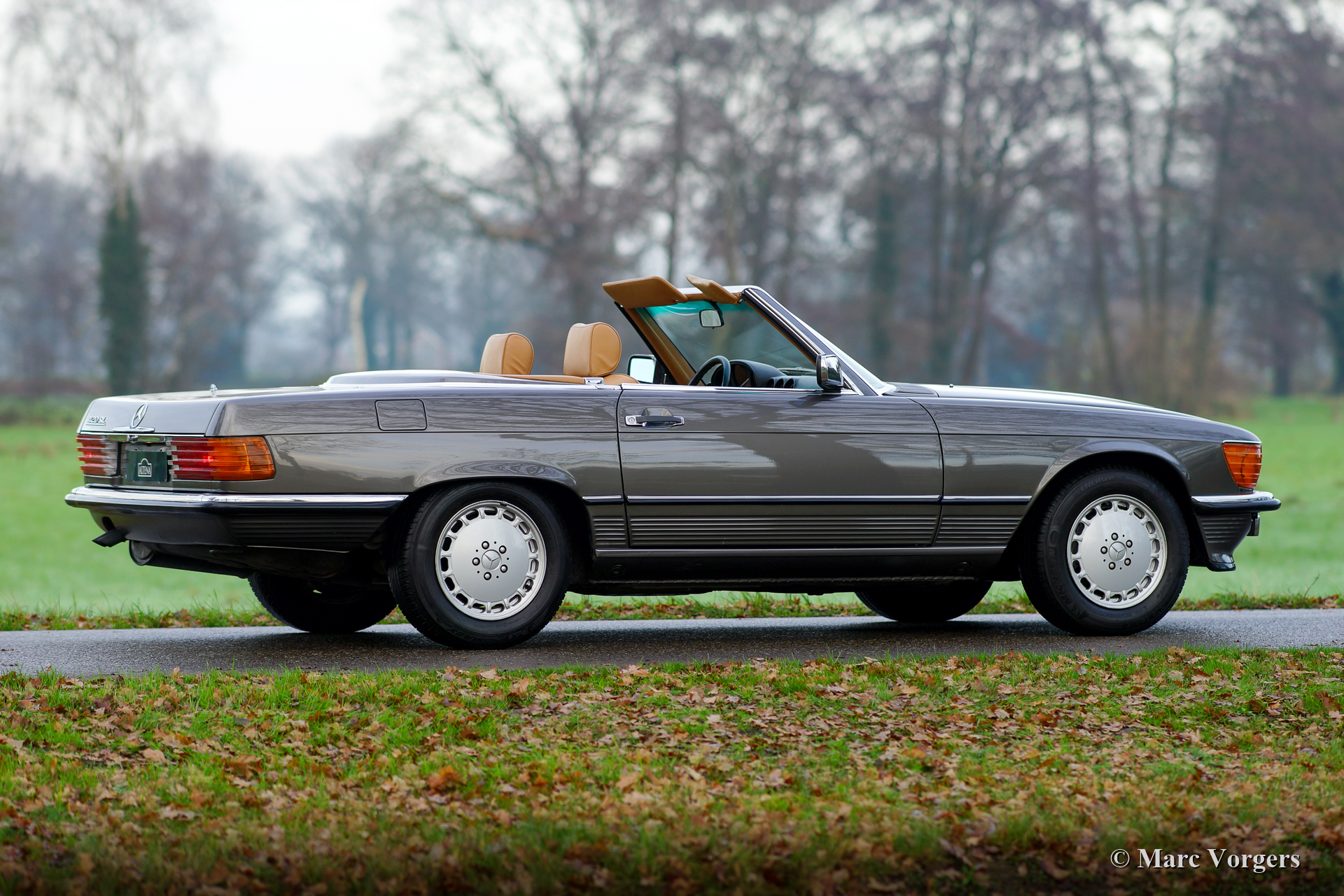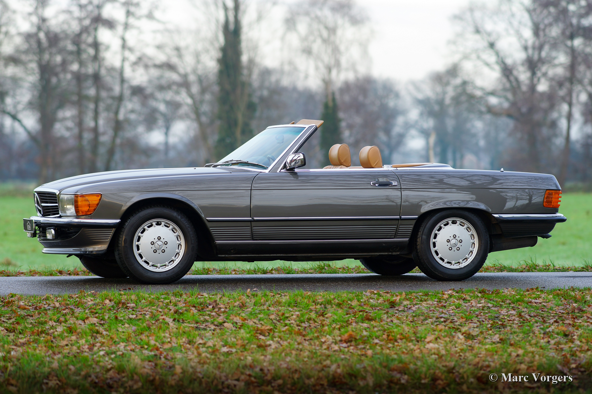 Mercedes-Benz 420 SL (R107 model), year 1986. Colour dark grey metallic combined with a tan (dark beige) leather interior. Black mohair soft-top and a hard top in body colour. This wonderful Mercedes-Benz 420 SL was sold new in Belgium. The 420 SL is a rare R107 model, only 2148 cars of this type were built. This example is in excellent and super original condition. The paintwork is wonderful, the chrome brilliant, the original interior shows minimal traces of use. The under-bonnet appearance is beautifully clean. The original hard- top is in very good condition. The car has driven 158.000 kilometres from new, it drives and handles perfectly and the V8 engine sound is fantastic. This Mercedes SL was serviced and maintained perfectly over the years; the punctual service intervals are all noted in the service book. This Mercedes comes with a complete history file from new. The original instruction manuals, tools, spare wheel, and jack are present. The fantastic looks of this Mercedes-Benz 420 SL are complimented by the original 15-inch alloy wheels which are shod with Michelin 205/65 tyres. This is a very desirable specimen!