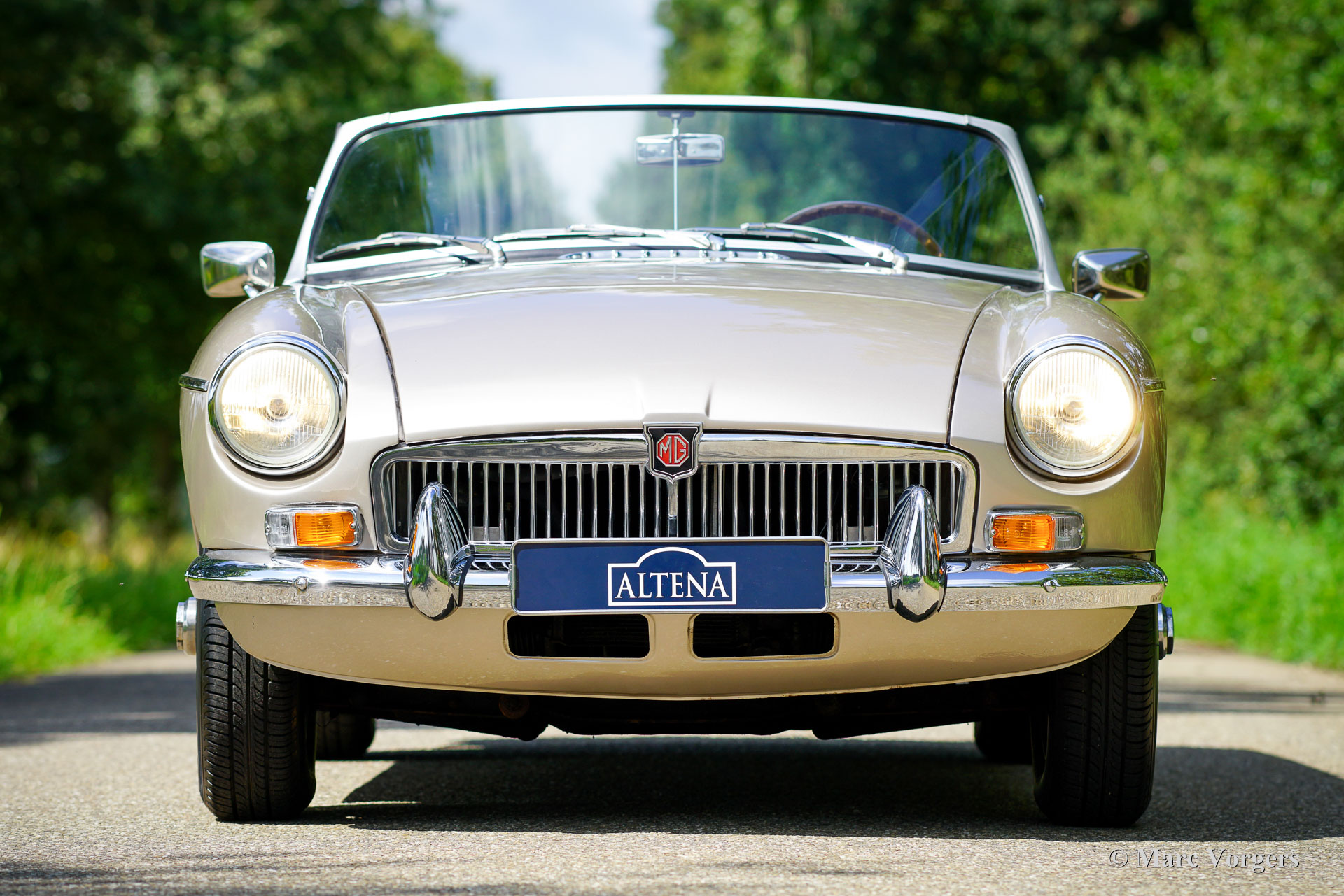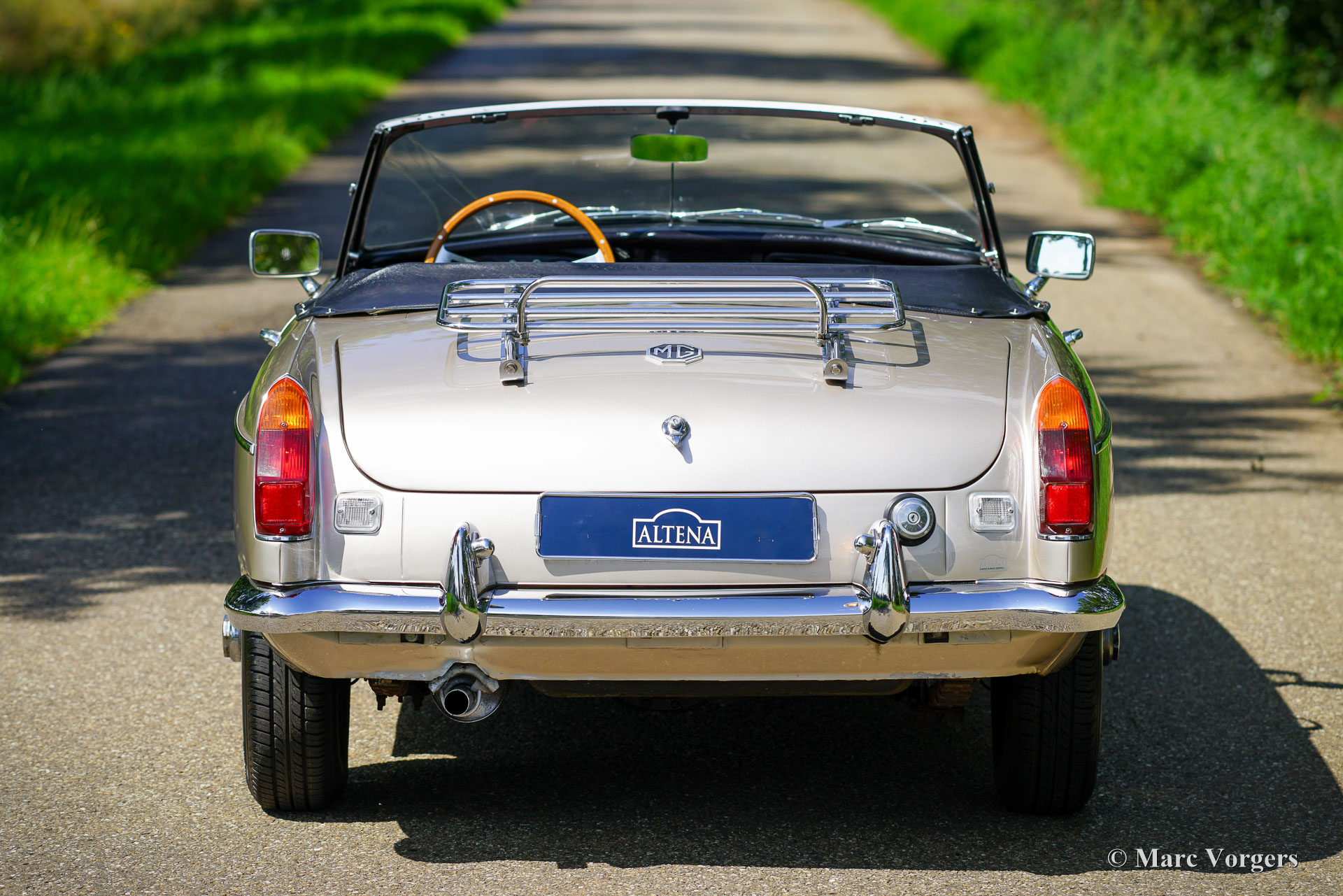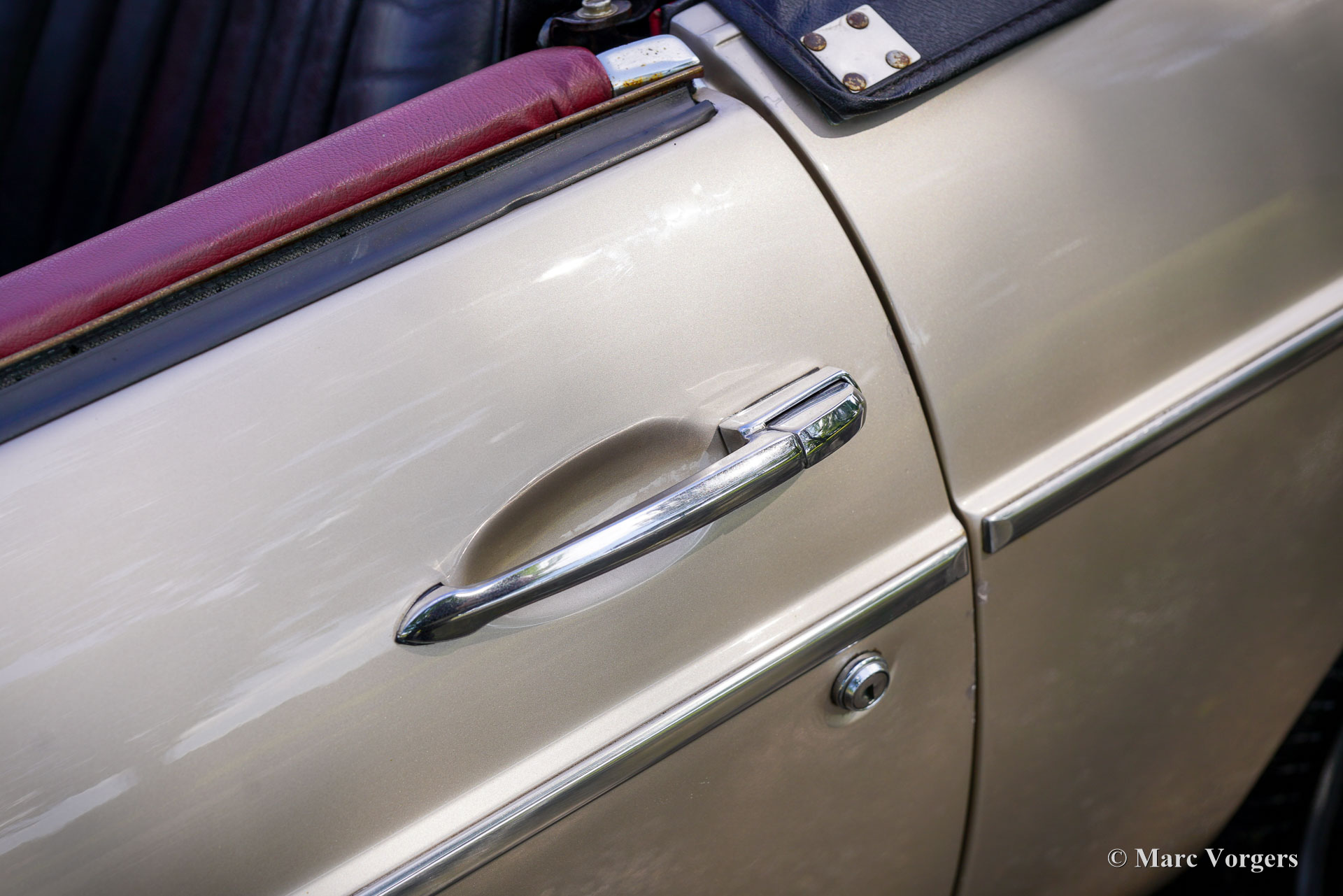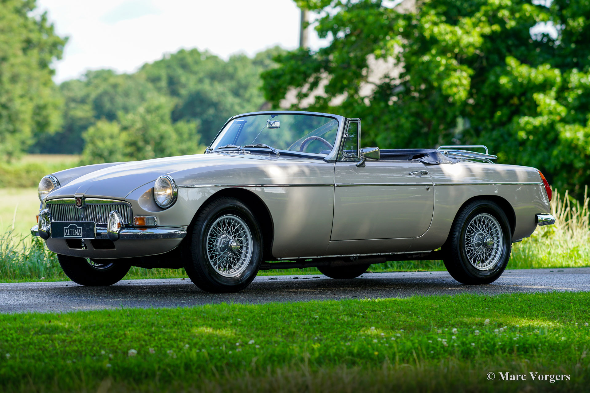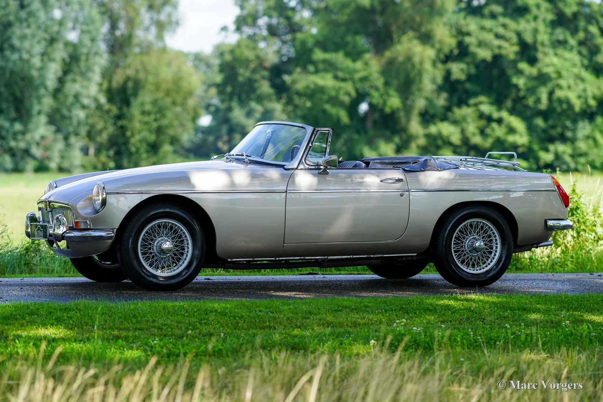 MG MGB roadster, year 1976. Colour Golden Beige metallic combined with a two-tone black / red interior. Black leather seats and dashboard, red door panels and carpet. Black vinyl soft top and hood cover. This wonderful MGB roadster was sold new in the Netherlands. The car was sold with rubber bumpers, during the body restoration these were exchanged for beautiful chrome examples of the earlier model. The body was also professionally painted in golden Beige metallic. This delightful MGB roadster is in a very good condition and the car drives perfectly! The car was beautifully serviced and garaged with care. The interior shows only slight signs of previous use, the engine room and the boot are perfectly clean and extraordinarily well detailed. This MGB features wonderful silver wire wheels, chrome wheel nuts, a Stainless-Steel luggage rack, and a sports steering wheel with wood rim. The MGB roadster is one of the most practical and reliable classic British roadsters, and they come with low maintenance costs as a bonus! This wonderful example is ready for many adventures in the hands of a proud new owner!