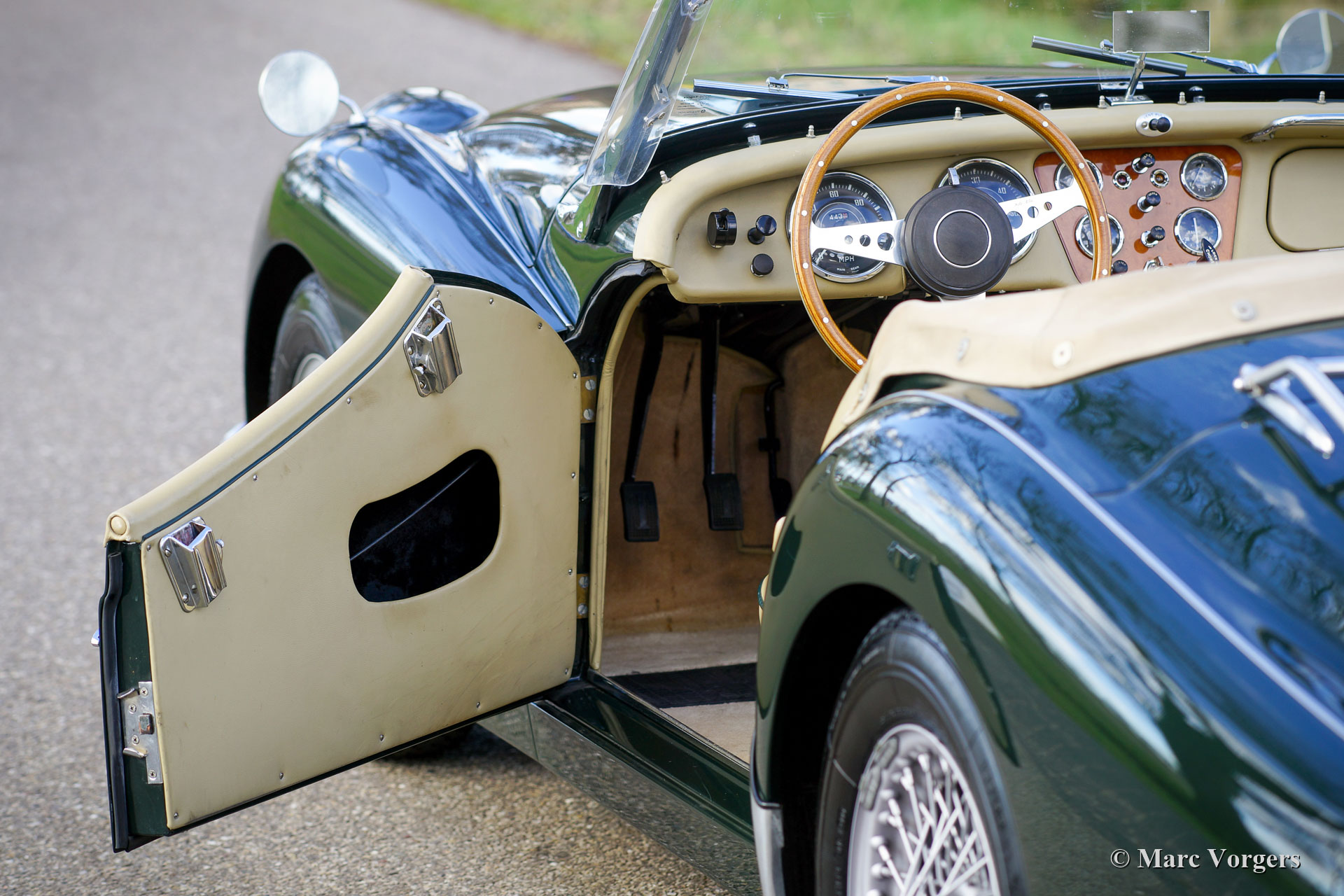 Triumph TR 3A, year 1958. Colour British Racing Green combined with a beige (tan) leather interior trimmed with dark green piping and beige carpet. Beige mohair soft top, side-screens, tonneau cover and hood cover all in beautiful clean condition. This fantastic Triumph TR 3A was sold new in the USA. The car was imported from Washington to the Netherlands in 1998. In the year 2000 the car was ‘body off’ restored to top condition. A photo report of the restoration is present. The bodywork shows a perfect panel fit, and the car feels solid. The restoration was a thorough job, and the car was very well serviced and cherished ever since. This TR 3A is in an excellent condition with only slight traces of previous use to be found. The car is factory fitted with overdrive! Furthermore, the car features silver painted wire wheels shod with Michelin 165/15 tyres, a MotoLita sports steering wheel with a wood rim, a chrome baggage rack, and a badge bar at the front with several badges and Lucas SLR576 spot lamps fitted. This gorgeous Triumph TR 3A offers a fantastic classic open top driving experience, and it is ready for any adventure in the hands of a new enthusiast owner.