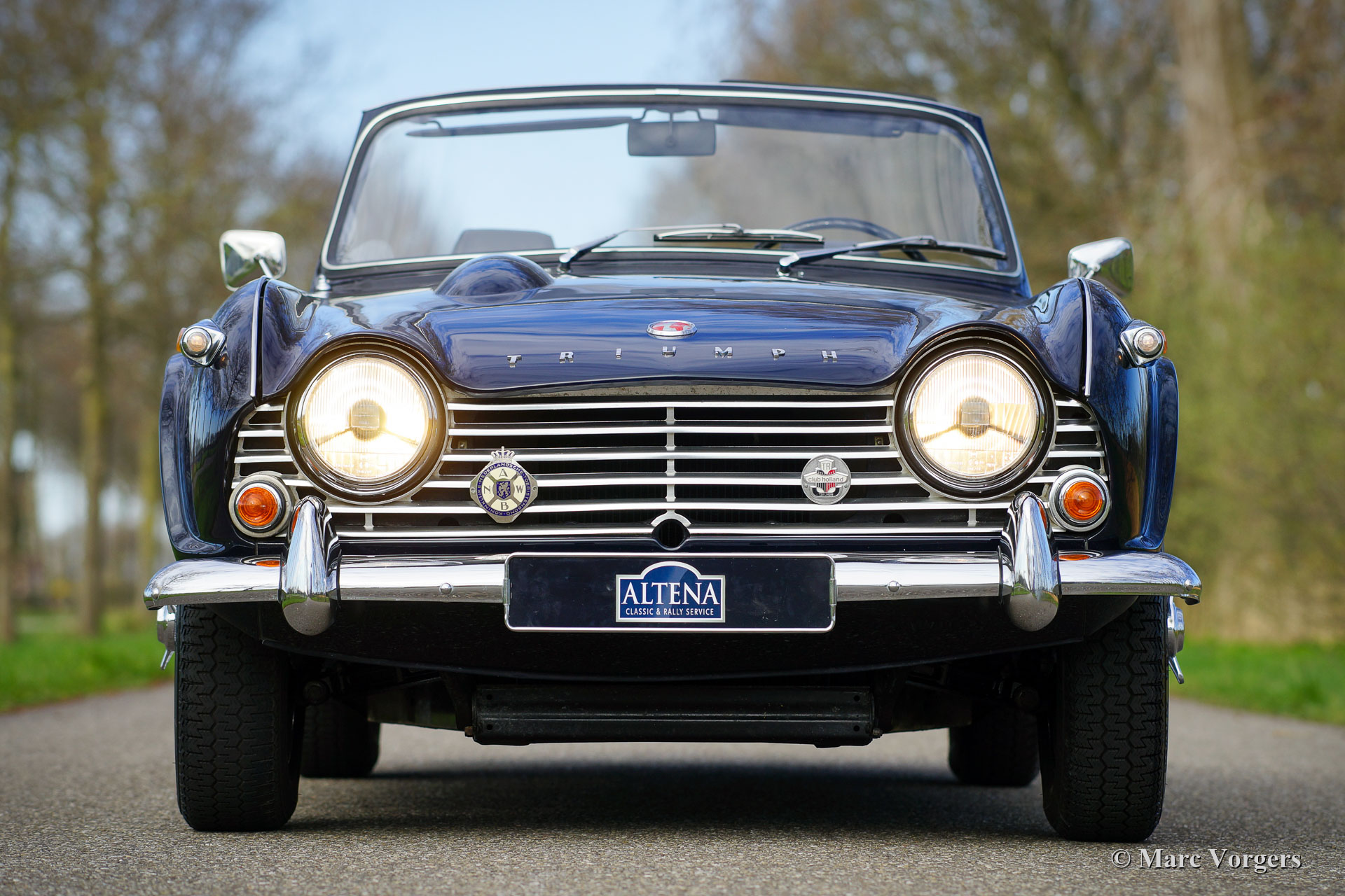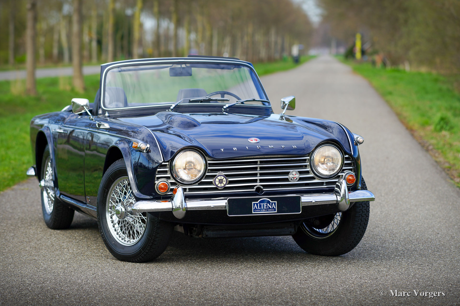 Triumph TR 4 A IRS, year 1967. A Heritage certificate is present, matching numbers. Colour dark blue combined with a black leather interior trimmed with white piping, and black carpet. Crème vinyl soft-top and hood cover, black hood cover. This beautiful Triumph TR 4 was sold new in the USA. The car was imported from Pennsylvania to the Netherlands in 1994. The original Pennsylvania numberplate has a place of pride in the boot. After arrival in the Netherlands the automobile was extensively restored by a Triumph specialist. A photo report of the restoration is present. This TR 4 A IRS (Independent Rear Suspension) is in very good to excellent condition and the car drives superbly. The TR 4 A IRS is the final incarnation of the TR 4 model series, fitted with the most powerful engine, more comfortable independent rear suspension and the wonderful chrome body trim. This example offers a bit more ‘punch’ because two twin-choke Weber carburettors were fitted! Furthermore, this TR 4 is fitted with Triumph TR 6 seats with headrests for added comfort and safety, overdrive, chrome wire wheels, original size 165/15 Michelin tyres, a Stainless-Steel exhaust, a chrome baggage rack. The TR 4 A IRS is a hard to find TR 4 model, this is a very desirable example!