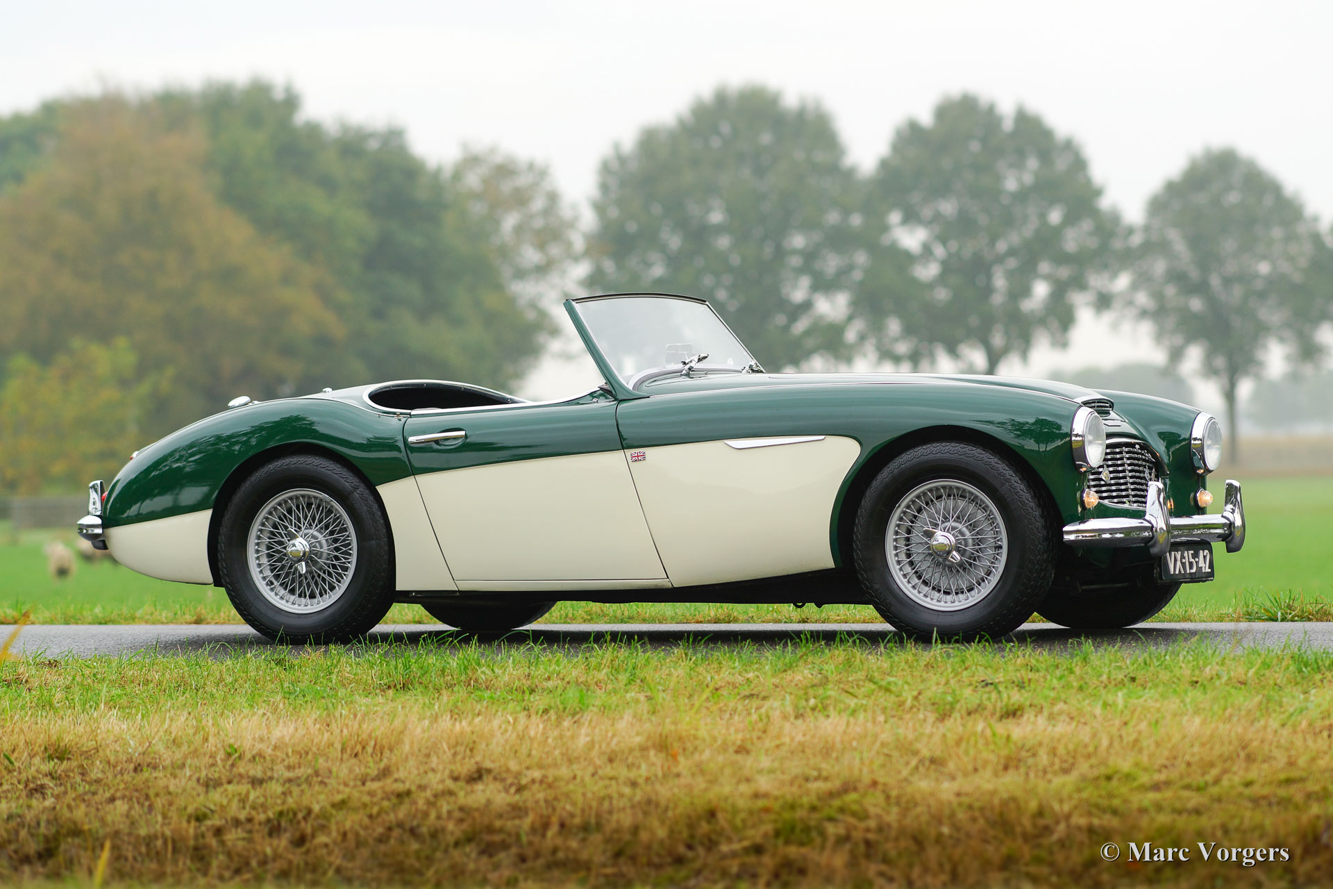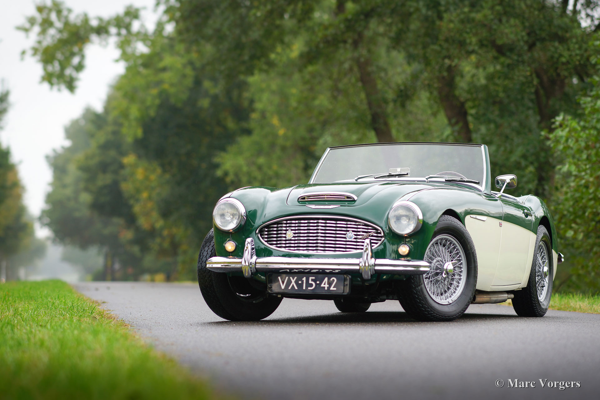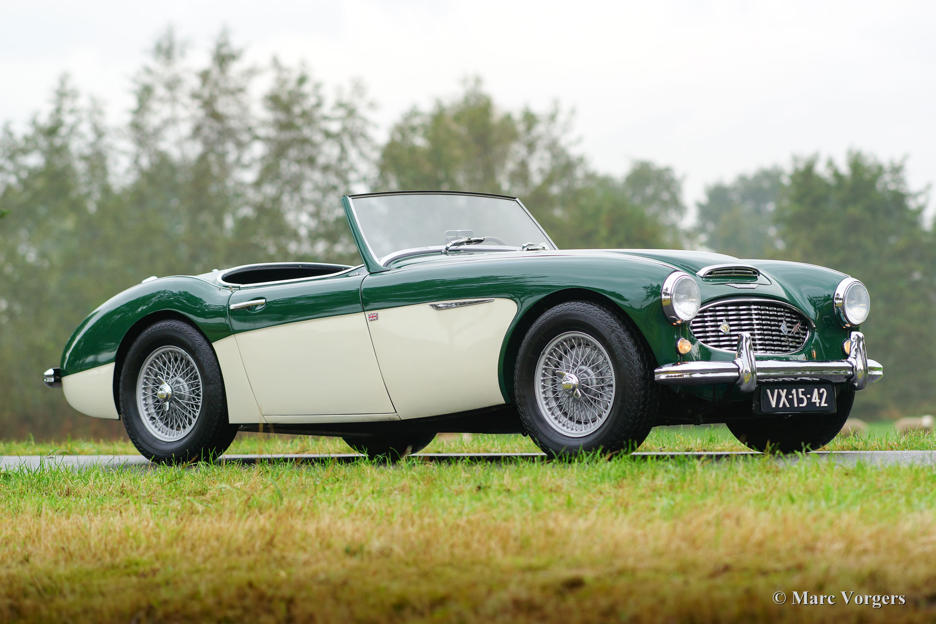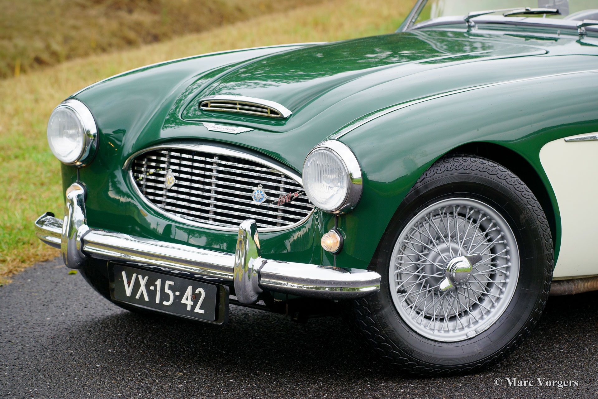 Austin Healey 100/6 ‘two-seater’, year 1957. Chassis number BN4-L/349XX. Colour British Racing Green over crème white. Black leather interior and black carpet. This wonderful ‘100-SIX’ two-seater was sold new in the Netherlands; it still has the old registration number VX-15-42 and it comes with a copy of its first Dutch registration document. In the years 2004/ 2005 the car was given partial restorations, amongst others the bodywork was given beautiful new paint. This ‘Big Healey’ is in good to very good driver condition and the car drives and steers magnificently! The car features a Stainless-Steel exhaust system, 123 electronic ignition, an AC generator (alternator), bigger carburettors, a 60-litre aluminium petrol tank, an electric cooling-fan, beautiful 72-spoke wire wheels with Vredestein Classic 185/15 tires, and, last but not least, a delightful Moto-Lita sports steering wheel with wood rim. This Healey comes complete with a Heritage certificate. A rare and sought after two-seater!