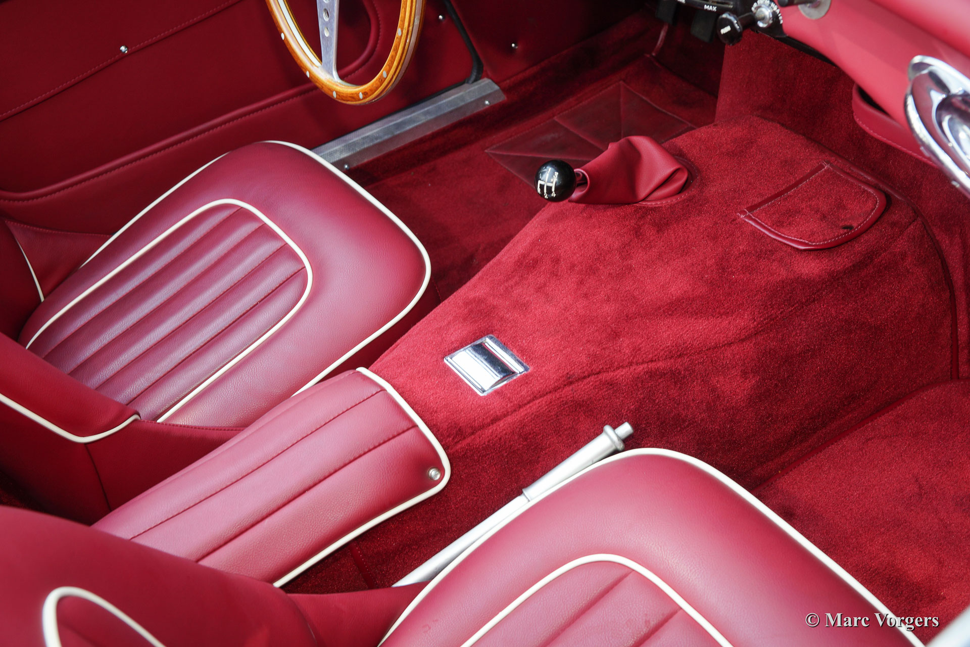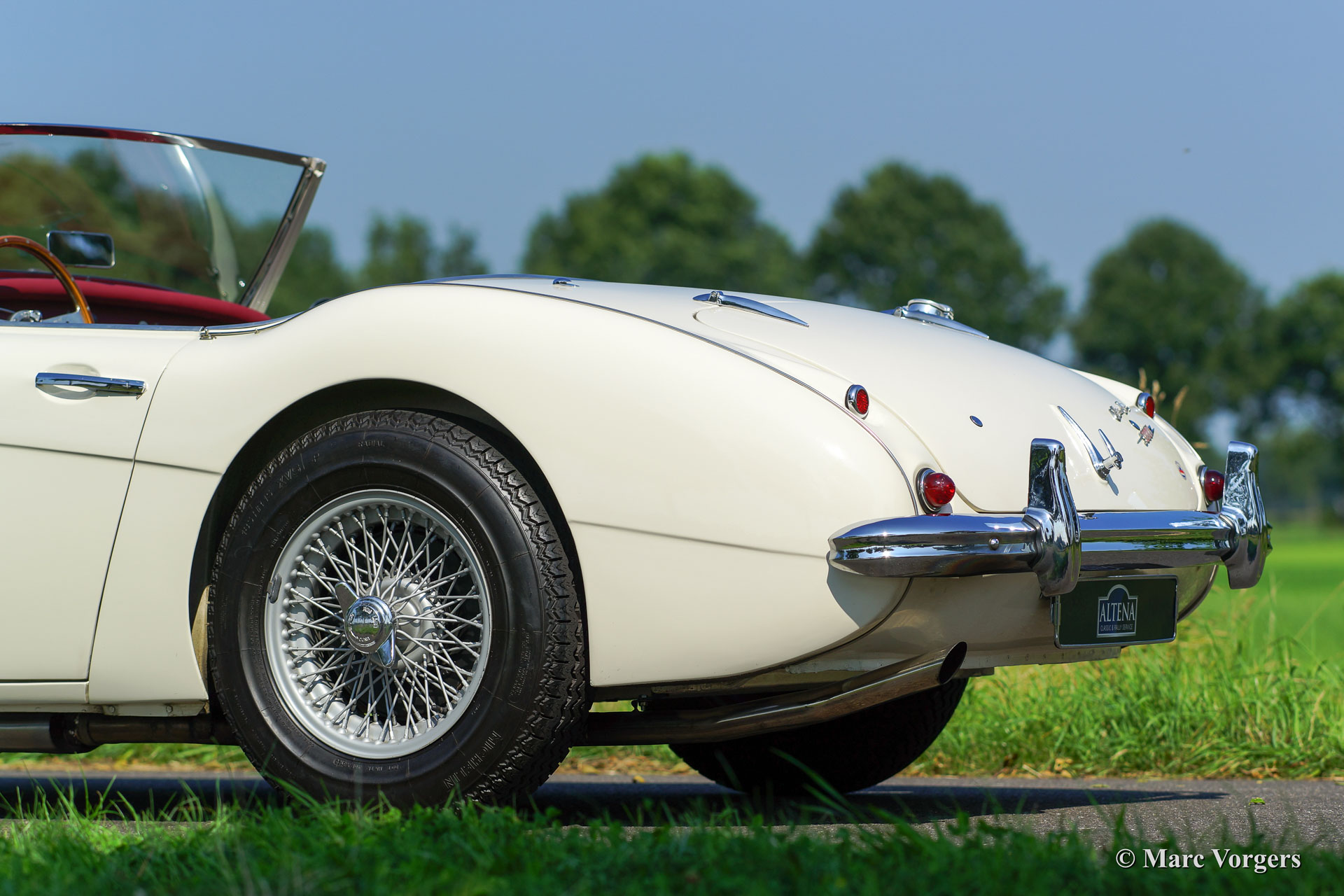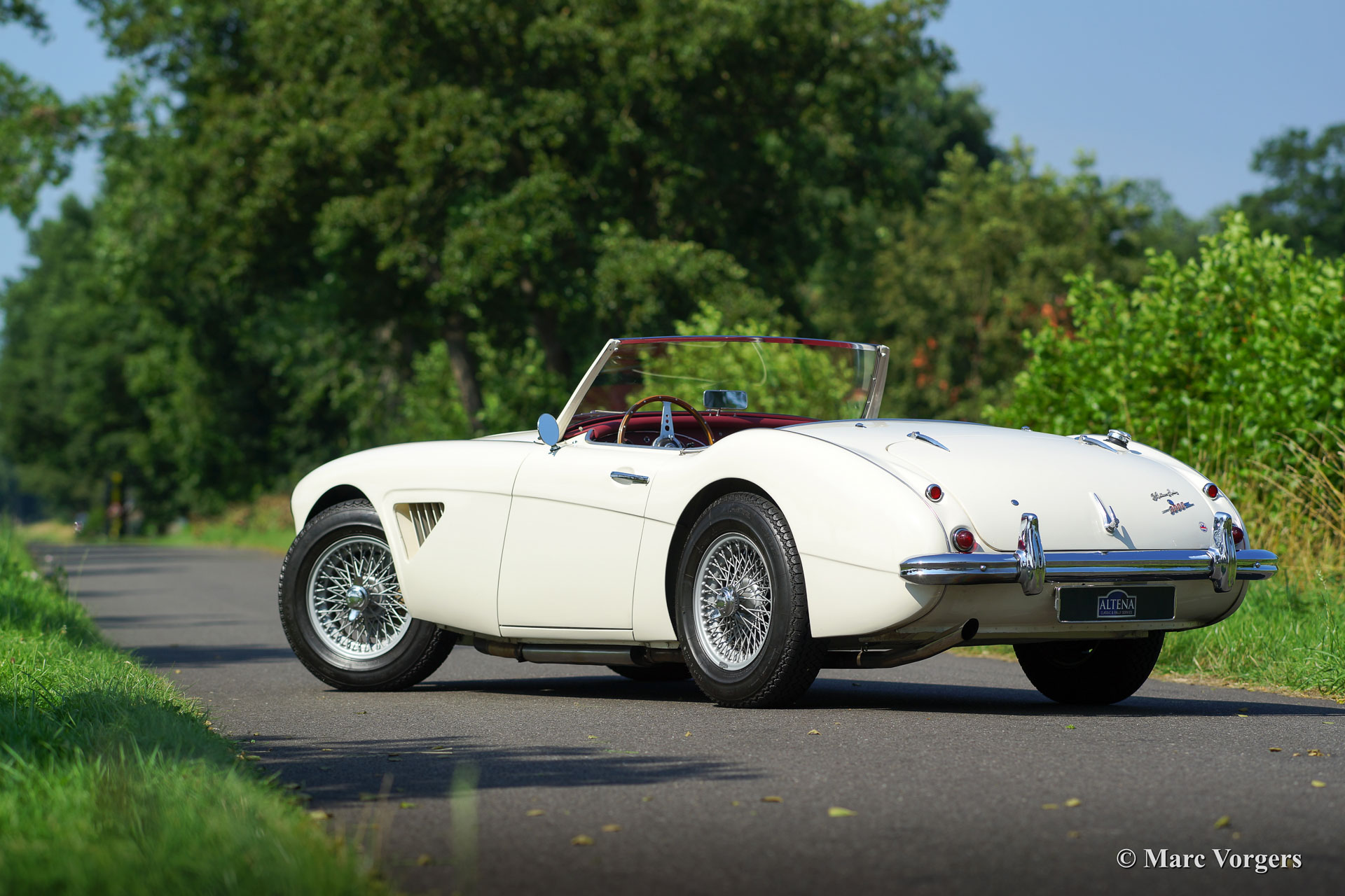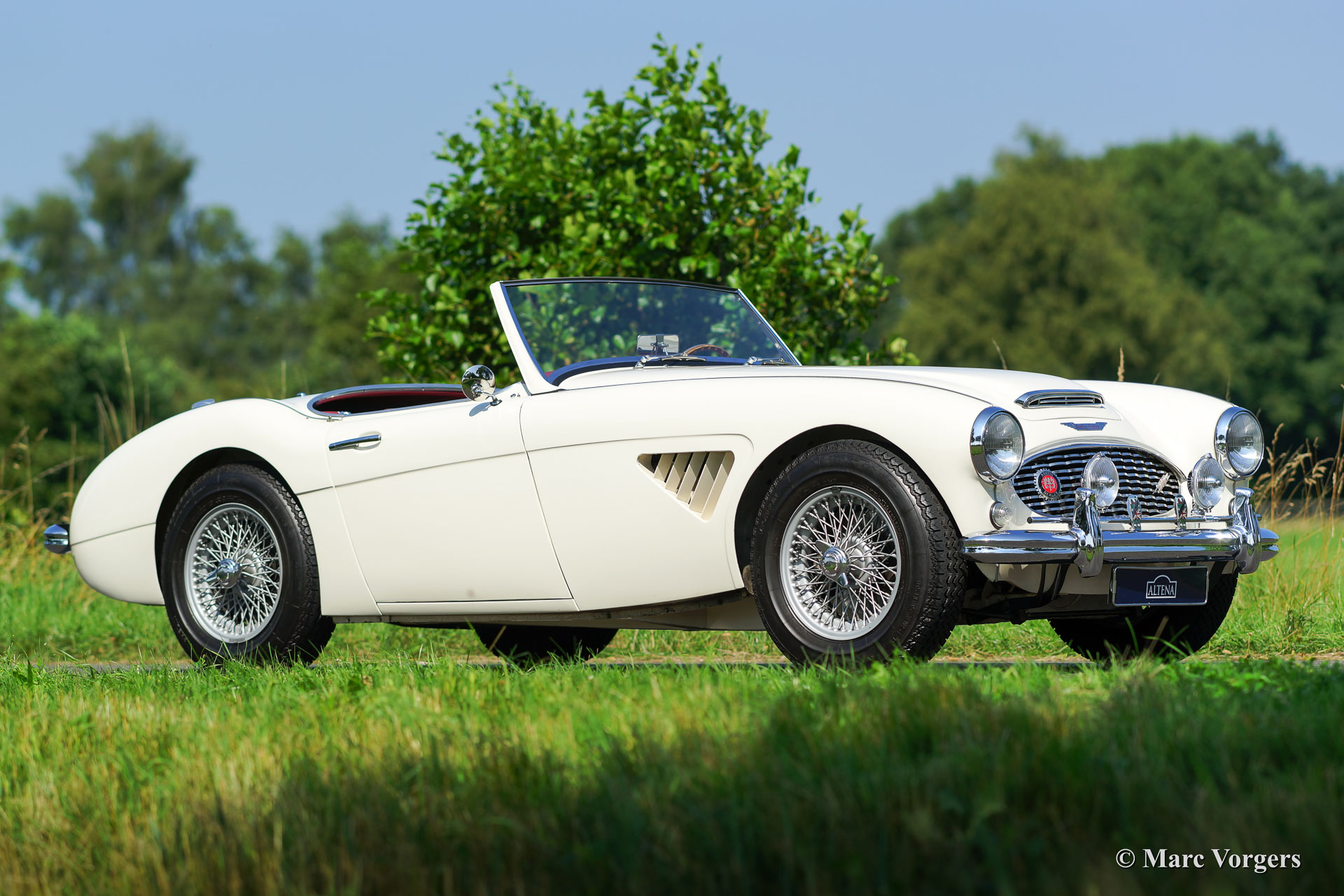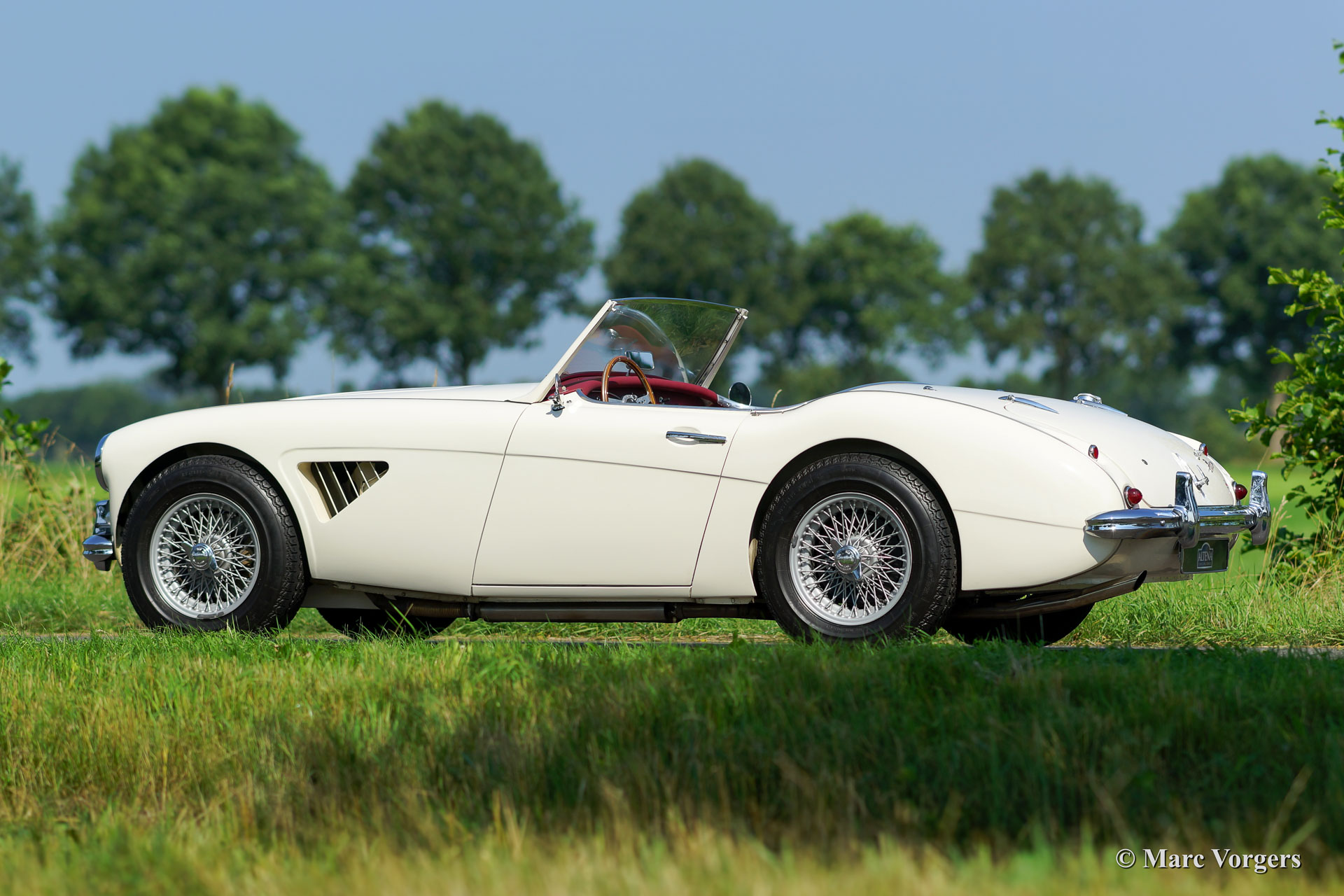 Austin Healey 3000 MK I BN7 two-seater, year 1960. Colour ‘Old English White’ with a red leather interior trimmed with whte piping. Red carpet. This fantastic Austin Healey two-seater is in excellent condition and the car drives perfectly. Recently the gearbox was overhauled. The car features overdrive, silver enamelled wire wheels, a MotoLita wood rimmed steering wheel, a badge bar with two Lucas fog lamps, louvres in the front wings and a Stainless Steel exhaust.