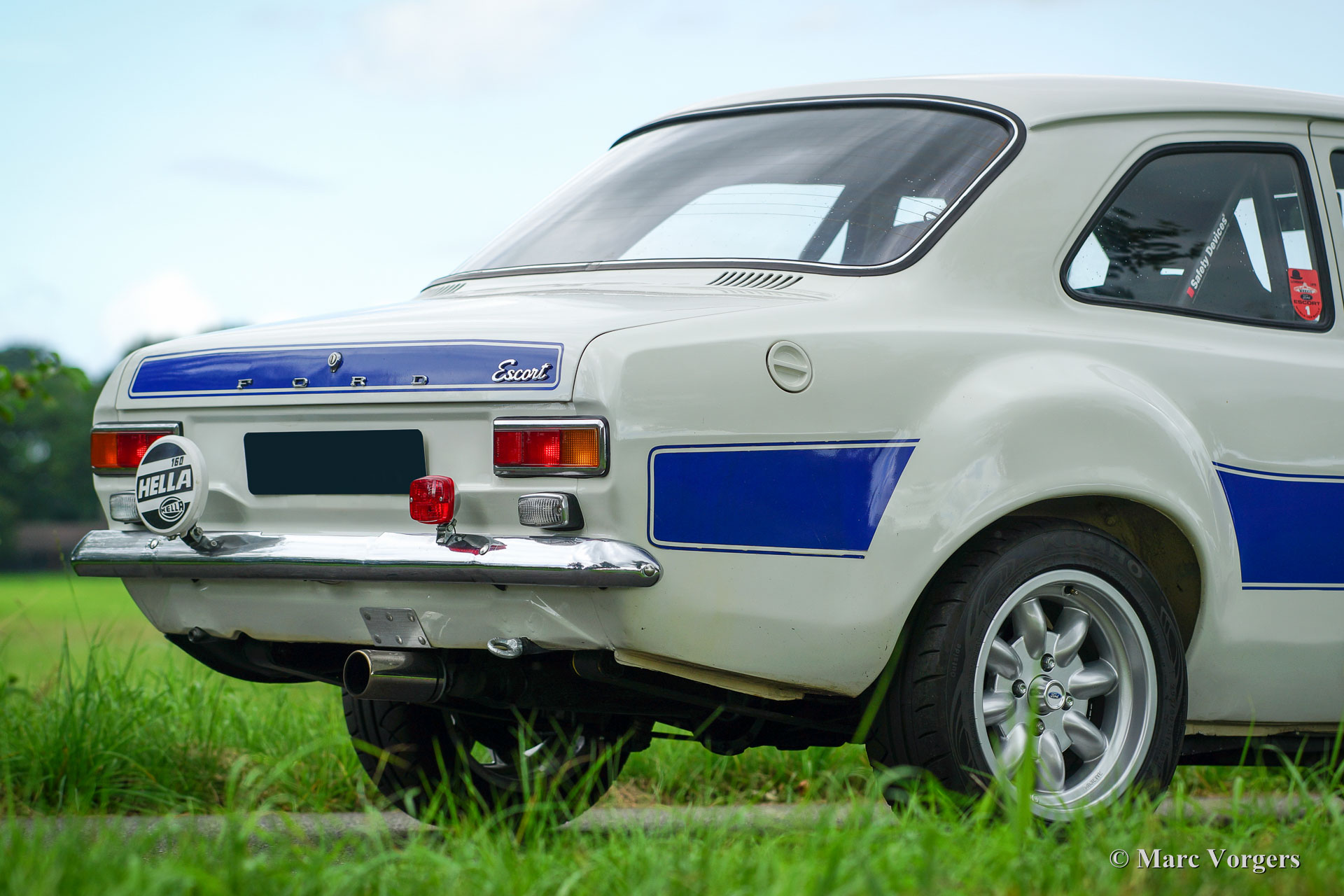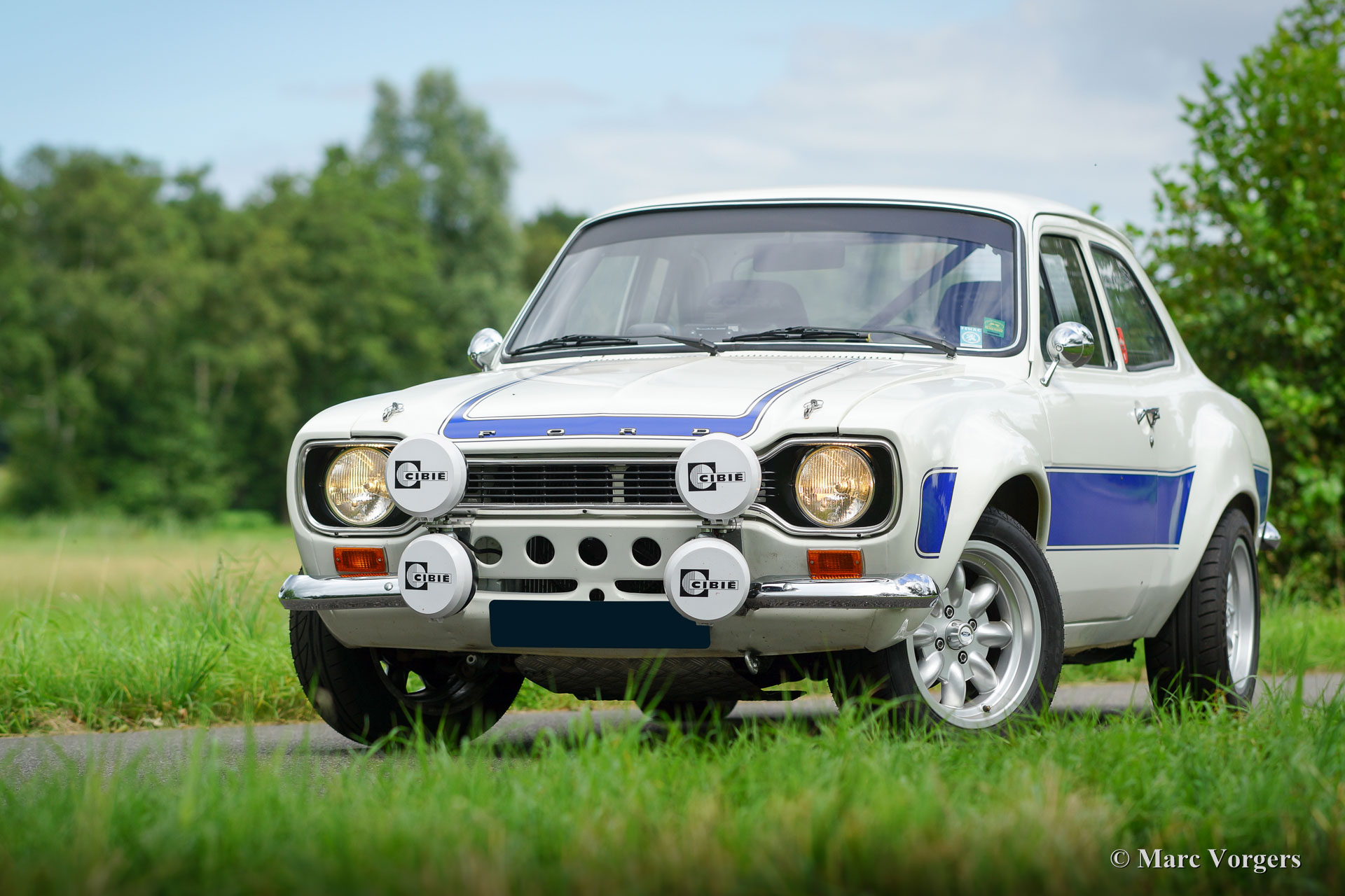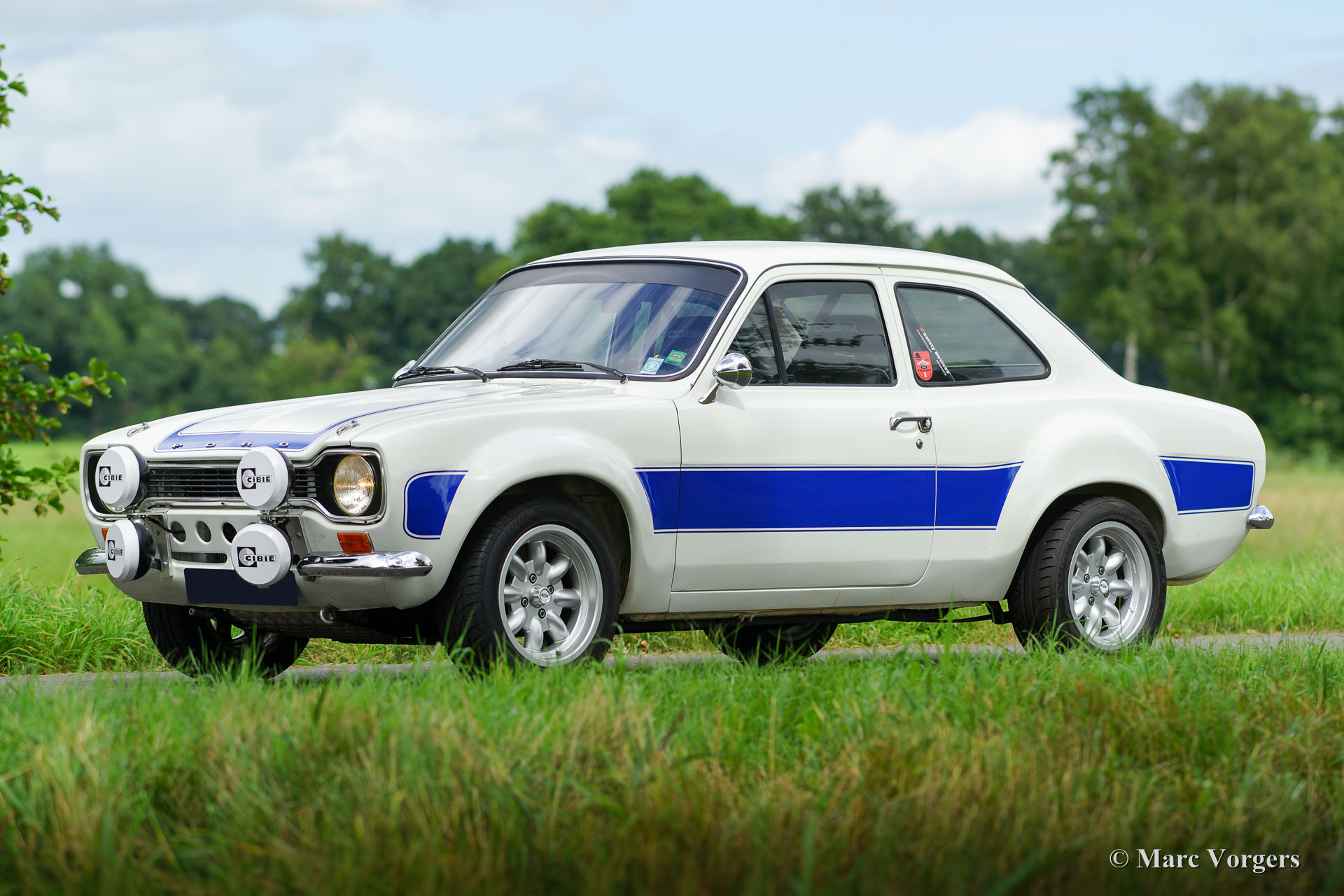 Ford Escort Mk I rally car, year 1970. Chassis number GCATKU652XX. Colour white with blue striping and a black rally interior. This fantastic Ford Escort Mk I was extensively restored and rally prepared; the car is in excellent condition and it drives perfect! The unitary bodywork was reinforced and all welded through, additionally a roll-cage was fitted. Mechanically the car was also extensively prepared: a four-cylinder Ford Pinto 2 Litre engine was fitted. The engine features a modified and optimized cylinder head, ‘fast’ high-lift camshaft, two double Weber carburettors, a free-flow exhaust manifold and an aluminium radiator. The power unit delivers 166 bhp in this specification. The power is transmitted to the rear wheels via a five-speed manual gearbox. The suspension was also upgraded: adjustable shock absorbers all round, vented disc brakes, Atlas rear axle with limited- slip differential and 15-inch light alloy wheels. The interior has been rally prepared with a special dashboard, Cobra sports bucket seats and electrically adjustable four-point safety harnesses. This spectacular rally Escort can cover good distances with its double fuel tanks totalling a capacity of 100 litres. This Ford Escort rally car is ready for action!