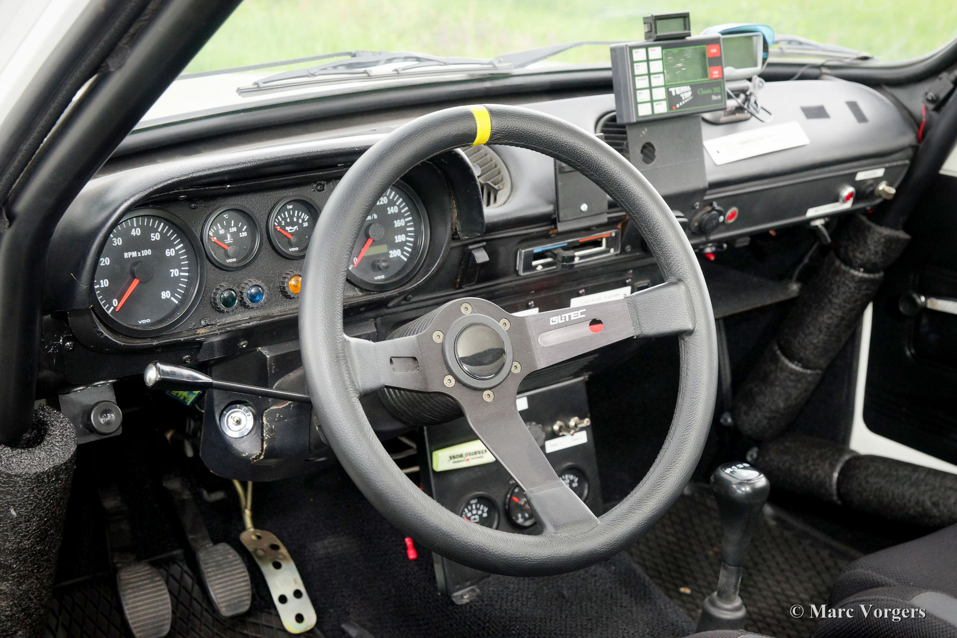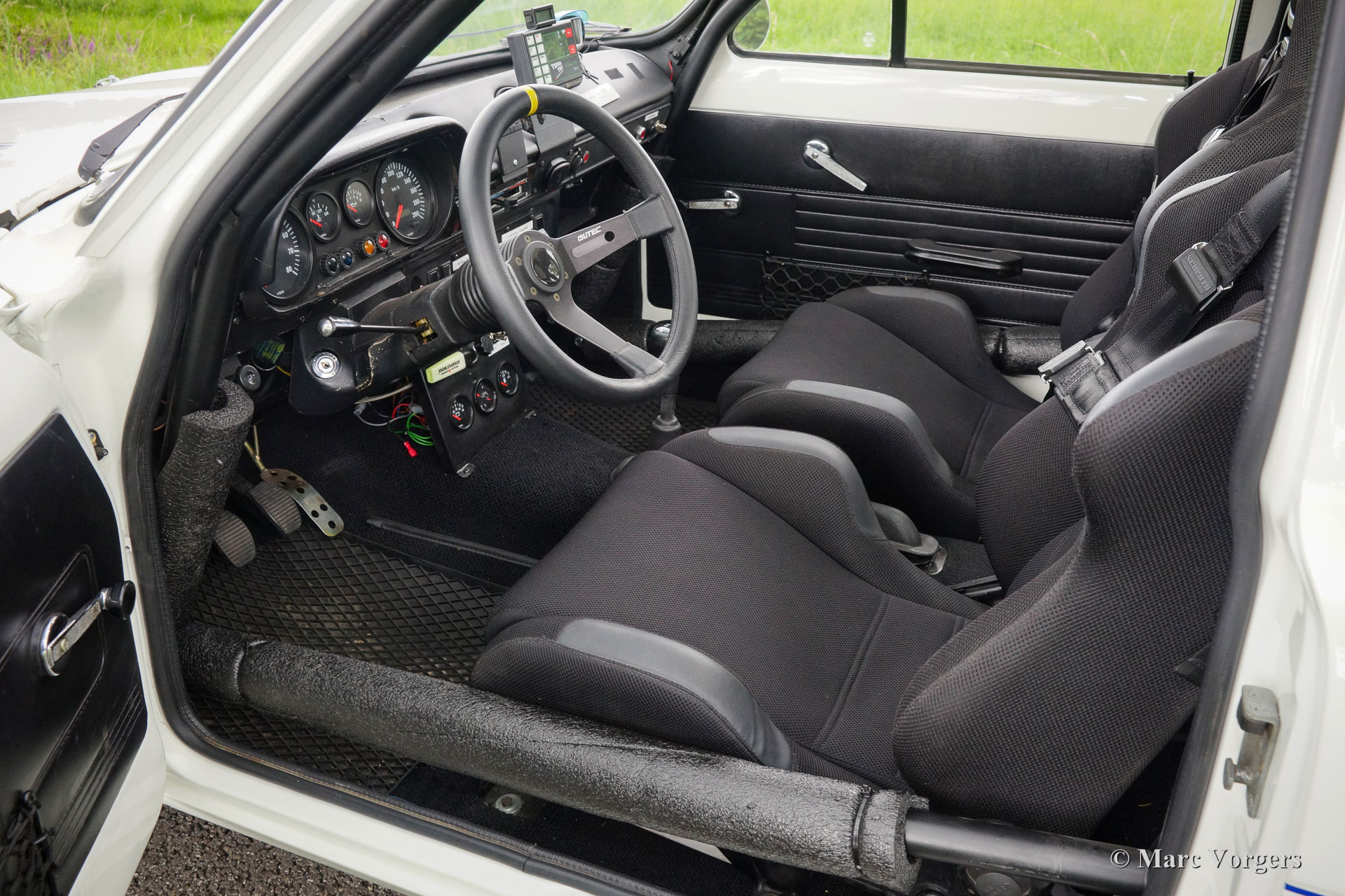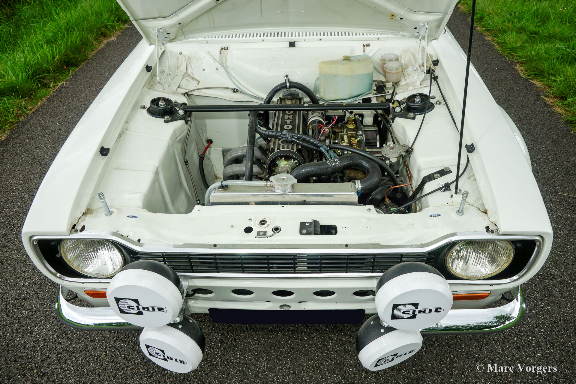 Ford Escort Mk I rally car, year 1970. Chassis number GCATKU652XX. Colour white with blue striping and a black rally interior. This fantastic Ford Escort Mk I was extensively restored and rally prepared; the car is in excellent condition and it drives perfect! The unitary bodywork was reinforced and all welded through, additionally a roll-cage was fitted. Mechanically the car was also extensively prepared: a four-cylinder Ford Pinto 2 Litre engine was fitted. The engine features a modified and optimized cylinder head, ‘fast’ high-lift camshaft, two double Weber carburettors, a free-flow exhaust manifold and an aluminium radiator. The power unit delivers 166 bhp in this specification. The power is transmitted to the rear wheels via a five-speed manual gearbox. The suspension was also upgraded: adjustable shock absorbers all round, vented disc brakes, Atlas rear axle with limited- slip differential and 15-inch light alloy wheels. The interior has been rally prepared with a special dashboard, Cobra sports bucket seats and electrically adjustable four-point safety harnesses. This spectacular rally Escort can cover good distances with its double fuel tanks totalling a capacity of 100 litres. This Ford Escort rally car is ready for action!