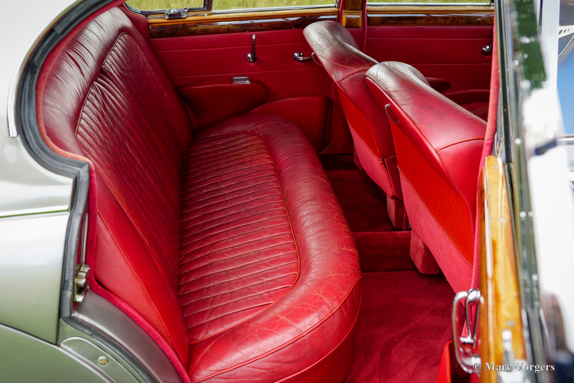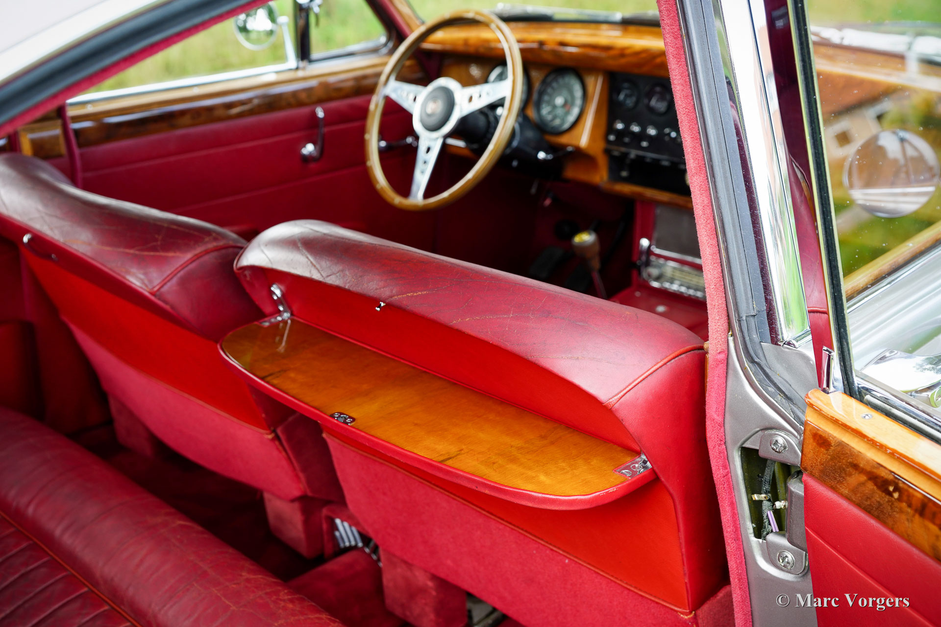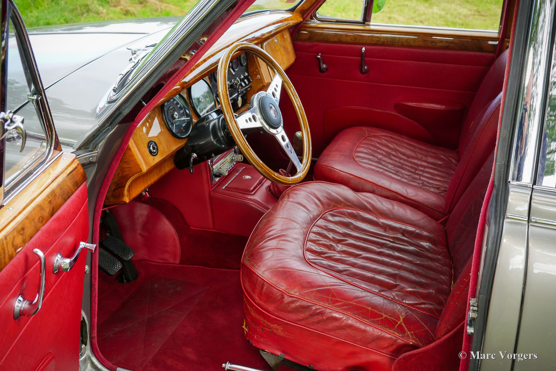 Jaguar MK II 3.4 Litre, year 1965. Colour smoke silver metallic combined with a dark red leather interior and red carpet. This stylish and magnificent Jaguar Mk II was extensively restored in the Netherlands in the 1990s. The body restoration was done to a high level of perfection, the cars exterior still breathes sheer quality. The panel fit is superb, the paint is wonderful, and the chrome parts are excellent. The interior was restored with new carpet, newly upholstered door cards, console, new head lining and beautifully lacquered walnut wood panelling on the dashboard and the doors. The original leather of the seats was carried over. This Jaguar MK II is in a wonderful and excellent condition with fair leather upholstery. This Jaguar Mk II 3.4 Litre is fitted with the desirable manually operated gearbox and overdrive! Furthermore, the car features the original ‘spats’ over the rear wheels, chrome wire wheels shod with Vredestein Sprint Classic tyres, and a period correct Philips AM radio, and a MotoLita steering wheel with wood rim. The car was very well serviced over the years. Recently we have brought the brakes, and all the appendages around the engine up to date. This wonderful Jaguar MK II is ready for the next proud owner to enjoy to the fullest!