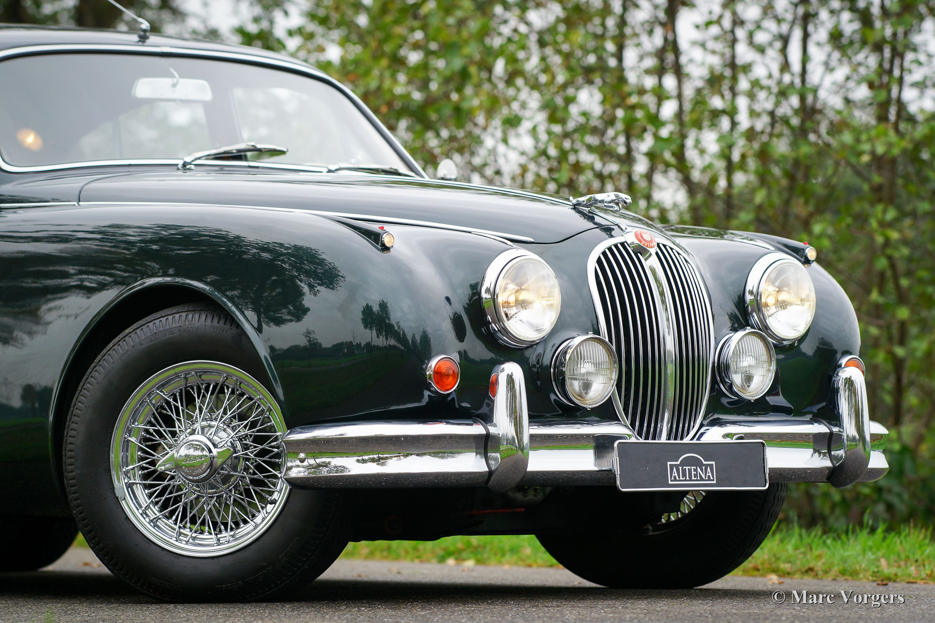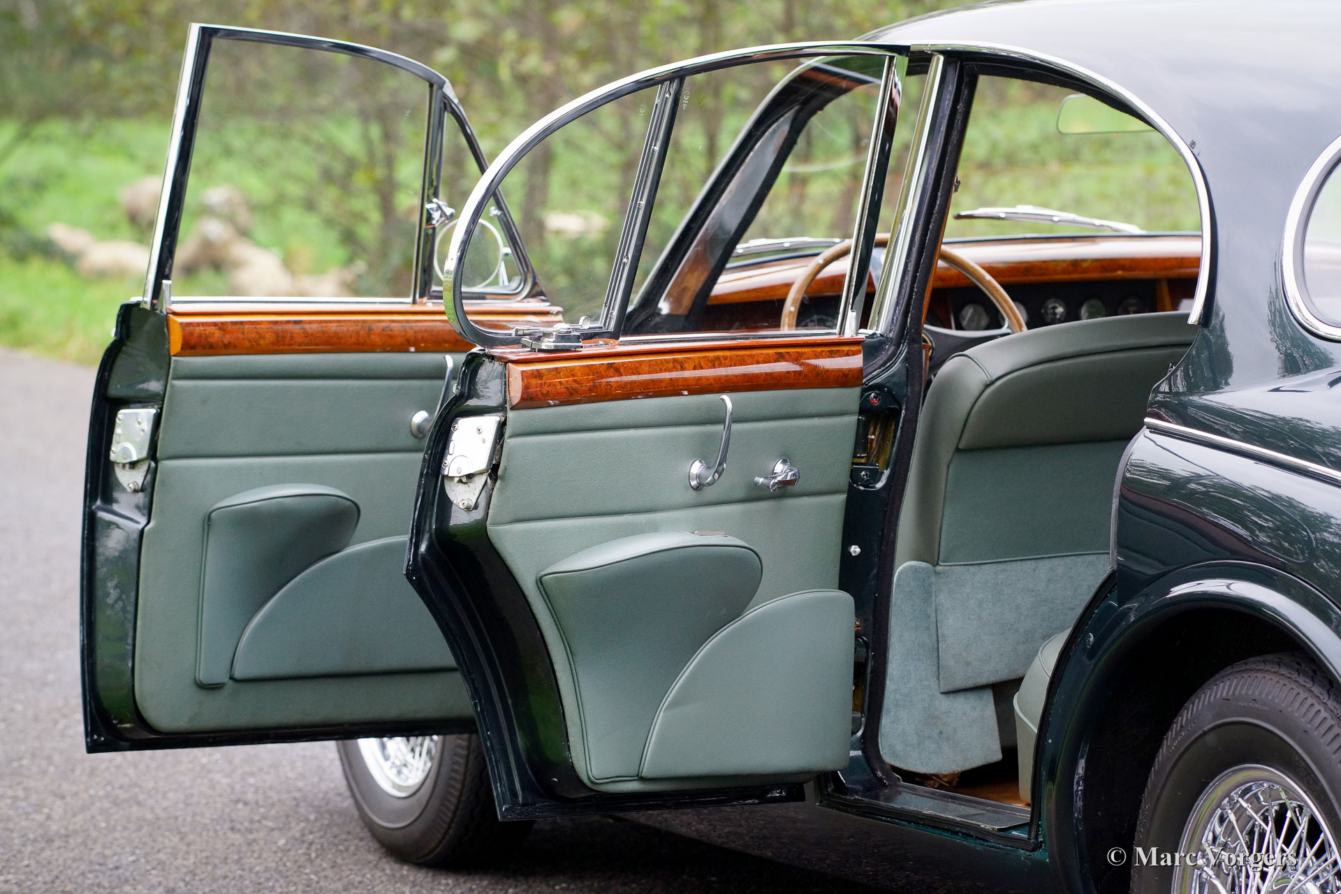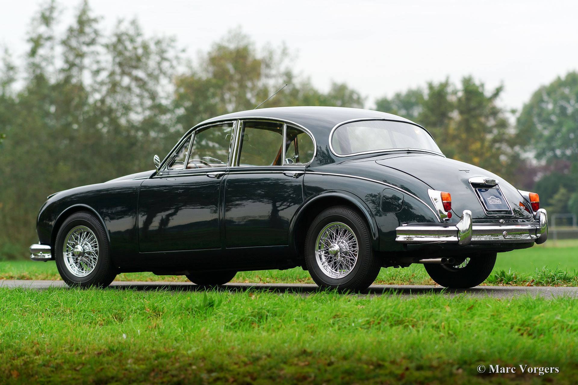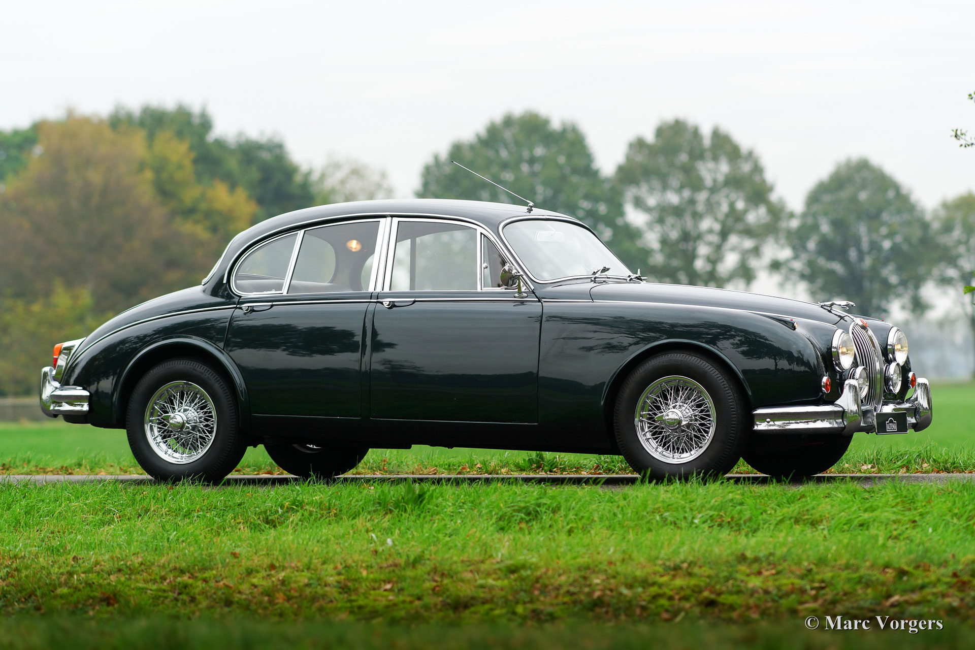 Jaguar MK II 3.4 Litre, year 1966. Chassis number 180222DX, body number E06433X, engine number KJ780X-X. ‘Matching numbers‘. Colour green metallic with a pale green (suede-green) leather interior and pale brown carpet. This wonderful Jaguar MK II 3.4 Litre saloon was extensively restored in the past, the automobile is in excellent condition. The bodywork shows beautiful panel fit, excellent paintwork and excellent chrome trim. The interior is very luxurious with a lot of wood trim and beautifully chosen interior colours. This fine Jaguar MK II features a manually operated 4-speed gearbox with overdrive; a very desirable combination. Additionally, the car sports electric power-steering which places the driving experience on an even higher level. Also, an up-rated alternator is installed, and the exterior is complimented by beautiful chrome wire wheels. A wonderful example!