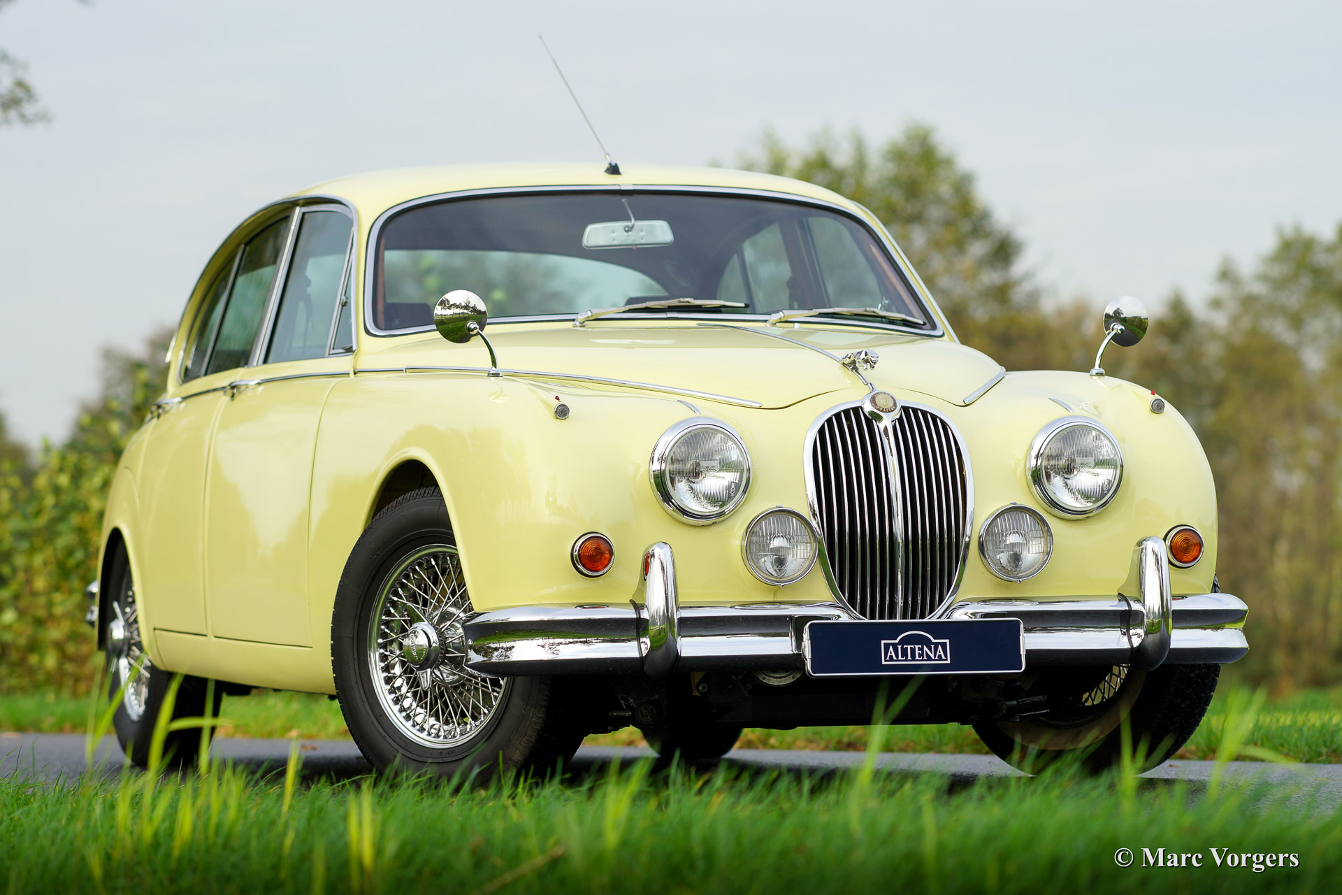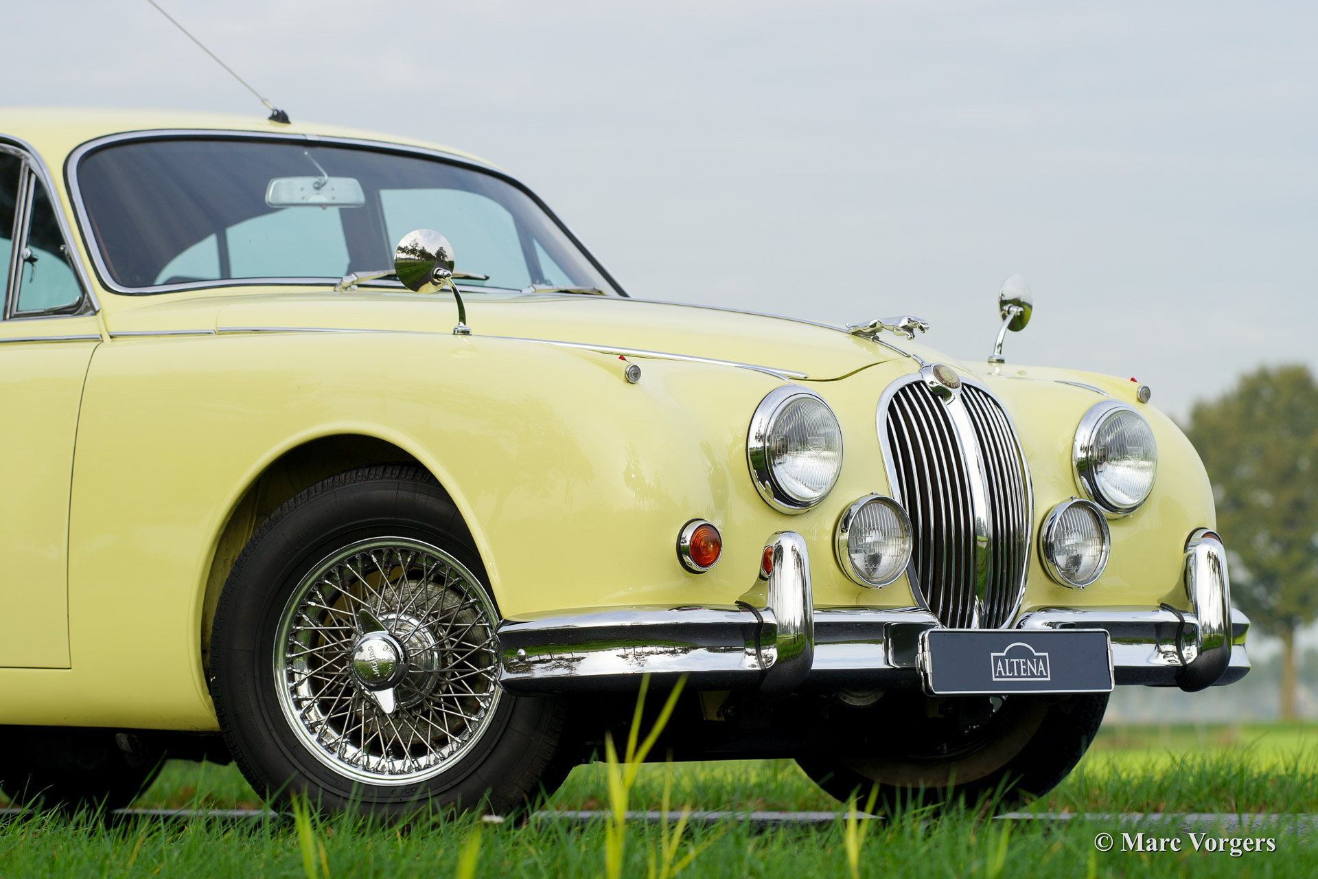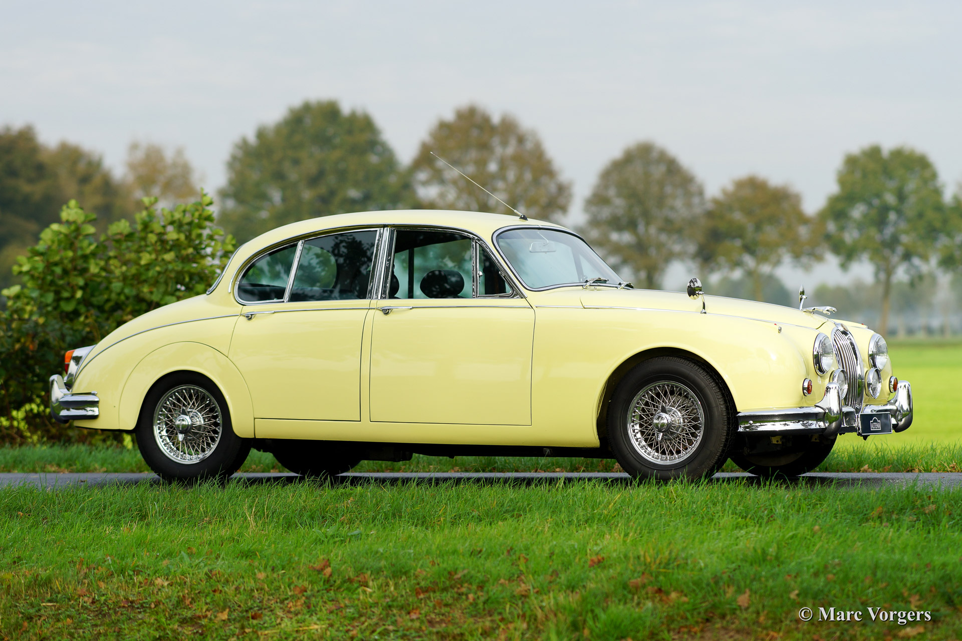 Jaguar Mk II 3.8 litre, year 1966. Colour Primrose yellow with a black leather interior. This smart and beautiful Jaguar Mk II is in excellent to superb condition throughout and the car drives perfect. The automobile has undergone several partial restorations and overhauls over the years. The engine and the automatic gearbox were overhauled. The body work was taken care of and given beautiful new paint. The interior has been upholstered with new black leather and the wooden interior panels are perfectly varnished. This Jaguar Mk II features the powerful 3.8 Litre XK engine, a smooth shifting automatic gearbox, chrome wire wheels with eared 'knock off' hub nuts, power steering and a classic radio. Furthermore the car sports beautiful original details like the 'spats' over the rear wheels, the 'leaping cat' hood ornament and additional driving lamps at front.
