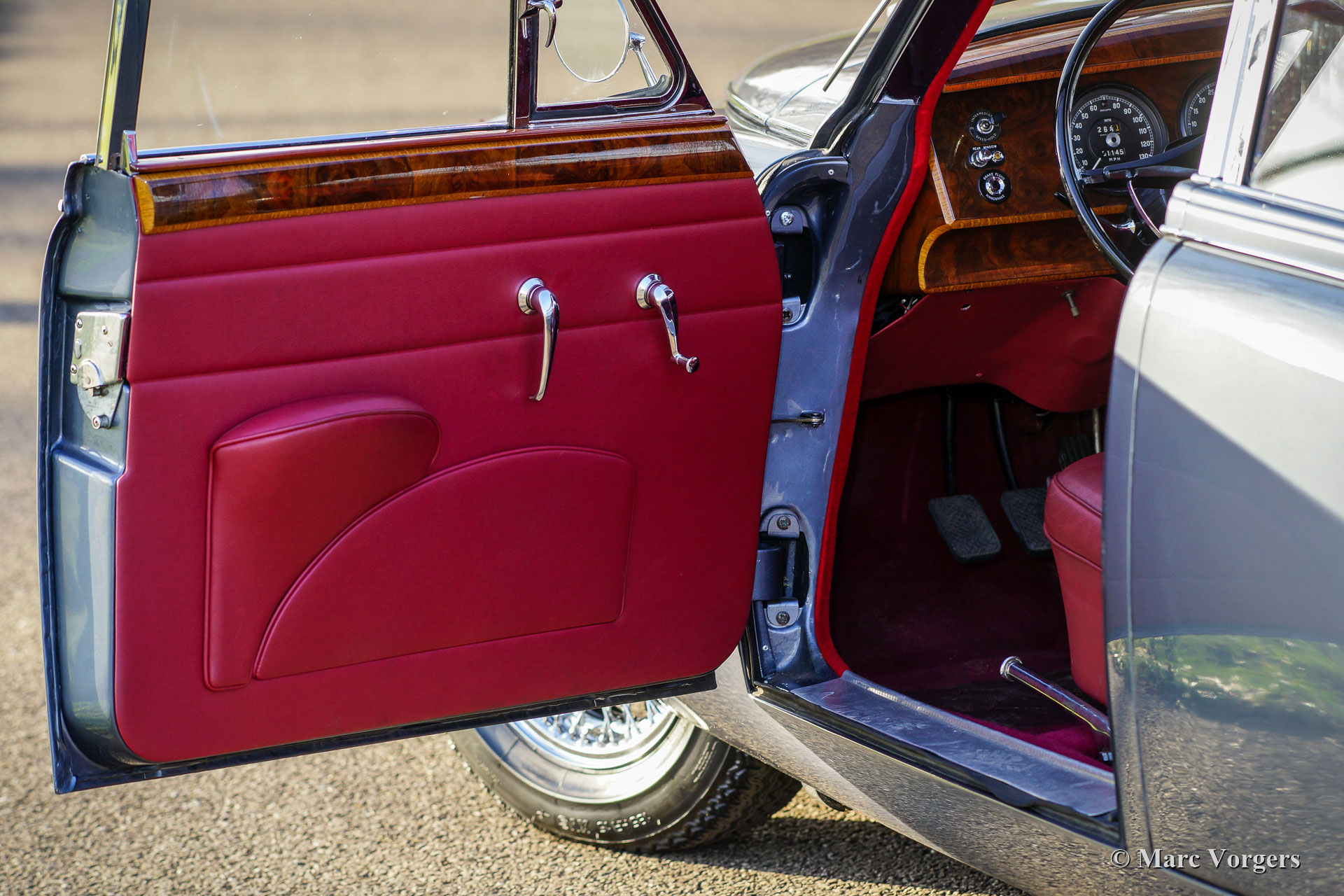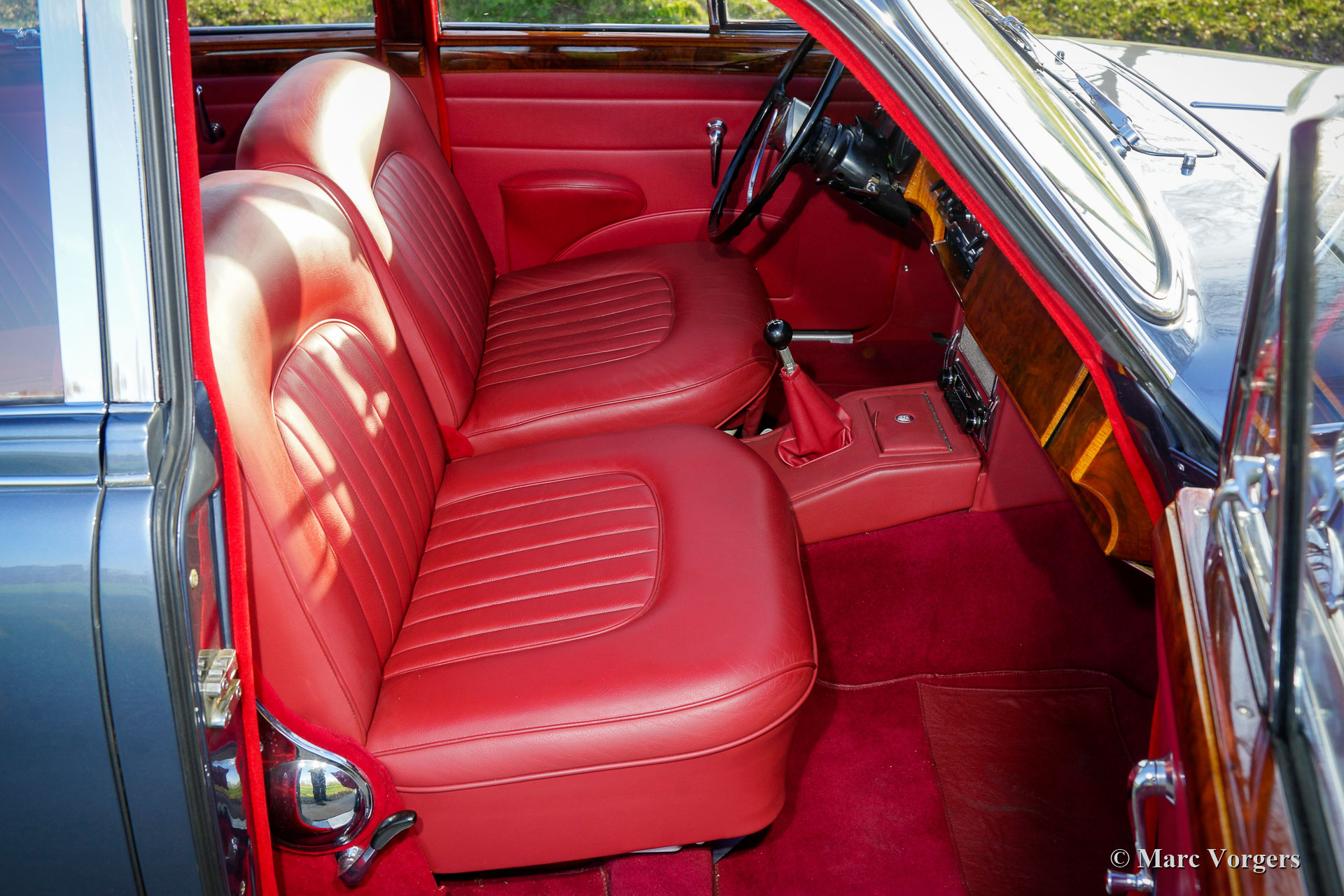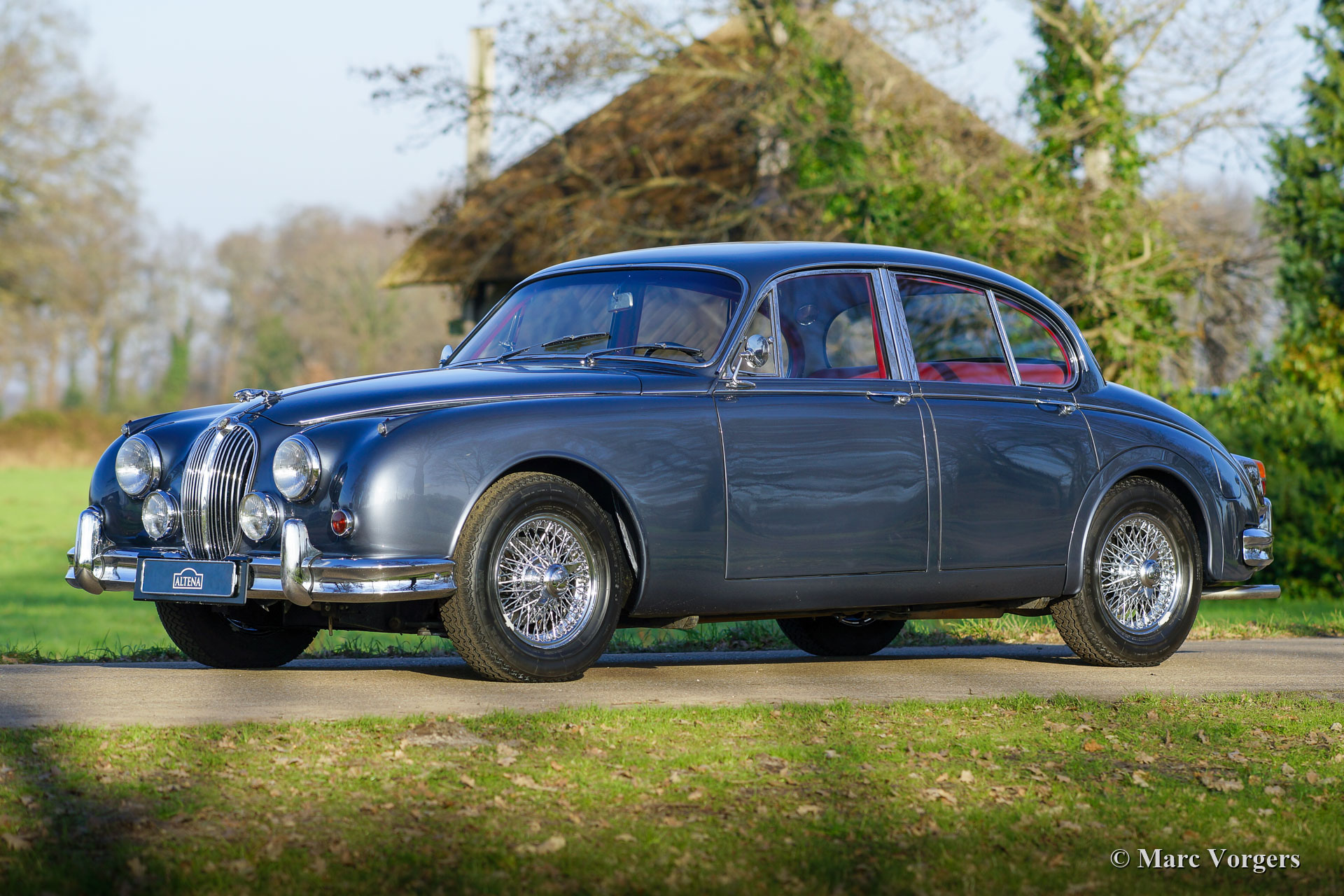 Jaguar Mk II 3.8 Litre, year 1967. Colour blue / grey metallic combined with a red leather interior and red carpet. This gorgeous Jaguar Mk II was extensively restored in the past, the car is in superb condition inside and out! This is a top-of-the-line Jaguar MK II, fitted with the most powerful 3.8 litre engine, four speed manually operated gearbox, and overdrive! Like all Jaguar Mk II’s the car features servo assisted disc brakes around. The interior is luxurious and plush with full leather upholstery, wool carpet, and wood capped doors and a wood dashboard to please the eyes. The car is fitted with chrome wire wheels, a Stainless-Steel exhaust, original jack, and a 1970s Clarion radio. This is a hard to find top-spec Jaguar MK II 3.8 Litre in top condition!