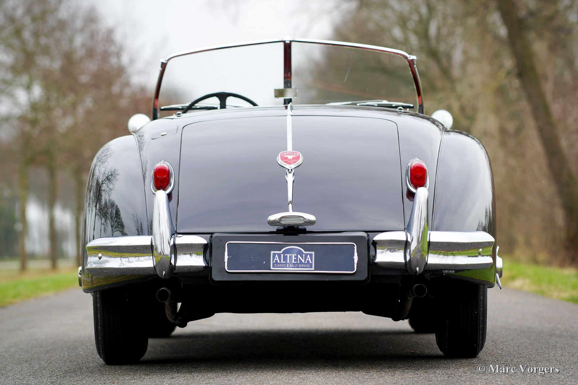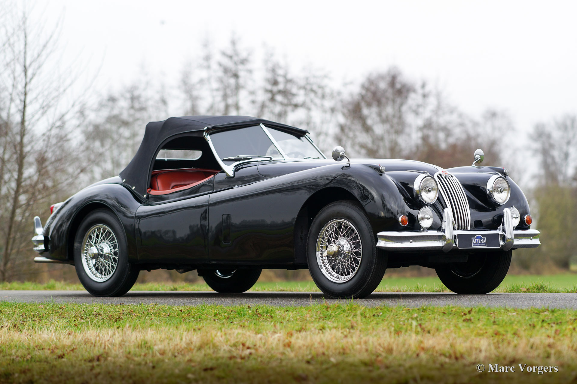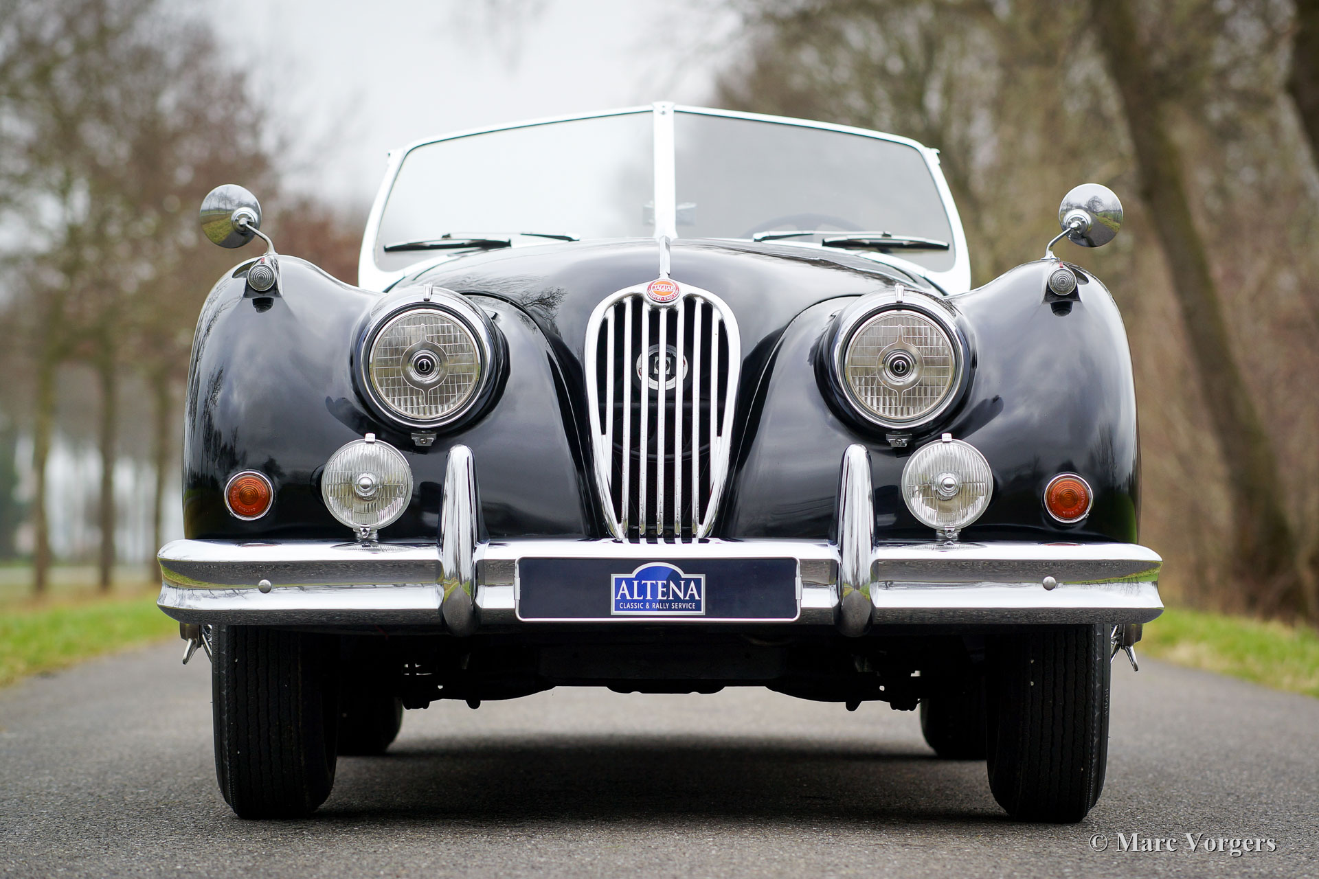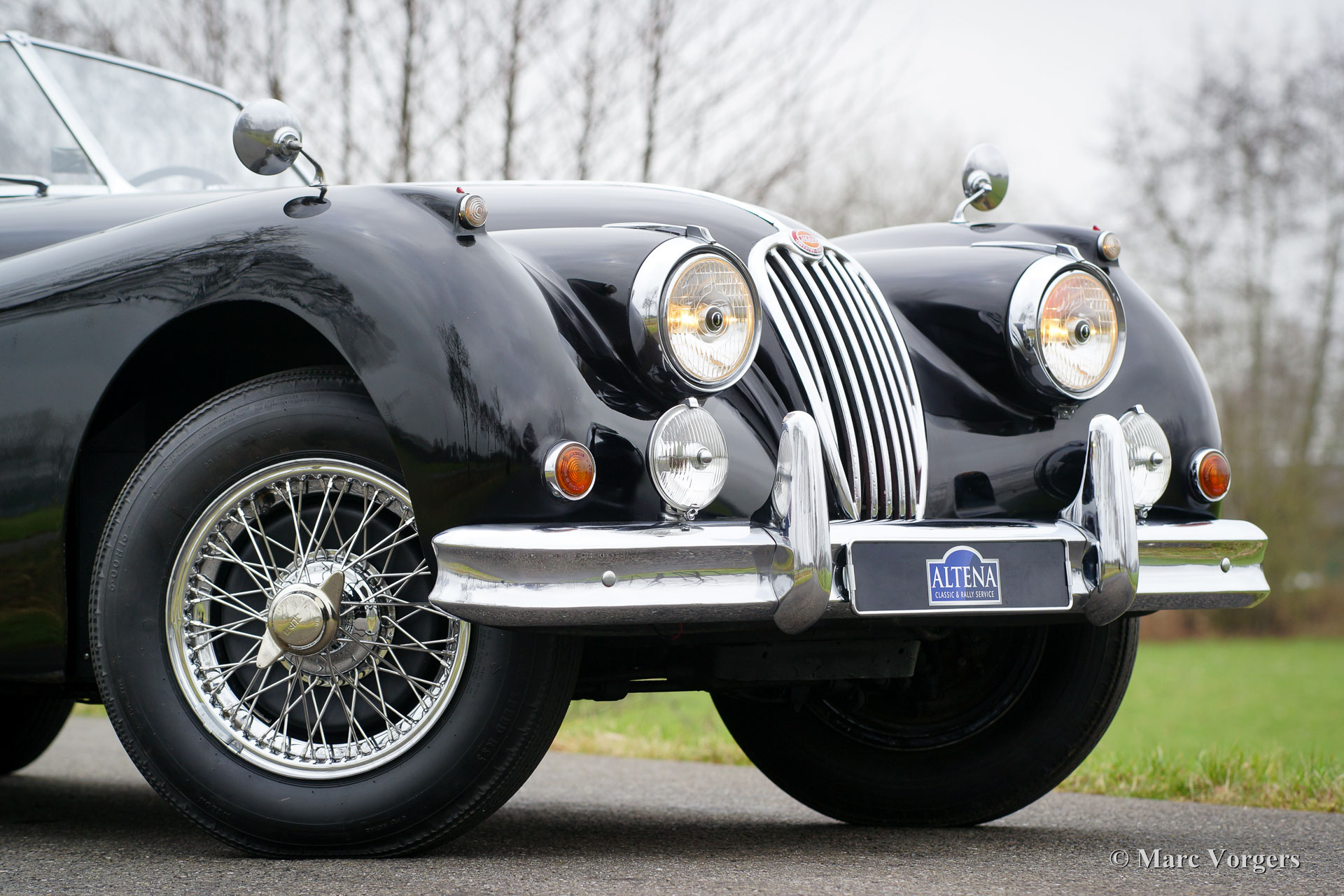 The Jaguar XK 140 replaced the famous XK 120 and was brought onto the market in 1954. The XK 140 was an evolution of the XK 120 with some visual differences and technical improvements. The handsome and dynamic features remained largely unchanged. New was the grille, which counted fewer vertical bars; the rear lights were larger, the bumpers were thicker, and the front indicators, which were placed on the front of the front wing. The important technical improvement was that the XK 140 was provided with a rack and pinion steering which greatly improved steering and driving.