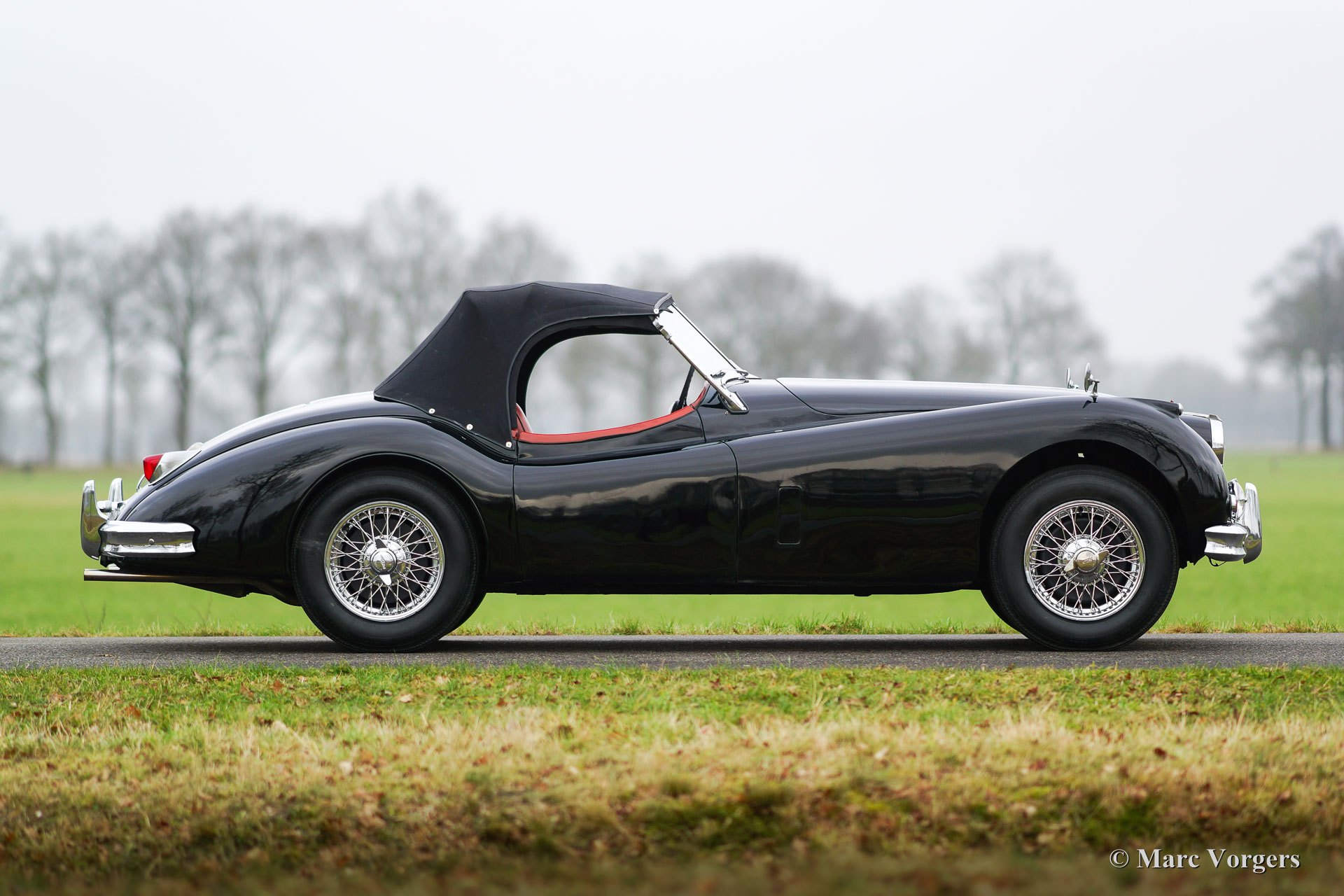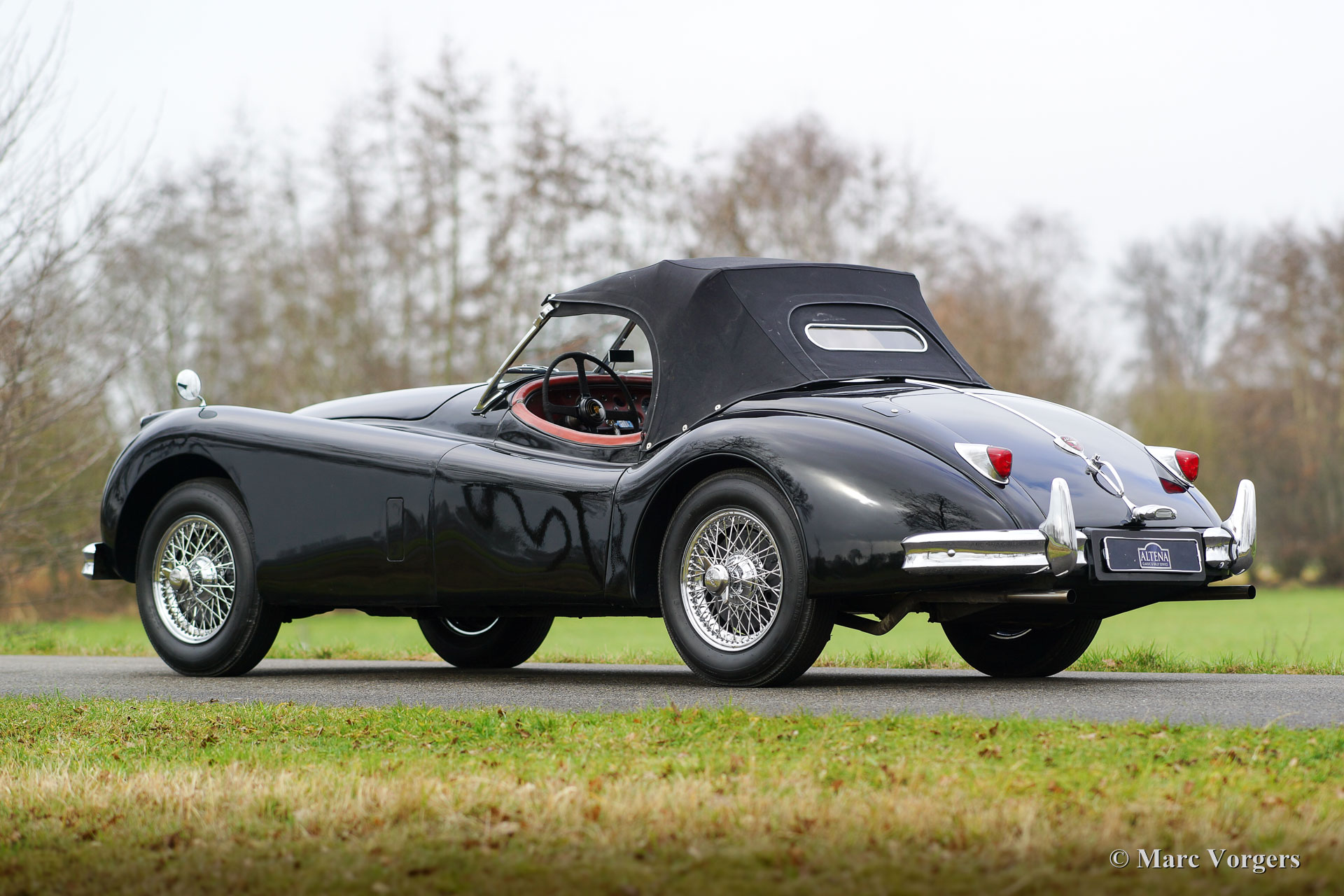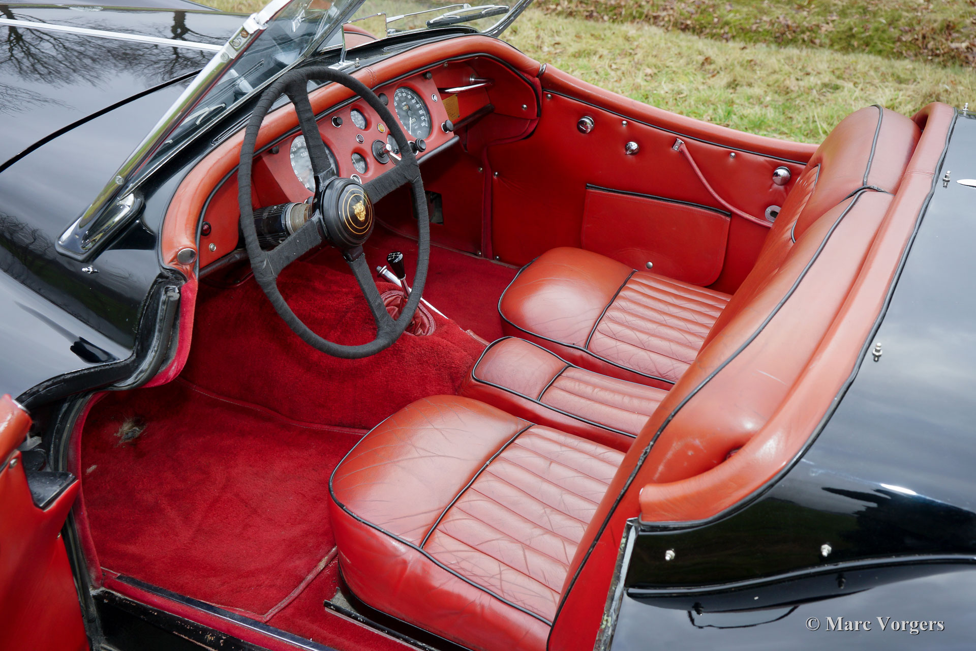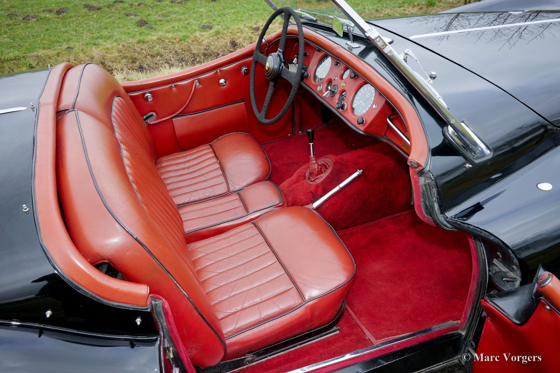 Jaguar XK 140 S OTS, year 1954. Colour black. Red leather interior trimmed with black piping. Red carpet and a black soft-top. This beautiful Jaguar and rare XK 140 S is an early specimen; build number 185. A Heritage certificate is present, the automobile has ‘matching numbers’. Chassis number: SW8101XX, engine number: G 1291 X S, body number: F 101XX. THIS car is an original and very early S (Special Equipment) model as you can conclude from the chassis number and the suffix S in the engine number. The Jaguar was sold new in the USA on 28 February 1954. From the year 1993 the automobile is road registered in the Netherlands. This Jaguar Open Two Seater (OTS), also named roadster, is in good and very original condition! The car shows off a beautiful classic patina and the leather interior is beautifully original! This RARE factory original XK 140 S OTS is a true driver car which one can enjoy to the fullest!