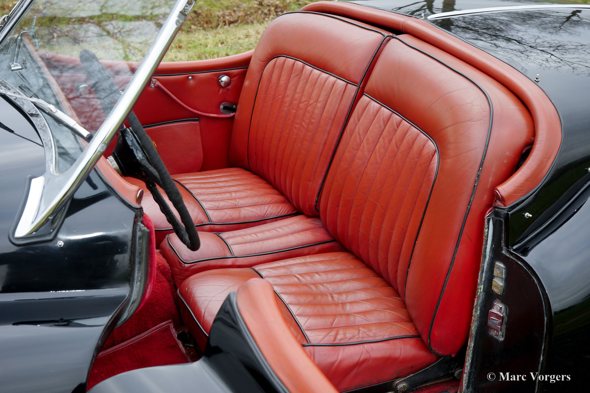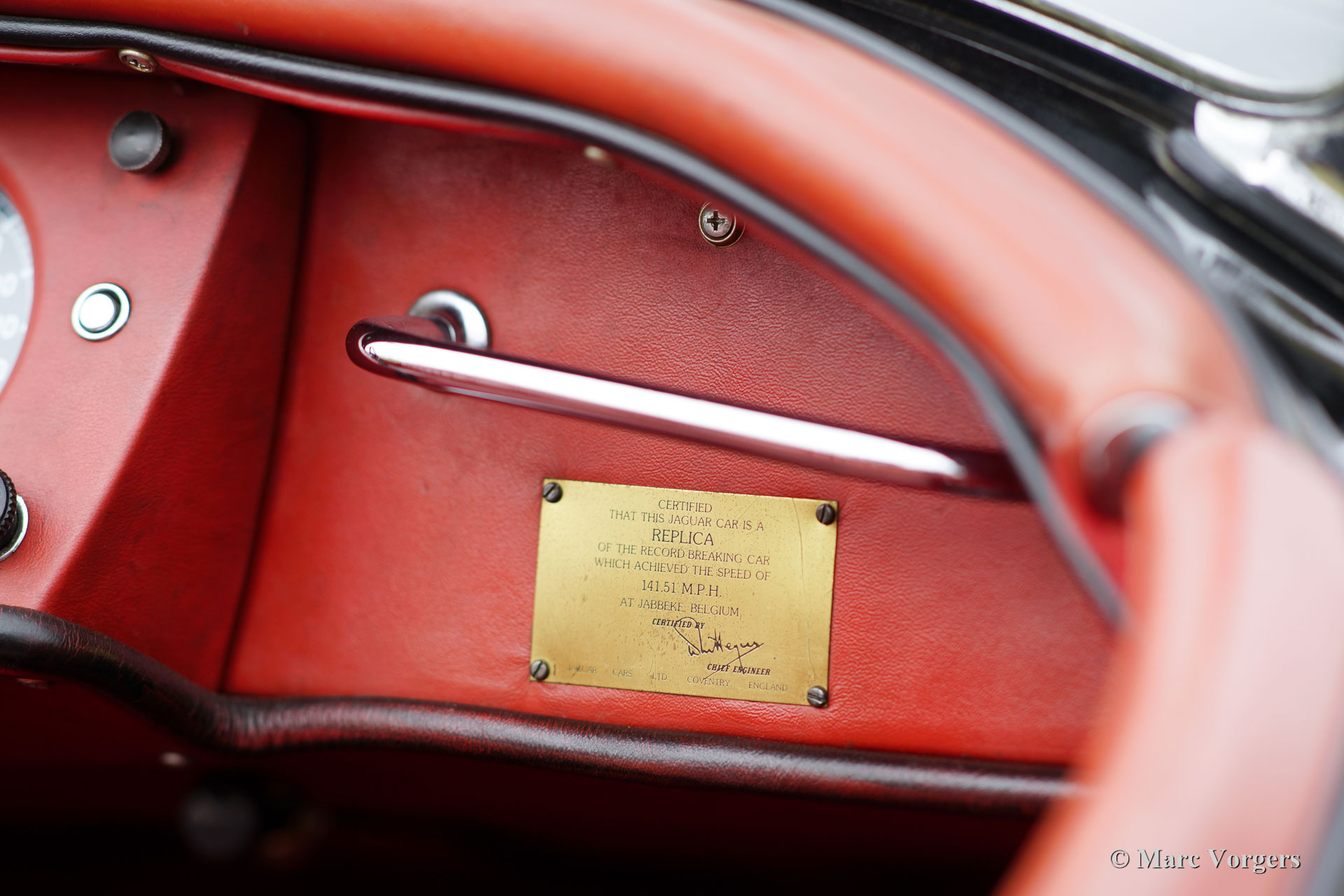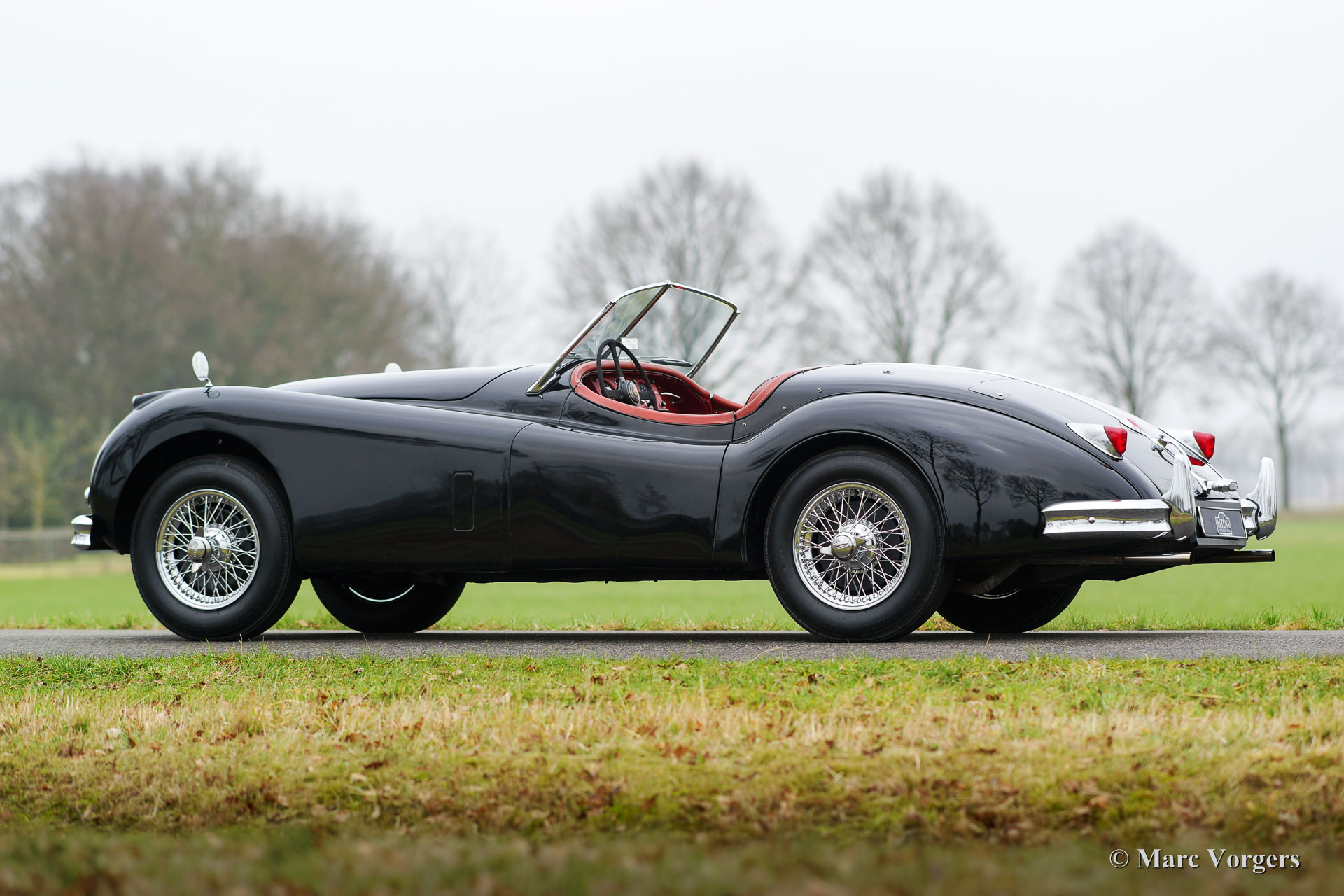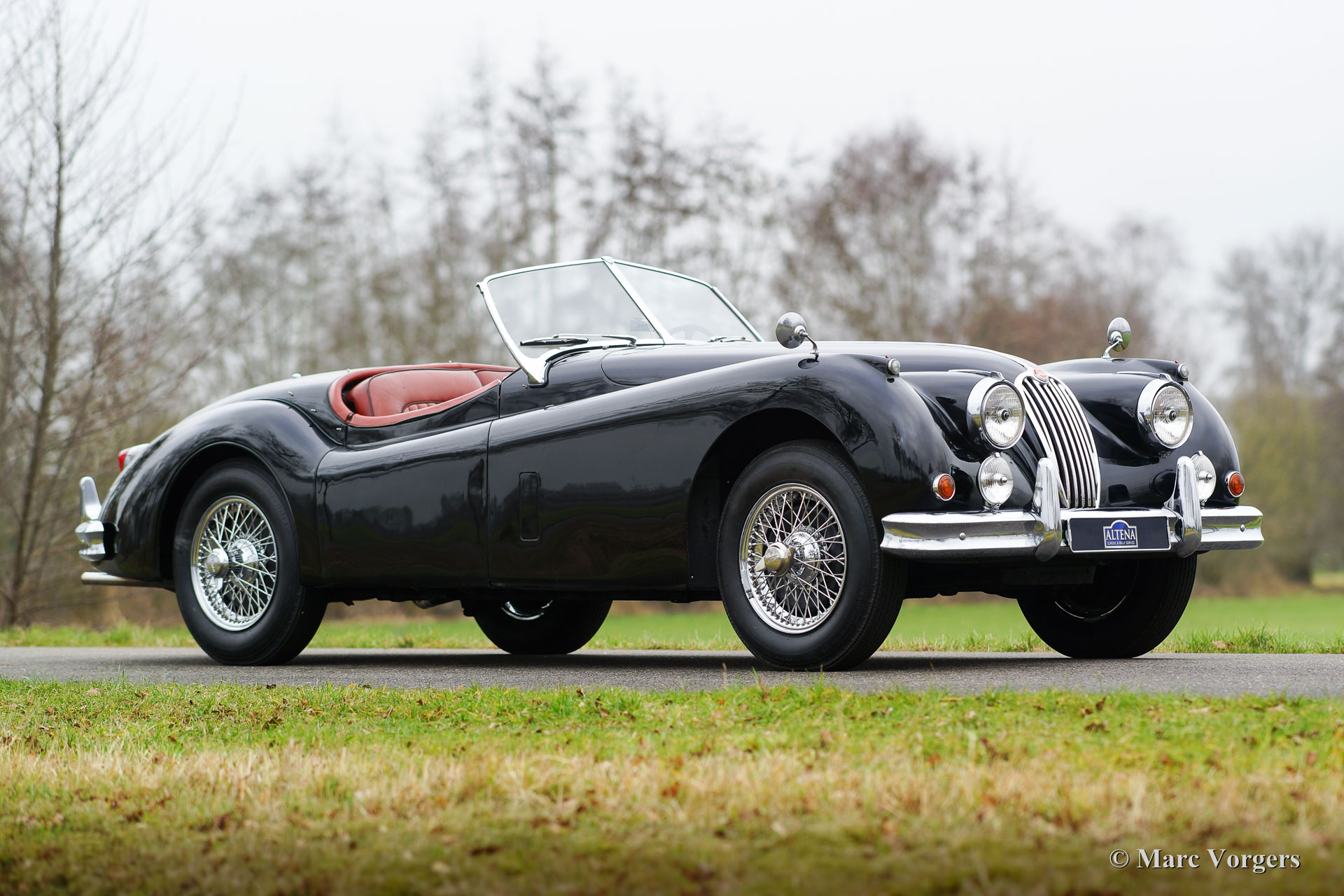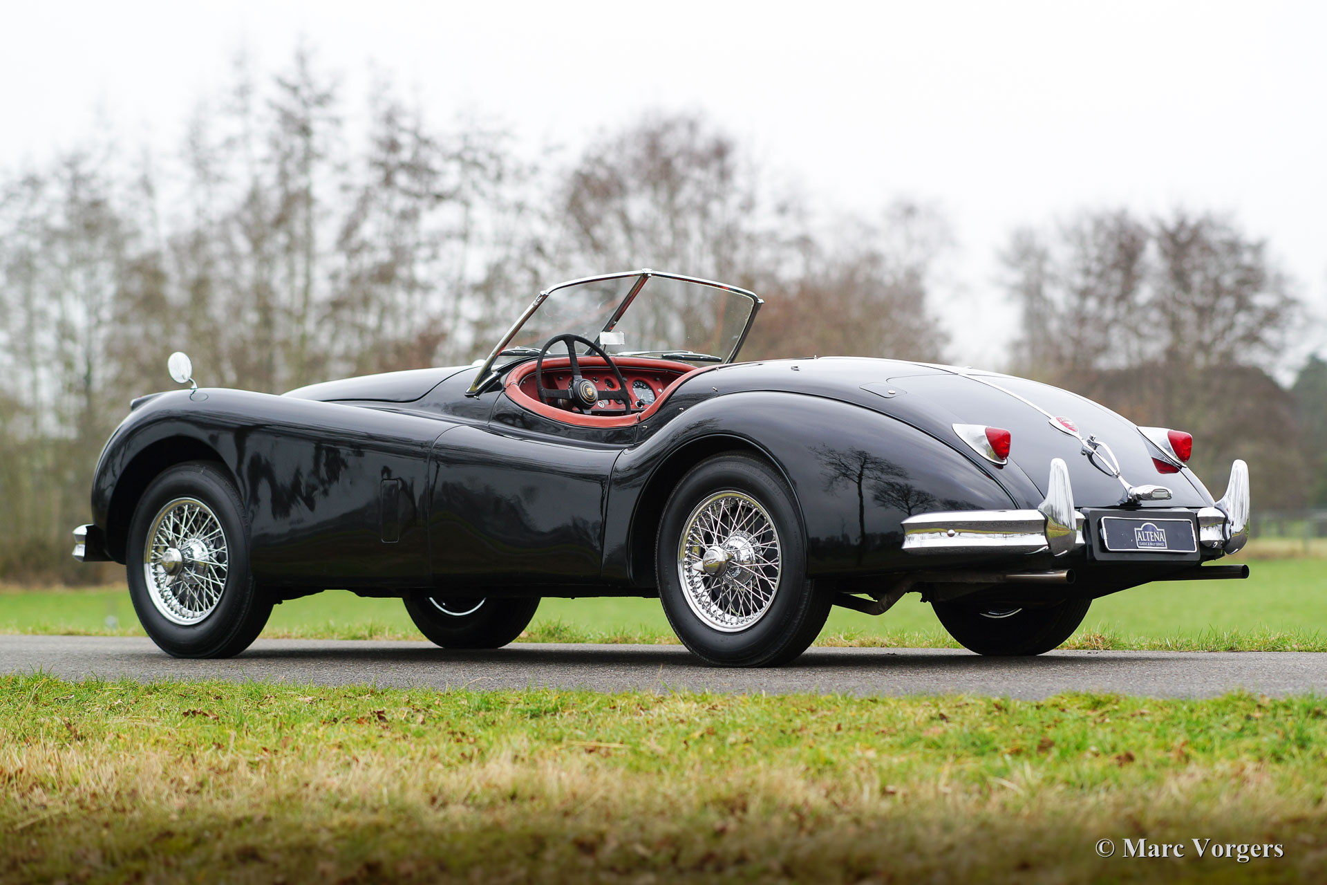 Jaguar XK 140 S OTS, year 1954. Colour black. Red leather interior trimmed with black piping. Red carpet and a black soft-top. This beautiful Jaguar and rare XK 140 S is an early specimen; build number 185. A Heritage certificate is present, the automobile has ‘matching numbers’. Chassis number: SW8101XX, engine number: G 1291 X S, body number: F 101XX. THIS car is an original and very early S (Special Equipment) model as you can conclude from the chassis number and the suffix S in the engine number. The Jaguar was sold new in the USA on 28 February 1954. From the year 1993 the automobile is road registered in the Netherlands. This Jaguar Open Two Seater (OTS), also named roadster, is in good and very original condition! The car shows off a beautiful classic patina and the leather interior is beautifully original! This RARE factory original XK 140 S OTS is a true driver car which one can enjoy to the fullest!