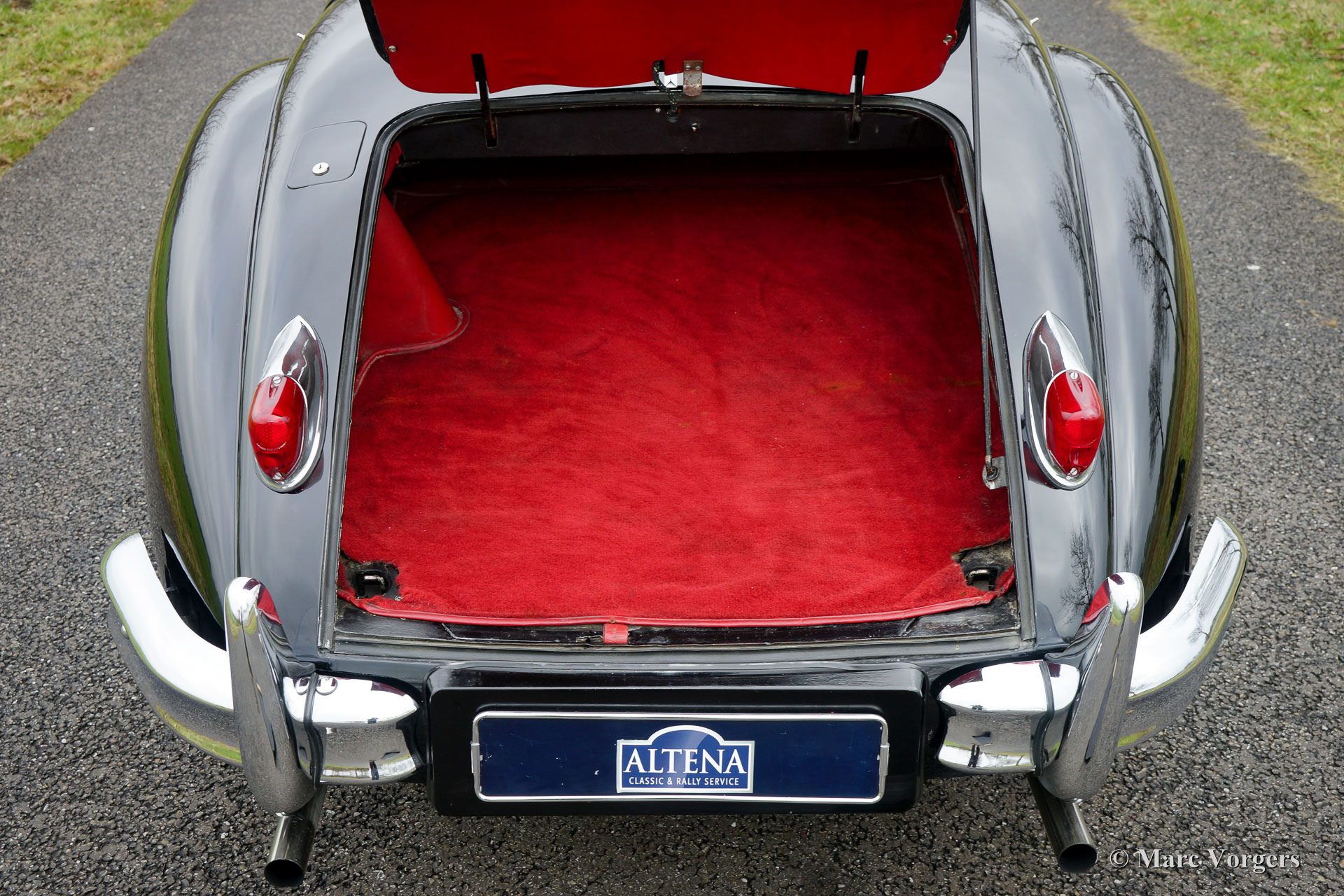 De 3.4-litre XK engine was increased by an extra 30 hp. and produced a standard 190 hp. from that time onwards. XK 140s that were provided with the SE option ("Special Equipment") were fitted with an engine giving 210 hp. Like the XK 120, the XK 140 was available as roadster, a larger DHC (Drop Head Coupe) and as FHC (Fixed Head Coupe) with a fixed steel roof. The XK 140 was built until 1957 was succeeded by the XK 150.