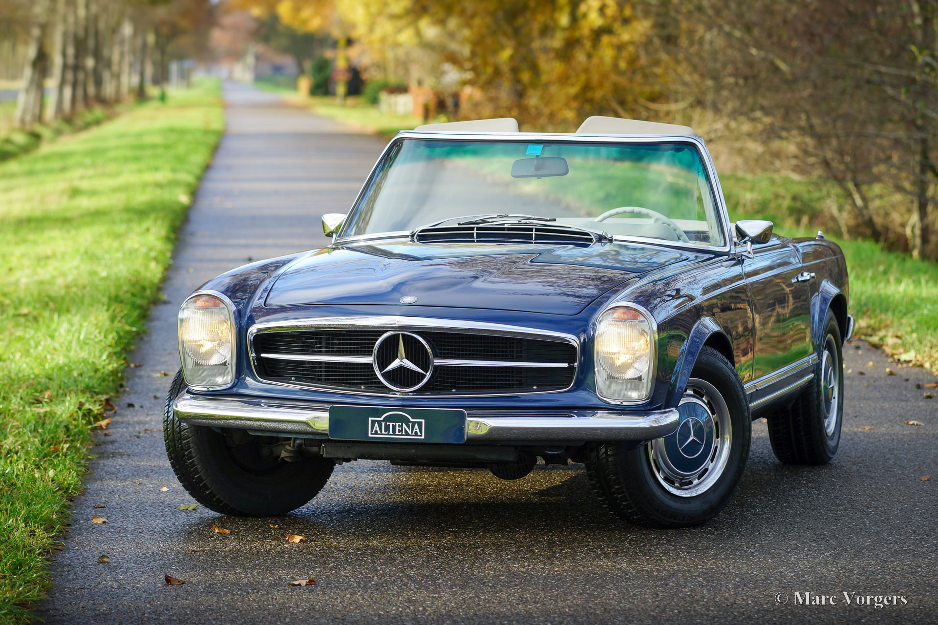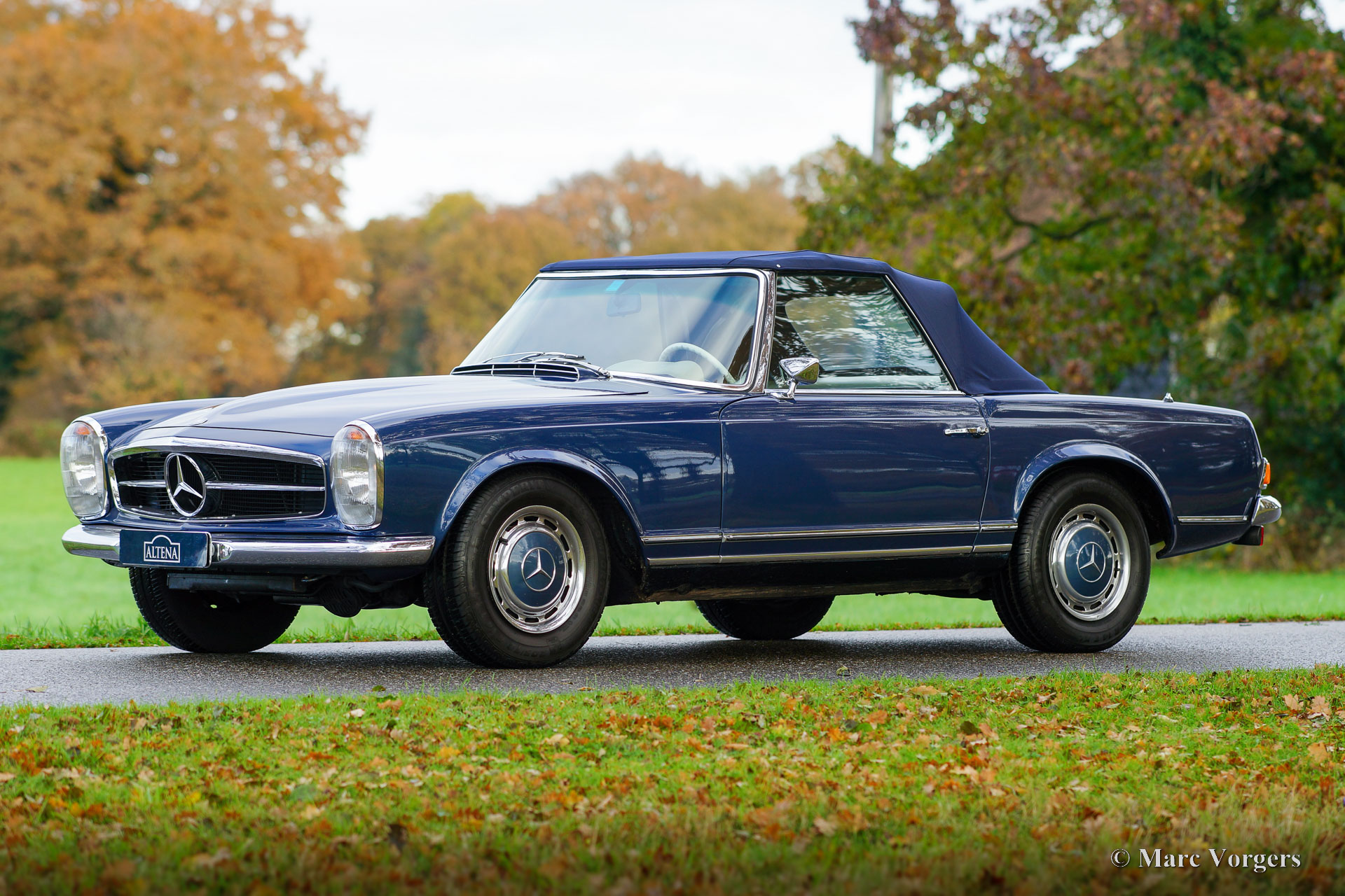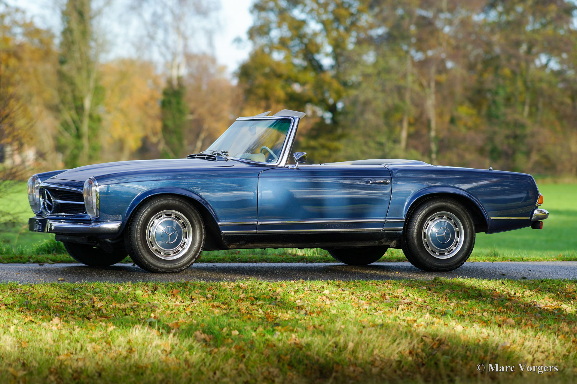 Mercedes-Benz 250 SL ‘Pagode’, year 1968. Matching, factory original, chassis and engine numbers, the MB ‘Datenkarte’ is present to confirm this. Colour blue metallic combined with a beige leather interior trimmed with beige carpet. Dark blue mohair hood. This wonderful Mercedes 250 SL was sold new in the USA. The car was imported to the Netherlands in 2006, where it was cherished by the last owner since 2008. The automobile was very well maintained over the years, this Mercedes 250 SL is in a very good condition, and the car drives perfectly. The six-cylinder engine runs smooth and powerful, the four-speed automatic gearbox shifts like it should. The paintwork and the chrome trim are beautiful, the interior shows light to normal signs of use, and the hood was renewed recently. The car features the original wheels with hub caps and 205/70 14-inch tyres, a period correct Blaupunkt radio with pin stripe design front, European head lamps and a wind stop. This beautiful Mercedes-Benz 250 SL (the rarest of the ‘Pagode’ model series) is ready for unforgettable summer evening drives, historic club events, and holiday road trips!
