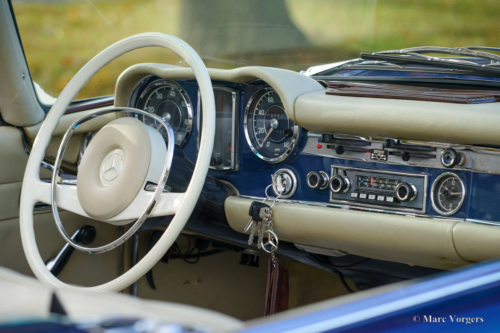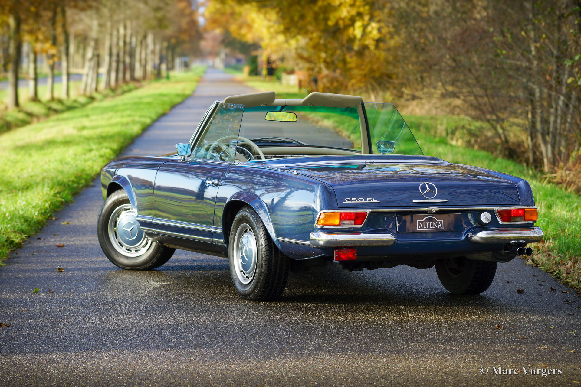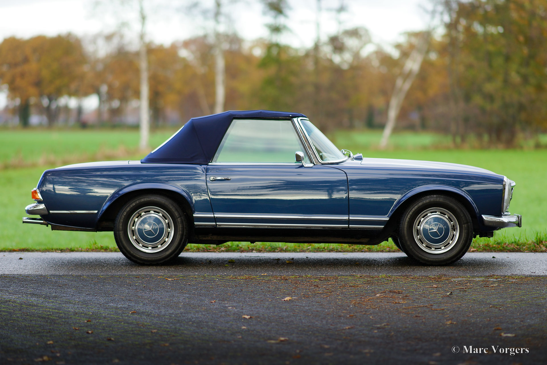 Mercedes-Benz 250 SL ‘Pagode’, year 1968. Matching, factory original, chassis and engine numbers, the MB ‘Datenkarte’ is present to confirm this. Colour blue metallic combined with a beige leather interior trimmed with beige carpet. Dark blue mohair hood. This wonderful Mercedes 250 SL was sold new in the USA. The car was imported to the Netherlands in 2006, where it was cherished by the last owner since 2008. The automobile was very well maintained over the years, this Mercedes 250 SL is in a very good condition, and the car drives perfectly. The six-cylinder engine runs smooth and powerful, the four-speed automatic gearbox shifts like it should. The paintwork and the chrome trim are beautiful, the interior shows light to normal signs of use, and the hood was renewed recently. The car features the original wheels with hub caps and 205/70 14-inch tyres, a period correct Blaupunkt radio with pin stripe design front, European head lamps and a wind stop. This beautiful Mercedes-Benz 250 SL (the rarest of the ‘Pagode’ model series) is ready for unforgettable summer evening drives, historic club events, and holiday road trips!