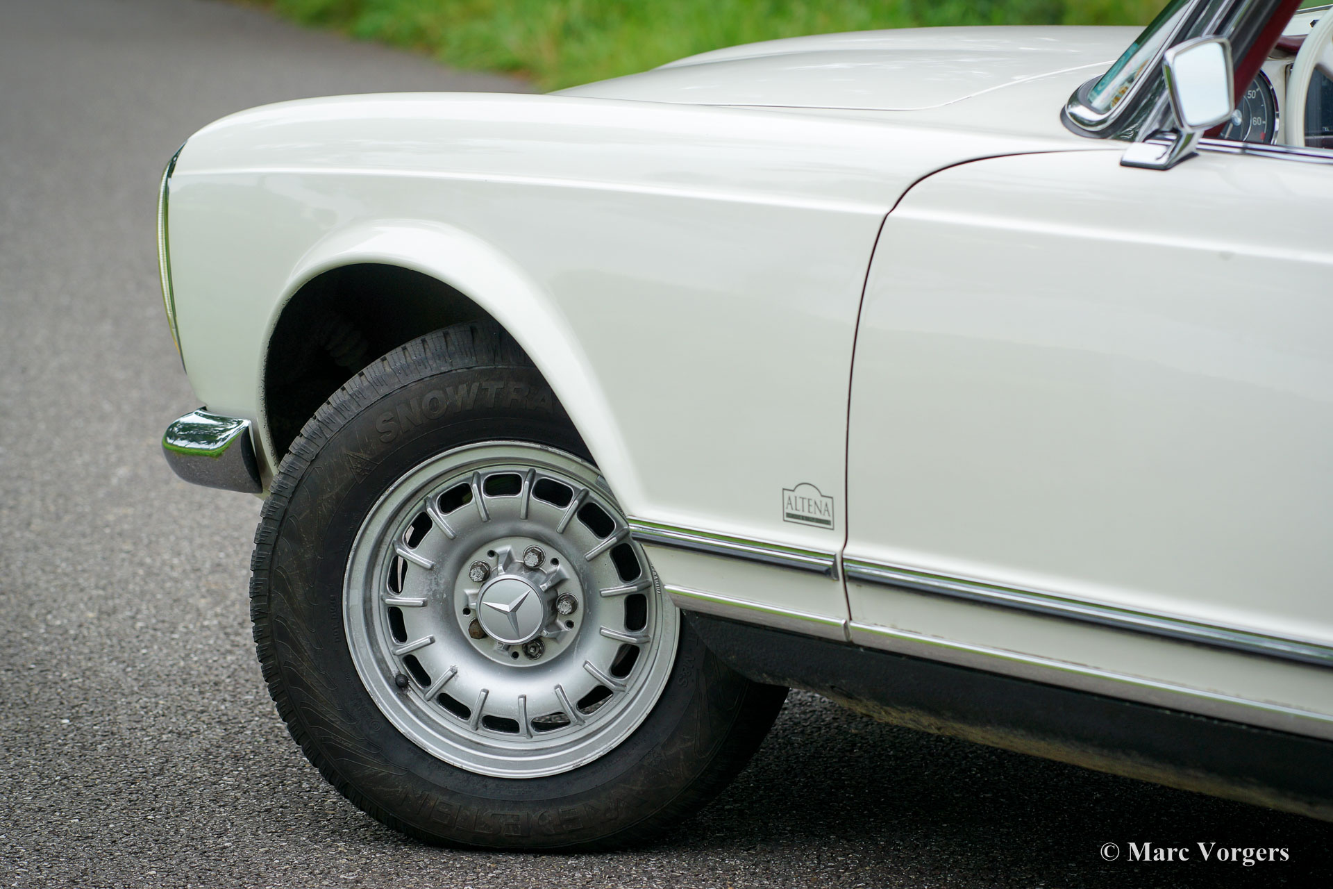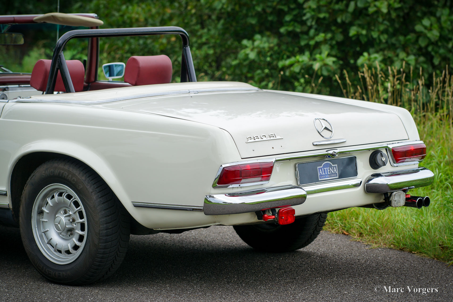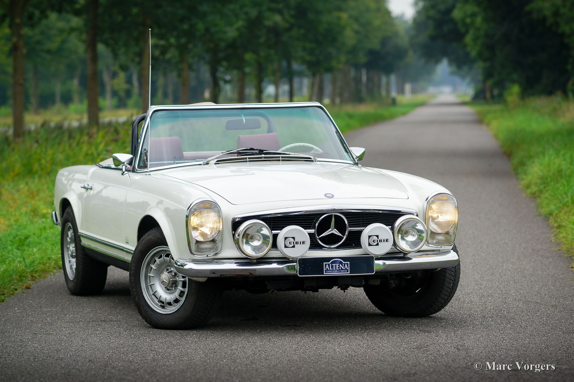 Mercedes-Benz 280 SL ‘Pagode’ (W113), year 1968. Chassis number 113.044-120033XX. Colour white with a red leather interior and red carpet. Original red hard-top and a black Mohair soft-top. This very nice (European) Mercedes 280 SL was imported to the Netherlands in the year 1999. Since 2008 the car has been serviced and maintained in the workshops of Altena Classic Service. All the service invoices are present as are all the original booklets and manuals. This 280 SL is in good to very good driver condition with some signs of use. The car was slightly modified for historic rally participation and the car drives perfect. Over the years this 280 SL has participated in the Winter Trial and in the renowned ‘Tulip Rallye’ in the years 2011 until 2017! The Mercedes has just undergone extensive service so the car is ready for any adventure! The automobile features original MB alloy wheels, additional fog- and spot lamps at the front, fog lamp at the rear, a custom build roll bar (which fits snugly under the soft-top and/or the hard-top!), a GTI Rally-Twin, excellent sports seats, 4-point safety harnesses, two 12V sockets under the dashboard and a wonderful classic Becker radio. The original red leather seats are also present, the automobile can quite easily be reverted to all-original condition. This is a perfectly driving and handling 280 SL!