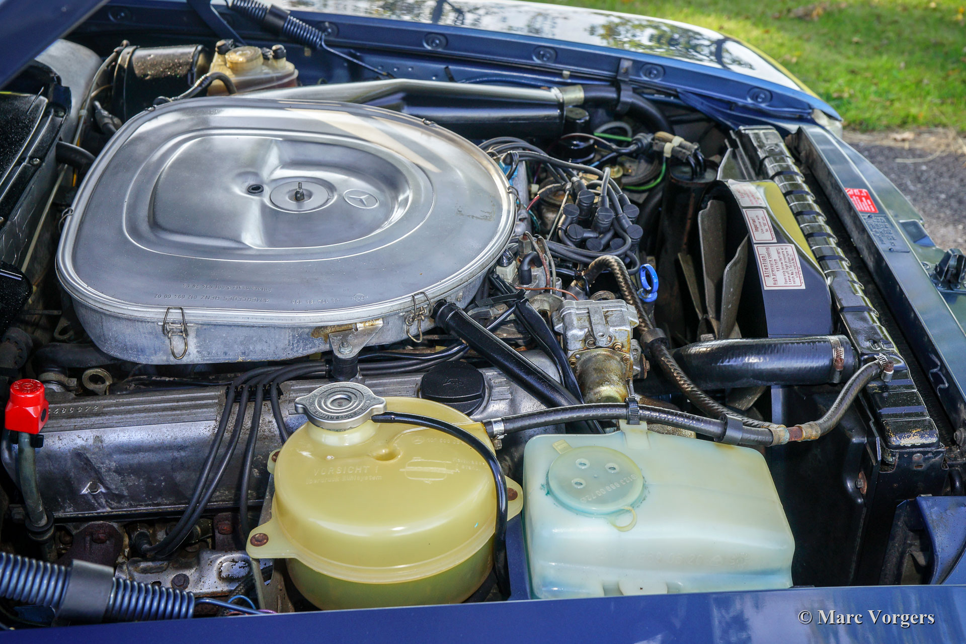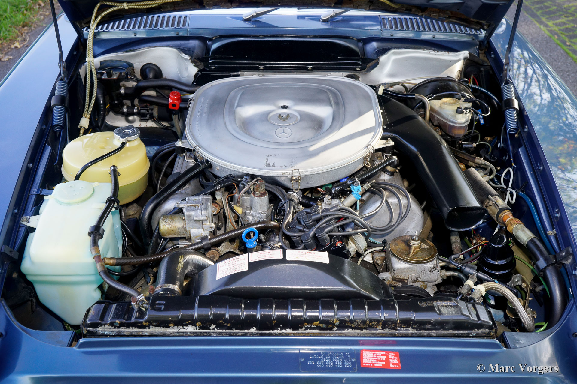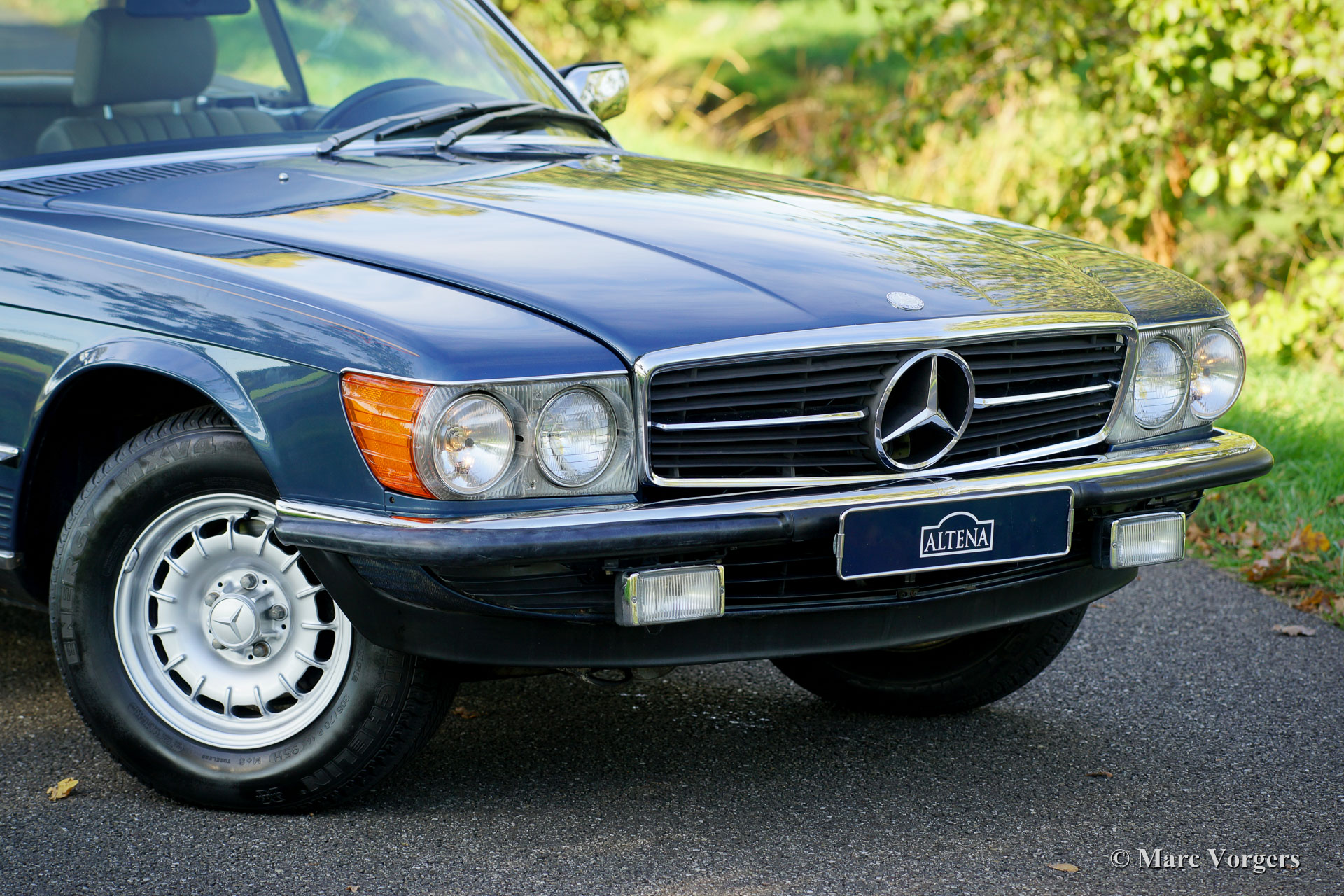 The Mercedes 280 SL, 350 SL and 450 SL are the successors of the 230 SL, 250 SL and 280 SL as we know under the nickname "Pagoda". The "Pagoda was built from the year 1963 until the year 1971, the year the new SL generation was presented to the market. Again Mercedes-Benz achieved to create a timeless design with slick, proper lines. In this shape the SL was sold for over twenty years. The "new" generation Mercedes SL is bigger, wider and heavier than its predecessor but again it was a perfect car considering construction, road holding and driving-comfort. The Mercedes-Benz SL was built with several engines. the buyer had to choose between a V8 with 3.5 or 4.5 liter cylinder capacity or a six cylinder engine with a cylinder capacity of 2.8 liter. The SL was standard equipped with a soft-top which could neatly be stowed away under a lid fully integrated in the car. Optionally the SL could be fitted with a hard-top. The hardtop can easily be fitted to the car, in a couple of minutes, with the soft-top down in place.