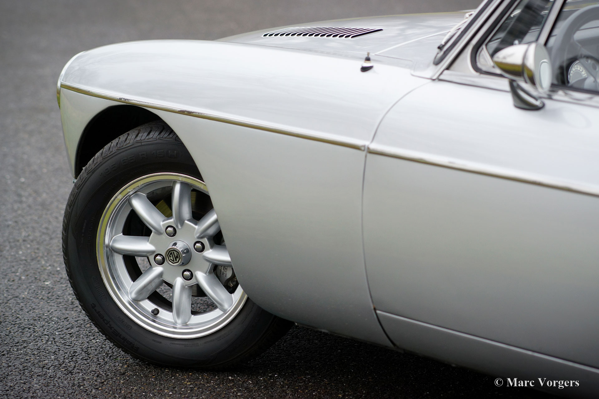 The MG B was the first MG (Morris Garage) built of unitary construction bodywork. The MG B GT V8 was built between 1973 and 1976. In 1970, Ken Costello, a garage owner, installed a Rover 3500 V8 engine in an MG B. MG took over the idea, though engine capacity of the Rover V8 in the MG did not produce 180 hp. at 5500 rpm. but 140 hp. at 5000 rpm. Influenced by the American rules on safety, later models were equipped with synthetic rubber bumpers. Many of the later, built from 1974 until 1976, "rubber-bumper" models are now converted into "chrome-bumper" models. The car shown in these pictures is a original chrome bumper car fitted with the original MG B GT V8 rims.