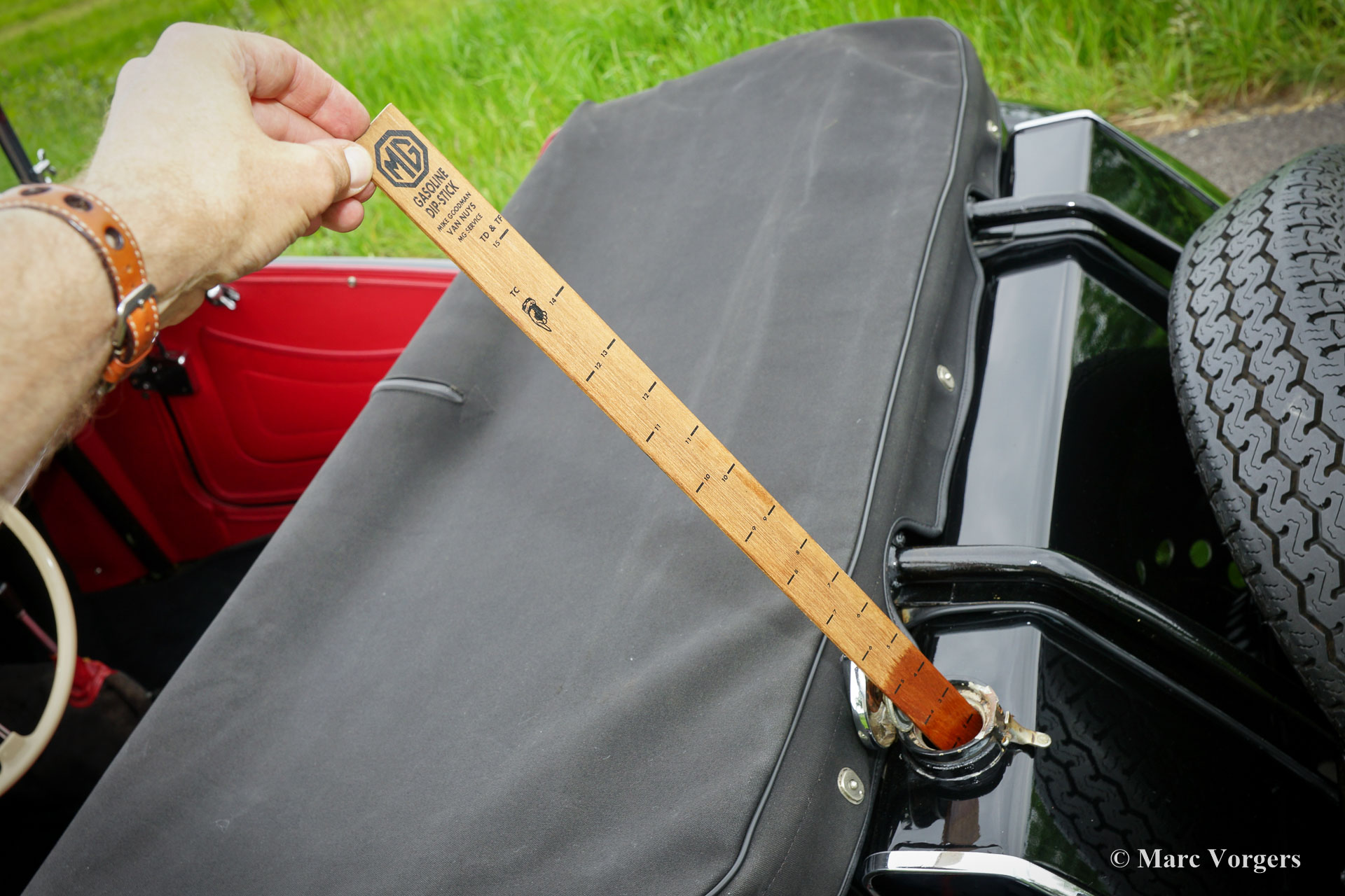 MG TD, year 1953. Colour black with a red leather interior. Black canvas soft top and side-screens, black tonneau cover. This beautiful MG TD has ‘matching numbers’. This super original MG TD is in excellent condition and the car drives delightfully. The original steering wheel and the original oil bath air-filter are still present. Furthermore, the automobile features a walnut dashboard and a Stainless Steel exhaust. The car comes complete with instruction book.