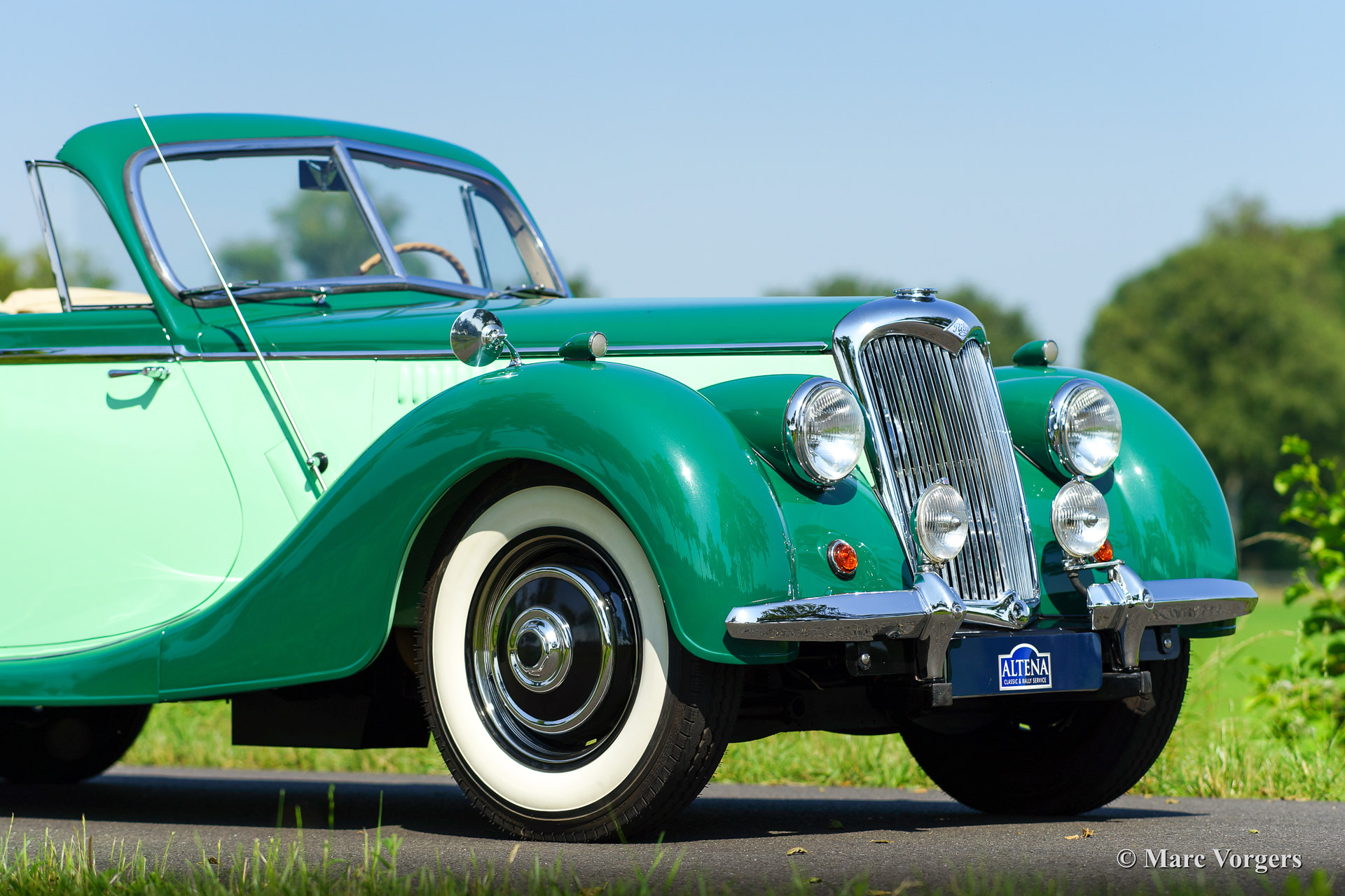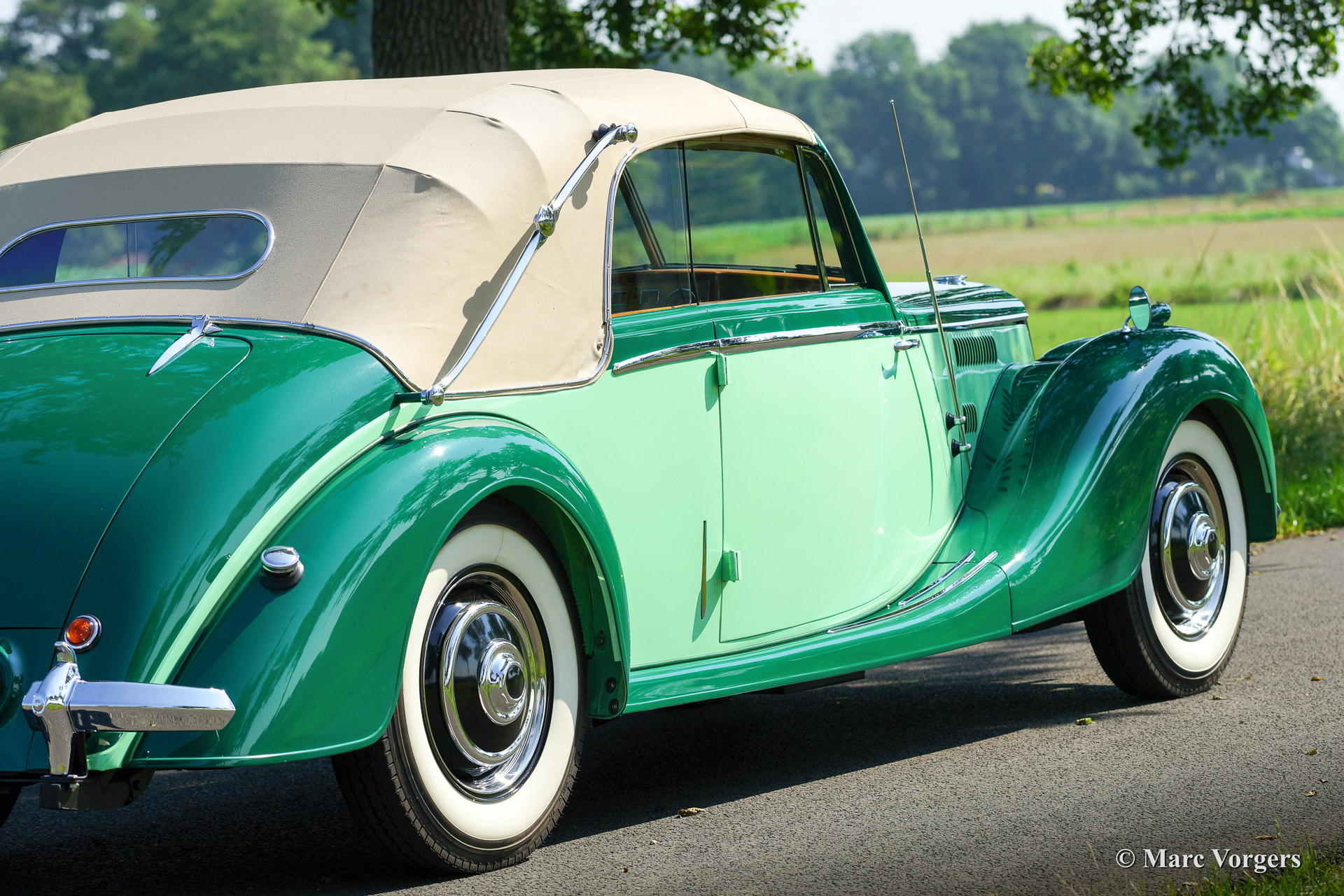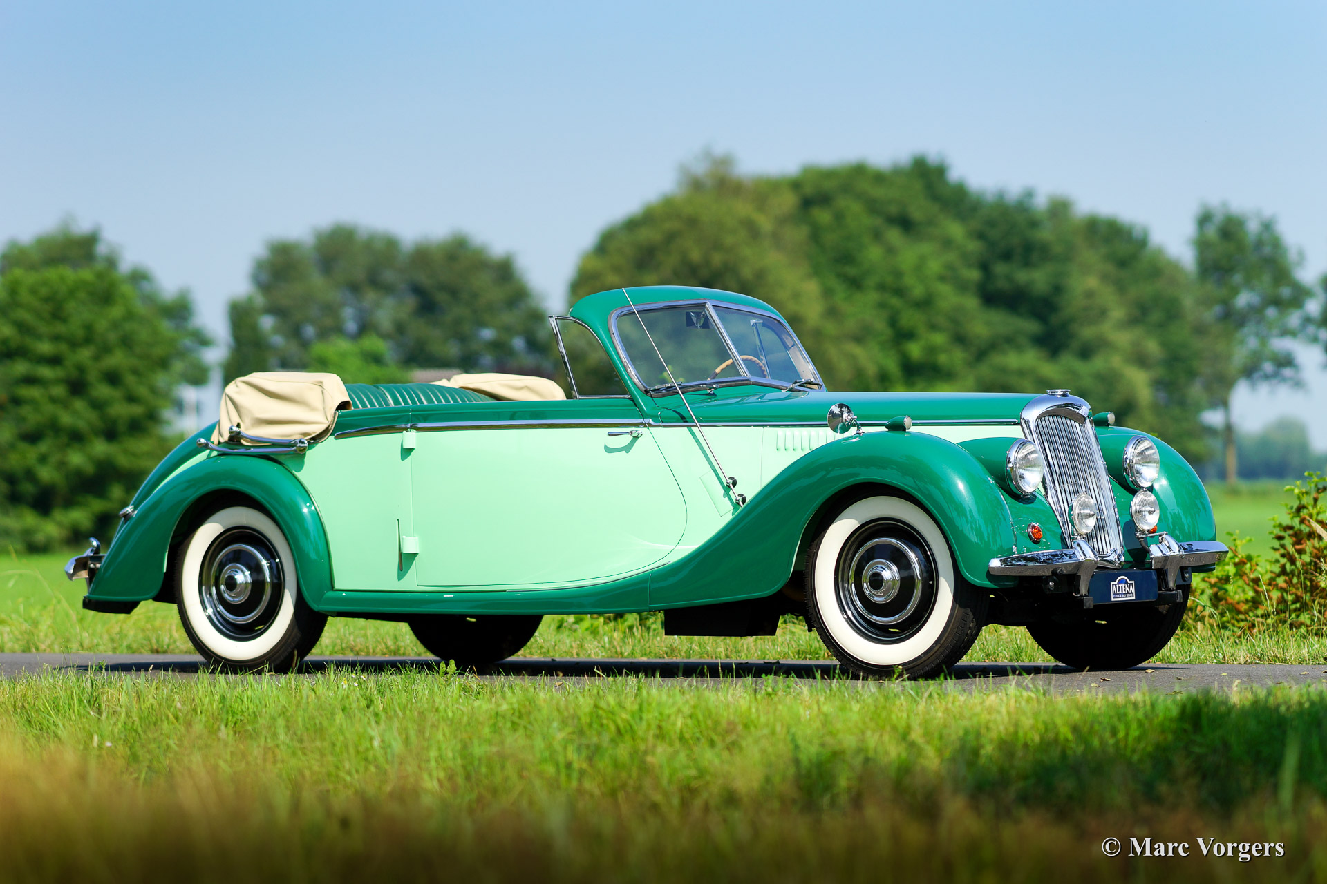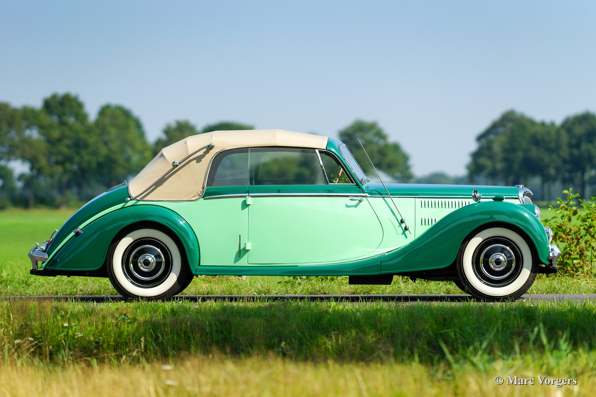 Riley RMD Drophead Coupe, year 1951. Chassis number 60F72XX. Colour two-tone, green/light green. Green leather interior with green carpet. Beige hood and hood cover. This fantastic Riley is one of the only 502 ever built RMD Drophead Coupe models. The automobile was extensively restored in the past. This left hand drive (LHD) Riley is in superb (excellent++) condition, near concours! A beautiful four passenger tourer with a gorgeous wooden dashboard, period radio, excellent hood and lovely frameless roll-up windows. Rare, beautifully restored, exclusive and yet within reach of the true enthusiast!