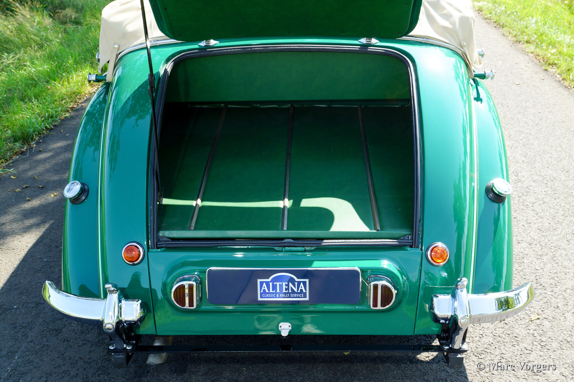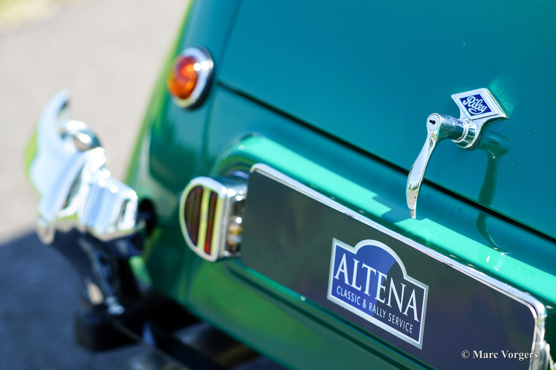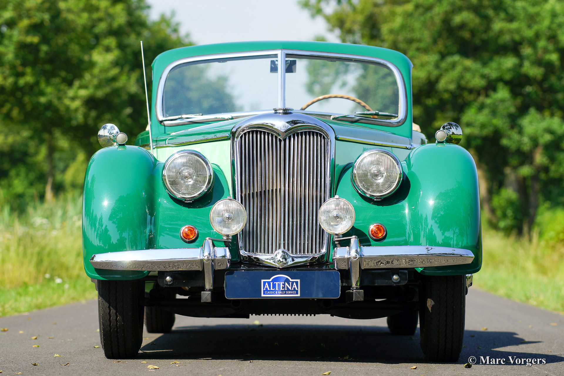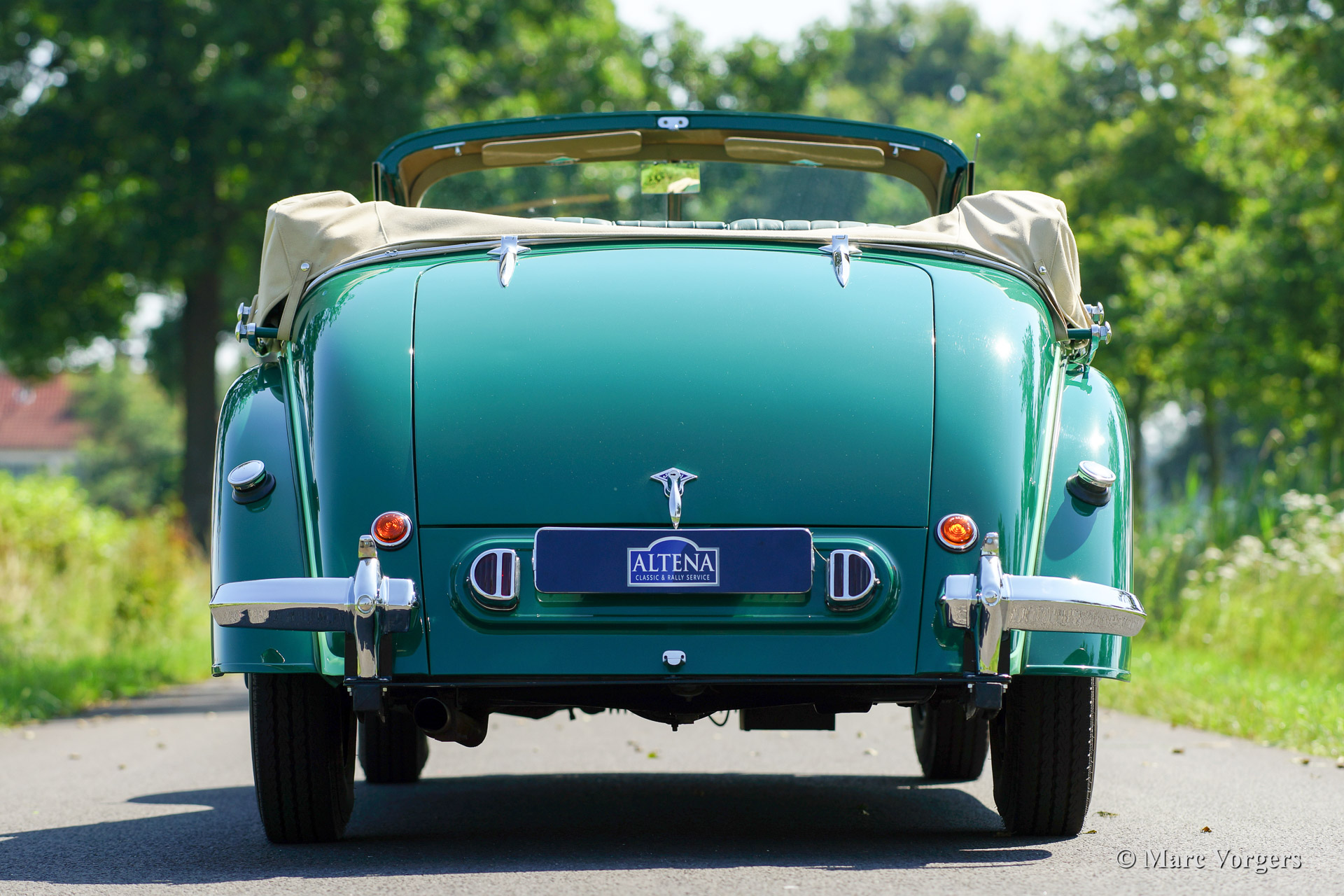 Riley RMD Drophead Coupe, year 1951. Chassis number 60F72XX. Colour two-tone, green/light green. Green leather interior with green carpet. Beige hood and hood cover. This fantastic Riley is one of the only 502 ever built RMD Drophead Coupe models. The automobile was extensively restored in the past. This left hand drive (LHD) Riley is in superb (excellent++) condition, near concours! A beautiful four passenger tourer with a gorgeous wooden dashboard, period radio, excellent hood and lovely frameless roll-up windows. Rare, beautifully restored, exclusive and yet within reach of the true enthusiast!