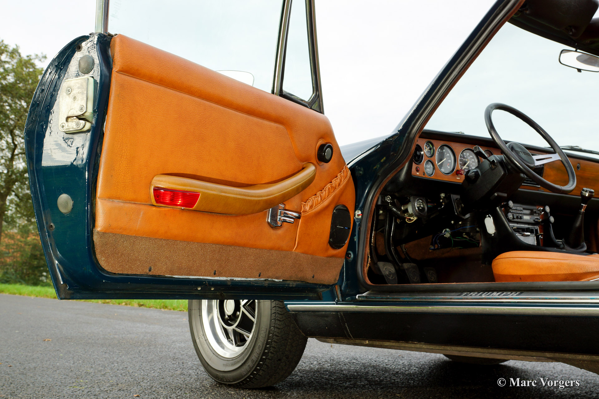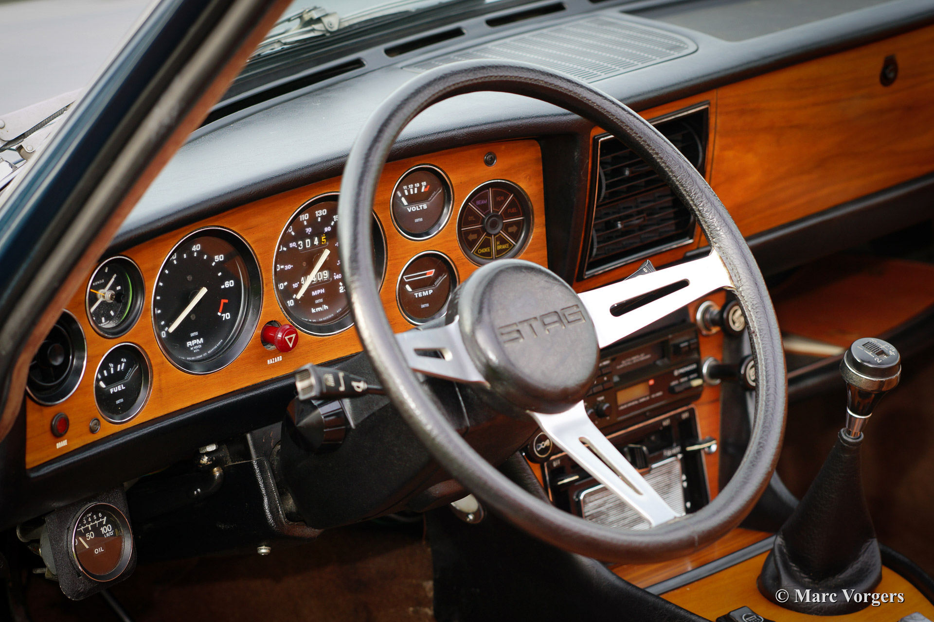 Triumph Stag, year 1974. Chassis number LD 3148X XX. Body colour blue with a cognac colour leatherette interior. This beautiful Triumph Stag was sold new in the Netherlands. The automobile is in excellent original condition! From new the car has known only three cautious owners who kept the car in fantastic shape. The body work, the interior, the engine room, the boot and the underside of the car look beautifully original with just slight traces of use. The Triumph V8 engine runs and sounds perfect and the car handles and drives superbly. This Stag features a manual gearbox (rare) and power steering. The cooling system has been up rated to improve the cooling capacity. The expansion tank was placed higher up, a high capacity radiator was fitted as was an electric Kenlow cooling fan. Furthermore the car sports electronic ignition (Lumenition) and a Smiths oil pressure meter (dashboard accessory). This fantastic Triumph Stag is complete with original hard top in body colour. The hard top sports a heated rear window! This is a wonderful and very original Triumph Stag, you will be hard pressed to find another specimen in this condition!