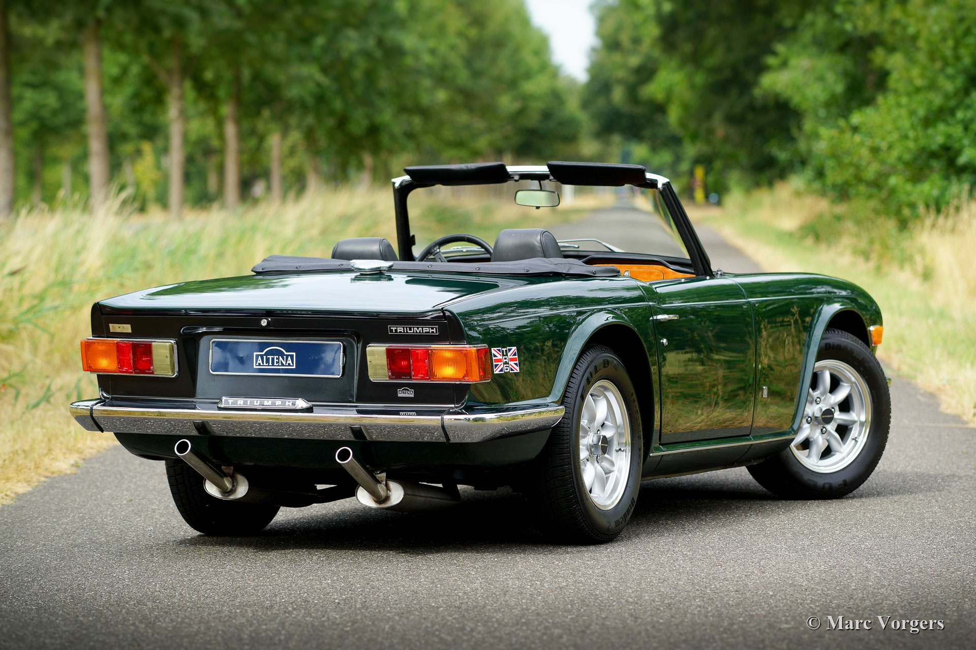 Triumph TR6, year 1971. Colour British Racing Green with a black leather interior. This fantastic Triumph TR6 was sold new in the USA. The car was imported to the Netherlands in the year 1994. In the Netherlands, the automobile was extensively and body-off restored (from the bare metal) by a top-class restoration firm, a photo report of the restoration is present as is a file with (service) invoices. This TR6 is in excellent condition and the car drives perfectly! The bodywork shows a perfect panel fit and superb paint. The interior and the engine room are in like new condition. To get an idea of the quality; the car has been cared for and serviced by the renowned Dutch firm of Piet Mozes Restorations for many years. The car features overdrive, light alloy Panasport wheels shod with 195/70 Fulda tyres, an alarm system, a gear lever knob with integrated overdrive switch and a twin pipe Stainless Steel sports exhaust which produces a magnificent sound-track. The car shows beautiful original details, the original steering wheel is still present. The Triumph TR6 features a wonderful wood dashboard with many gauges; one of the best cockpits you will ever find in a classic sports car! This fine TR6 drives and handles superbly!