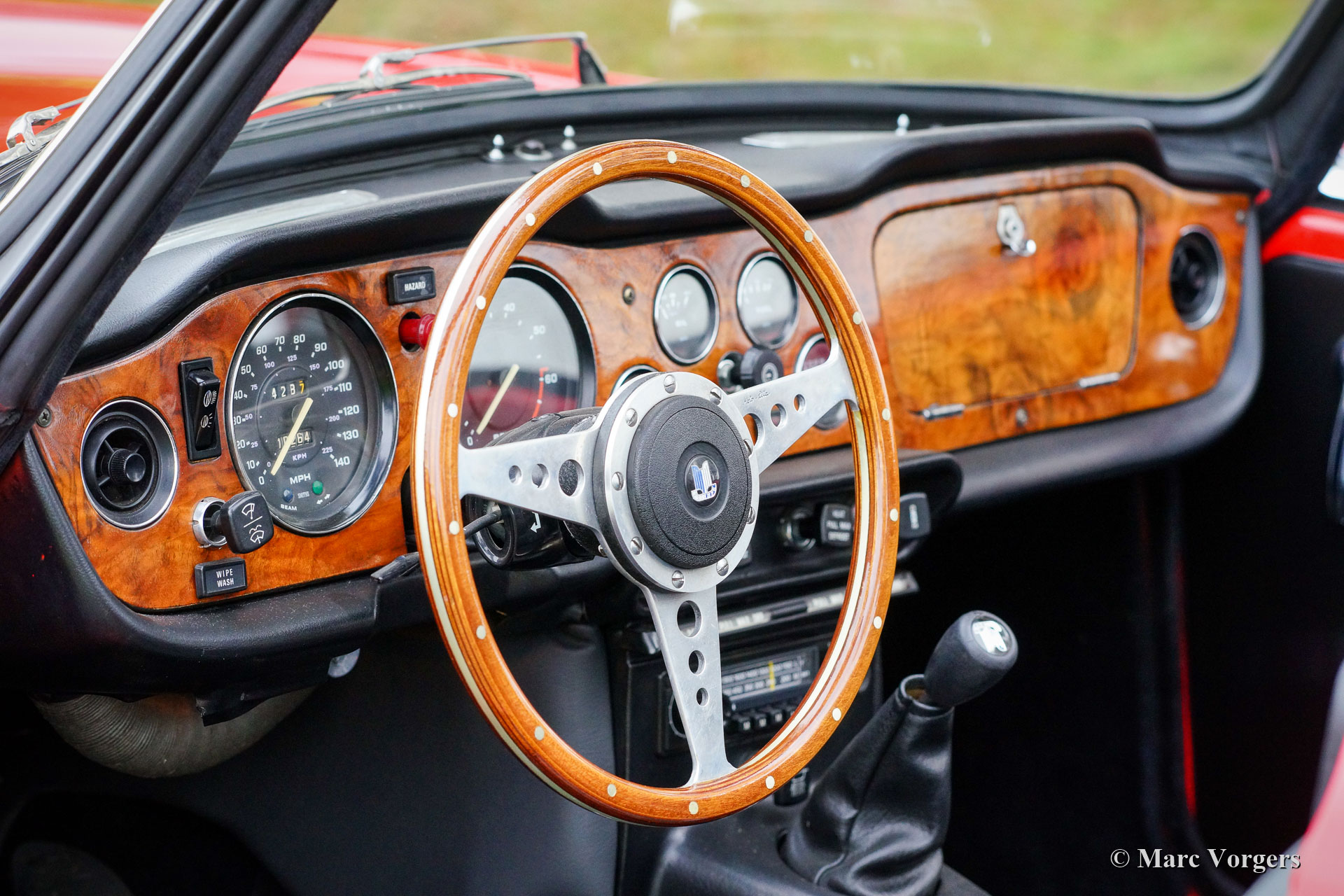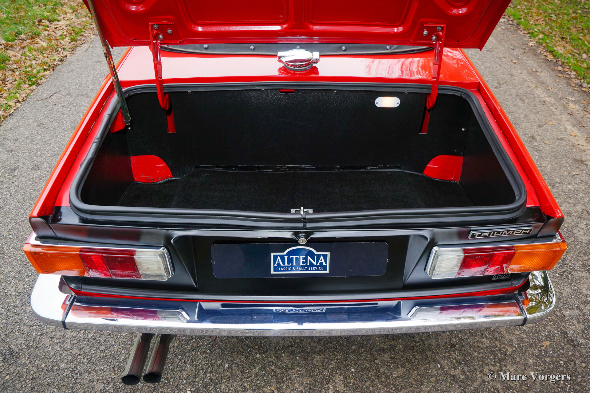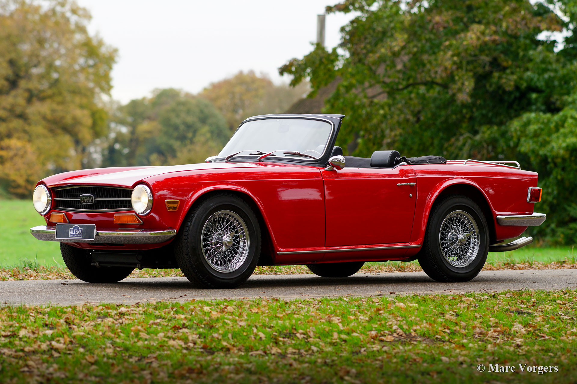 Triumph TR 6, year 1973. Colour red with a black leather interior and black carpet. Black mohair soft-top and hood-cover. This fantastic Triumph TR 6 was extensively restored in the Netherlands in the late 1990s. The car was perfectly serviced and maintained ever since; this TR 6 is in excellent condition and the car drives perfectly. The six-cylinder in-line engine runs and sounds magnificent! The body shows a beautiful panel fit and excellent paintwork, the chrome parts are brilliant, the interior is in a fantastic condition, and the soft-top is like new! The car is fitted with wonderful chrome wire wheels shod with 185/15 Michelin tyres and knock-off wheel nuts, a walnut dashboard, a MotoLita steering wheel with a wood rim, an aluminium alloy rocker cover, a Stainless-Steel baggage rack and a Stainless-Steel exhaust. This TR 6 comes with an original user manual. The car can be imported / exported to any country. This beautiful and high-quality Triumph TR 6 is ready for any adventure in the hands of a new owner!