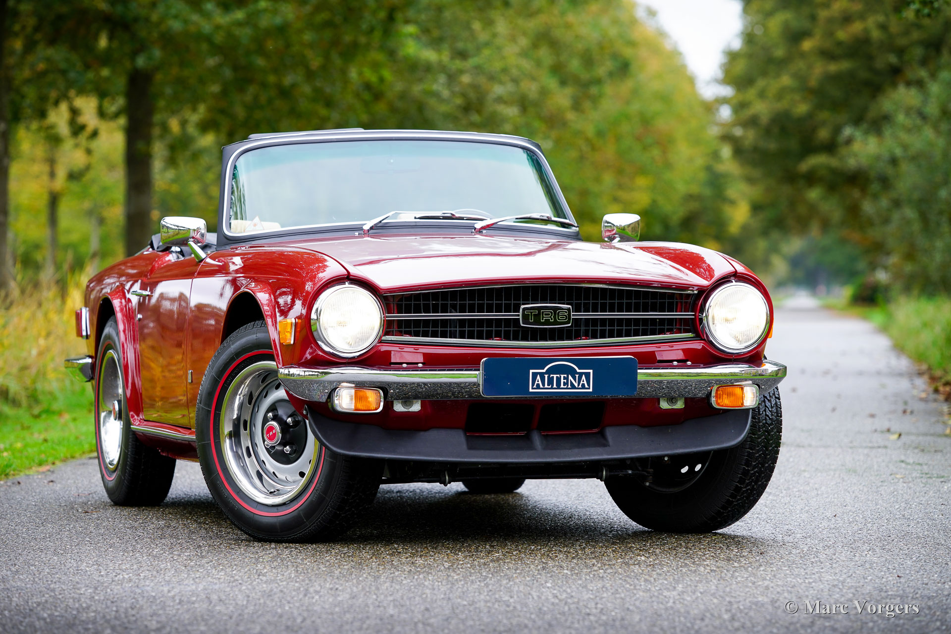 Triumph TR6, year of built (November) 1974 (first registration 1975). Matching numbers, a Heritage document is present to confirm this. Bodywork finished in the wonderful colour Carmine red combined with a beige (tan) faux leather interior and light beige (magnolia) carpet. This fine TR6 is immediately identifiable as a 1975 model year car by its higher front bumper with the turn signals mounted below. The two-tone orange and white turn signal lenses are specific to this model year. This TR6 was sold new in Halifax Canada. In the period 2008 – 2012 the car was restored in Canada, invoices mounting up to €25.000 are present in the history file. In the year 2020 the car was shipped to the Netherlands where it was road registered in 2023. The Dutch enthusiast owner perfected the car in the fine details, and in our workshop the rear axles, the carburettors and the clutch were overhauled/ renewed. This wonderful Triumph TR6 is in excellent condition (looks near brand new!), and the car is fully up to date. This TR6 presents itself in a wonderful colour scheme. The Carmine red body colour, the tan seats and the magnolia carpet match wonderfully together and with the fantastic high gloss walnut dashboard! The straight six engine still breathes through the original Stromberg carburettors, original air filter housing, and the original type of steel exhaust system; the exhaust note on this car is 100% period correct! This TR6 features an aluminium rocker cover, a sports steering wheel with a wood rim, a Stainless-Steel baggage rack, stainless steel wipers, and a pair of door-mounted rear-view mirrors. This top-quality Triumph TR6 is ready to be enjoyed to the full!