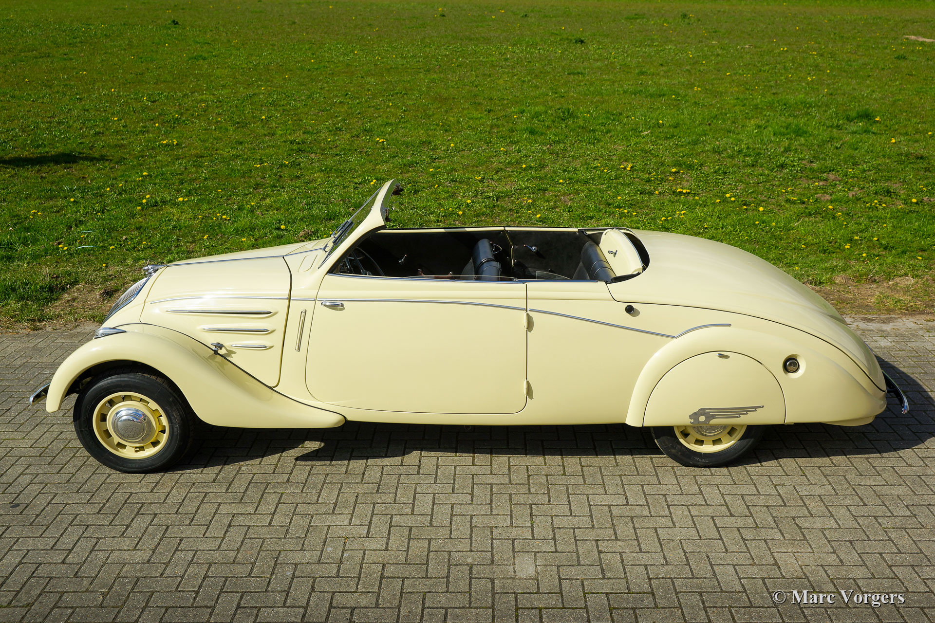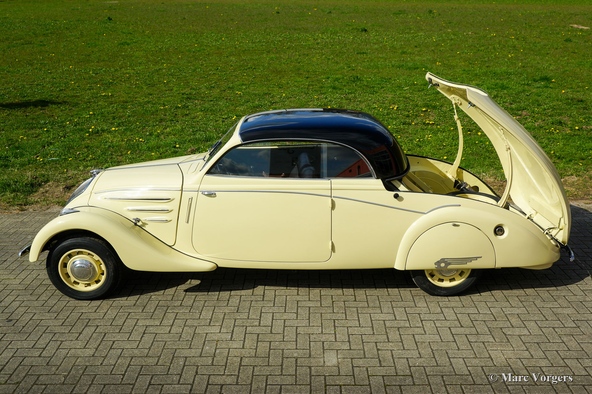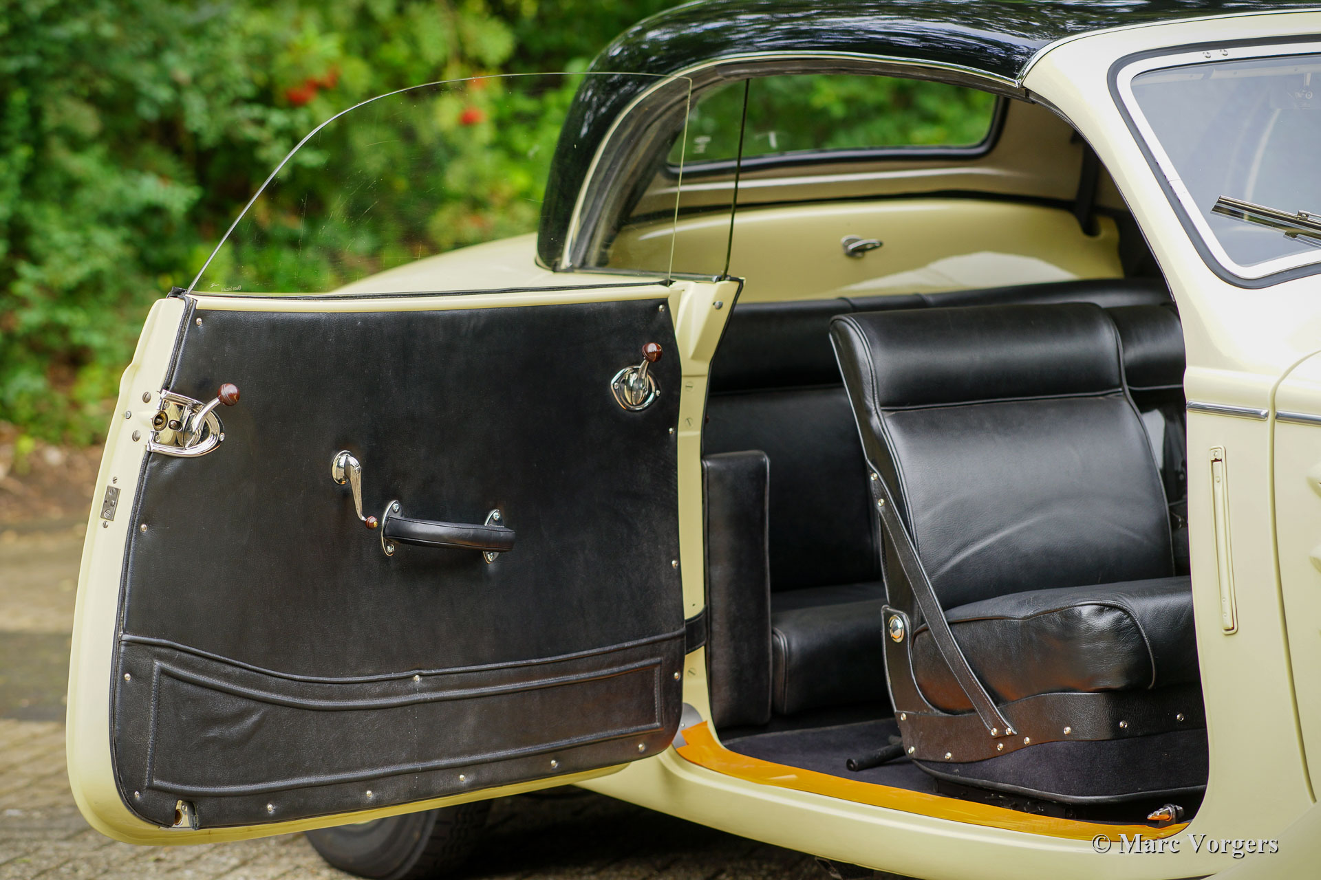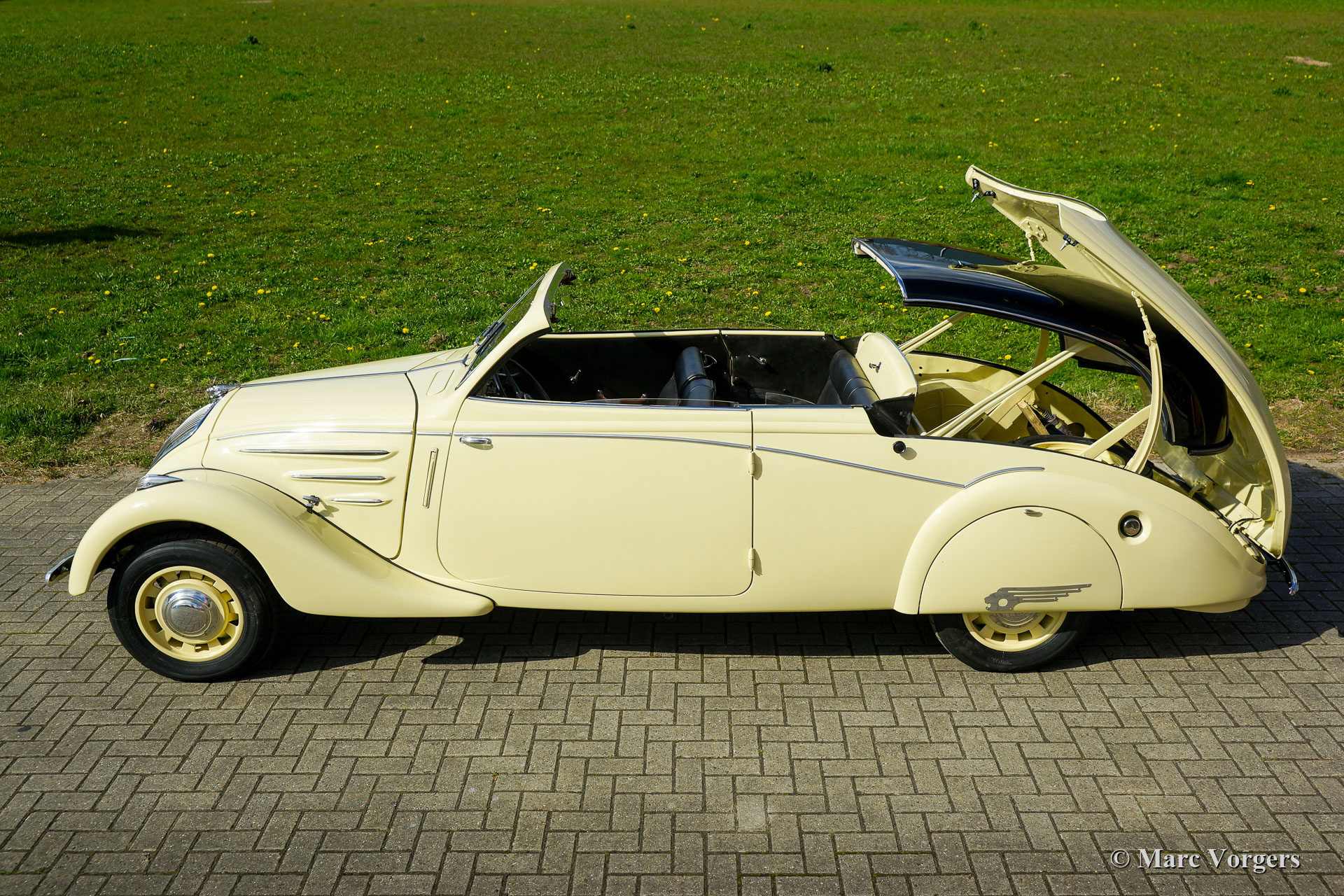 Peugeot 402 L Eclipse, 1935. This beautiful Peugeot 402 L Eclipse is painted in pale yellow with a black roof combined with a black leather interior. The Peugeot 402 L (longue) Eclipse is a very rare car. Only 473 examples were built, and unfortunately no distinction was made between the standard versions and the L (longue) version with a longer wheelbase. The Peugeot 402 series was introduced at the 1935 Paris Motor Show and captivated the public with its radical, aerodynamic “Sochaux spindle” styling, with a running-board-free streamlined body and striking headlights placed behind the radiator grille. This design was a bold step in the Art Deco movement and distinguished the 402 from its contemporaries. The true wonder of this model, however, lies in its “Eclipse” designation: The 1934 Peugeot 401 Eclipse was the world's first production car with a retractable metal hardtop. The 402 Eclipse took this concept to an unprecedented level with its magnificent design. An ingenious mechanism allowed the car to seamlessly transform from a refined coupé into an elegant open-top convertible, offering the safety and weather protection of a fixed roof combined with the pleasure of open-air motoring. This beautiful 1935 example has a unique and well-documented history. According to the old blue coloured “carte grise”, which lists the first owner's profession, the car was delivered new to a French farmer. The car was found in France with a partially sawn-off rear end but otherwise virtually complete. The restoration began in 2000 at Classic Jaap (now Classic Job). The coachbuilders travelled to France to take measurements and create drawings of a sister model to reconstruct the missing rear section. The demanding restoration would take over twenty years due to the owner's illness and prolonged storage. The car was eventually purchased by Classic Job. A new owner was found, and the project was completed between December 2017 and July 2021. The restoration was carried out very thoroughly (see 2017-2021 photo report). In addition to the rear, several parts had to be recreated by hand, such as the chrome trim and the rear bumper. The result is a superbly restored Peugeot 402 L Eclipse that retains 98% of its original details. A remarkable achievement for a vehicle of this age and complexity. Since the restoration, the car has been driven approximately 2,000 kilometres. This rare Peugeot drives superbly. A special feature is the presence of the luxurious original “OS” dashboard instrument, which includes the speedometer, odometer, oil pressure, fuel gauge, and clock! A rare and working piece! This beautiful Peugeot 402 L Eclipse is in concours condition. A beautiful, museum-worthy collector's item. A work of automotive art that combines sculptural Art Deco design with groundbreaking technical innovation.