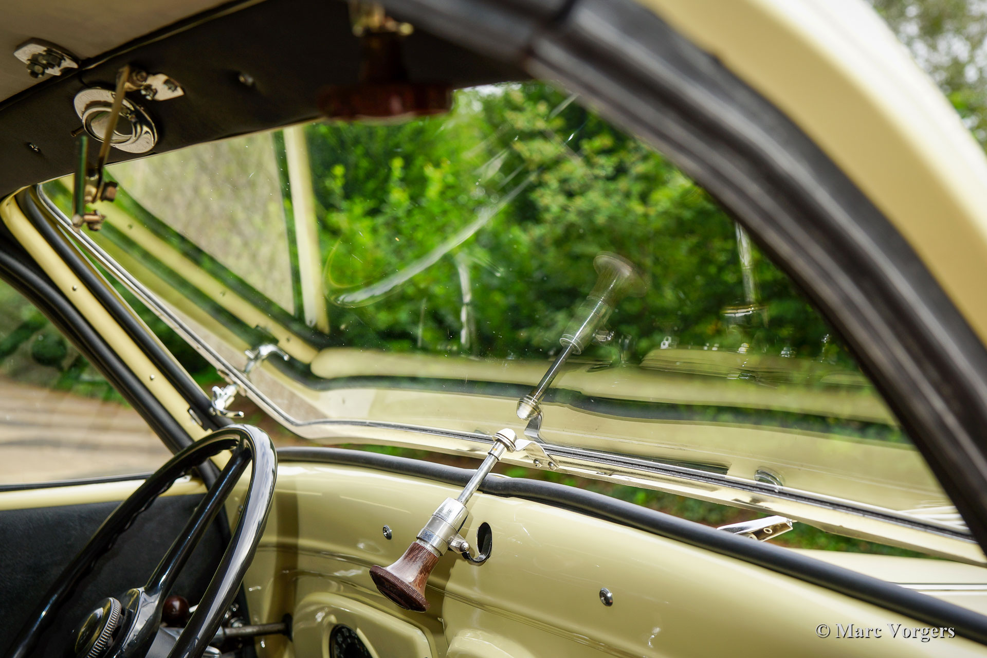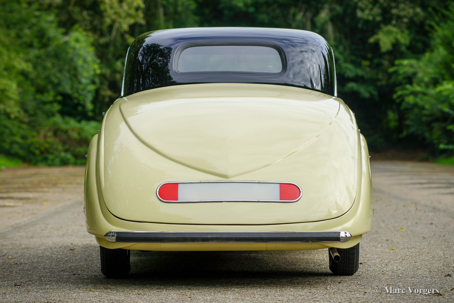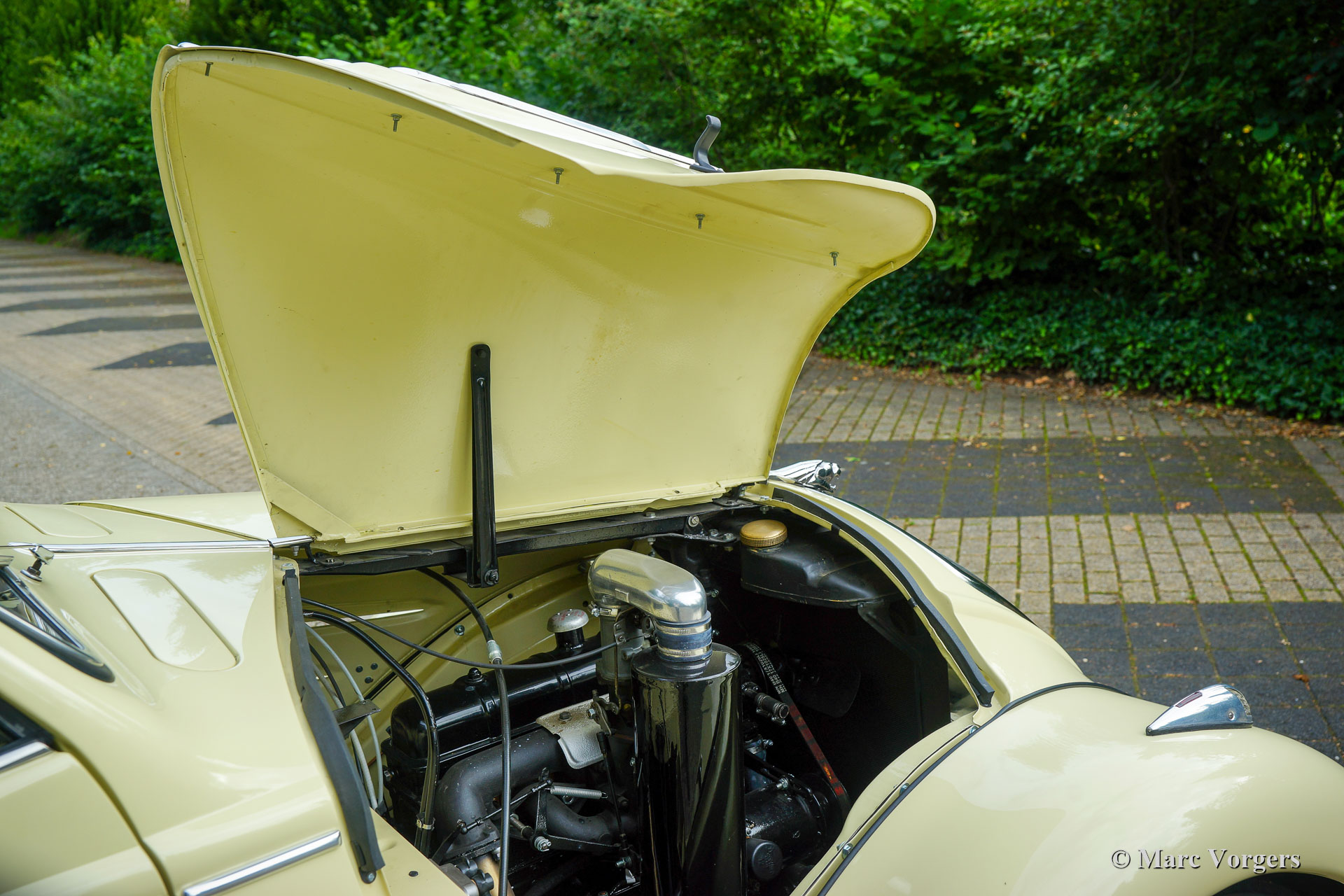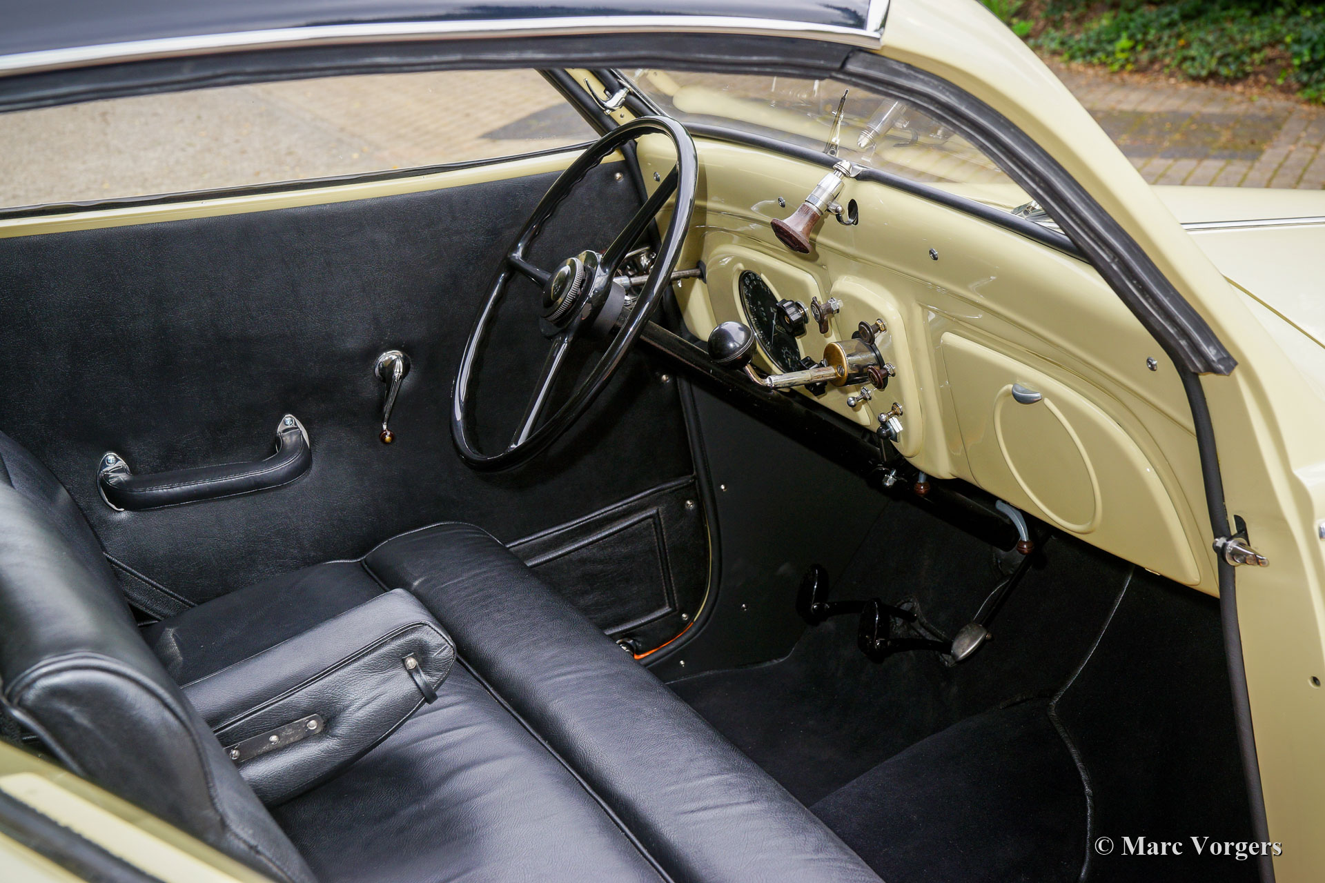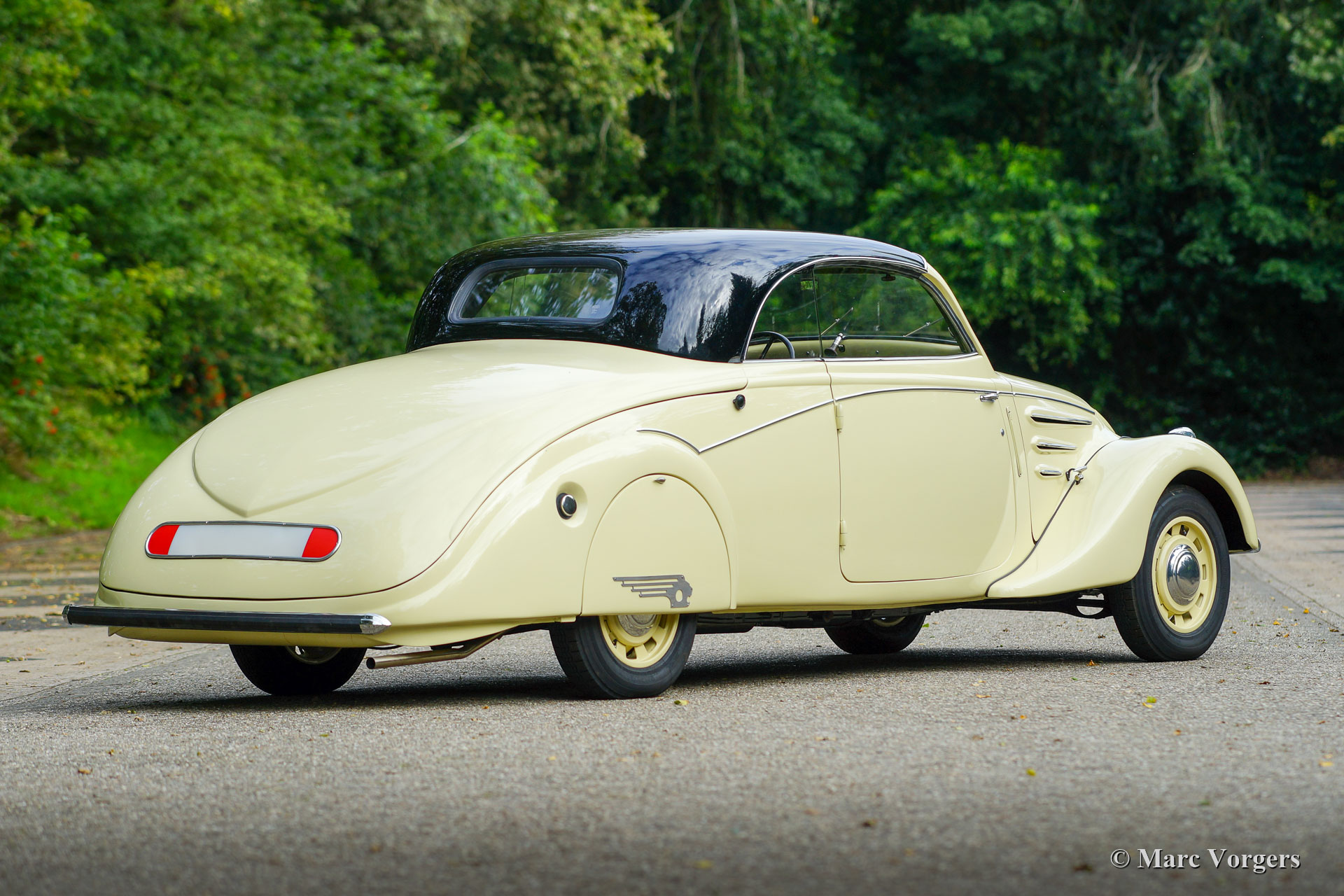 Peugeot 402 L Eclipse, 1935. This beautiful Peugeot 402 L Eclipse is painted in pale yellow with a black roof combined with a black leather interior. The Peugeot 402 L (longue) Eclipse is a very rare car. Only 473 examples were built, and unfortunately no distinction was made between the standard versions and the L (longue) version with a longer wheelbase. The Peugeot 402 series was introduced at the 1935 Paris Motor Show and captivated the public with its radical, aerodynamic “Sochaux spindle” styling, with a running-board-free streamlined body and striking headlights placed behind the radiator grille. This design was a bold step in the Art Deco movement and distinguished the 402 from its contemporaries. The true wonder of this model, however, lies in its “Eclipse” designation: The 1934 Peugeot 401 Eclipse was the world's first production car with a retractable metal hardtop. The 402 Eclipse took this concept to an unprecedented level with its magnificent design. An ingenious mechanism allowed the car to seamlessly transform from a refined coupé into an elegant open-top convertible, offering the safety and weather protection of a fixed roof combined with the pleasure of open-air motoring. This beautiful 1935 example has a unique and well-documented history. According to the old blue coloured “carte grise”, which lists the first owner's profession, the car was delivered new to a French farmer. The car was found in France with a partially sawn-off rear end but otherwise virtually complete. The restoration began in 2000 at Classic Jaap (now Classic Job). The coachbuilders travelled to France to take measurements and create drawings of a sister model to reconstruct the missing rear section. The demanding restoration would take over twenty years due to the owner's illness and prolonged storage. The car was eventually purchased by Classic Job. A new owner was found, and the project was completed between December 2017 and July 2021. The restoration was carried out very thoroughly (see 2017-2021 photo report). In addition to the rear, several parts had to be recreated by hand, such as the chrome trim and the rear bumper. The result is a superbly restored Peugeot 402 L Eclipse that retains 98% of its original details. A remarkable achievement for a vehicle of this age and complexity. Since the restoration, the car has been driven approximately 2,000 kilometres. This rare Peugeot drives superbly. A special feature is the presence of the luxurious original “OS” dashboard instrument, which includes the speedometer, odometer, oil pressure, fuel gauge, and clock! A rare and working piece! This beautiful Peugeot 402 L Eclipse is in concours condition. A beautiful, museum-worthy collector's item. A work of automotive art that combines sculptural Art Deco design with groundbreaking technical innovation.