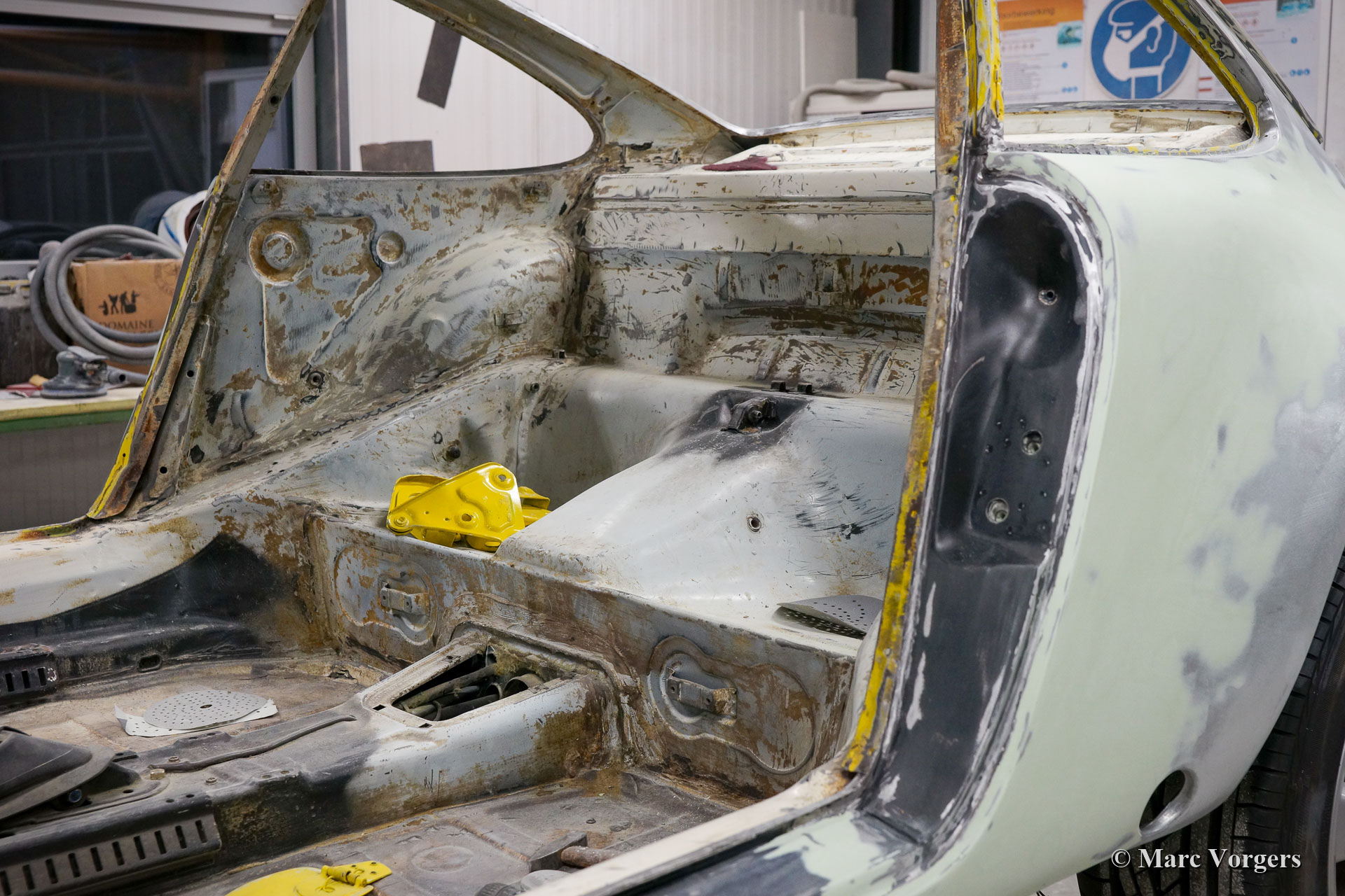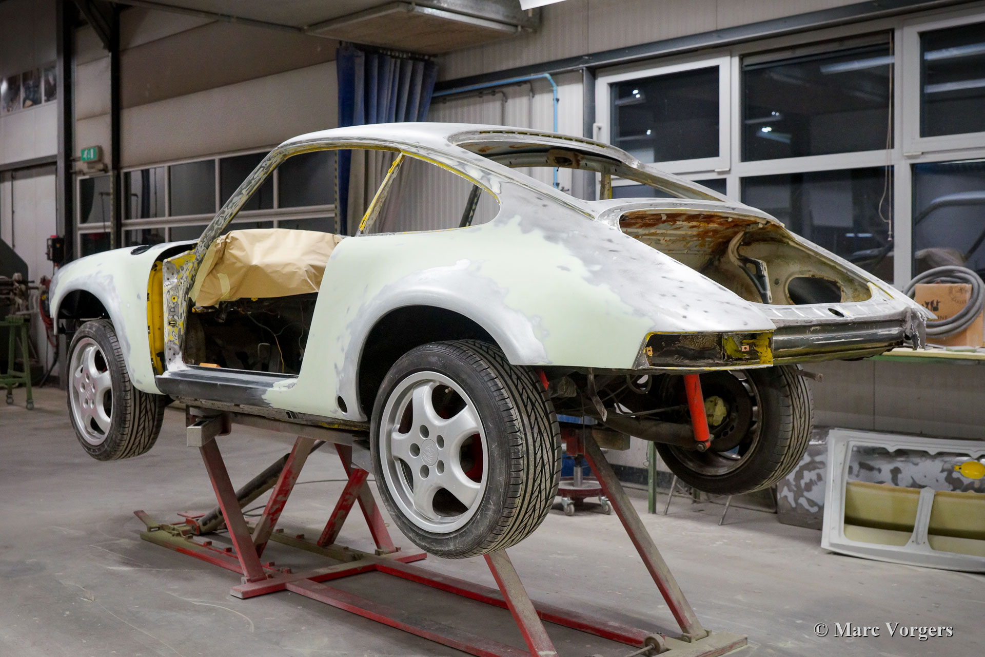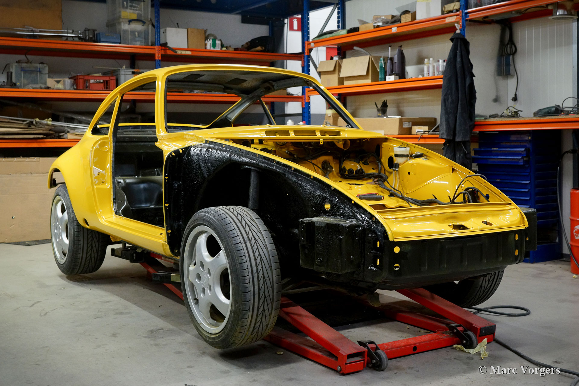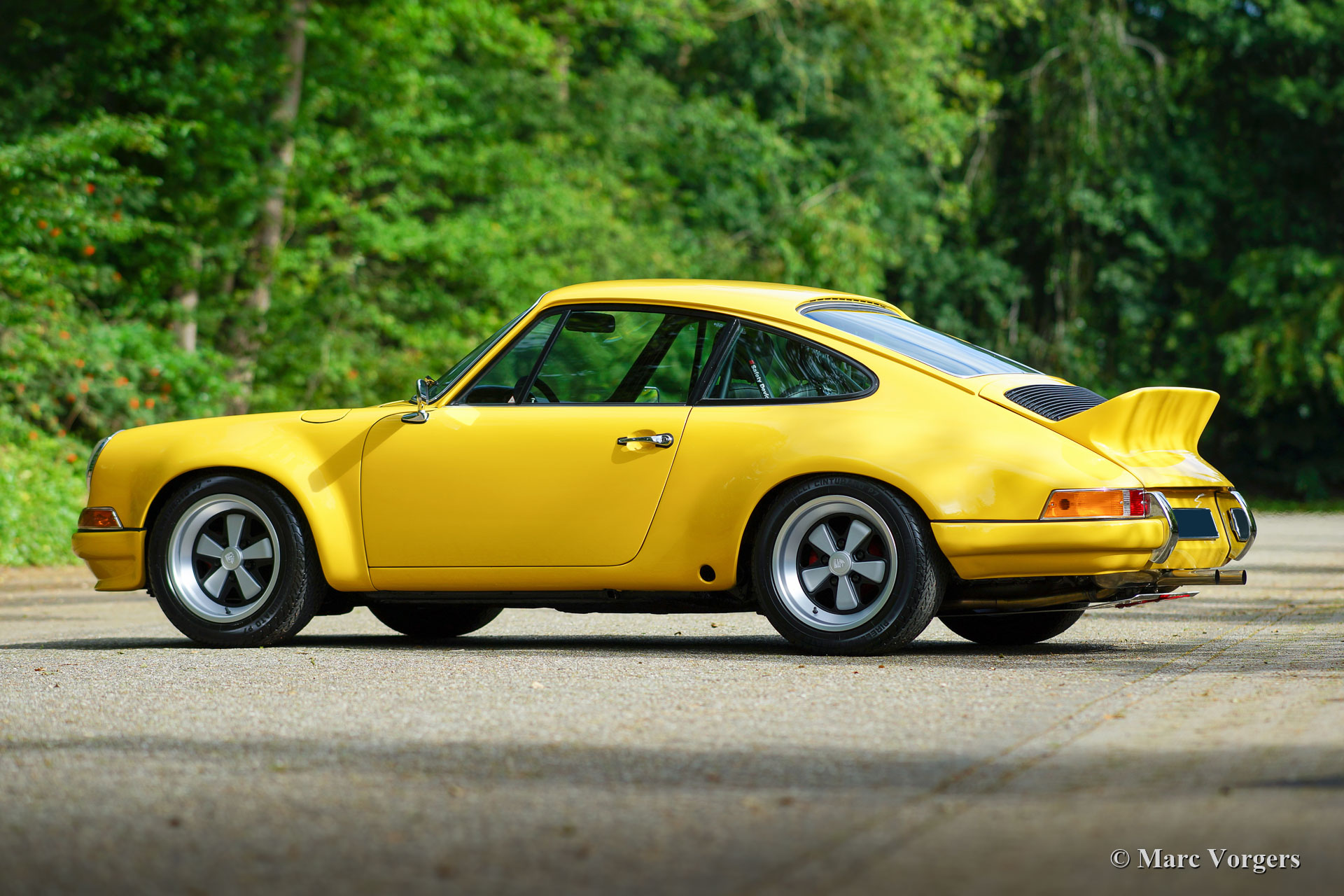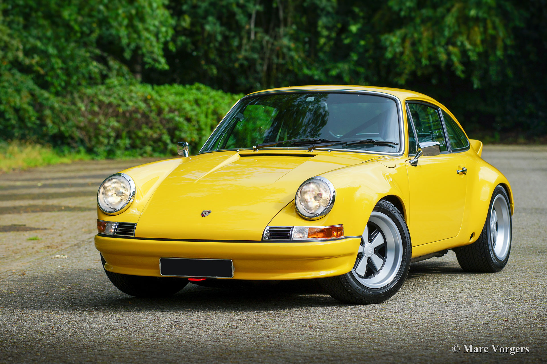 This fantastic Porsche 911 is being modified to Porsche 911 ST body specifications. The Porsche 911 ST is one of the rarest 911’s, only 24 were built for racing in 1970 and 1971. The 911 ST race cars were successfully raced on circuits around the globe and on Le Mans. This Porsche 911 is being modified to ST specifications for a client. The front and the rear wings have already been widened and the sunroof has been closed. As you can see in the photos, the sheet metal work was already carried out. After that the bodywork and panels were primed, smoothened and painted 'Minardi' yellow. Now the car is completed and looking fantastic! Everything looks perfectly brand new and the car drives and sounds superbly! This fine Porsche 911 ST is fitted with wide reproduction Fuchs alloy wheels. The 2.4 Litre S engine was fully rebuilt by Classic Job. Click here.