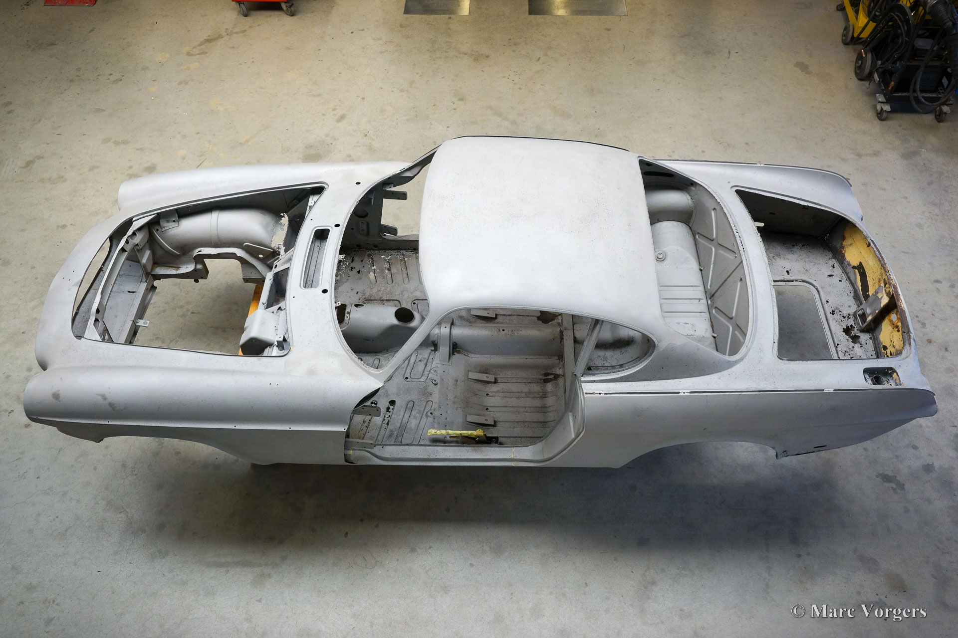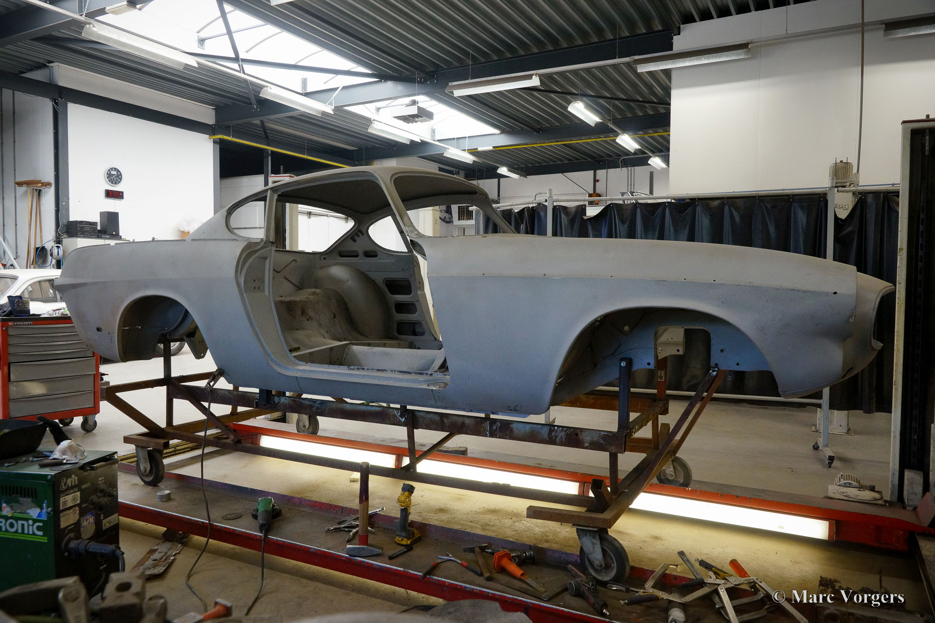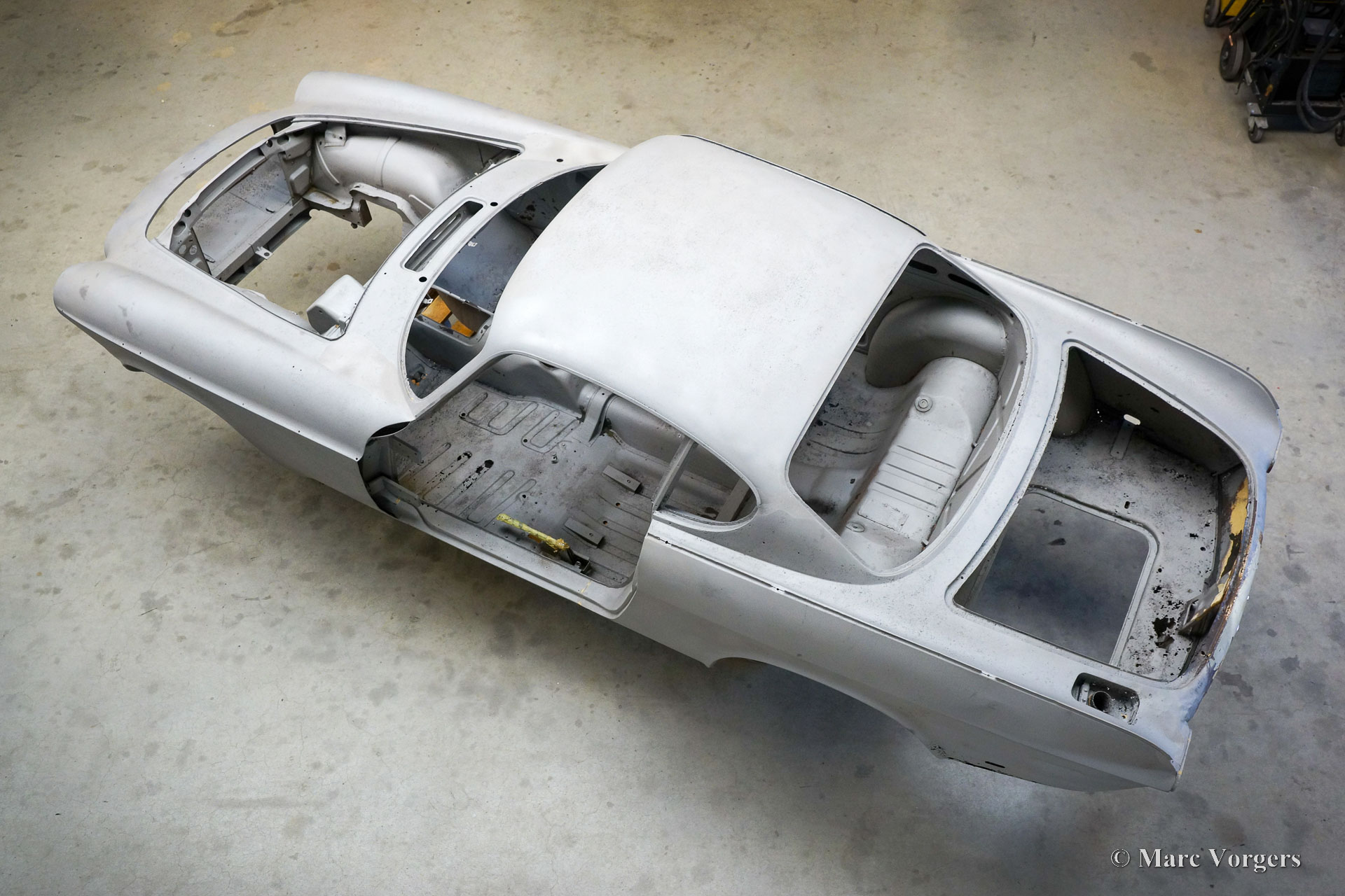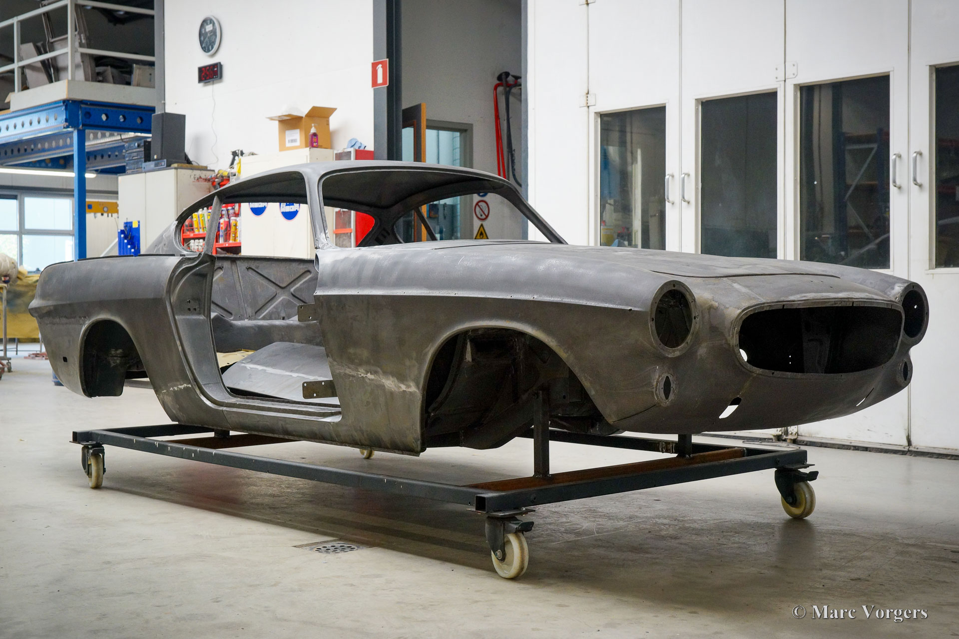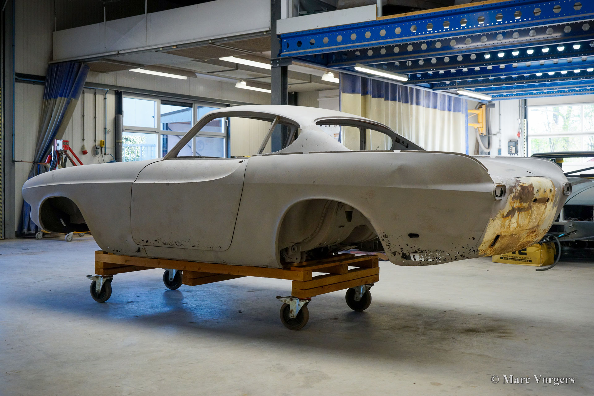 This Volvo P1800 Jensen bodywork was delivered to the workshop of Classic Job for restoration. The car was sold new in the USA. The Volvo P1800 Jensen is a very rare Volvo, only 6000 examples were built from 1960 until 1963. From 1963 the production was moved from the UK to Sweden and the car was named Volvo 1800 S (Sverige). After the last owner no longer saw any use for the P1800 many decades ago, the car was left alone in an unfriendly and moist environment for many years. The metal of the bodywork shows the typical rust of dilapidation under the open sky attacked by rain, sun, and heat. The surface of the metal shows spots everywhere, and places where water got trapped are rusted through. As you can see in the photo report, much of the sheet metal from the waist down was renewed. After the sheet metal job was done the body was dipped in a special bath to remove all dust and dirt. Then the bodywork was given a black KTL coating (E-coat) in a special electrostatic paint bath process in where a special primer covers all the surfaces and seams of the metal bodywork in a corrosion proof base coating. This coating also finds its way to all the hollow spaces of the bodywork which can not be reached with standard painting processes. With the KTL coating applied the outside of the body was given a layer of epoxy spray putty. The putty will be sanded down to smoothen out the remaining tiny spots. The next steps will be smoothening of the entire bodywork, the application of primer, and the final paintwork.