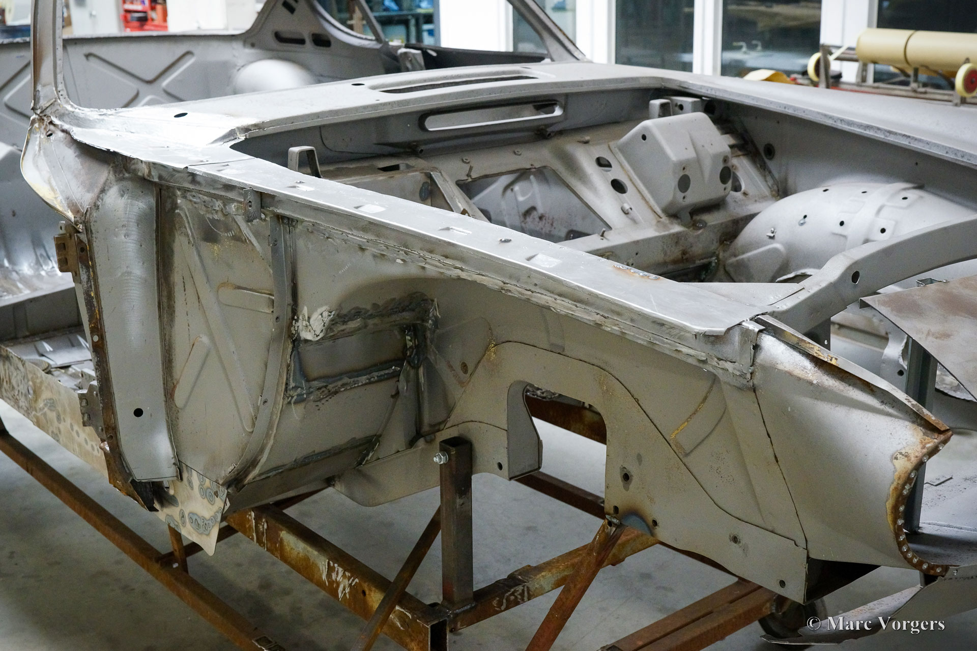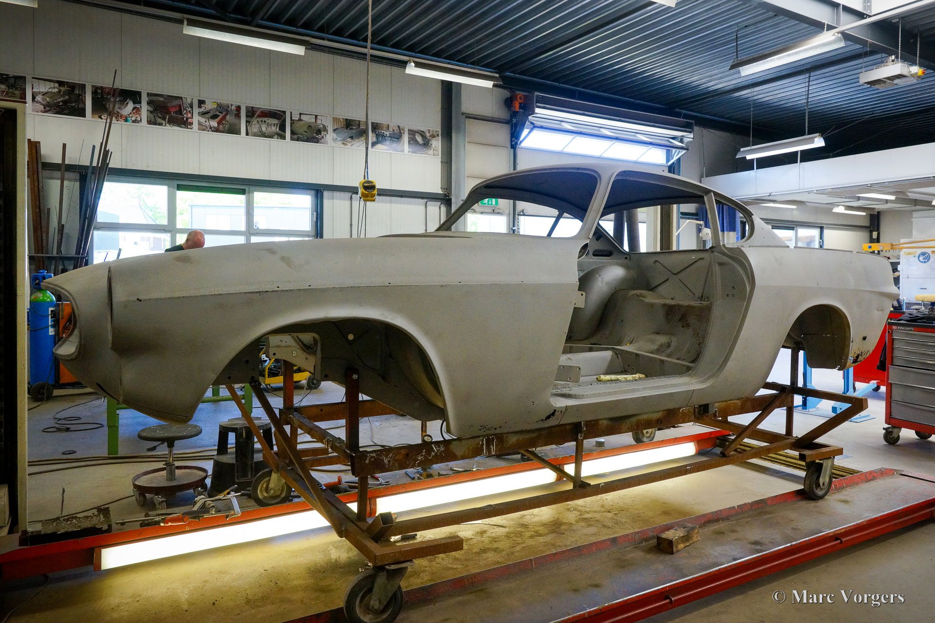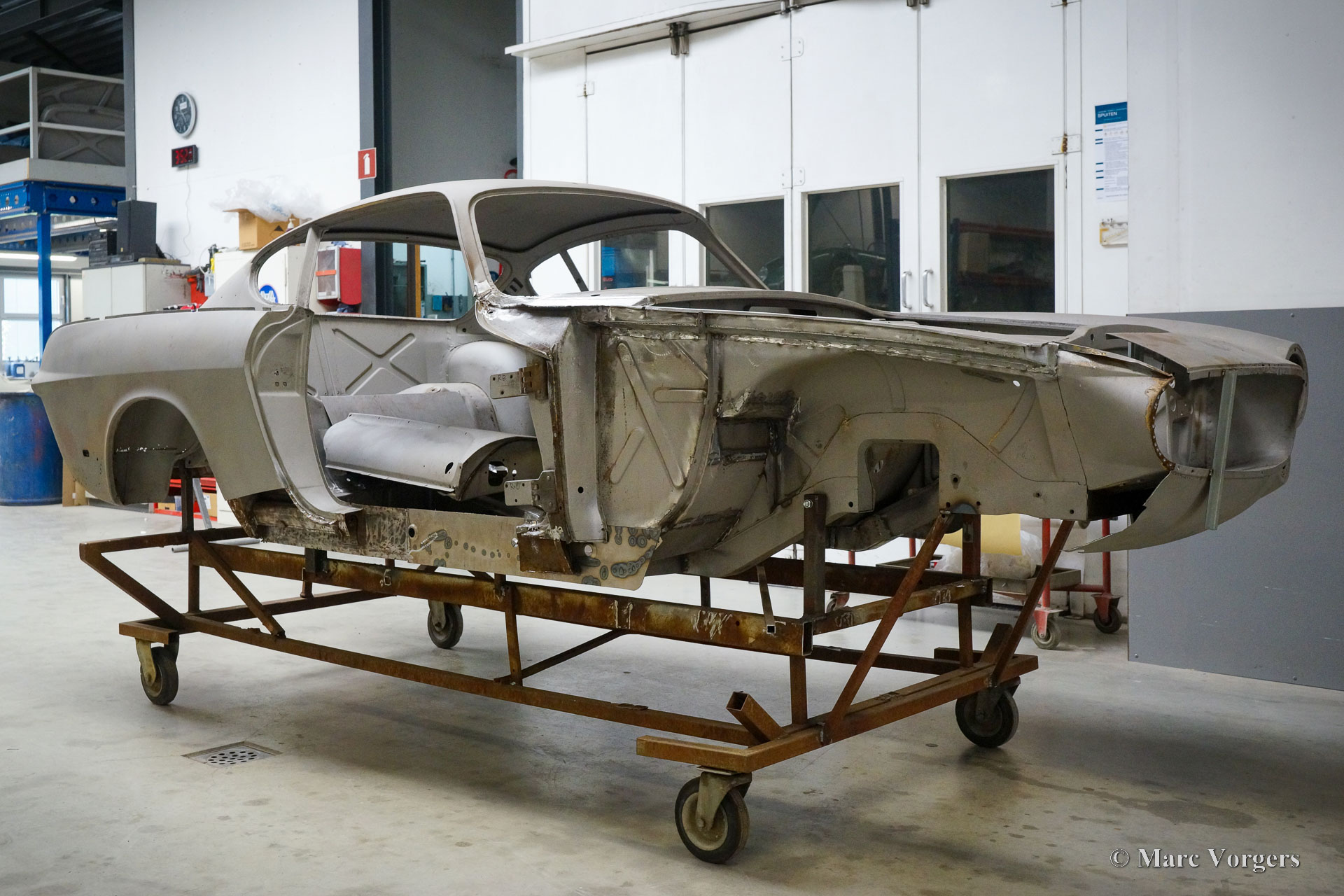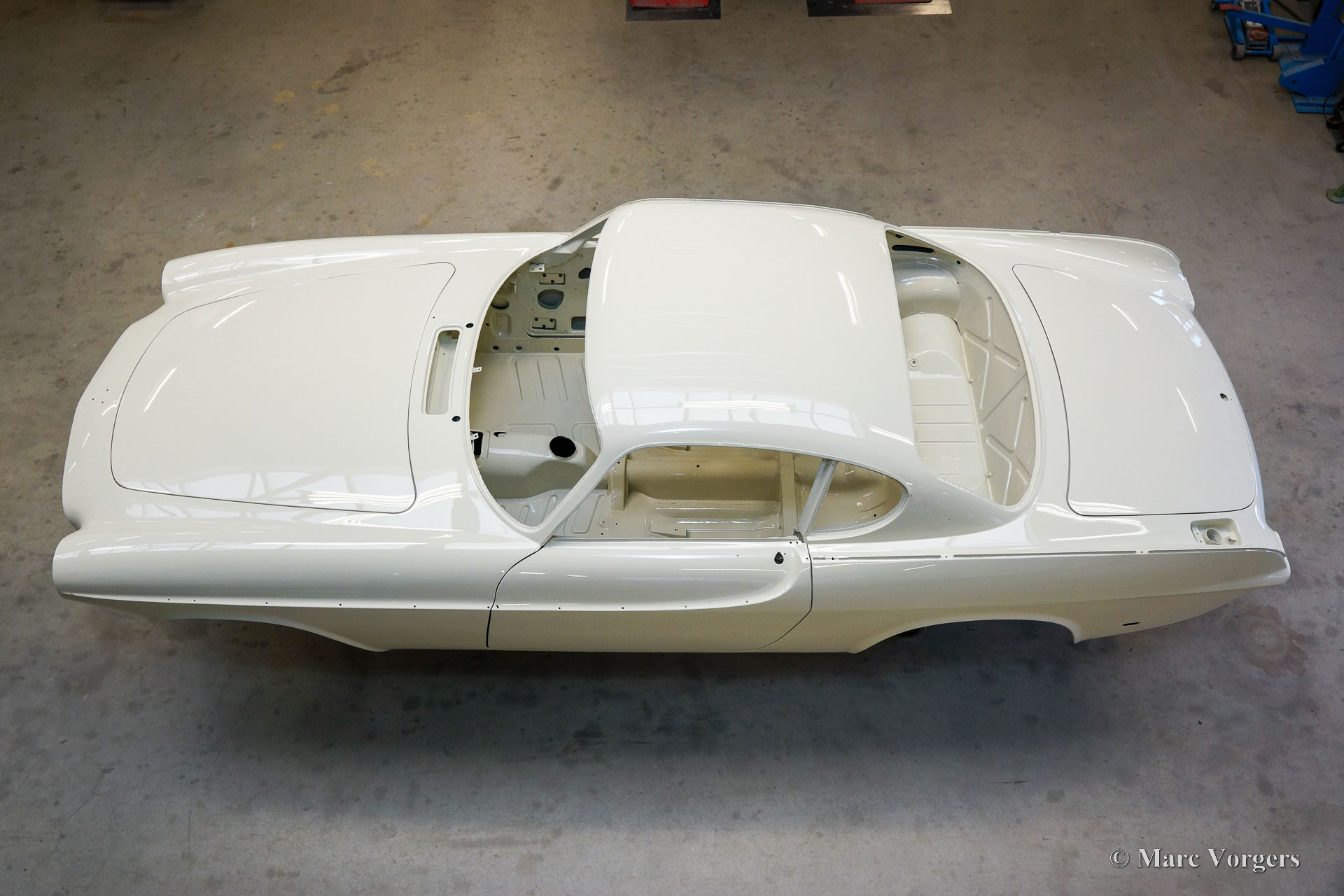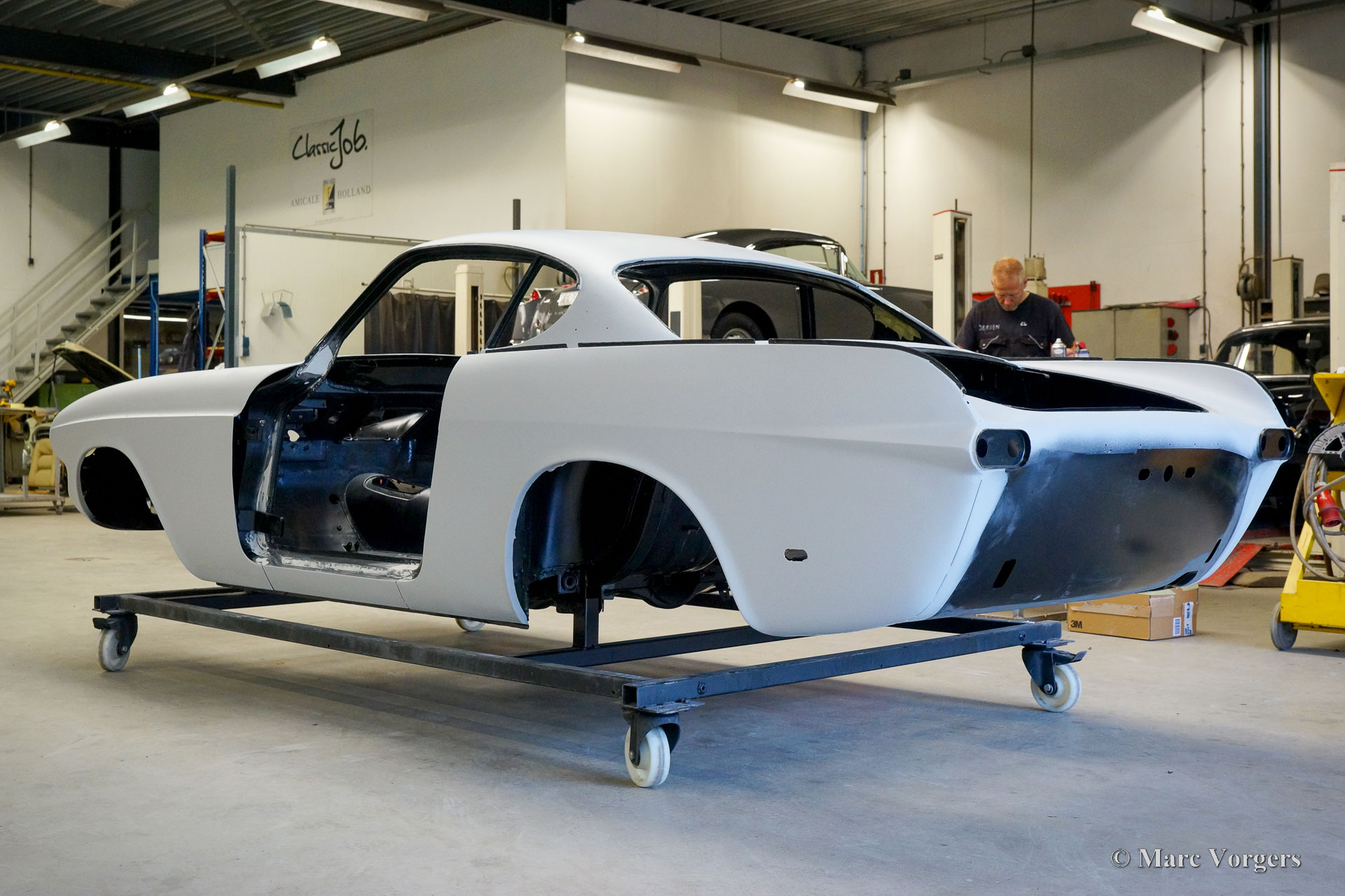 This Volvo P1800 Jensen bodywork was delivered to the workshop of Classic Job for restoration. The car was sold new in the USA. The Volvo P1800 Jensen is a very rare Volvo, only 6000 examples were built from 1960 until 1963. From 1963 the production was moved from the UK to Sweden and the car was named Volvo 1800 S (Sverige). After the last owner no longer saw any use for the P1800 many decades ago, the car was left alone in an unfriendly and moist environment for many years. The metal of the bodywork shows the typical rust of dilapidation under the open sky attacked by rain, sun, and heat. The surface of the metal shows spots everywhere, and places where water got trapped are rusted through. As you can see in the photo report, much of the sheet metal from the waist down was renewed. After the sheet metal job was done the body was dipped in a special bath to remove all dust and dirt. Then the bodywork was given a black KTL coating (E-coat) in a special electrostatic paint bath process in where a special primer covers all the surfaces and seams of the metal bodywork in a corrosion proof base coating. This coating also finds its way to all the hollow spaces of the bodywork which can not be reached with standard painting processes. With the KTL coating applied the outside of the body was given a layer of epoxy spray putty. The putty will be sanded down to smoothen out the remaining tiny spots. The next steps will be smoothening of the entire bodywork, the application of primer, and the final paintwork.