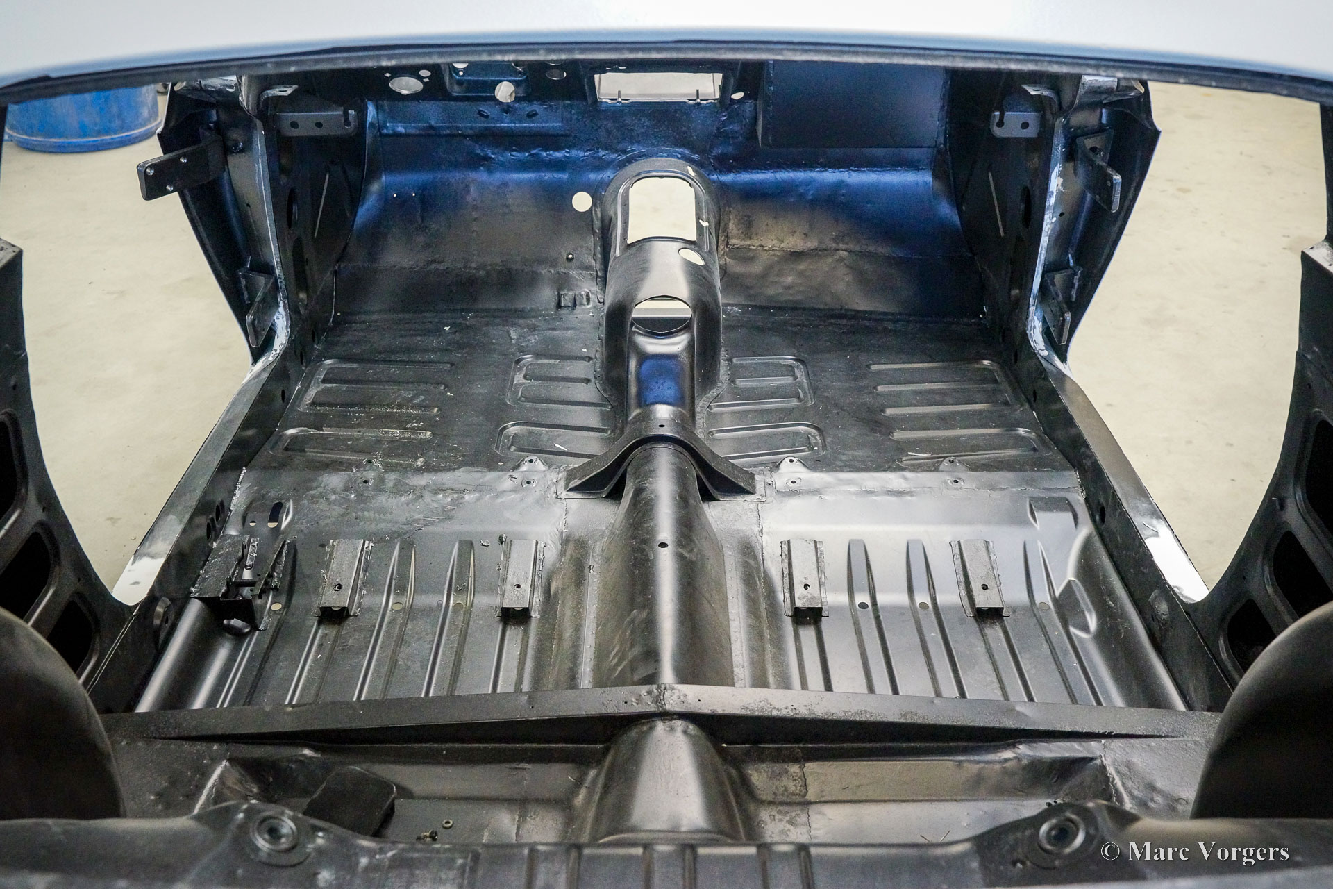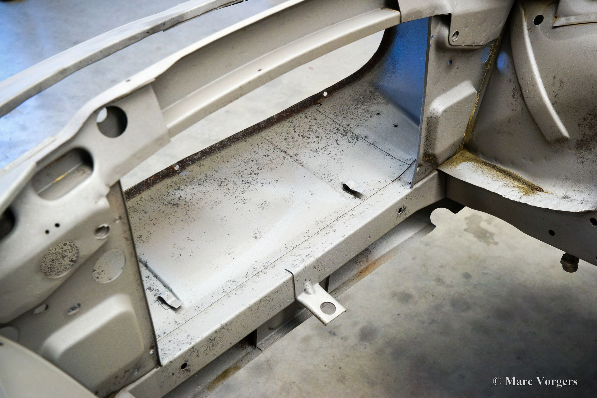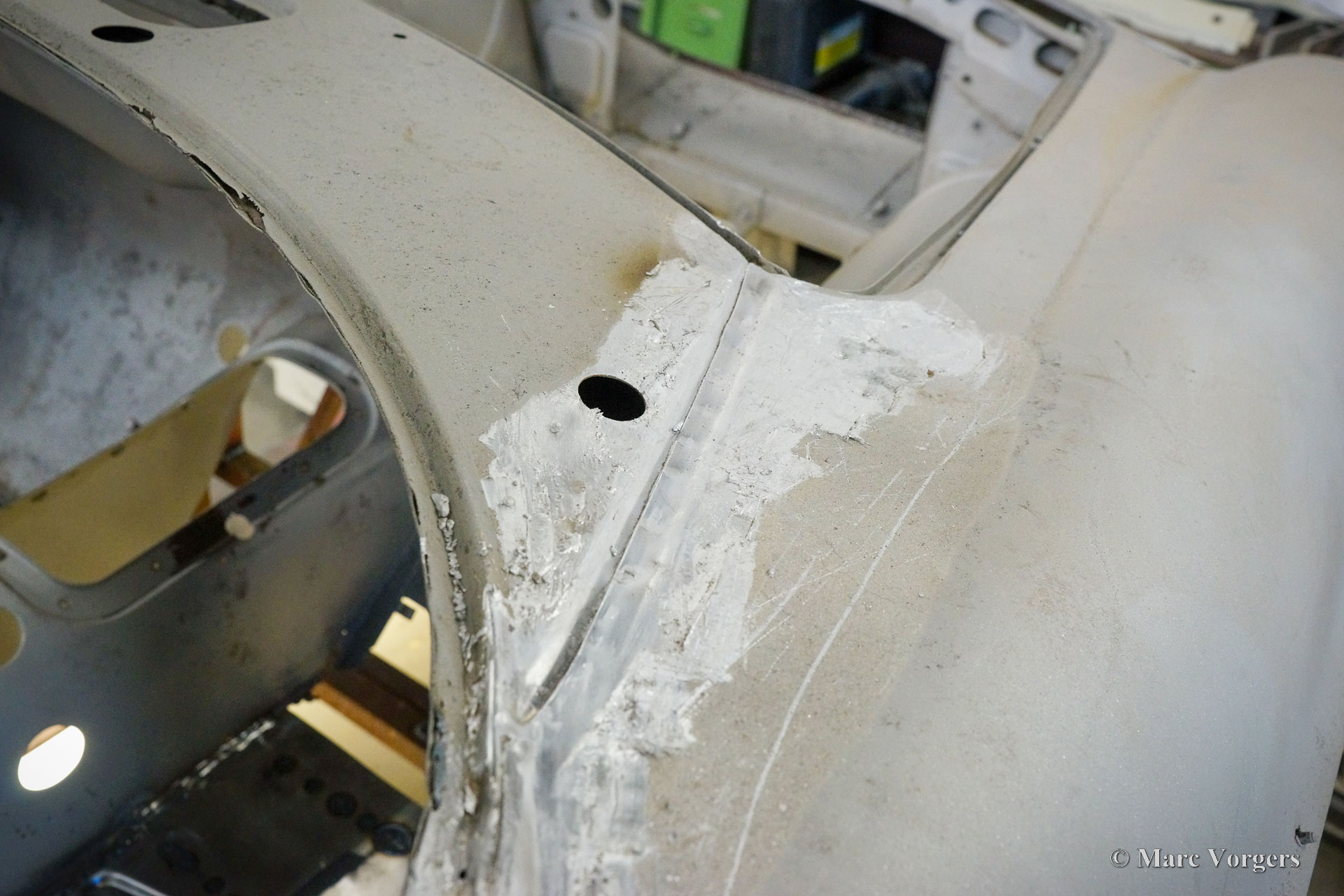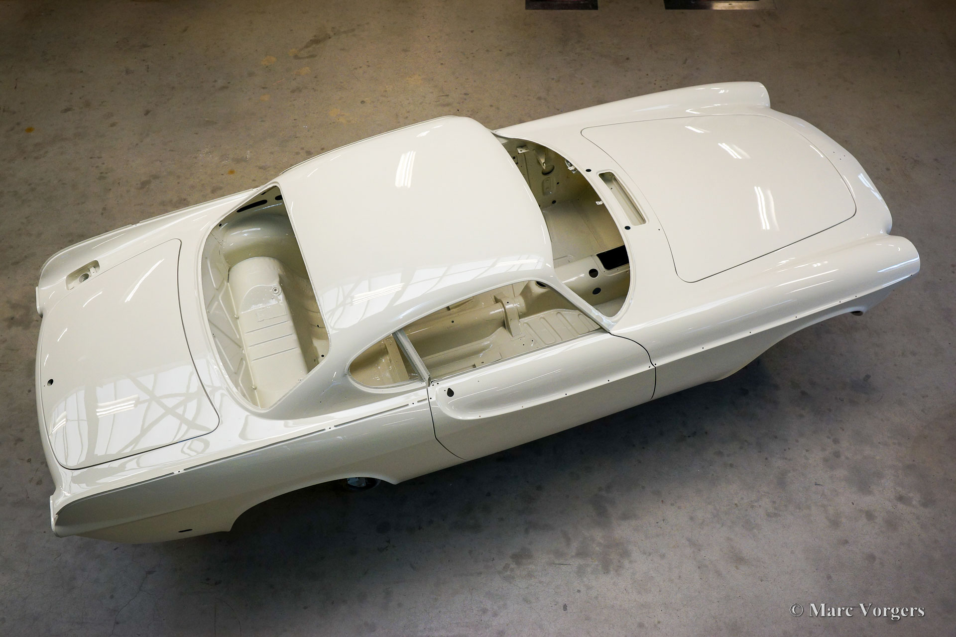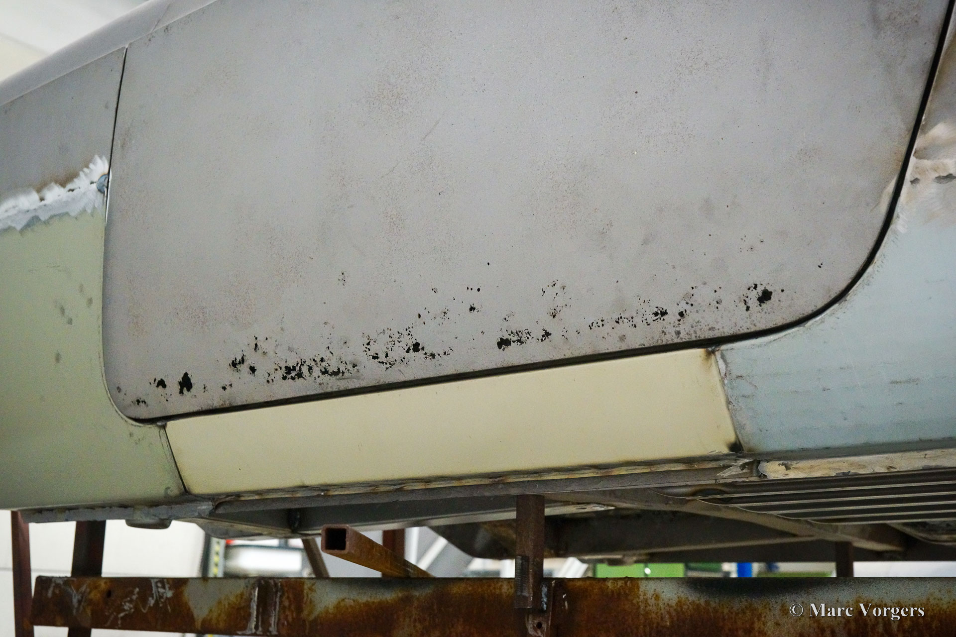 This Volvo P1800 Jensen bodywork was delivered to the workshop of Classic Job for restoration. The car was sold new in the USA. The Volvo P1800 Jensen is a very rare Volvo, only 6000 examples were built from 1960 until 1963. From 1963 the production was moved from the UK to Sweden and the car was named Volvo 1800 S (Sverige). After the last owner no longer saw any use for the P1800 many decades ago, the car was left alone in an unfriendly and moist environment for many years. The metal of the bodywork shows the typical rust of dilapidation under the open sky attacked by rain, sun, and heat. The surface of the metal shows spots everywhere, and places where water got trapped are rusted through. As you can see in the photo report, much of the sheet metal from the waist down was renewed. After the sheet metal job was done the body was dipped in a special bath to remove all dust and dirt. Then the bodywork was given a black KTL coating (E-coat) in a special electrostatic paint bath process in where a special primer covers all the surfaces and seams of the metal bodywork in a corrosion proof base coating. This coating also finds its way to all the hollow spaces of the bodywork which can not be reached with standard painting processes. With the KTL coating applied the outside of the body was given a layer of epoxy spray putty. The putty will be sanded down to smoothen out the remaining tiny spots. The next steps will be smoothening of the entire bodywork, the application of primer, and the final paintwork.
