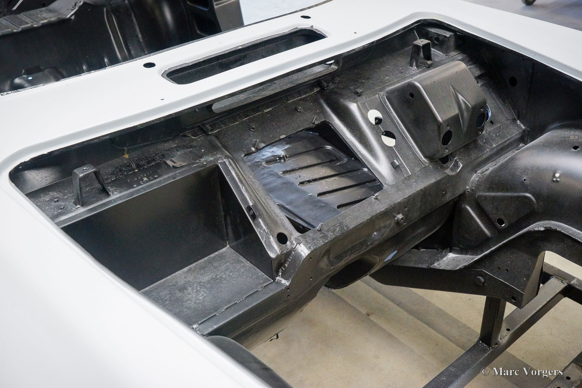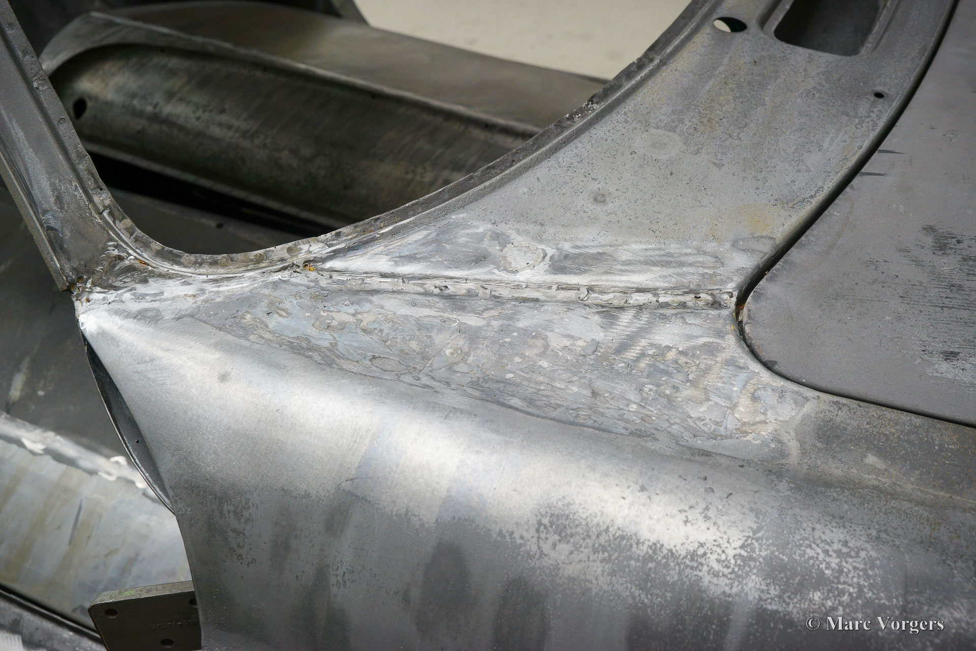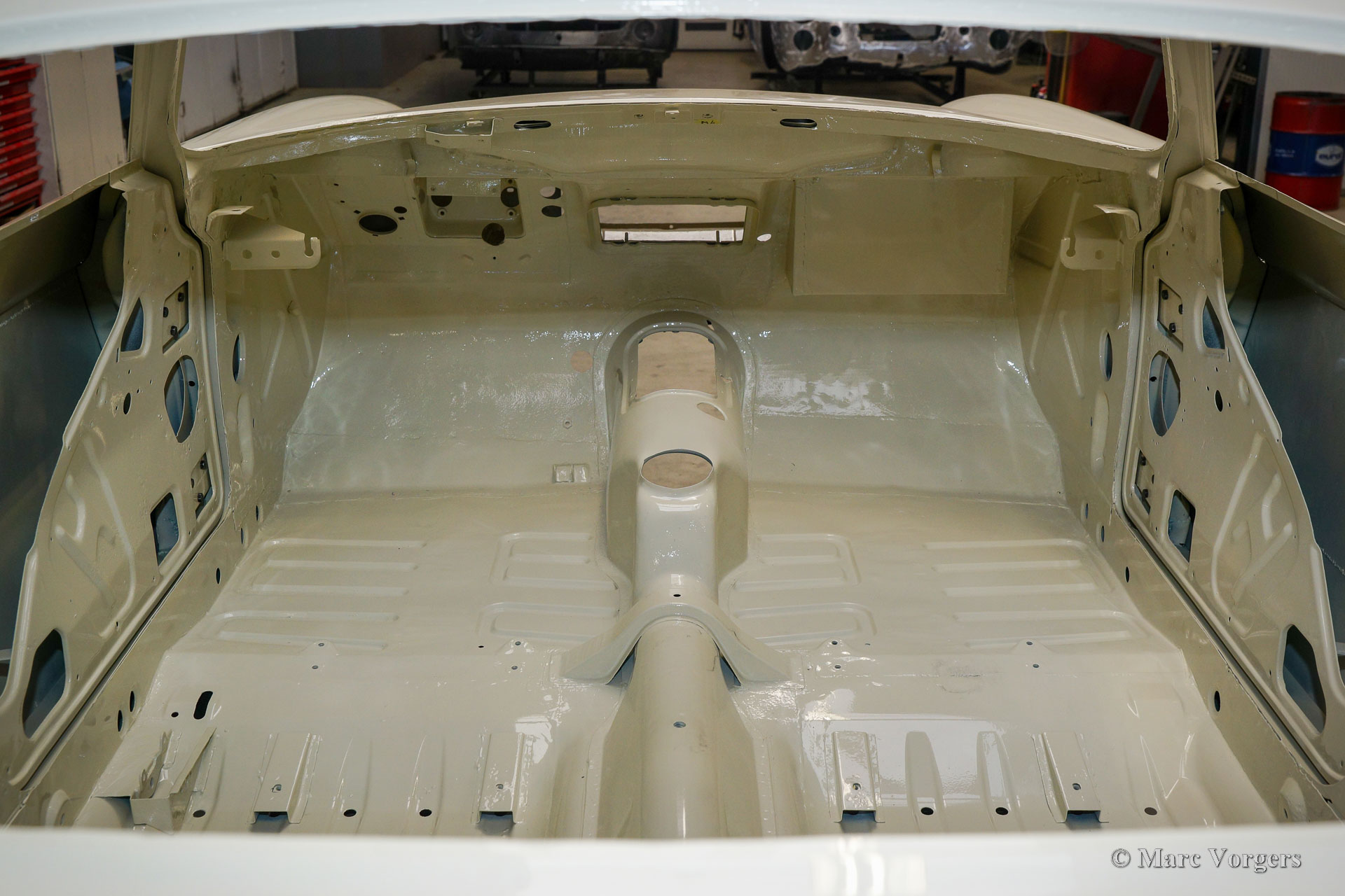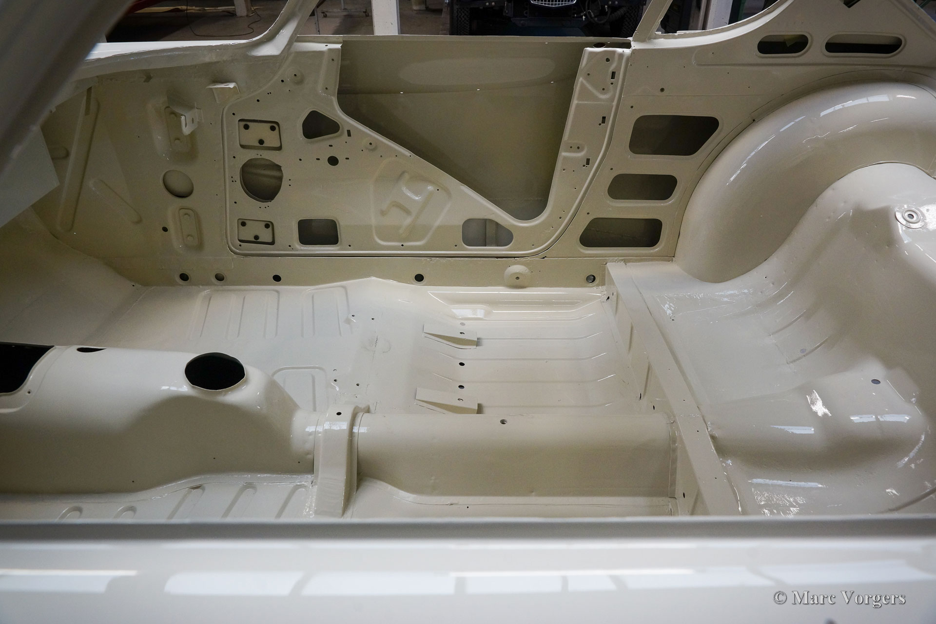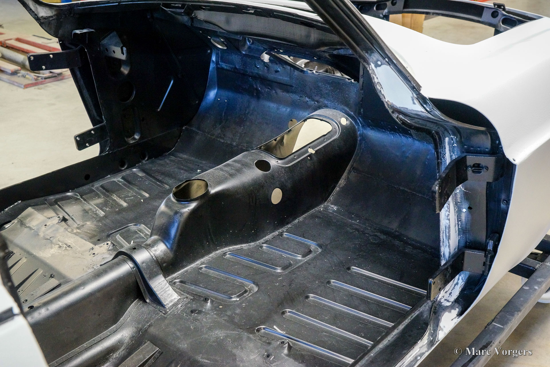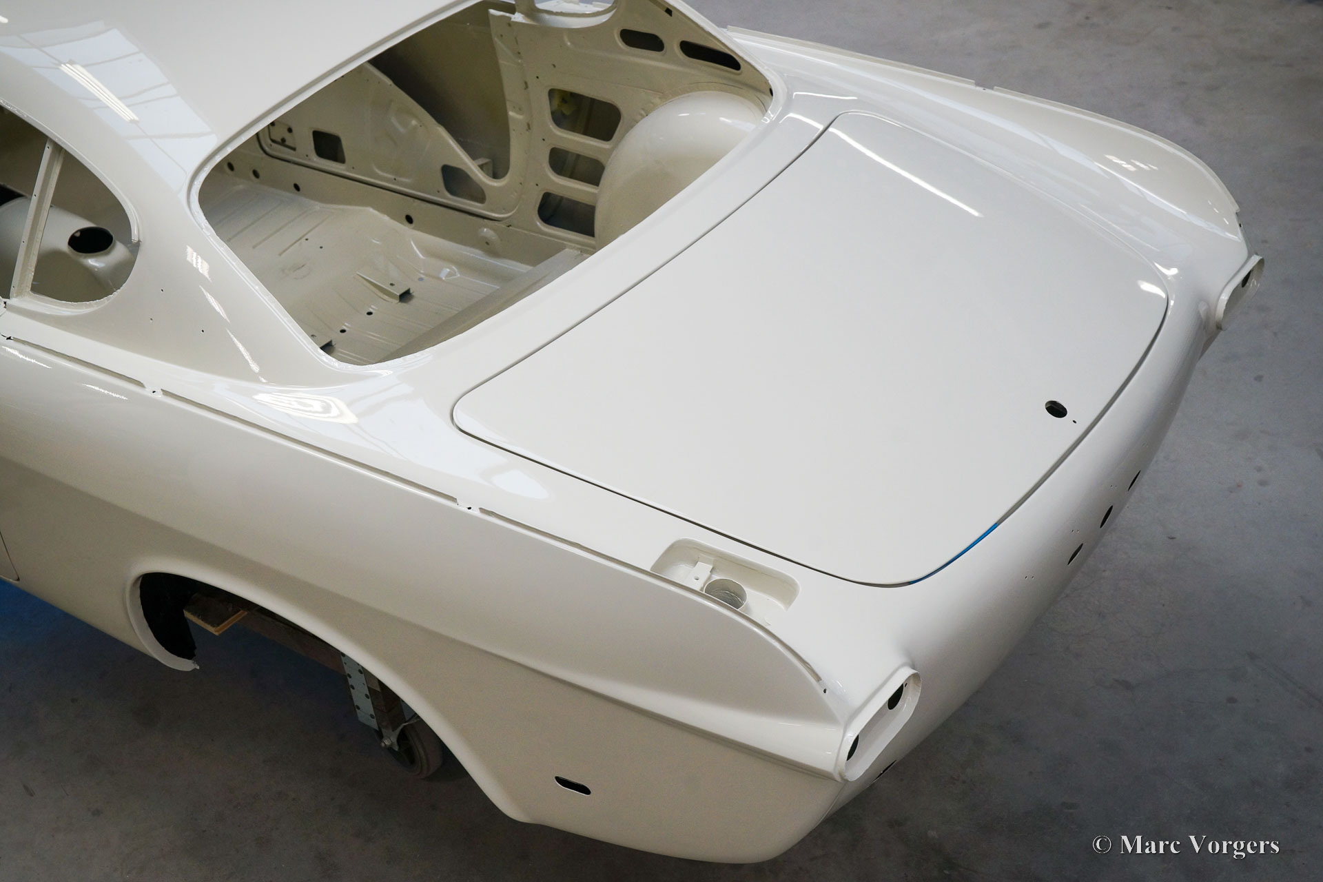 This Volvo P1800 Jensen bodywork was delivered to the workshop of Classic Job for restoration. The car was sold new in the USA. The Volvo P1800 Jensen is a very rare Volvo, only 6000 examples were built from 1960 until 1963. From 1963 the production was moved from the UK to Sweden and the car was named Volvo 1800 S (Sverige). After the last owner no longer saw any use for the P1800 many decades ago, the car was left alone in an unfriendly and moist environment for many years. The metal of the bodywork shows the typical rust of dilapidation under the open sky attacked by rain, sun, and heat. The surface of the metal shows spots everywhere, and places where water got trapped are rusted through. As you can see in the photo report, much of the sheet metal from the waist down was renewed. After the sheet metal job was done the body was dipped in a special bath to remove all dust and dirt. Then the bodywork was given a black KTL coating (E-coat) in a special electrostatic paint bath process in where a special primer covers all the surfaces and seams of the metal bodywork in a corrosion proof base coating. This coating also finds its way to all the hollow spaces of the bodywork which can not be reached with standard painting processes. With the KTL coating applied the outside of the body was given a layer of epoxy spray putty. The putty will be sanded down to smoothen out the remaining tiny spots. The next steps will be smoothening of the entire bodywork, the application of primer, and the final paintwork.