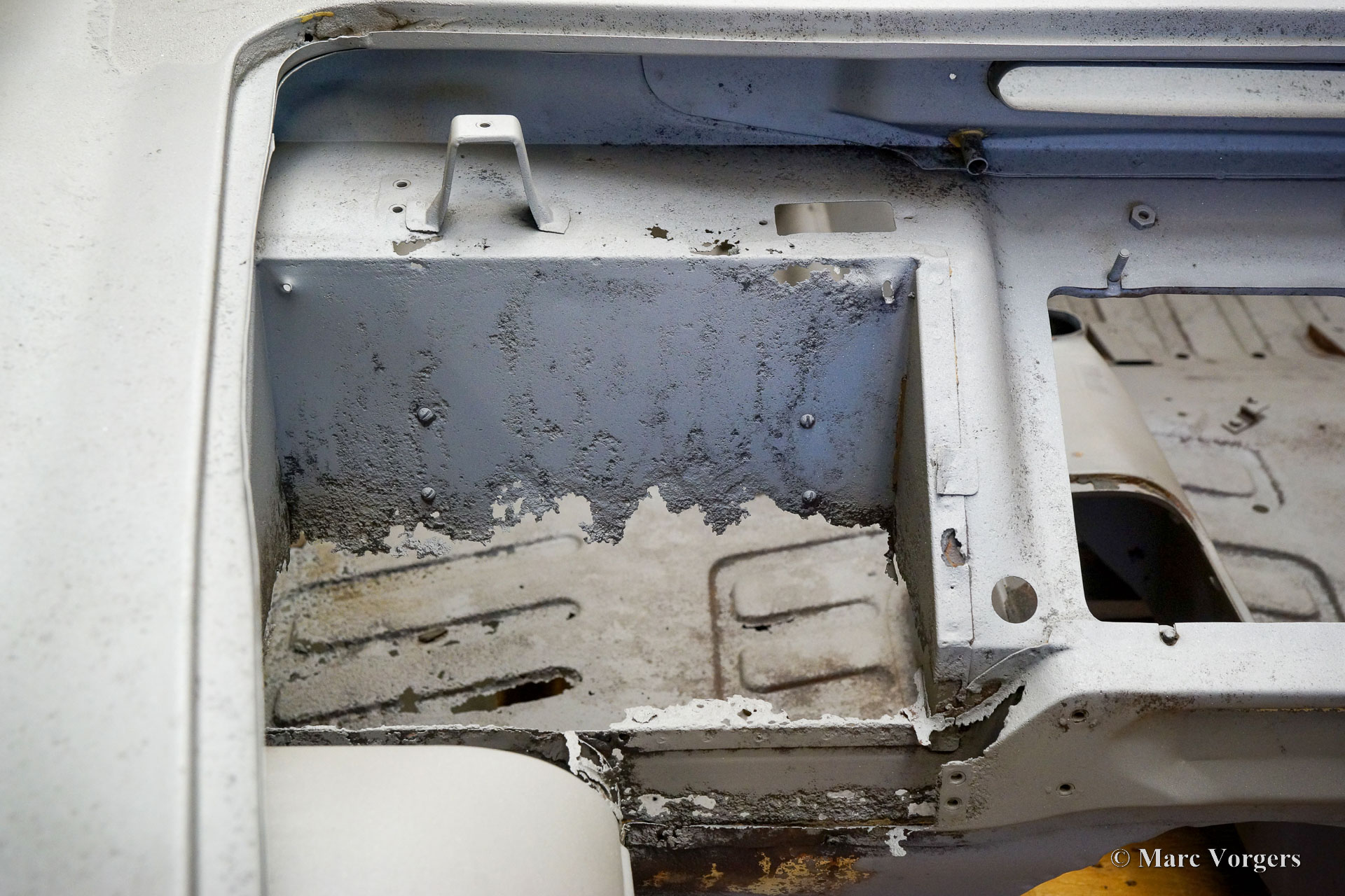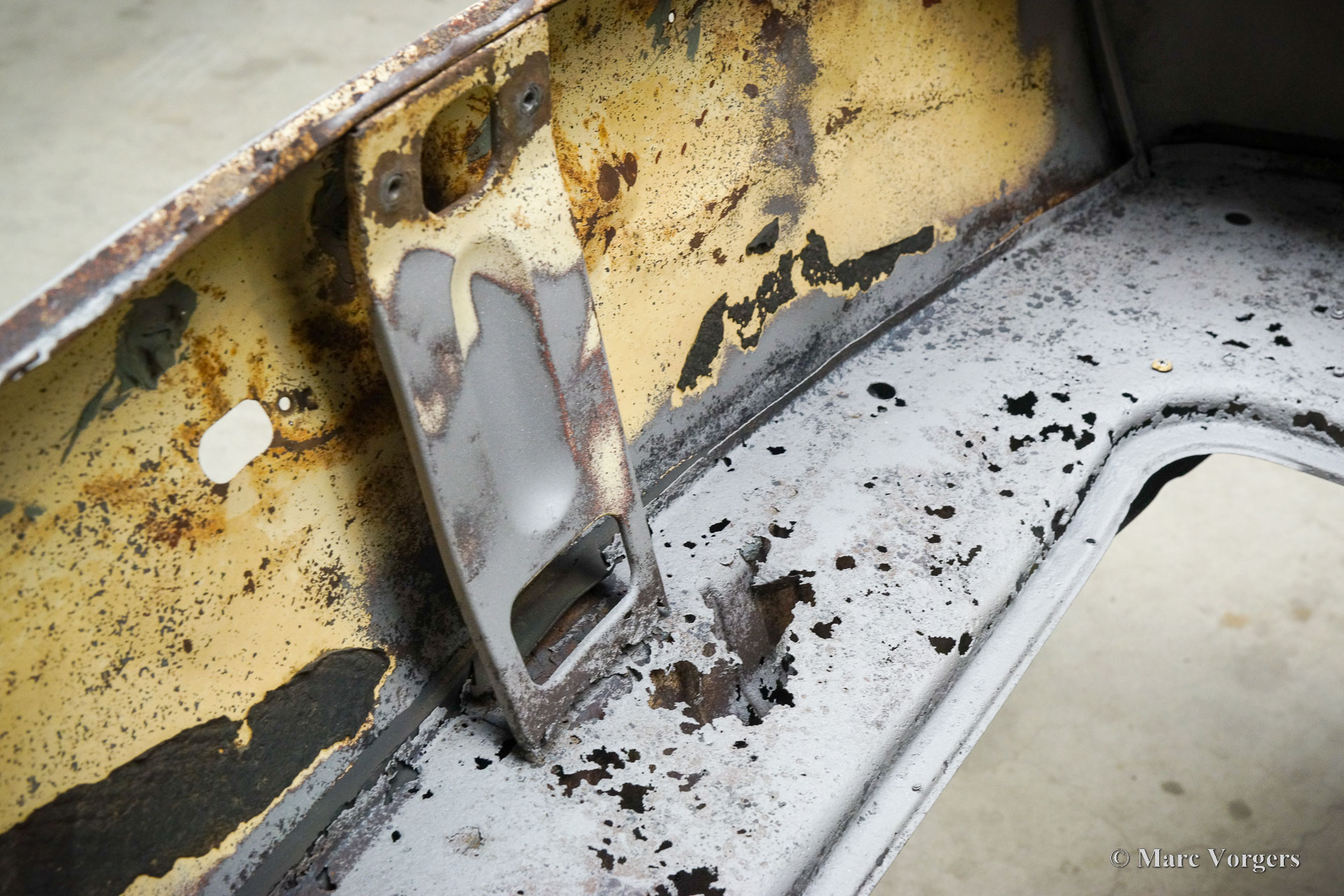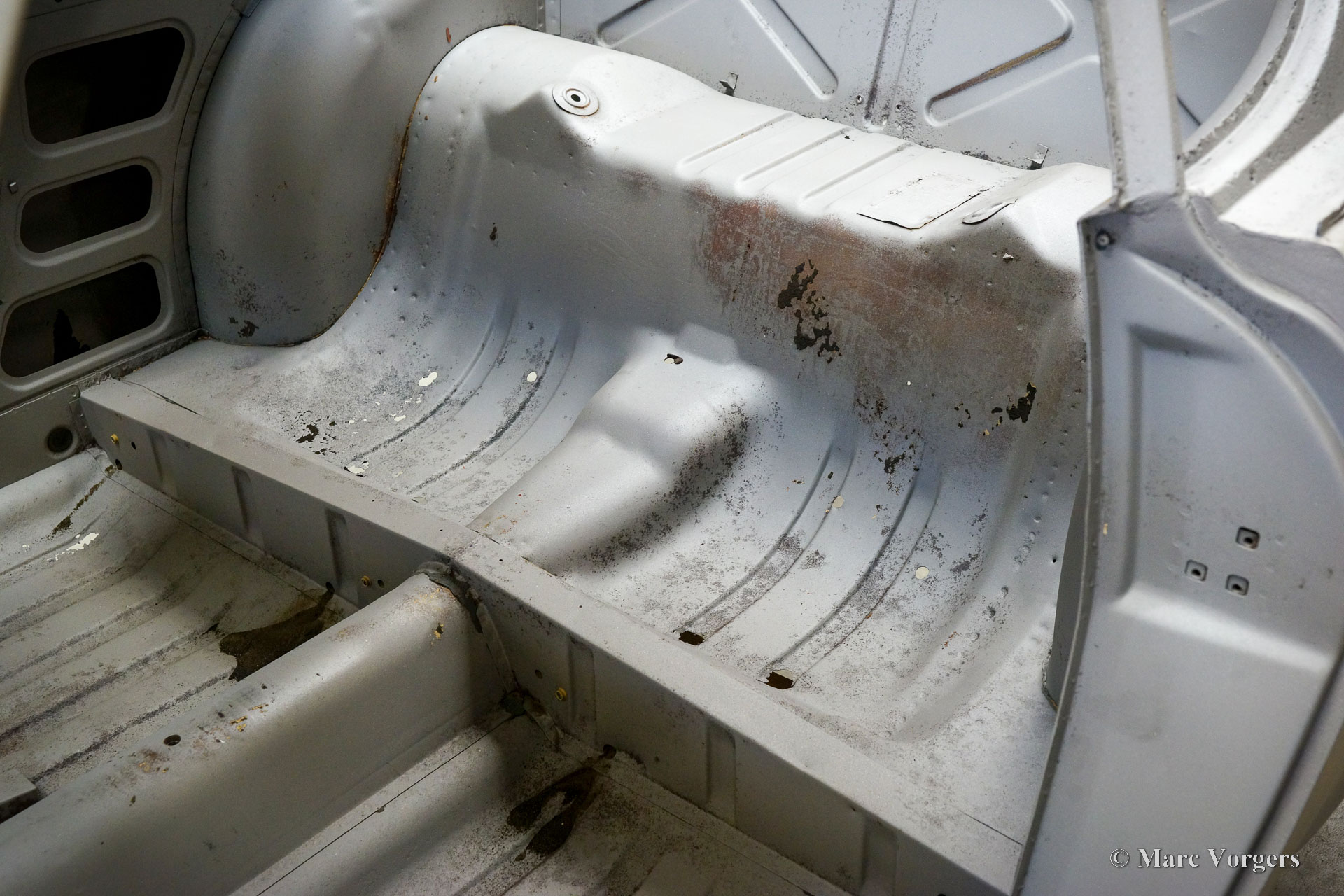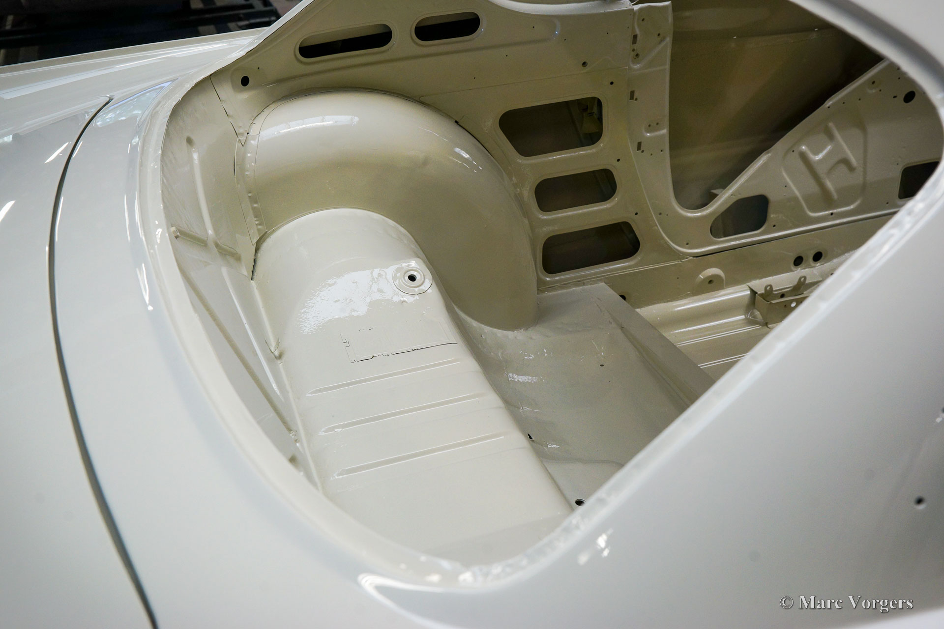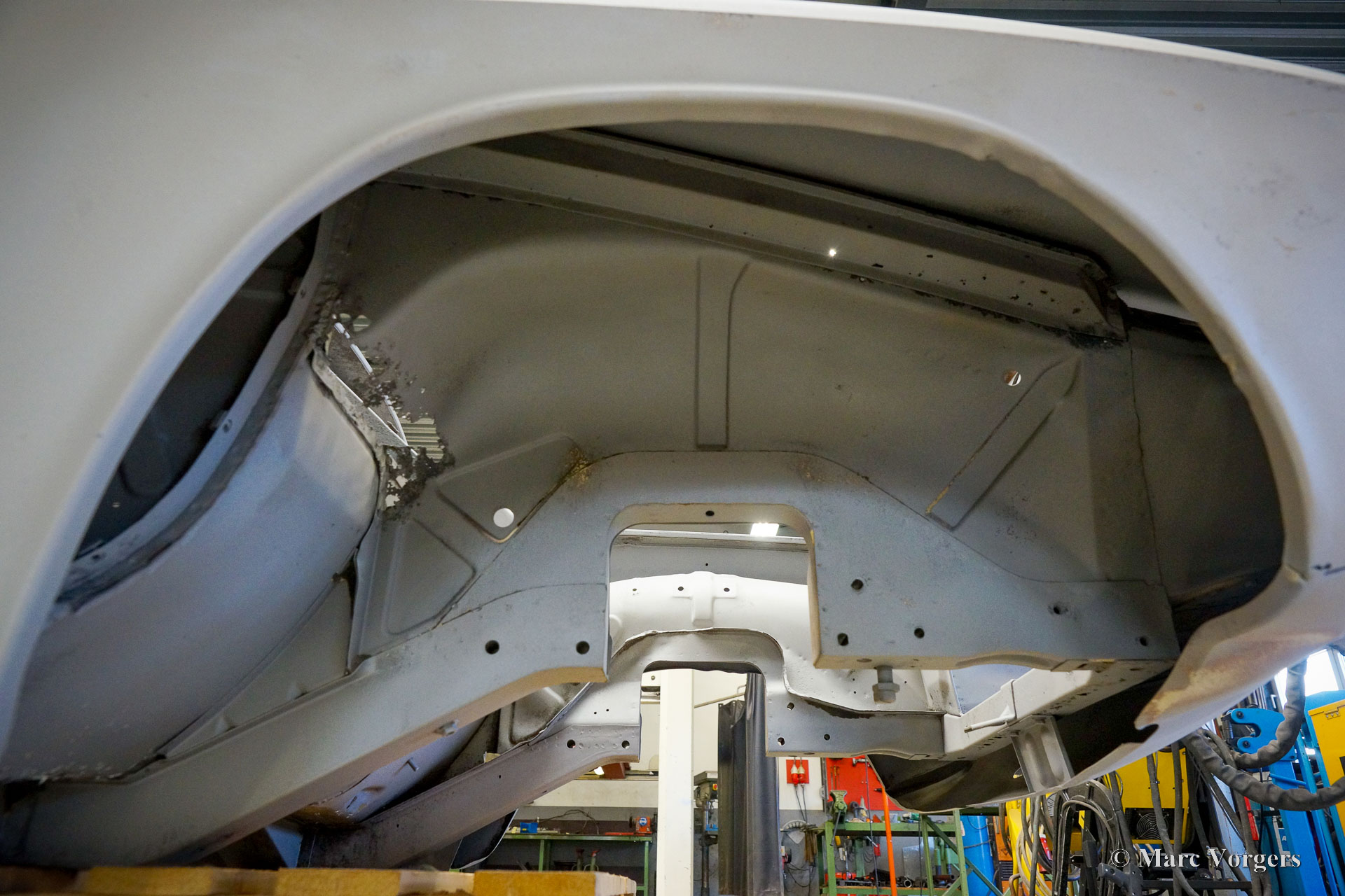 This Volvo P1800 Jensen bodywork was delivered to the workshop of Classic Job for restoration. The car was sold new in the USA. The Volvo P1800 Jensen is a very rare Volvo, only 6000 examples were built from 1960 until 1963. From 1963 the production was moved from the UK to Sweden and the car was named Volvo 1800 S (Sverige). After the last owner no longer saw any use for the P1800 many decades ago, the car was left alone in an unfriendly and moist environment for many years. The metal of the bodywork shows the typical rust of dilapidation under the open sky attacked by rain, sun, and heat. The surface of the metal shows spots everywhere, and places where water got trapped are rusted through. As you can see in the photo report, much of the sheet metal from the waist down was renewed. After the sheet metal job was done the body was dipped in a special bath to remove all dust and dirt. Then the bodywork was given a black KTL coating (E-coat) in a special electrostatic paint bath process in where a special primer covers all the surfaces and seams of the metal bodywork in a corrosion proof base coating. This coating also finds its way to all the hollow spaces of the bodywork which can not be reached with standard painting processes. With the KTL coating applied the outside of the body was given a layer of epoxy spray putty. The putty will be sanded down to smoothen out the remaining tiny spots. The next steps will be smoothening of the entire bodywork, the application of primer, and the final paintwork.