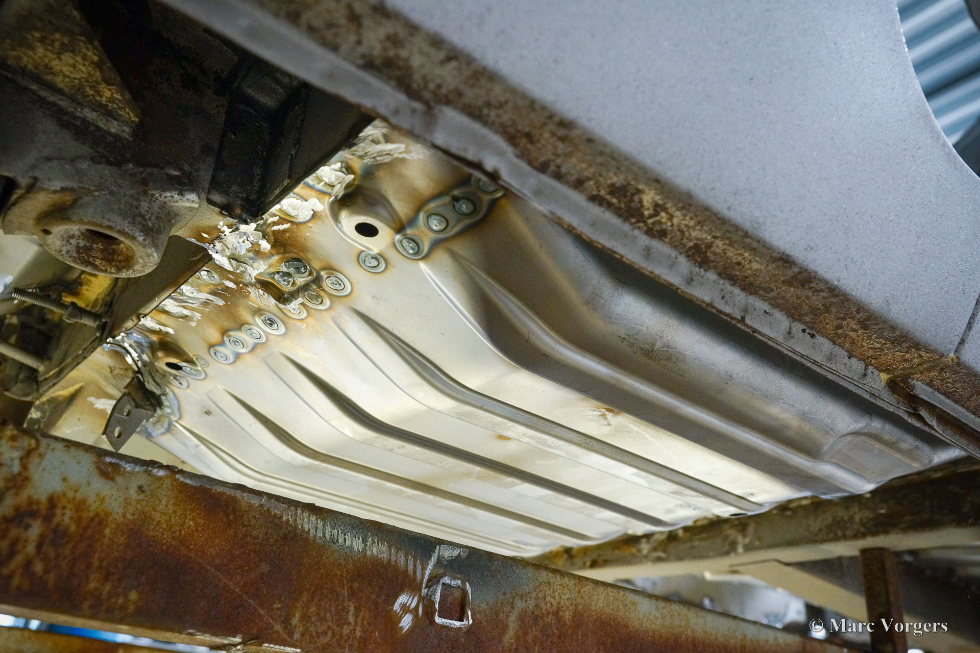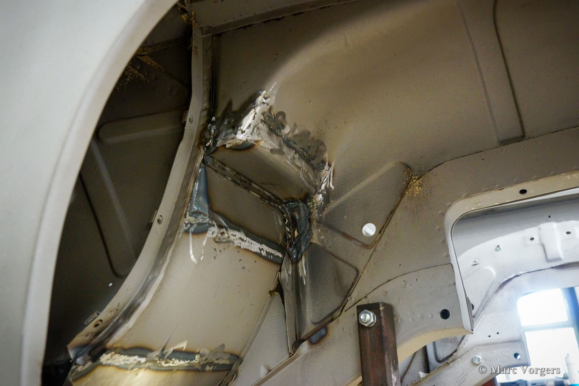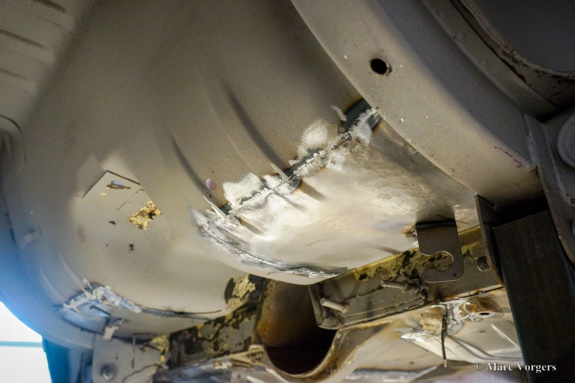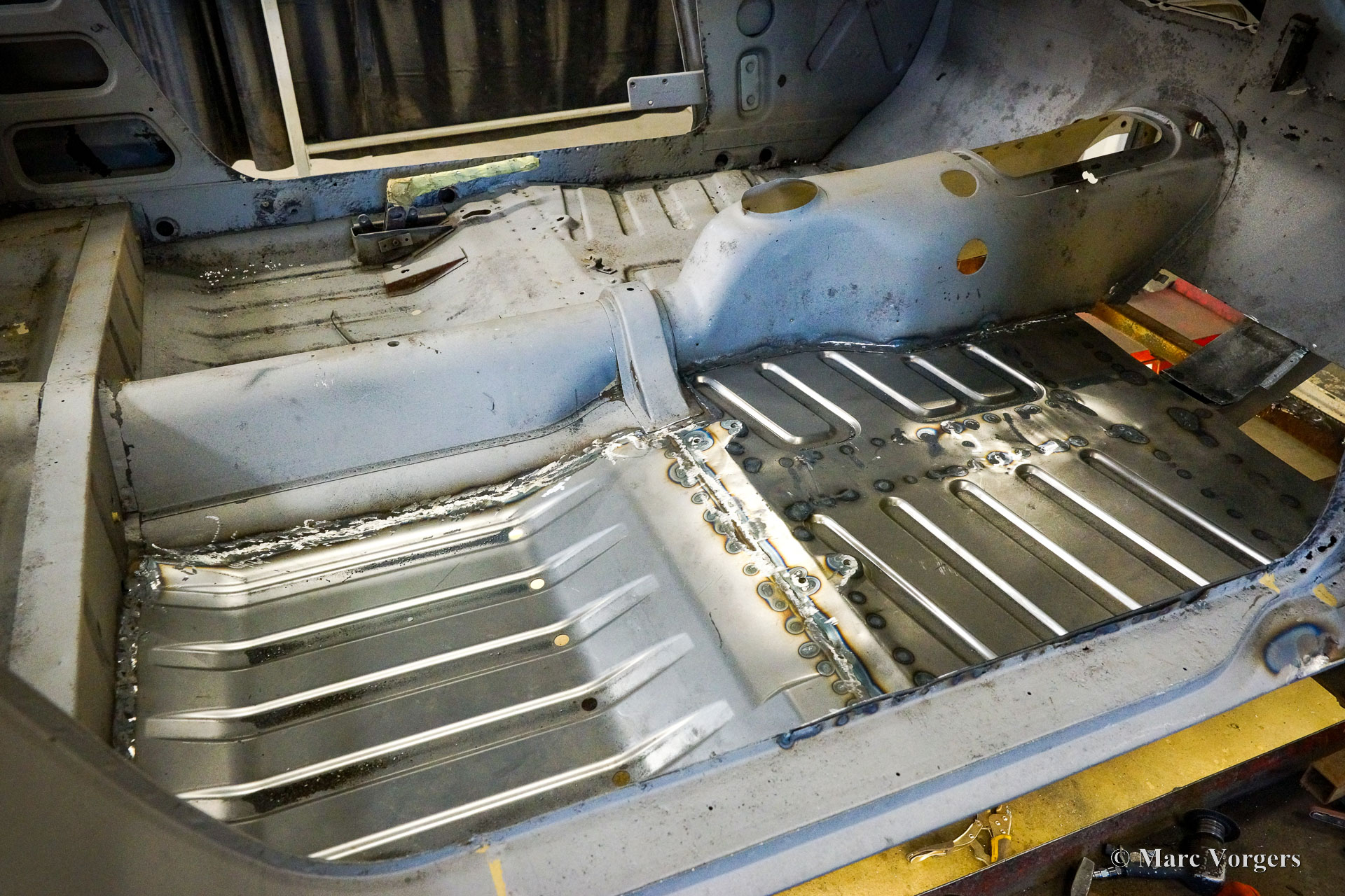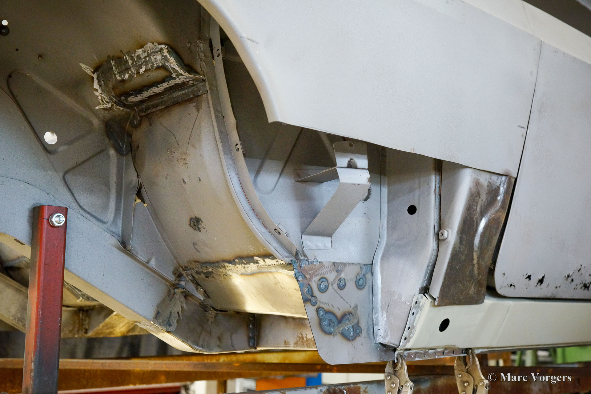 This Volvo P1800 Jensen bodywork was delivered to the workshop of Classic Job for restoration. The car was sold new in the USA. The Volvo P1800 Jensen is a very rare Volvo, only 6000 examples were built from 1960 until 1963. From 1963 the production was moved from the UK to Sweden and the car was named Volvo 1800 S (Sverige). After the last owner no longer saw any use for the P1800 many decades ago, the car was left alone in an unfriendly and moist environment for many years. The metal of the bodywork shows the typical rust of dilapidation under the open sky attacked by rain, sun, and heat. The surface of the metal shows spots everywhere, and places where water got trapped are rusted through. As you can see in the photo report, much of the sheet metal from the waist down was renewed. After the sheet metal job was done the body was dipped in a special bath to remove all dust and dirt. Then the bodywork was given a black KTL coating (E-coat) in a special electrostatic paint bath process in where a special primer covers all the surfaces and seams of the metal bodywork in a corrosion proof base coating. This coating also finds its way to all the hollow spaces of the bodywork which can not be reached with standard painting processes. With the KTL coating applied the outside of the body was given a layer of epoxy spray putty. The putty will be sanded down to smoothen out the remaining tiny spots. The next steps will be smoothening of the entire bodywork, the application of primer, and the final paintwork.