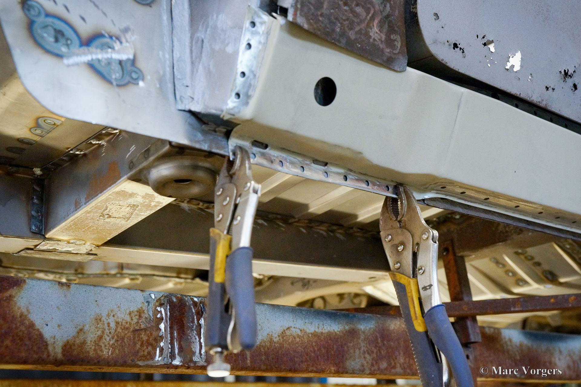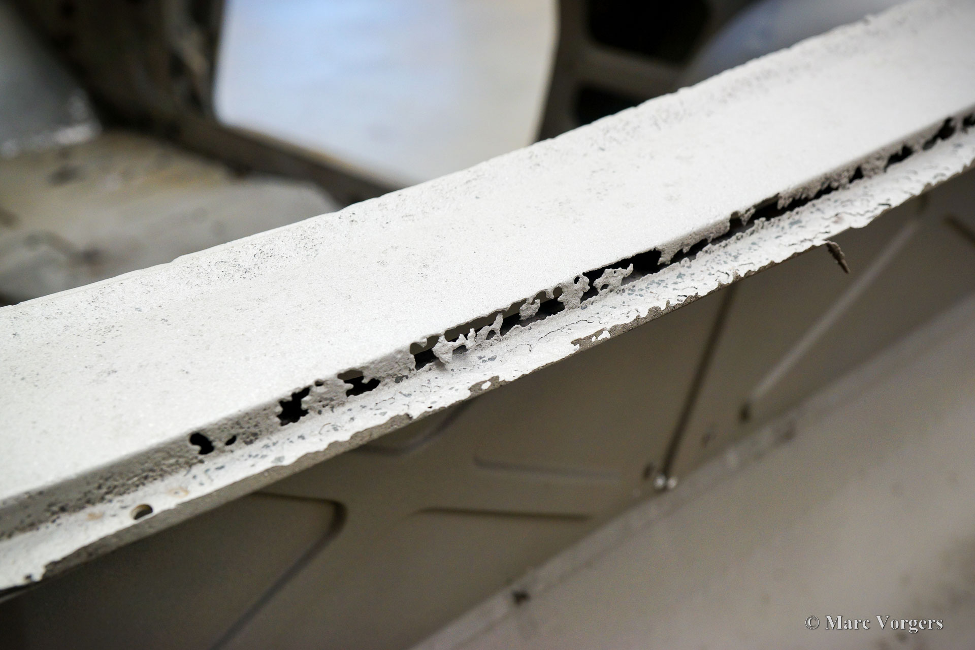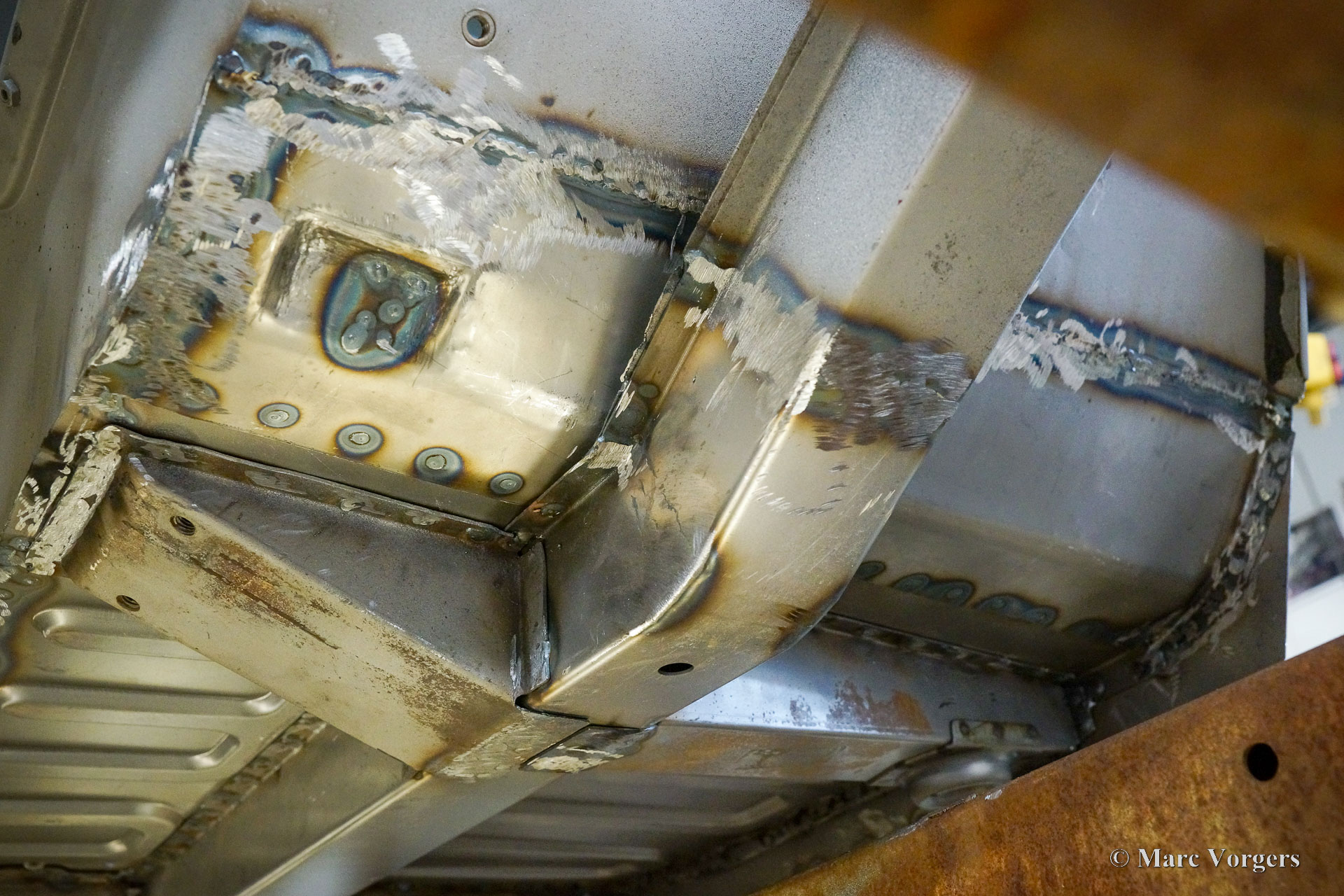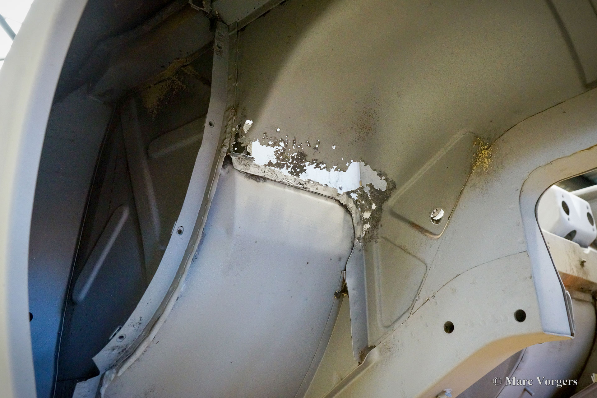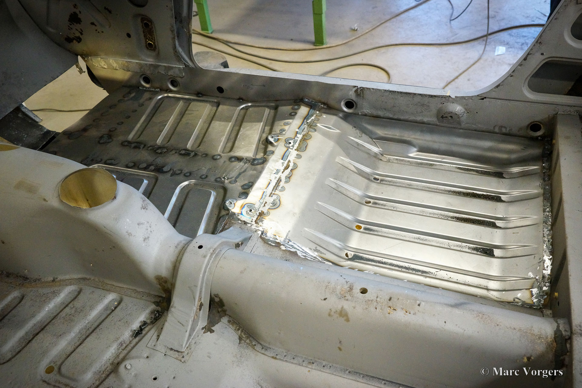 This Volvo P1800 Jensen bodywork was delivered to the workshop of Classic Job for restoration. The car was sold new in the USA. The Volvo P1800 Jensen is a very rare Volvo, only 6000 examples were built from 1960 until 1963. From 1963 the production was moved from the UK to Sweden and the car was named Volvo 1800 S (Sverige). After the last owner no longer saw any use for the P1800 many decades ago, the car was left alone in an unfriendly and moist environment for many years. The metal of the bodywork shows the typical rust of dilapidation under the open sky attacked by rain, sun, and heat. The surface of the metal shows spots everywhere, and places where water got trapped are rusted through. As you can see in the photo report, much of the sheet metal from the waist down was renewed. After the sheet metal job was done the body was dipped in a special bath to remove all dust and dirt. Then the bodywork was given a black KTL coating (E-coat) in a special electrostatic paint bath process in where a special primer covers all the surfaces and seams of the metal bodywork in a corrosion proof base coating. This coating also finds its way to all the hollow spaces of the bodywork which can not be reached with standard painting processes. With the KTL coating applied the outside of the body was given a layer of epoxy spray putty. The putty will be sanded down to smoothen out the remaining tiny spots. The next steps will be smoothening of the entire bodywork, the application of primer, and the final paintwork.