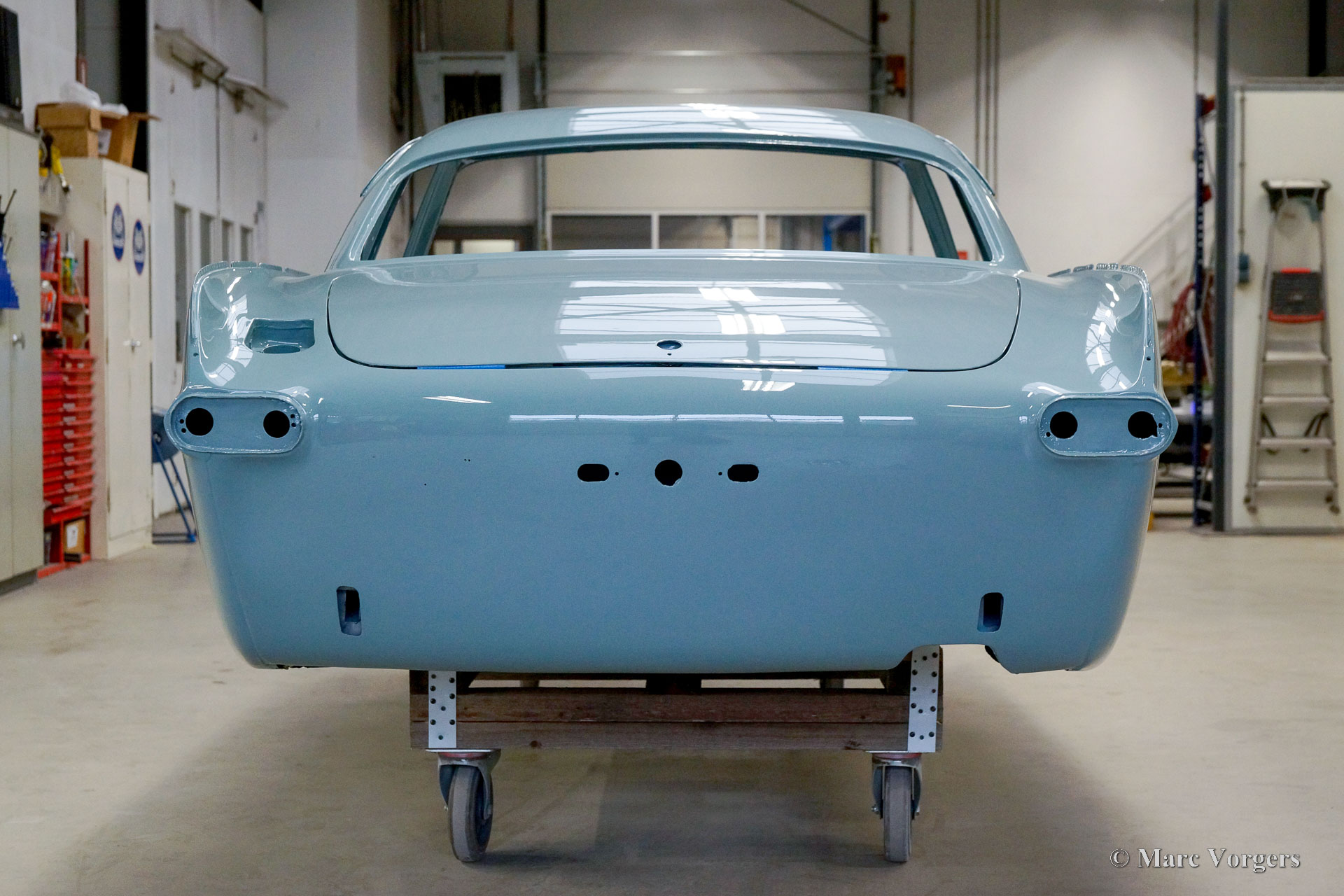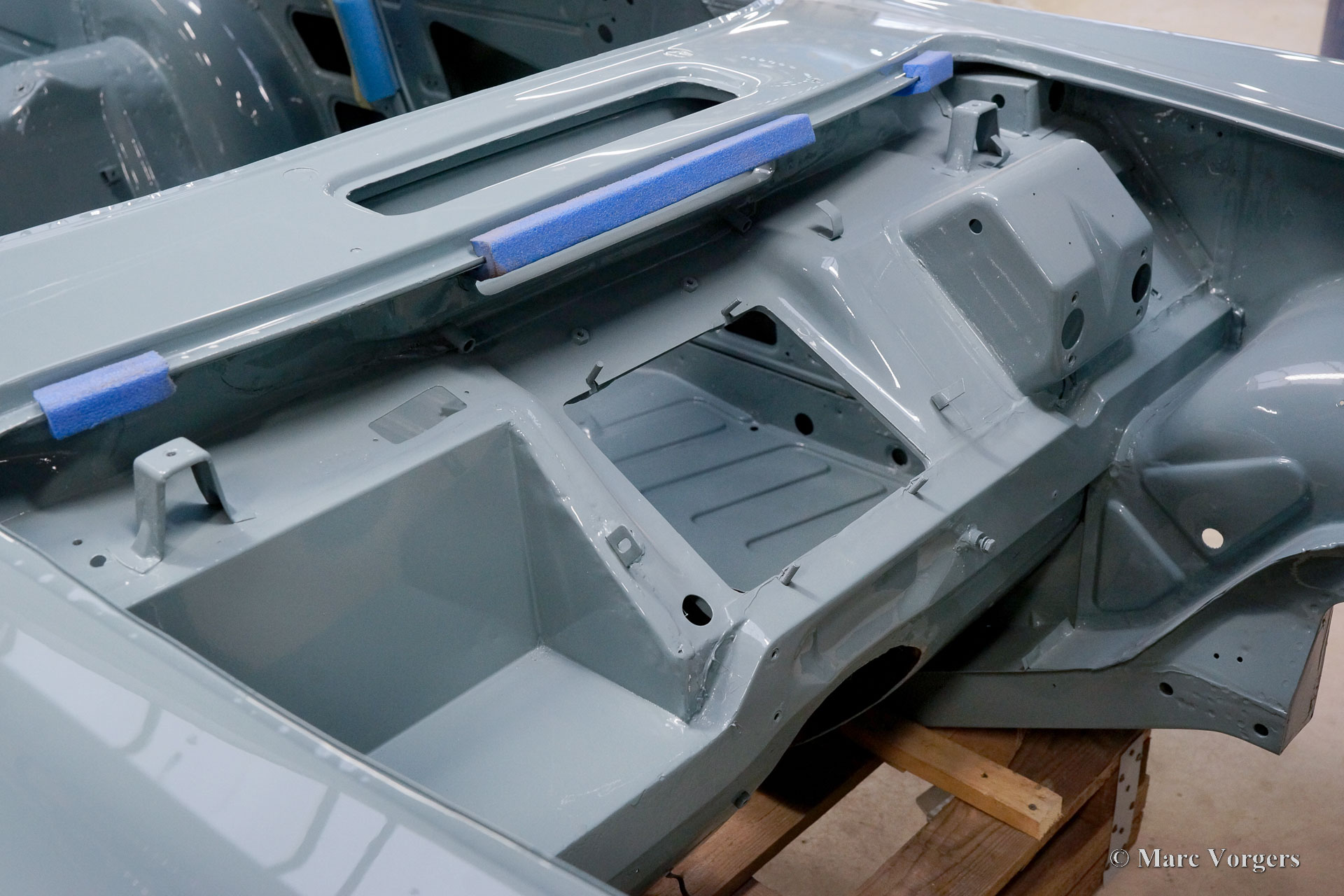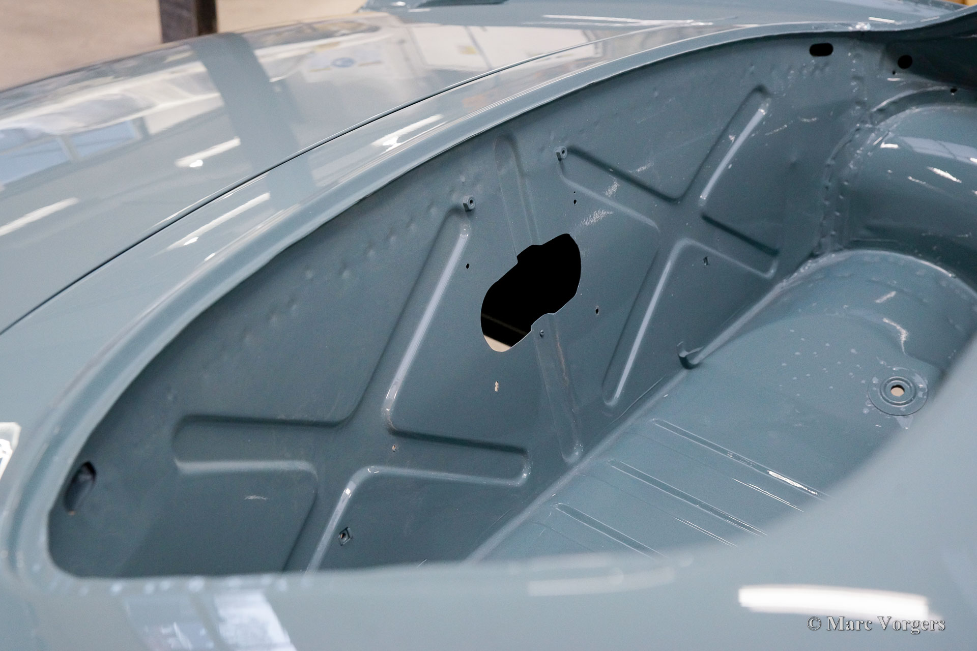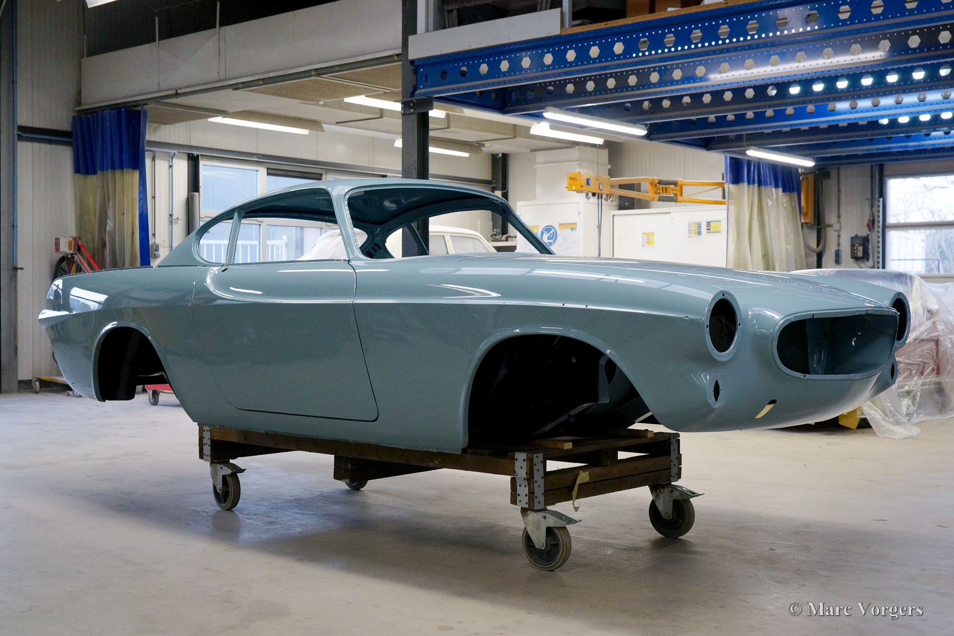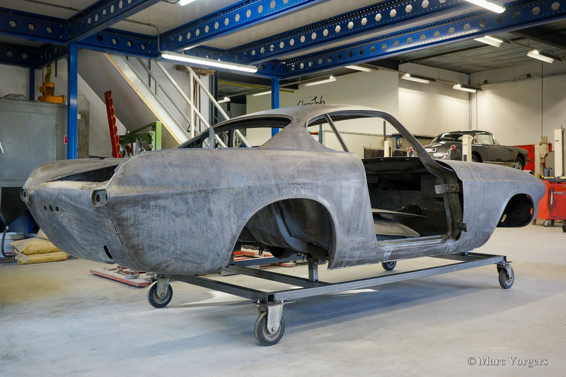 The body of this Volvo P1800 S was restored to brand new condition by Classic Job. The car was delivered stripped, and all glue residues and underbody protection have been removed. The bodywork was then completely stripped of paint in a paint stripping bath. The body proved to be in a beautiful and rust-free condition. Some sheet metal work was carried out. Both rear fenders showed poorly repaired minor collision damage which needed to be repaired. The rear panel between the rear lamps was replaced because of an earlier bad repair. After the sheet metal work was completed the bodywork was given a KTL coating in which the body was completely immersed in a special bath leaving a black coating on every metal surface inside and out and in every seam. After that the bodywork was smoothened, primed, and given a perfect new paint system. The Volvo P1800 S is being completed by the owner.