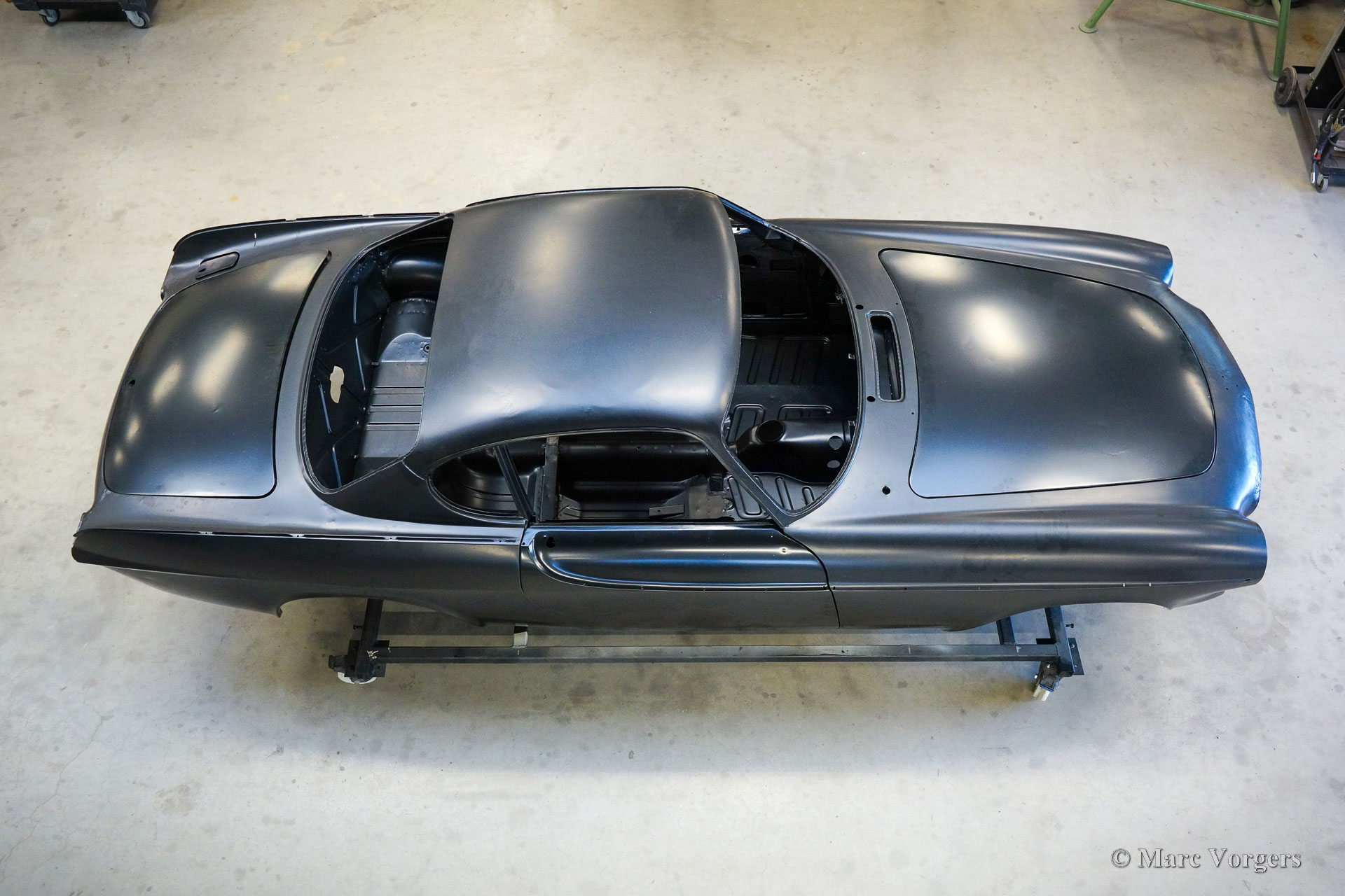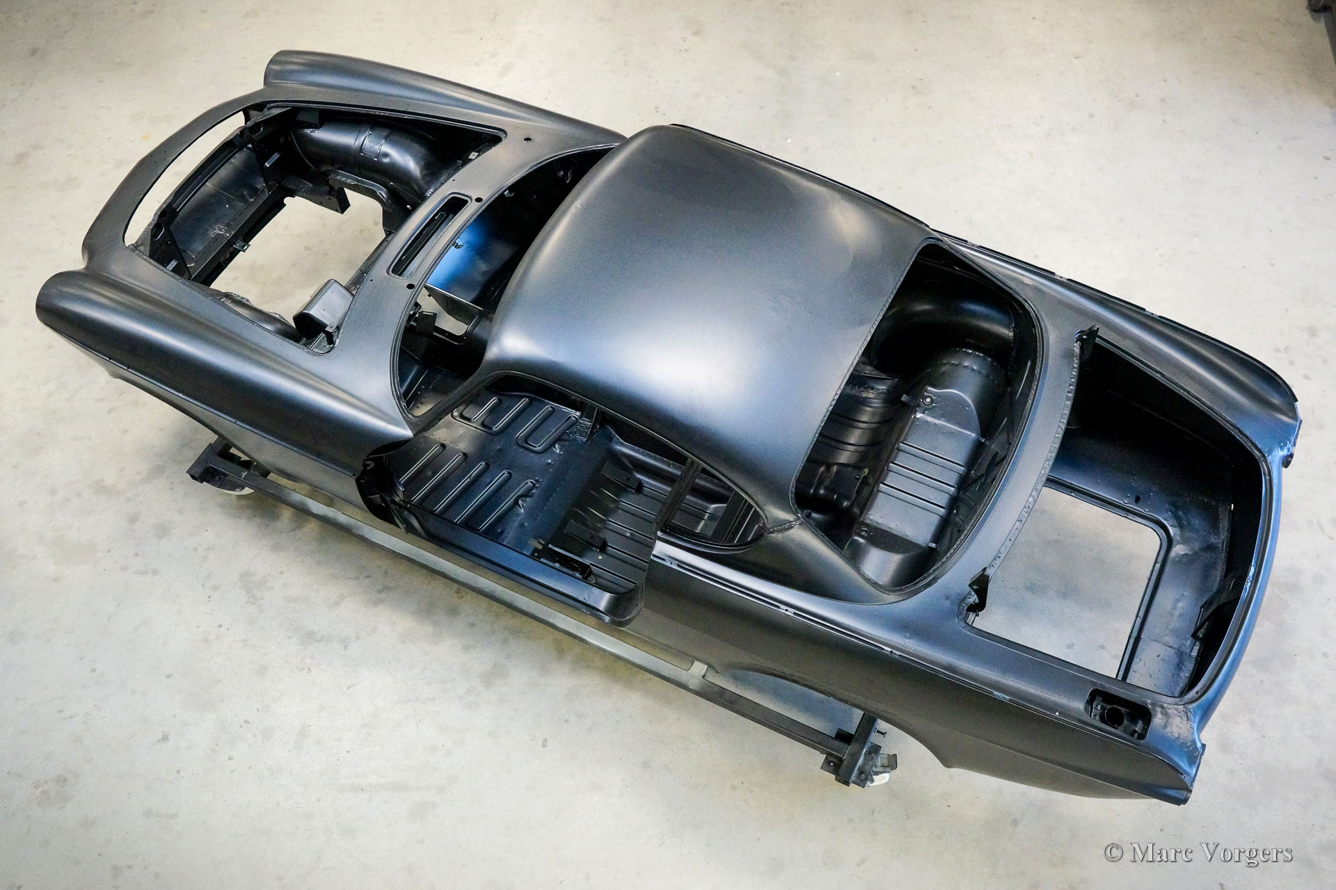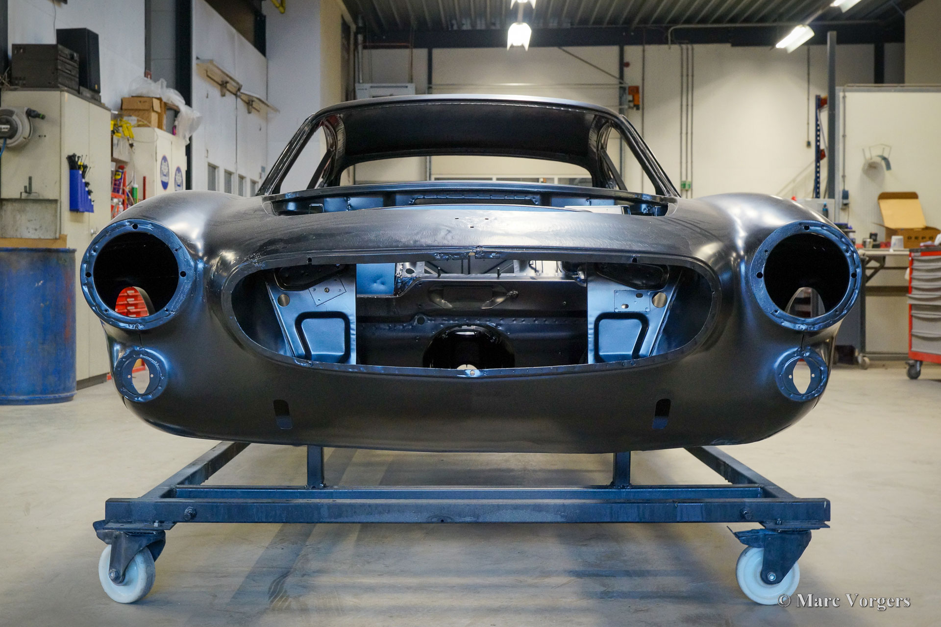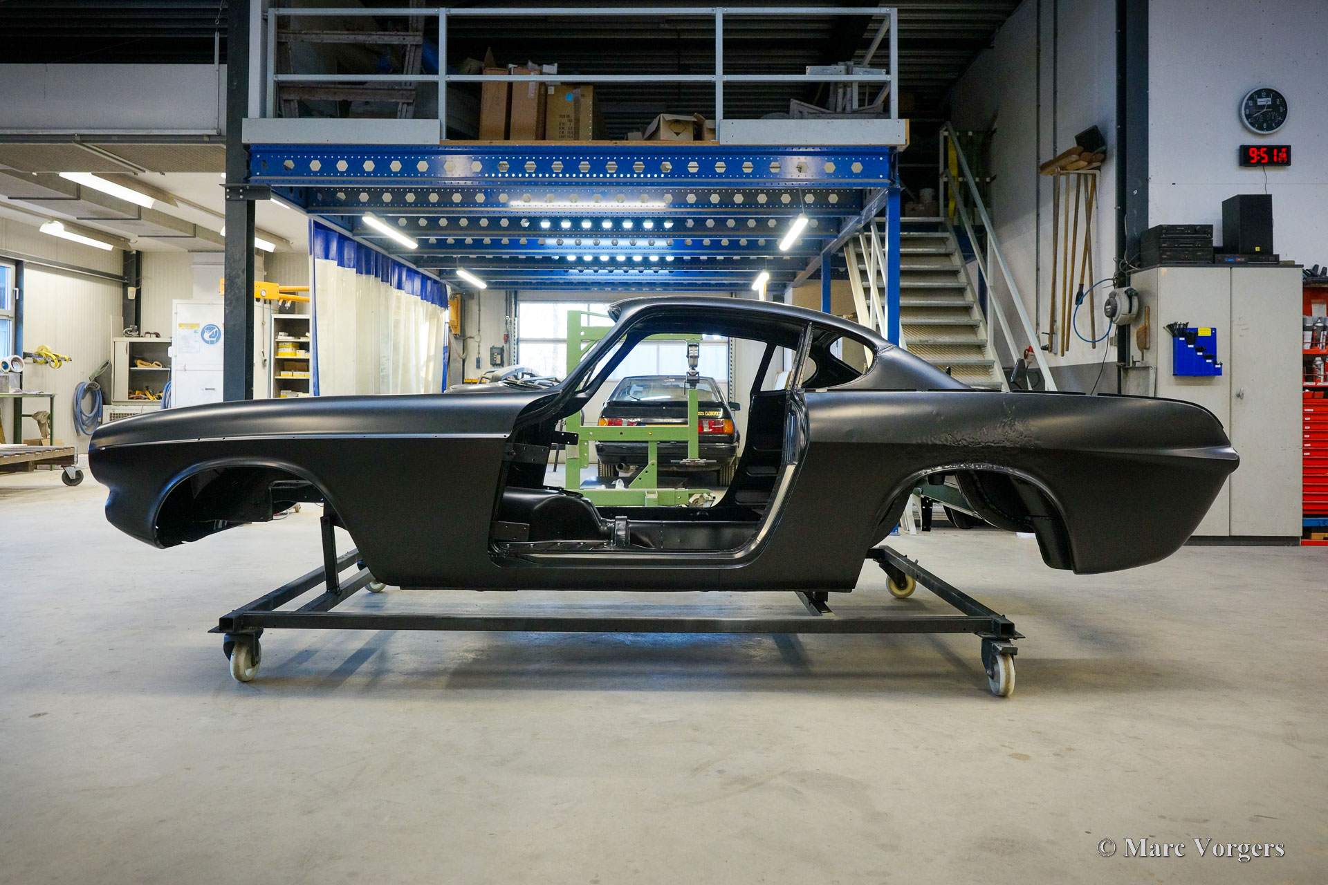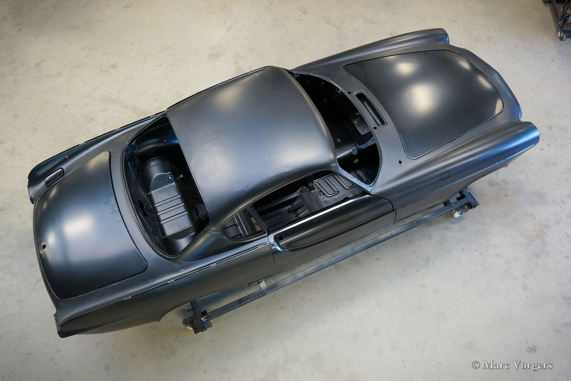 The body of this Volvo P1800 S was restored to brand new condition by Classic Job. The car was delivered stripped, and all glue residues and underbody protection have been removed. The bodywork was then completely stripped of paint in a paint stripping bath. The body proved to be in a beautiful and rust-free condition. Some sheet metal work was carried out. Both rear fenders showed poorly repaired minor collision damage which needed to be repaired. The rear panel between the rear lamps was replaced because of an earlier bad repair. After the sheet metal work was completed the bodywork was given a KTL coating in which the body was completely immersed in a special bath leaving a black coating on every metal surface inside and out and in every seam. After that the bodywork was smoothened, primed, and given a perfect new paint system. The Volvo P1800 S is being completed by the owner.